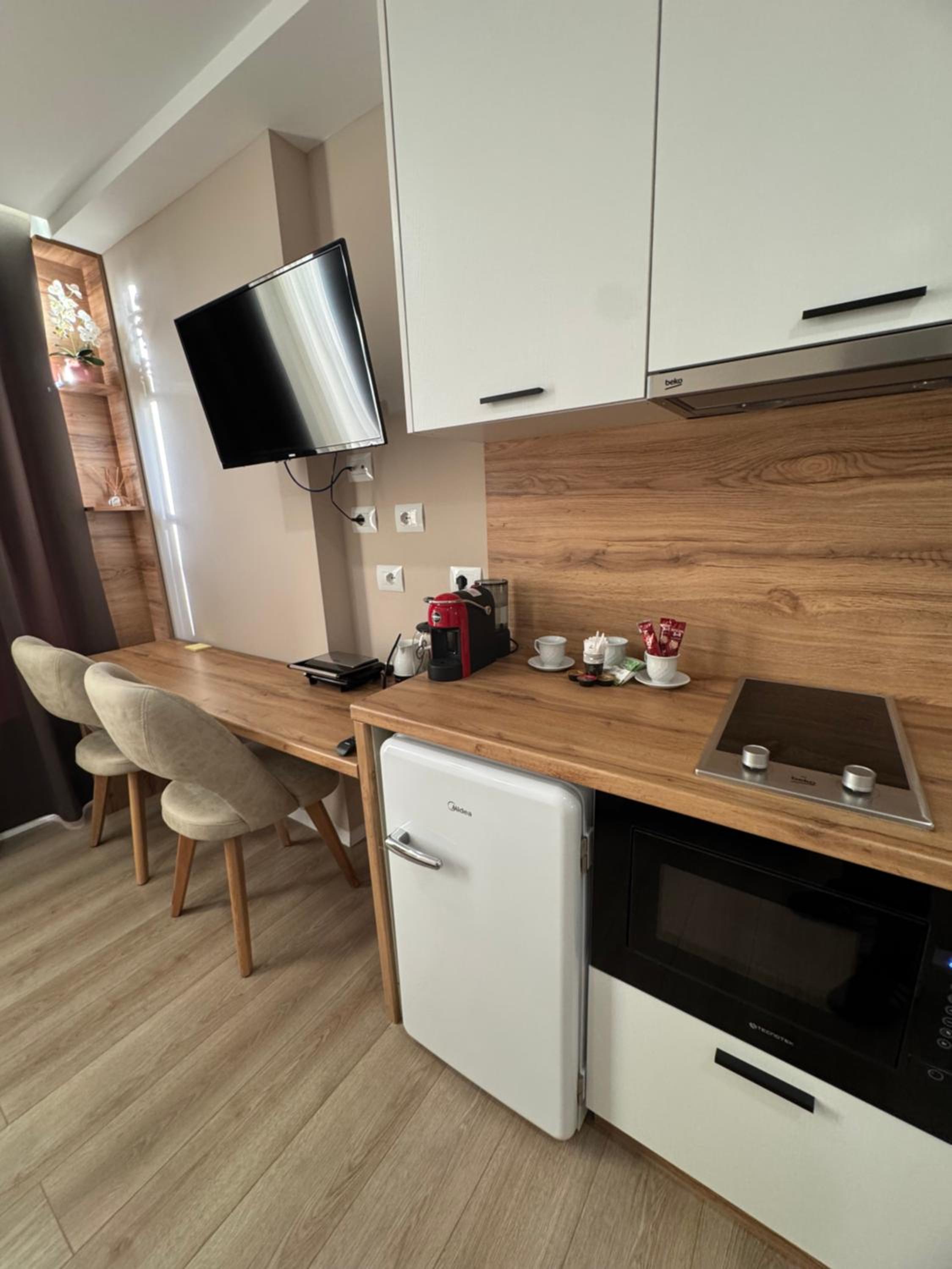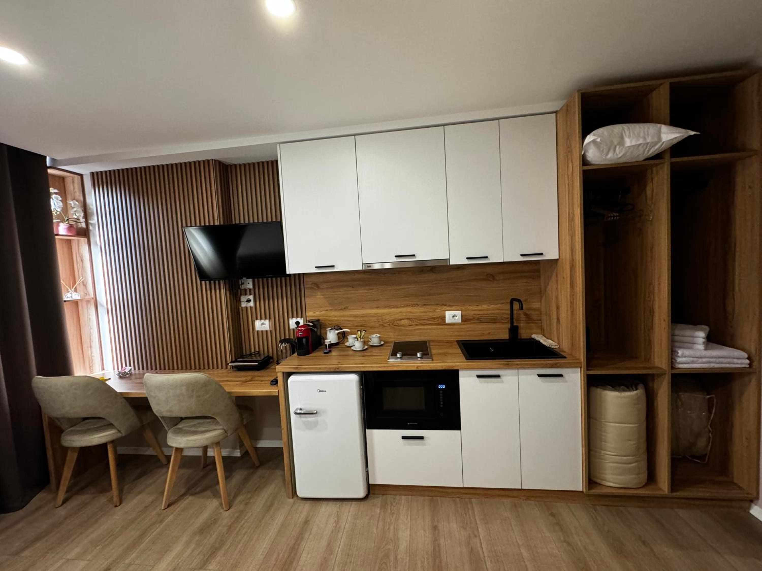 Velmi moderně zařízený čistý pokoj s koupelnou. K dispozici i malá kuchyňka s vybavením a mísou ovoce, jako pozornost.