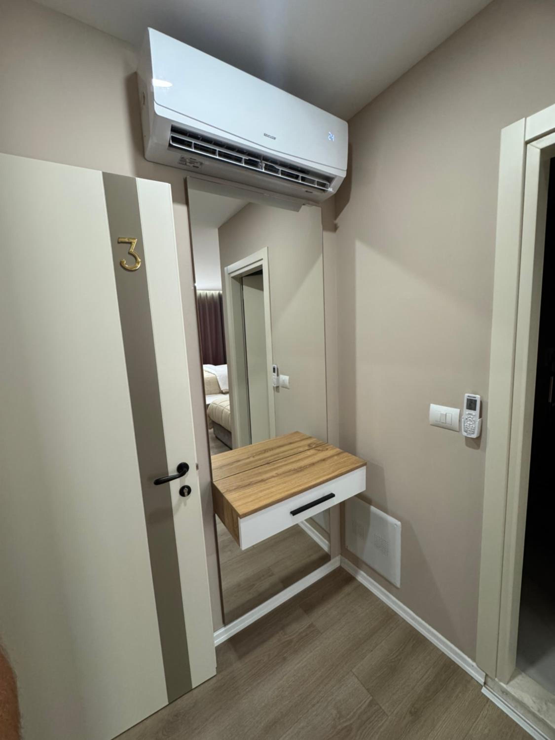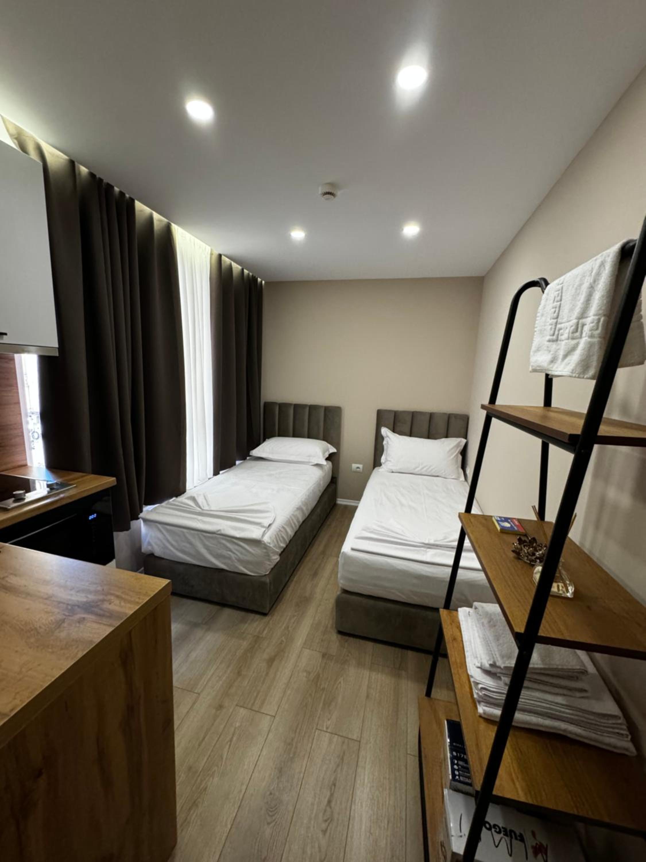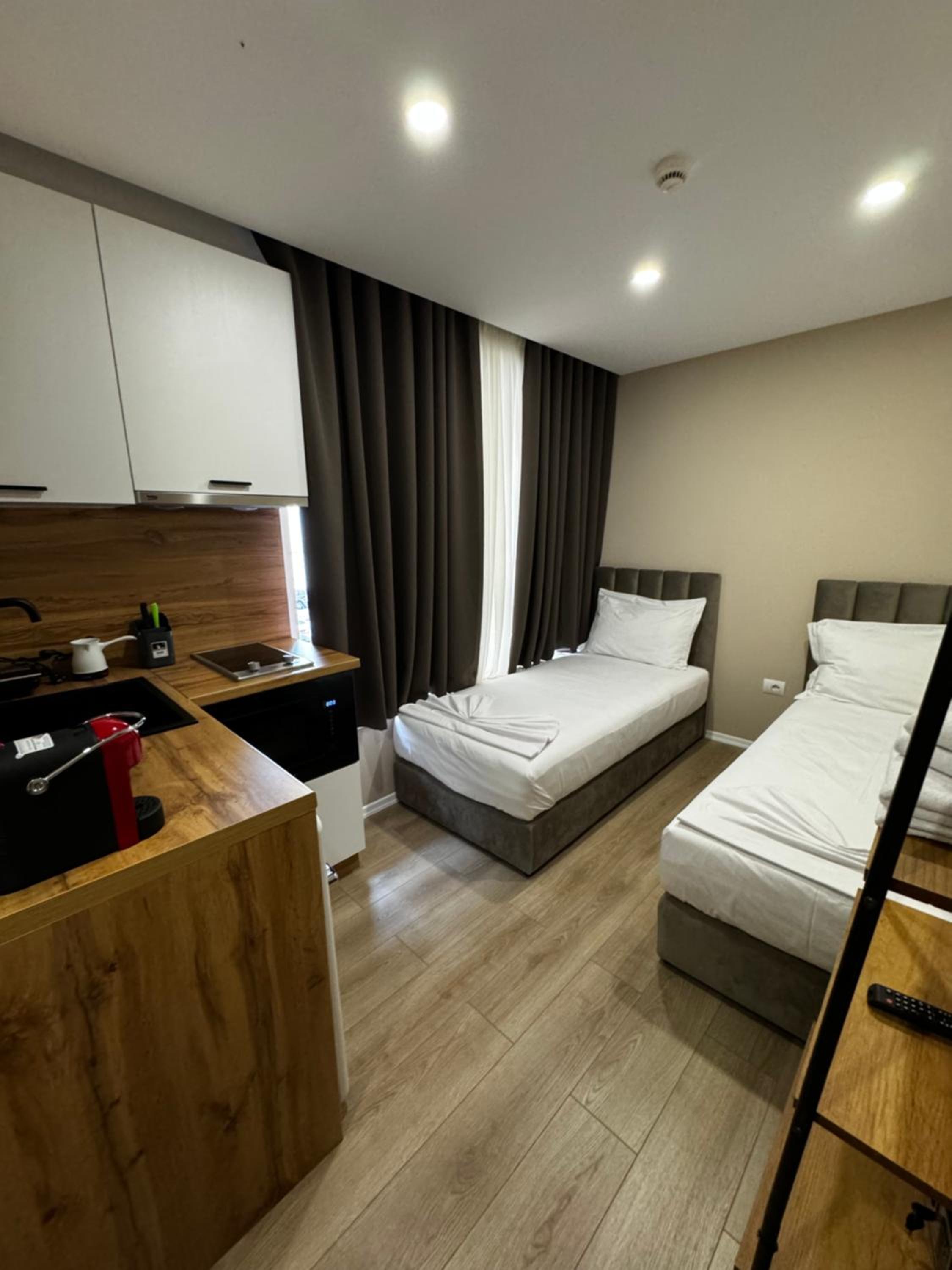 The apartment is super clean and freshly renovated, and has all the necessary things in it. It has a home-like environment. The supermarket, which located under the apartment belongs to them as well, so it is very convenient.