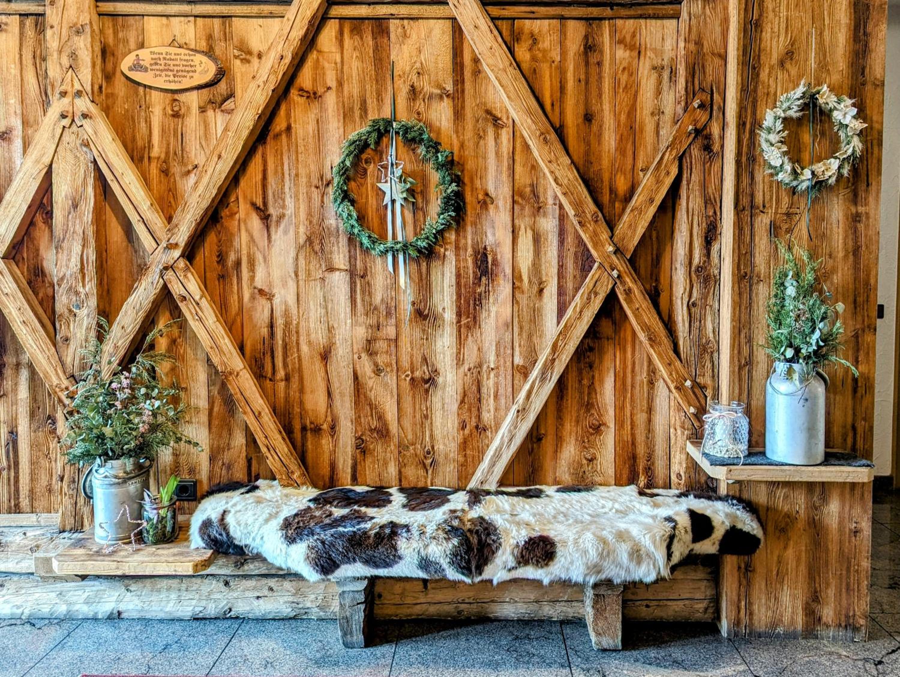 Experience the charm of South Tyrol with the hotel's typical design featuring carpeted floors and wood-beamed ceilings, creating a warm and inviting atmosphere for guests to relax in.