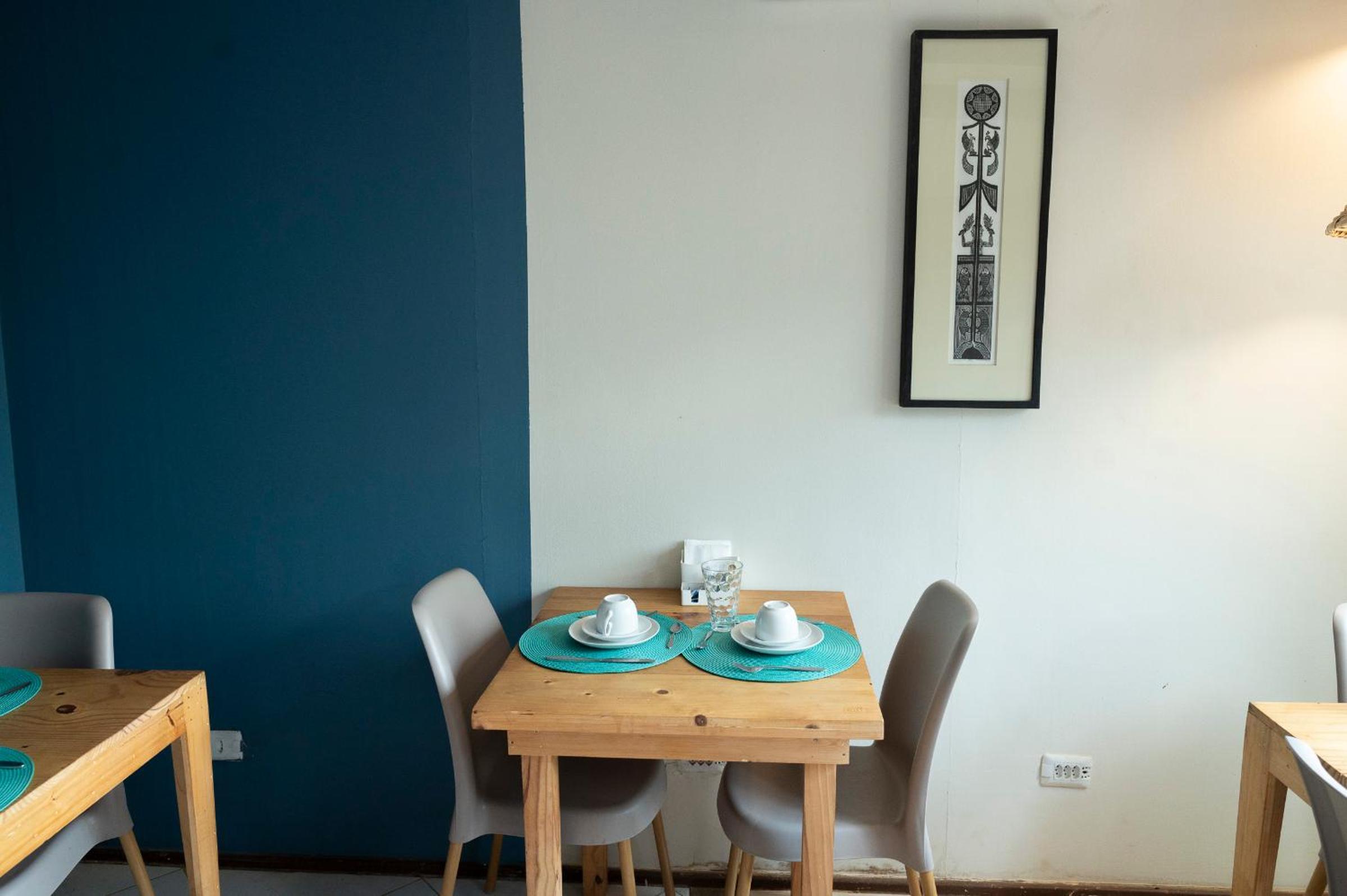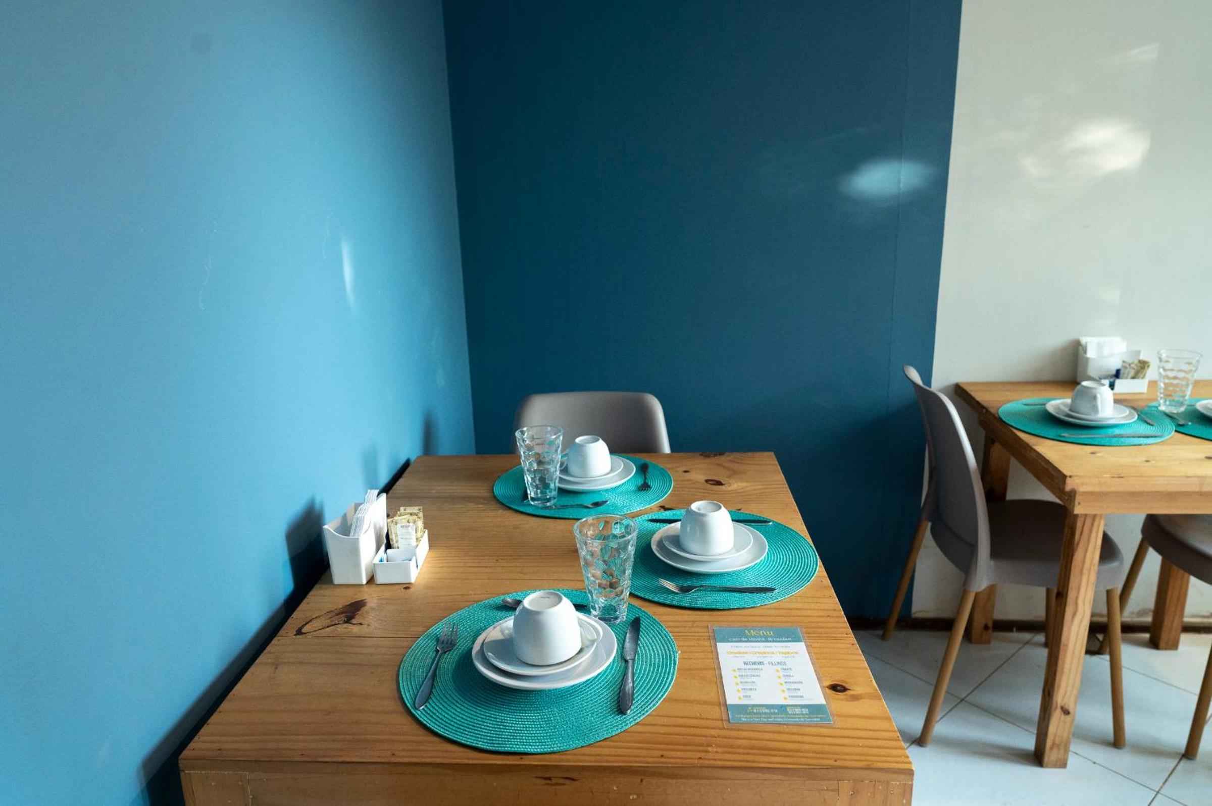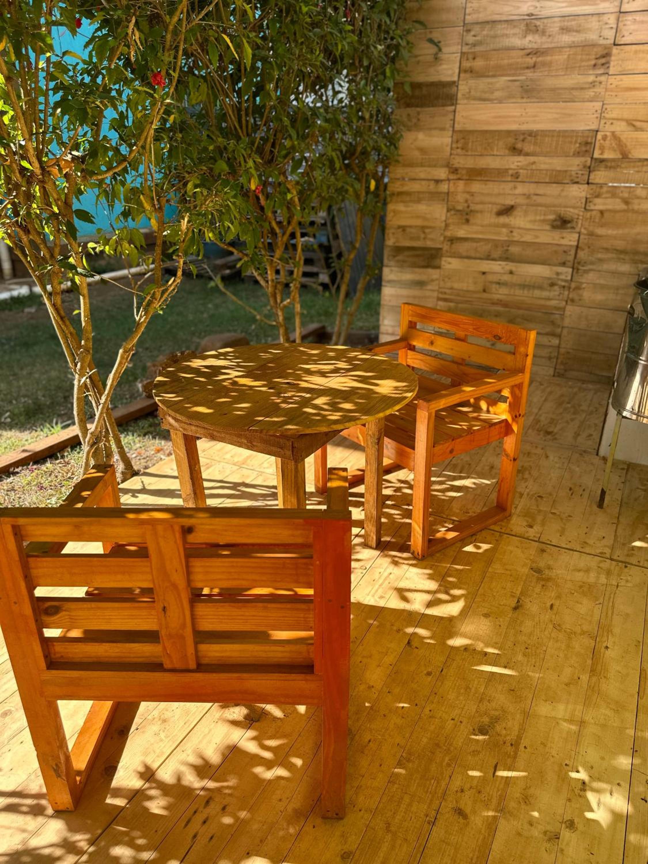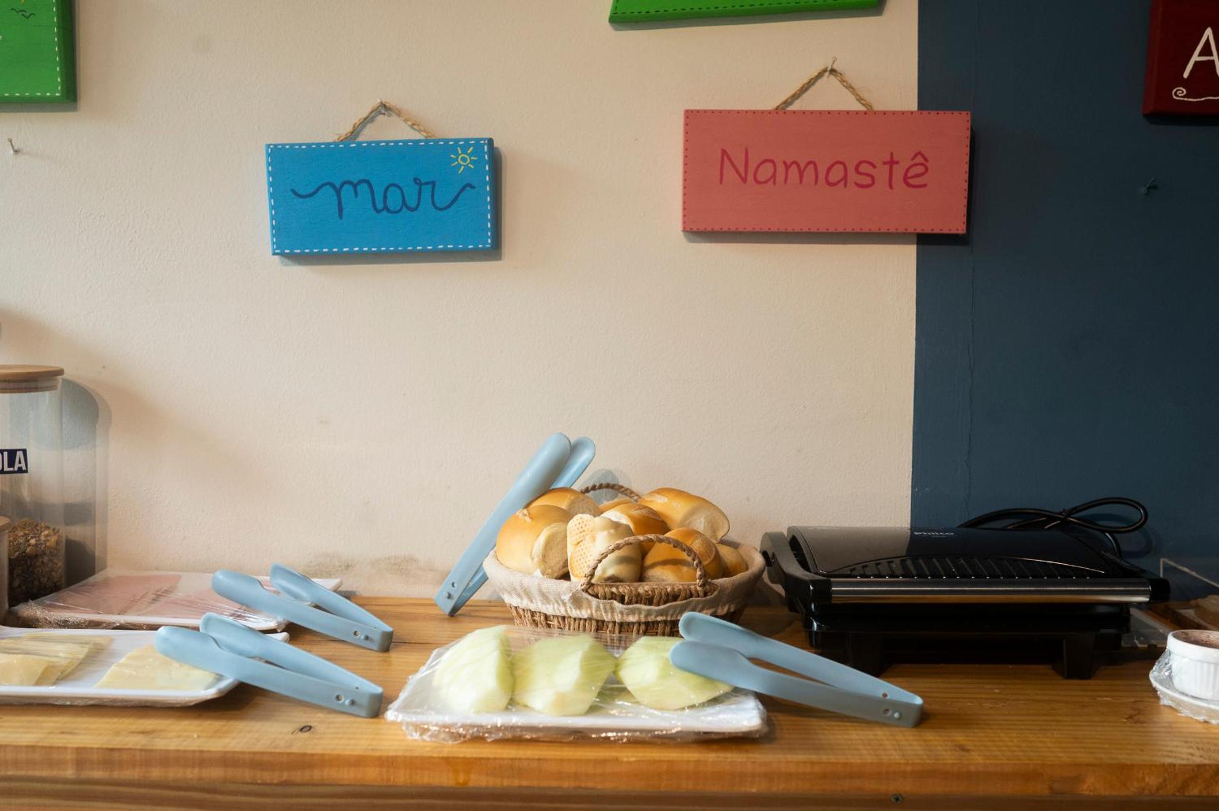Área externa da pousada, chuveiro e café da manhã.