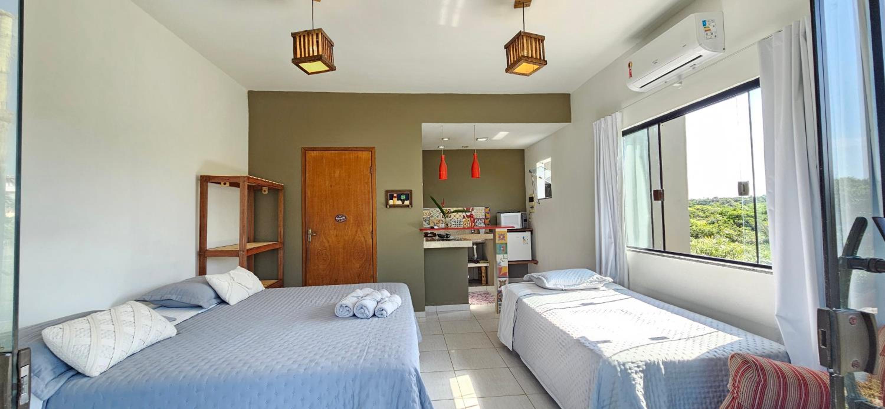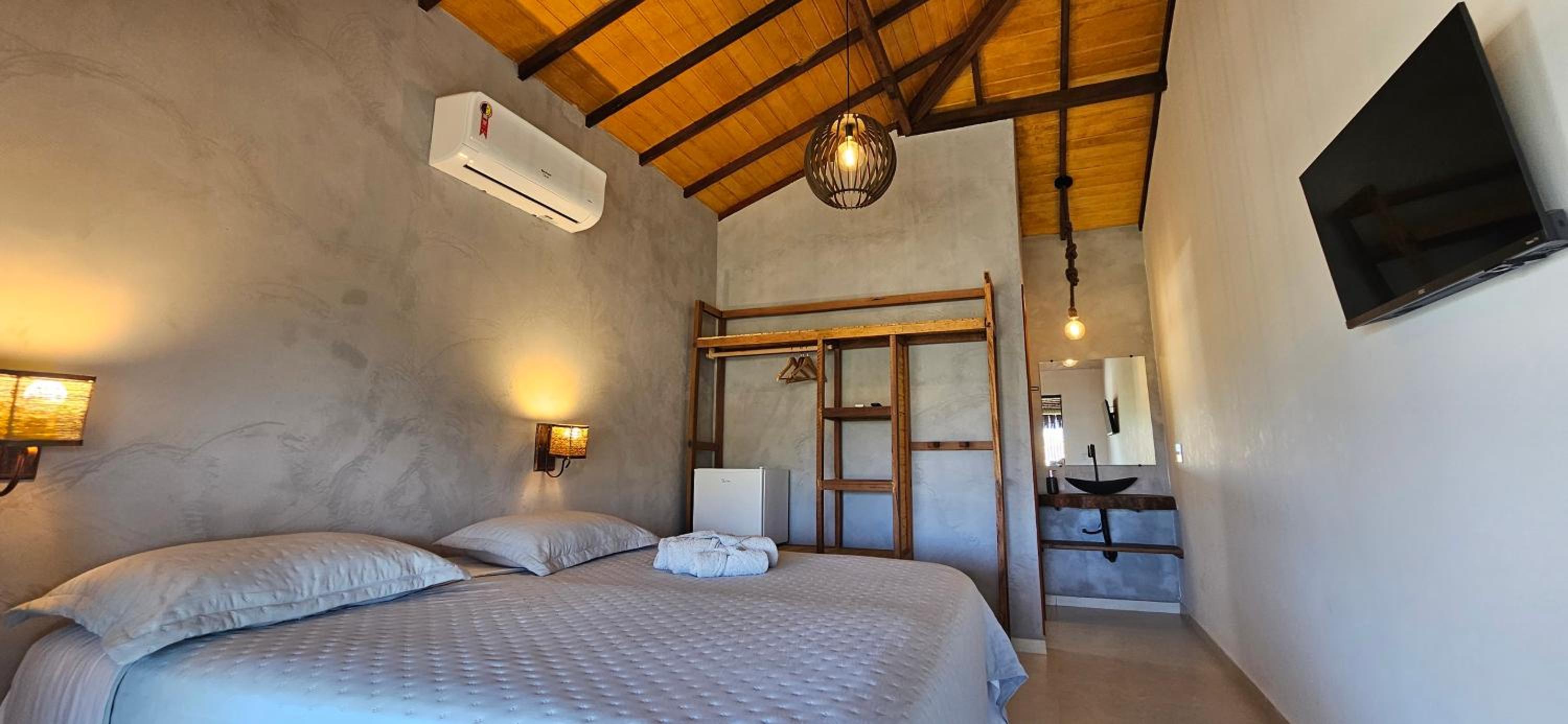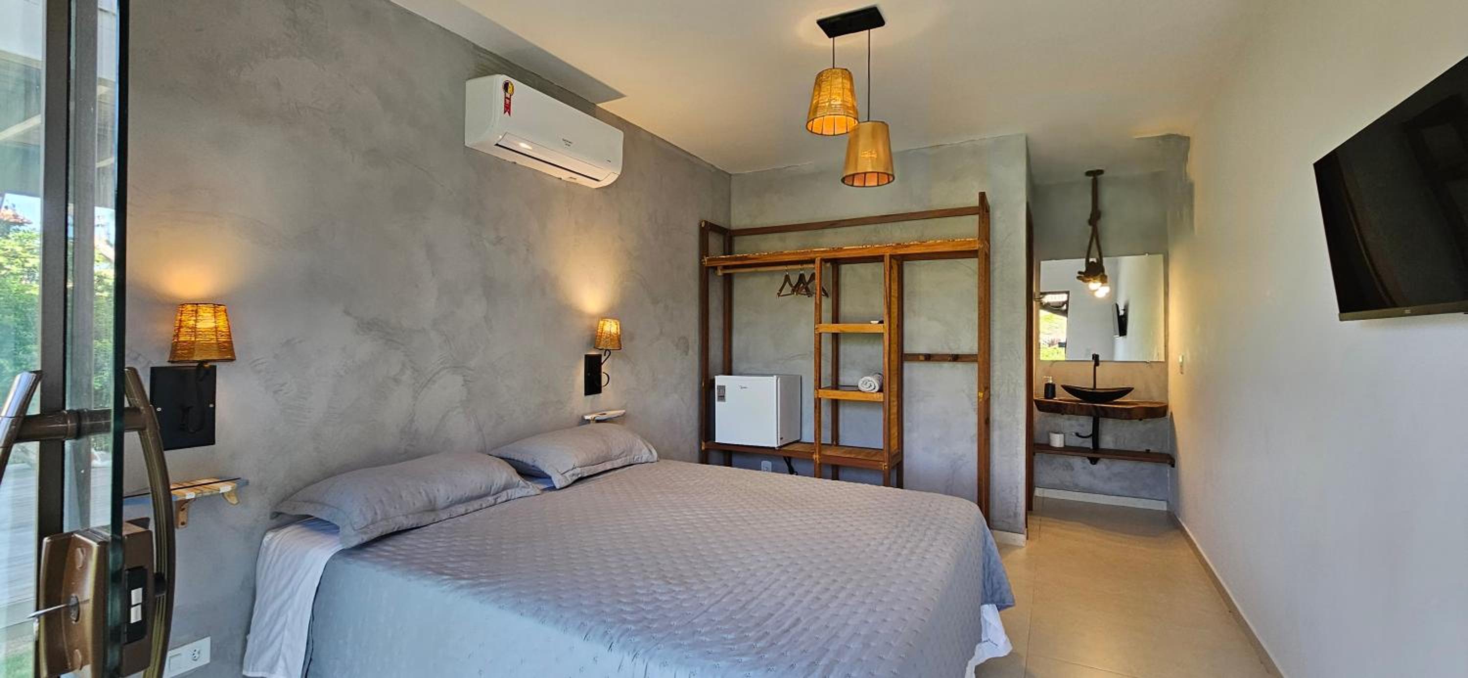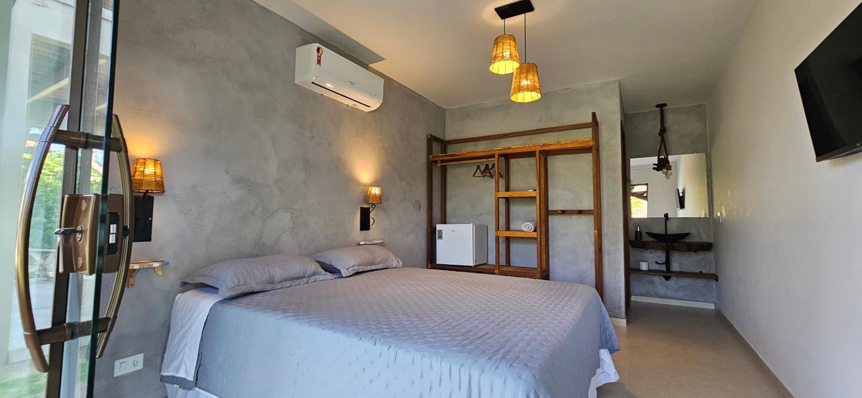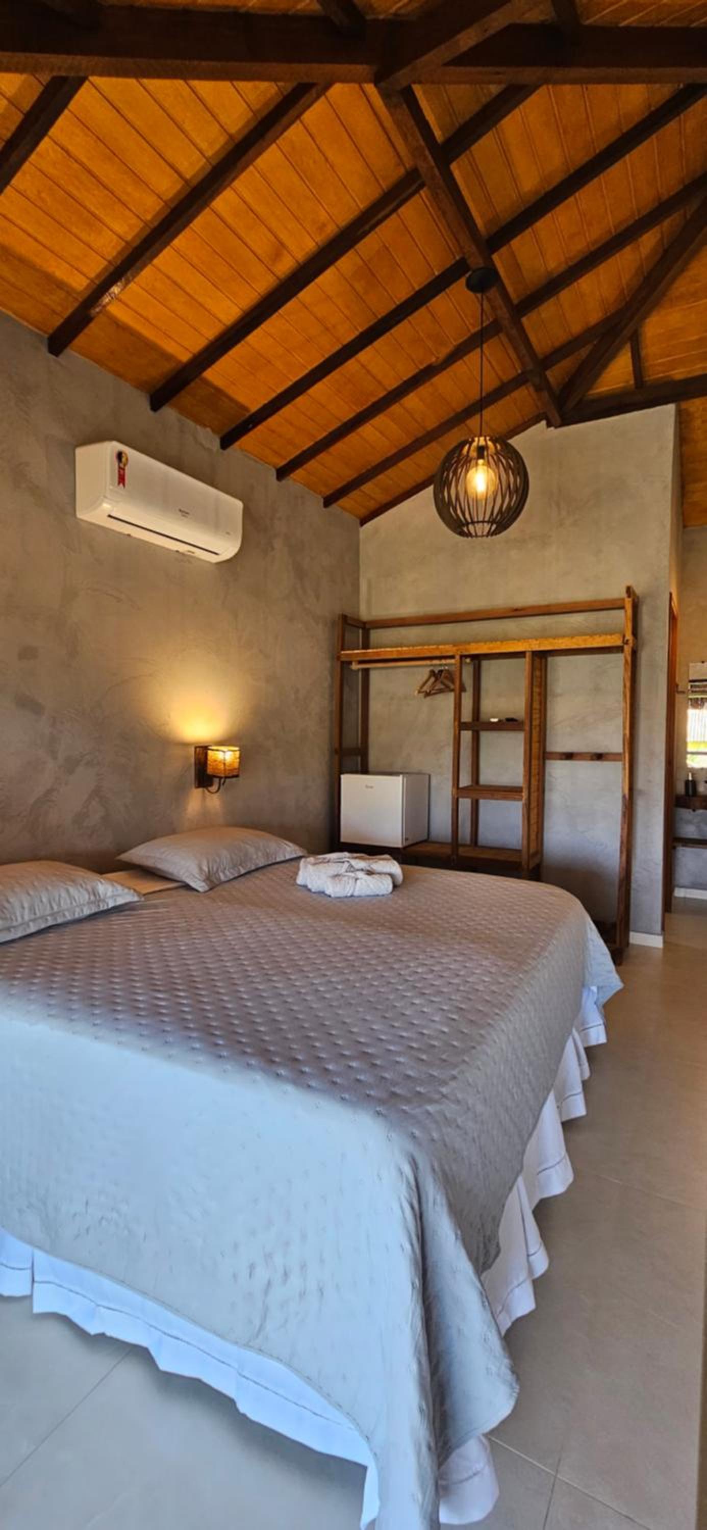 Quarto bem equipado, extremamente aconchegante, muito limpo, ar condicionado muito bom. Banheiro com chuveiro elétrico com bom volume de agua e excelente ajuste de temperatura. Pousada com clima de vila a 2 minutos da praia (da lagoa) e com muita segurança.