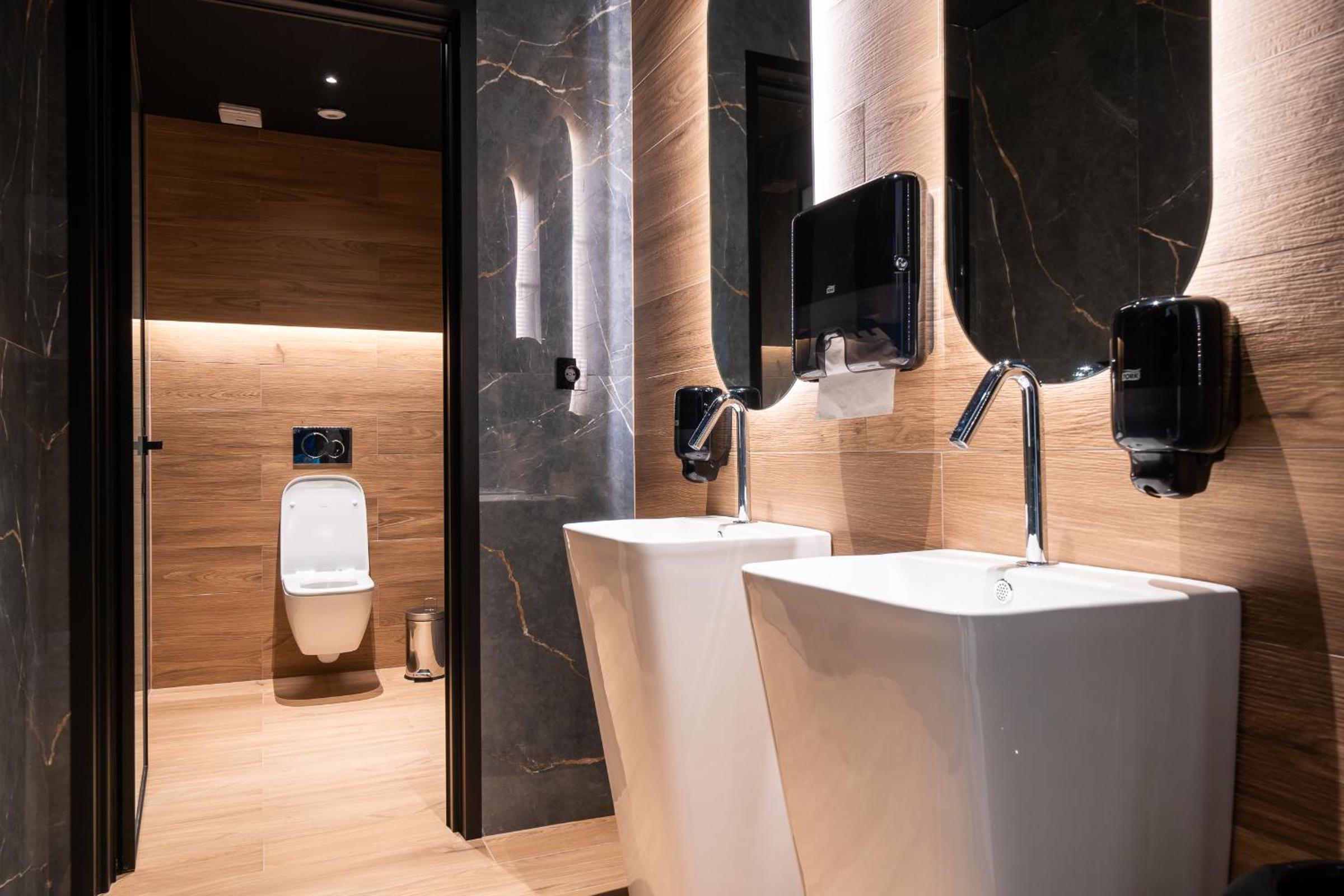The lighting in the bathroom should be brighter or adjustable.