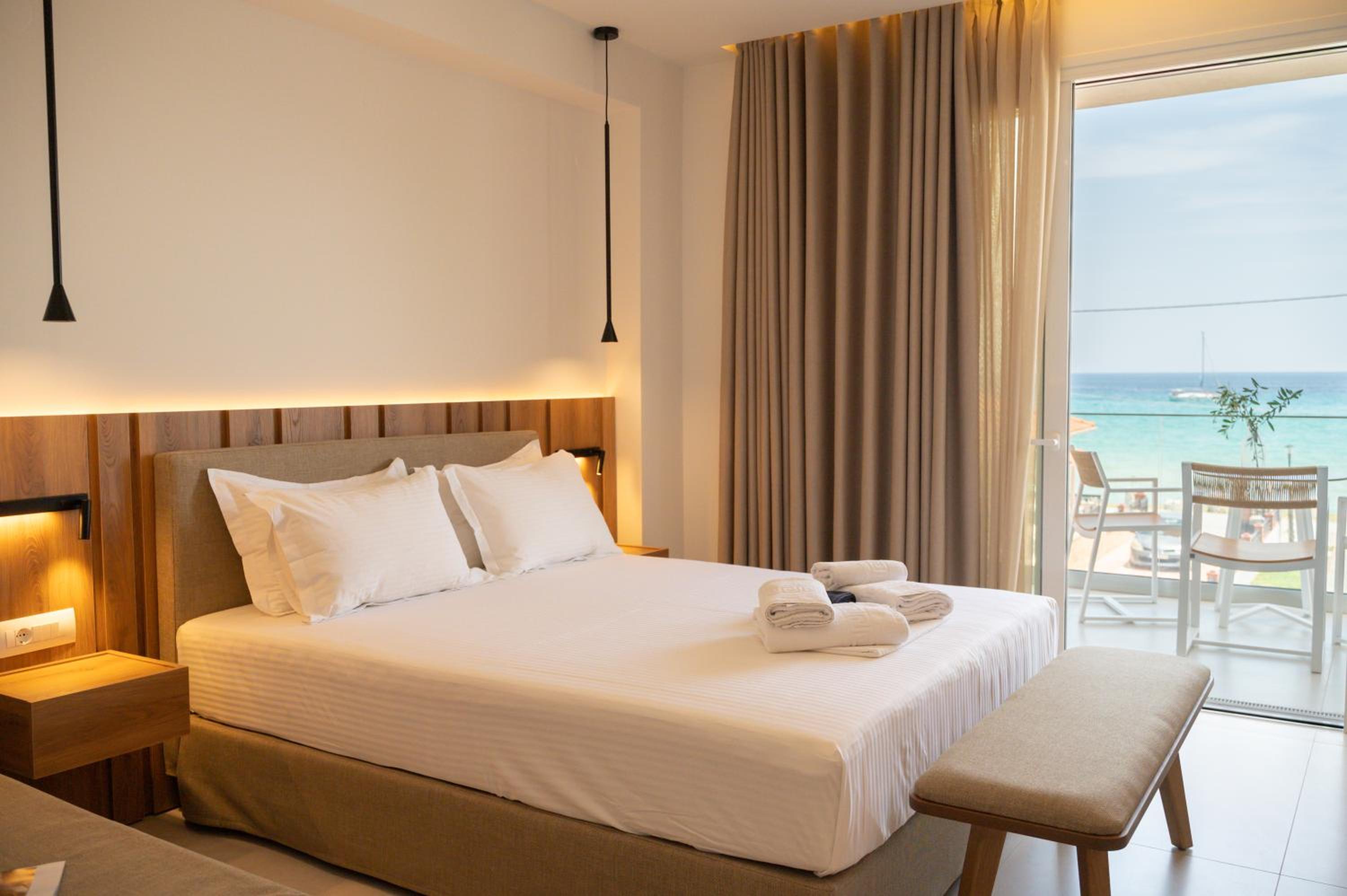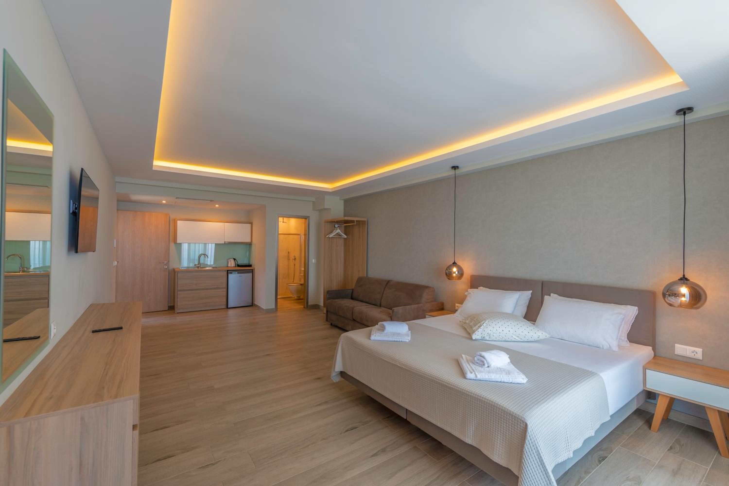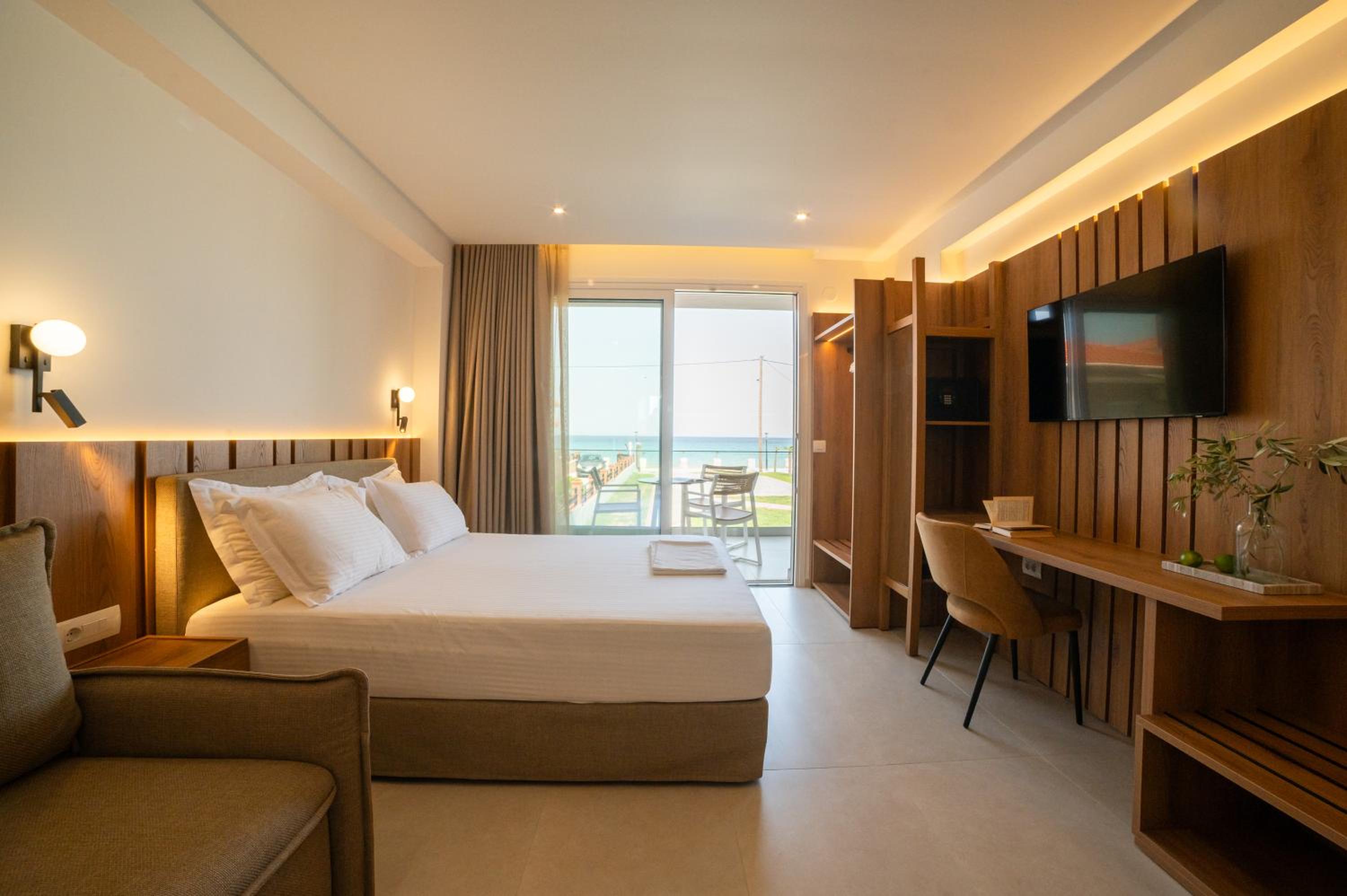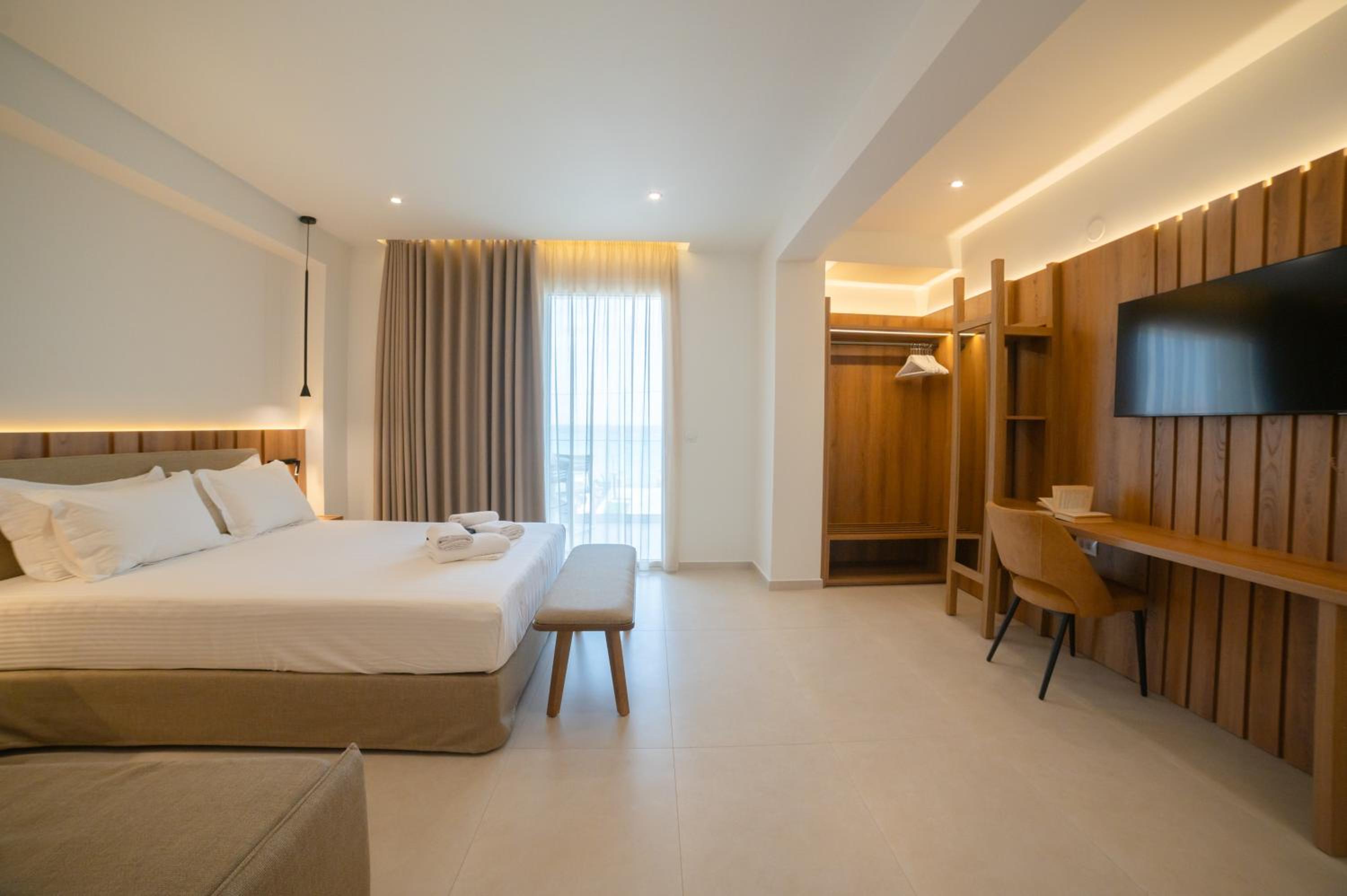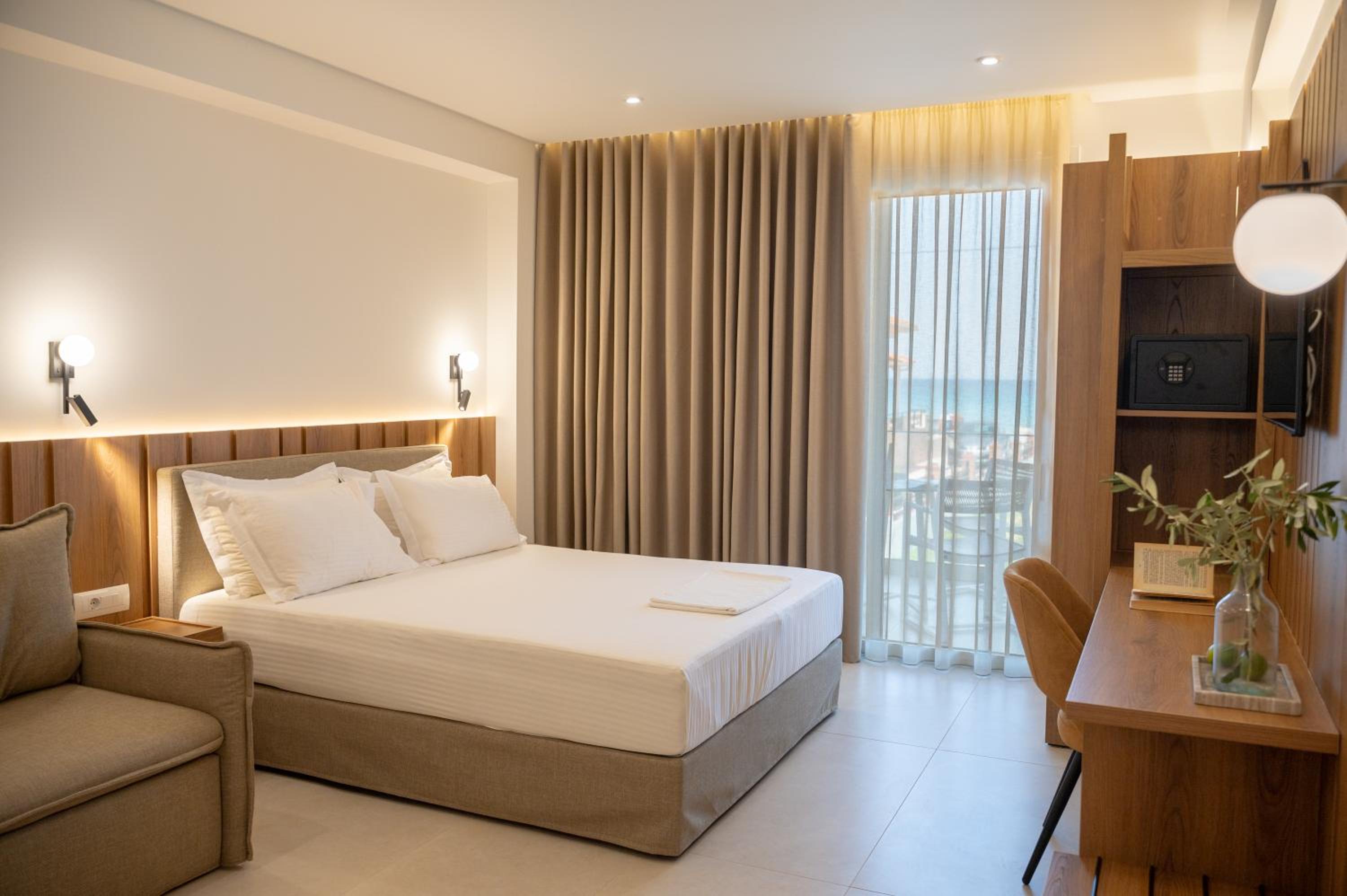 The hotel, room and furniture were very new and clean. Location was perfect, the golden beach and lots of taverns are in a few minutes of walking distance. Room was small but had a nice balcony. If you want to have some snack in your room or a drink before dinner, a well working refrigerator is also in the room.