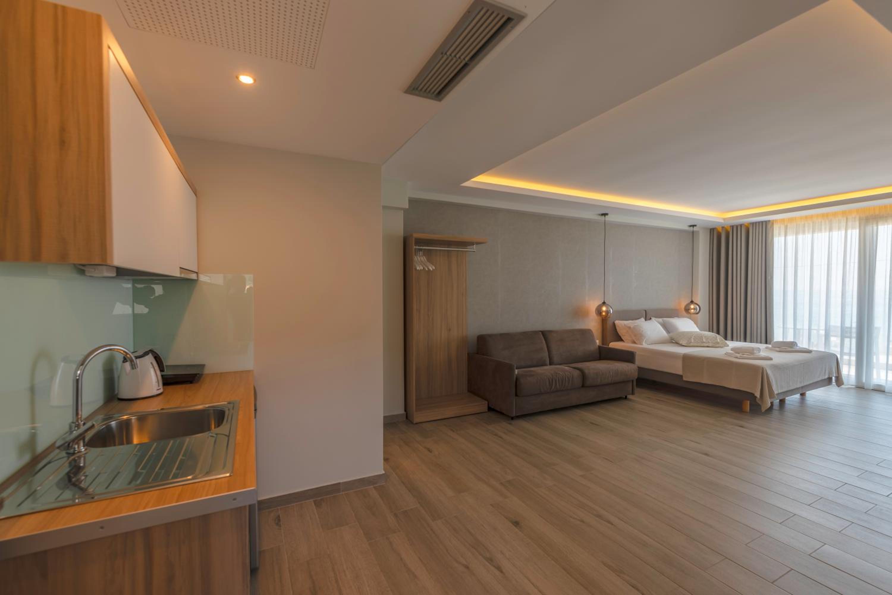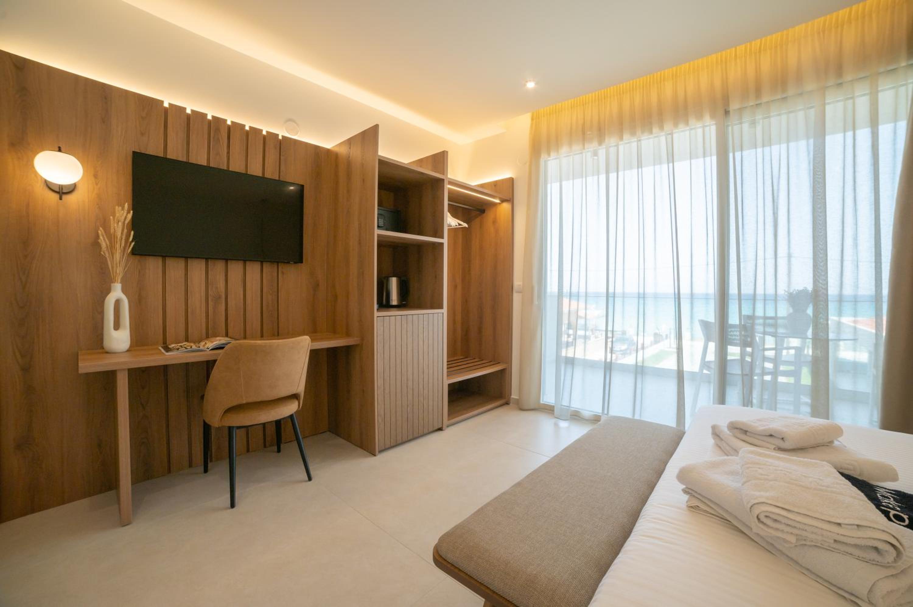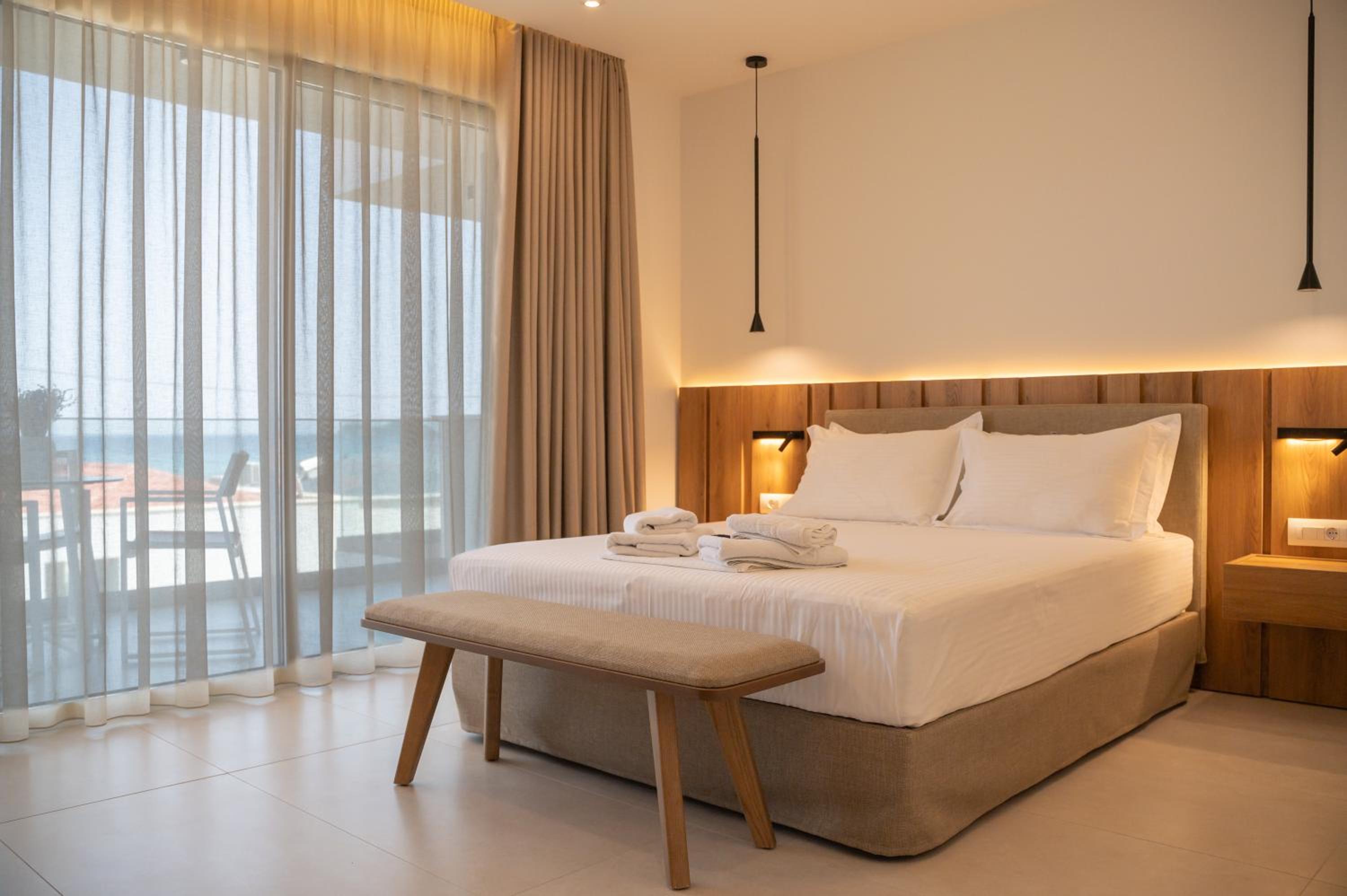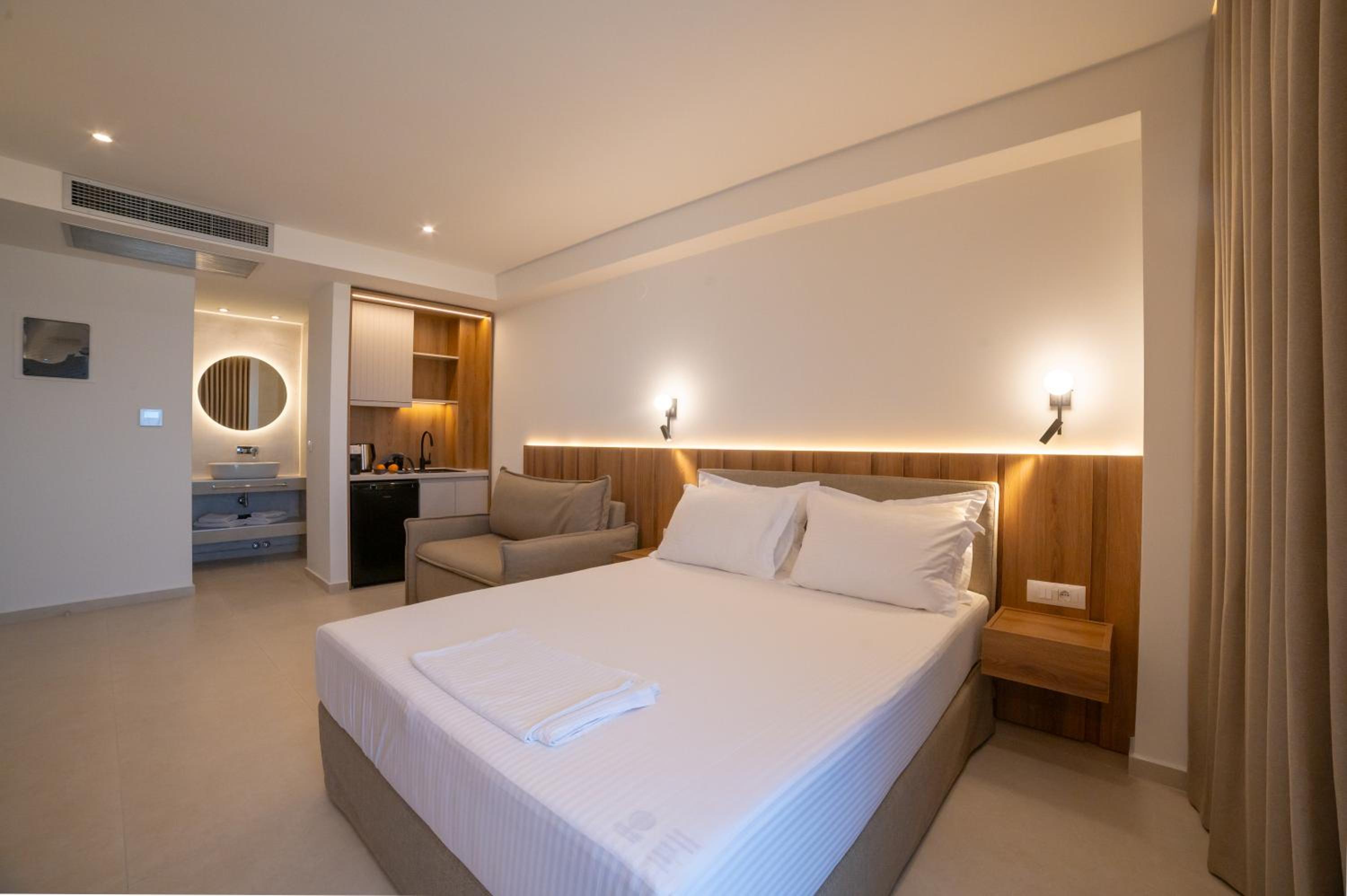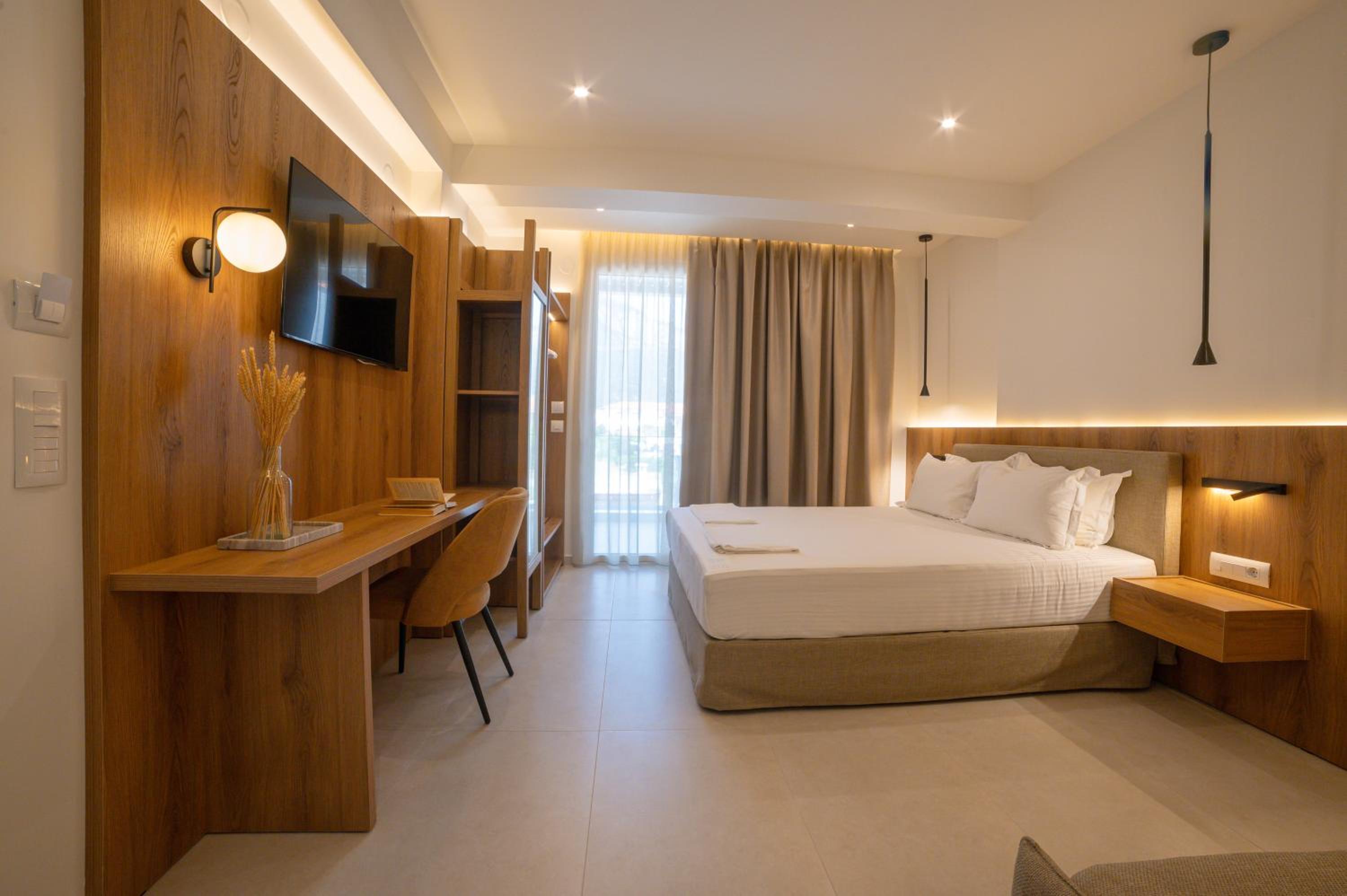 The hotel, room and furniture were very new and clean. Location was perfect, the golden beach and lots of taverns are in a few minutes of walking distance. Room was small but had a nice balcony. If you want to have some snack in your room or a drink before dinner, a well working refrigerator is also in the room.