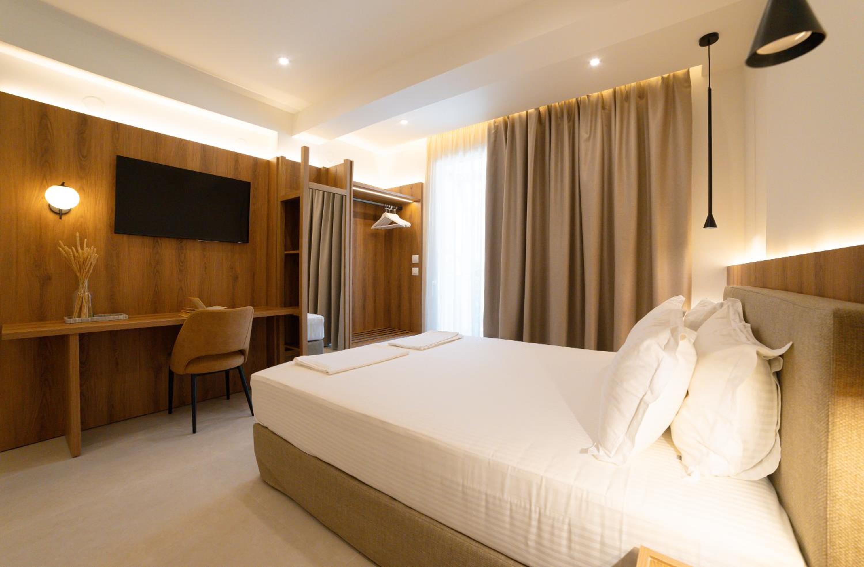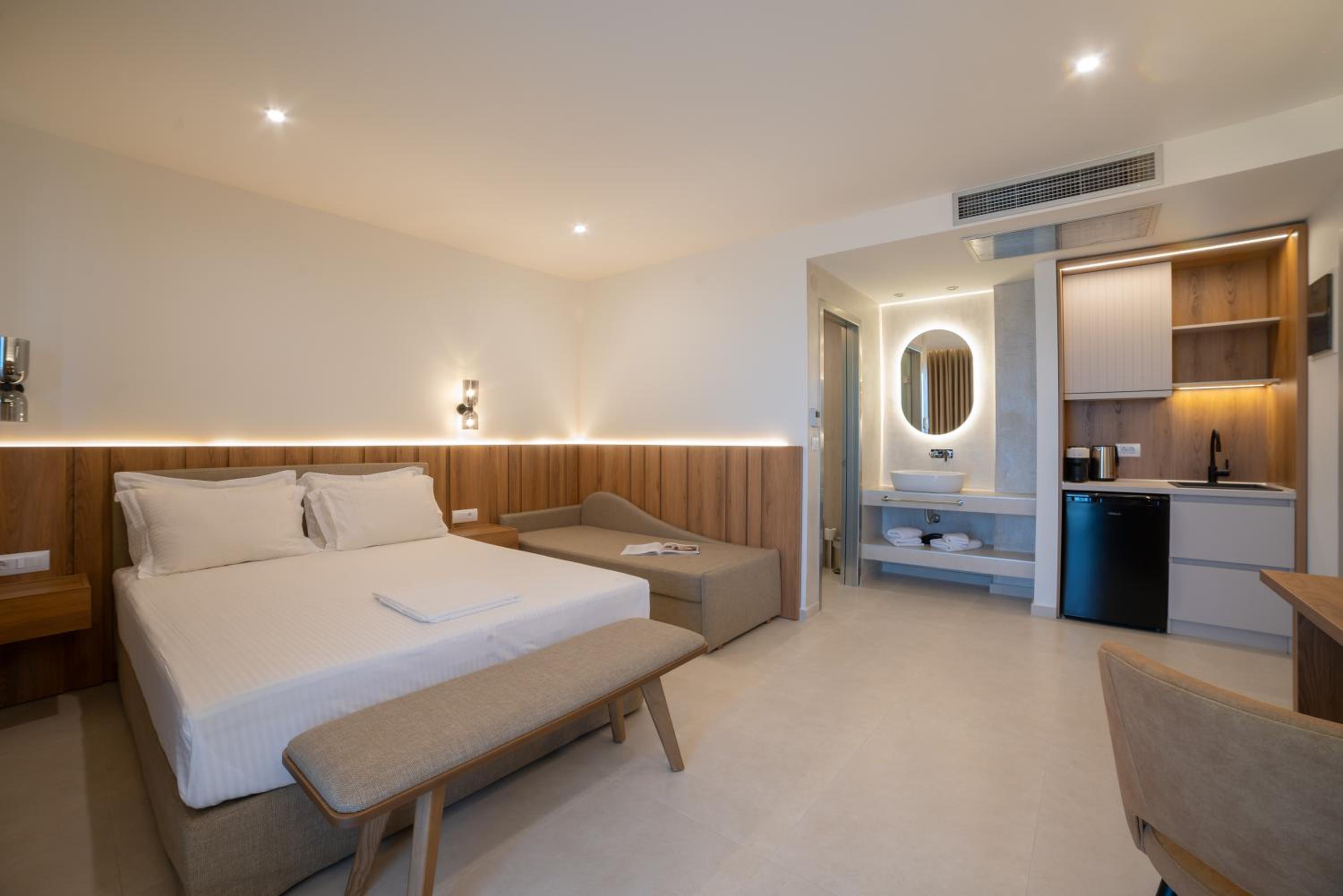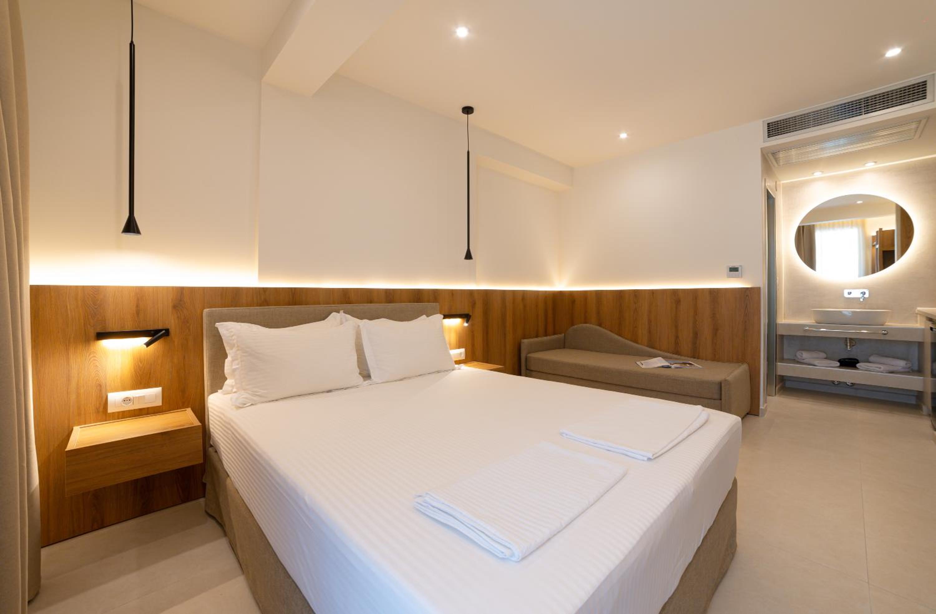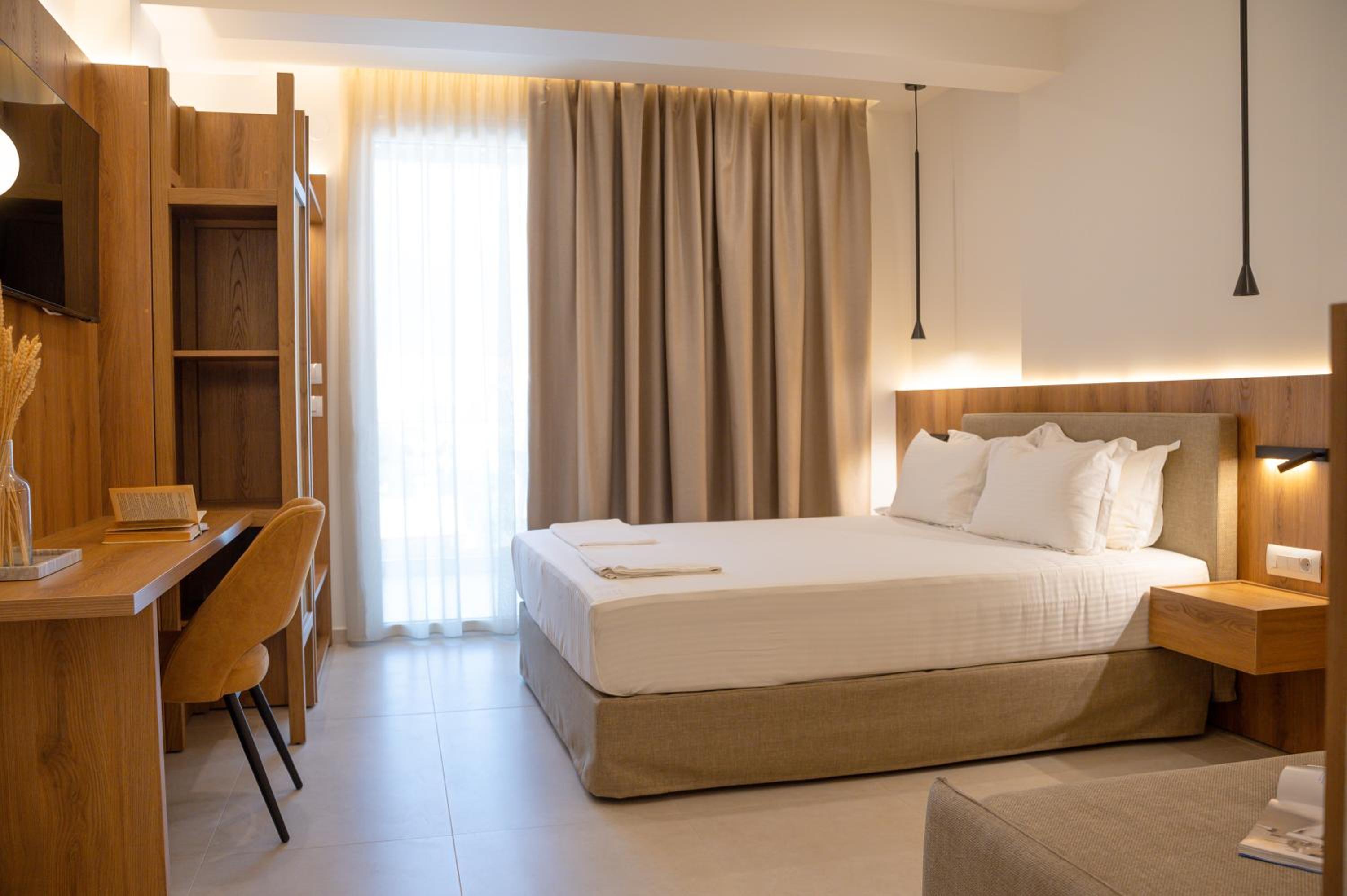 The hotel, room and furniture were very new and clean. Location was perfect, the golden beach and lots of taverns are in a few minutes of walking distance. Room was small but had a nice balcony. If you want to have some snack in your room or a drink before dinner, a well working refrigerator is also in the room.