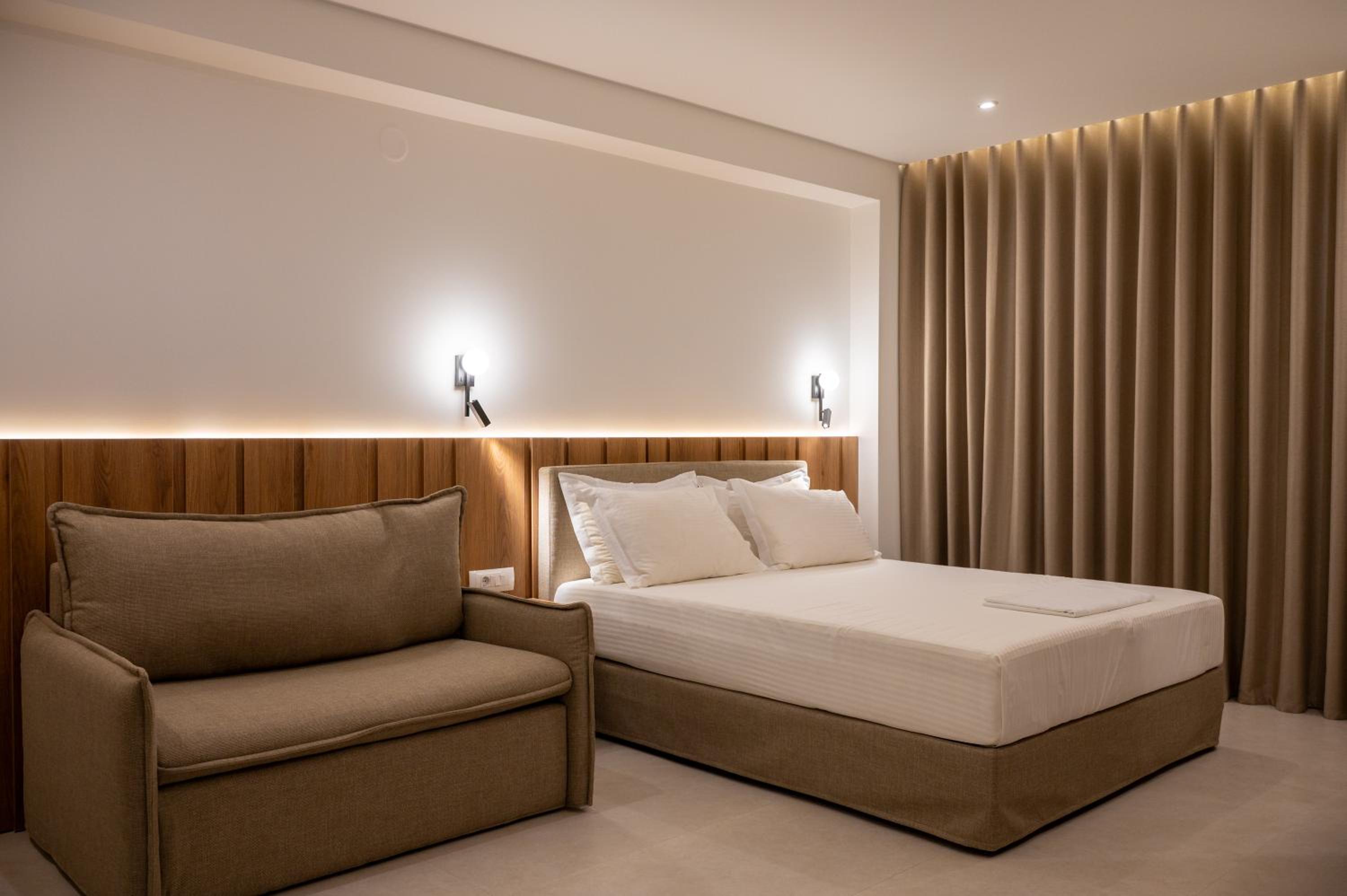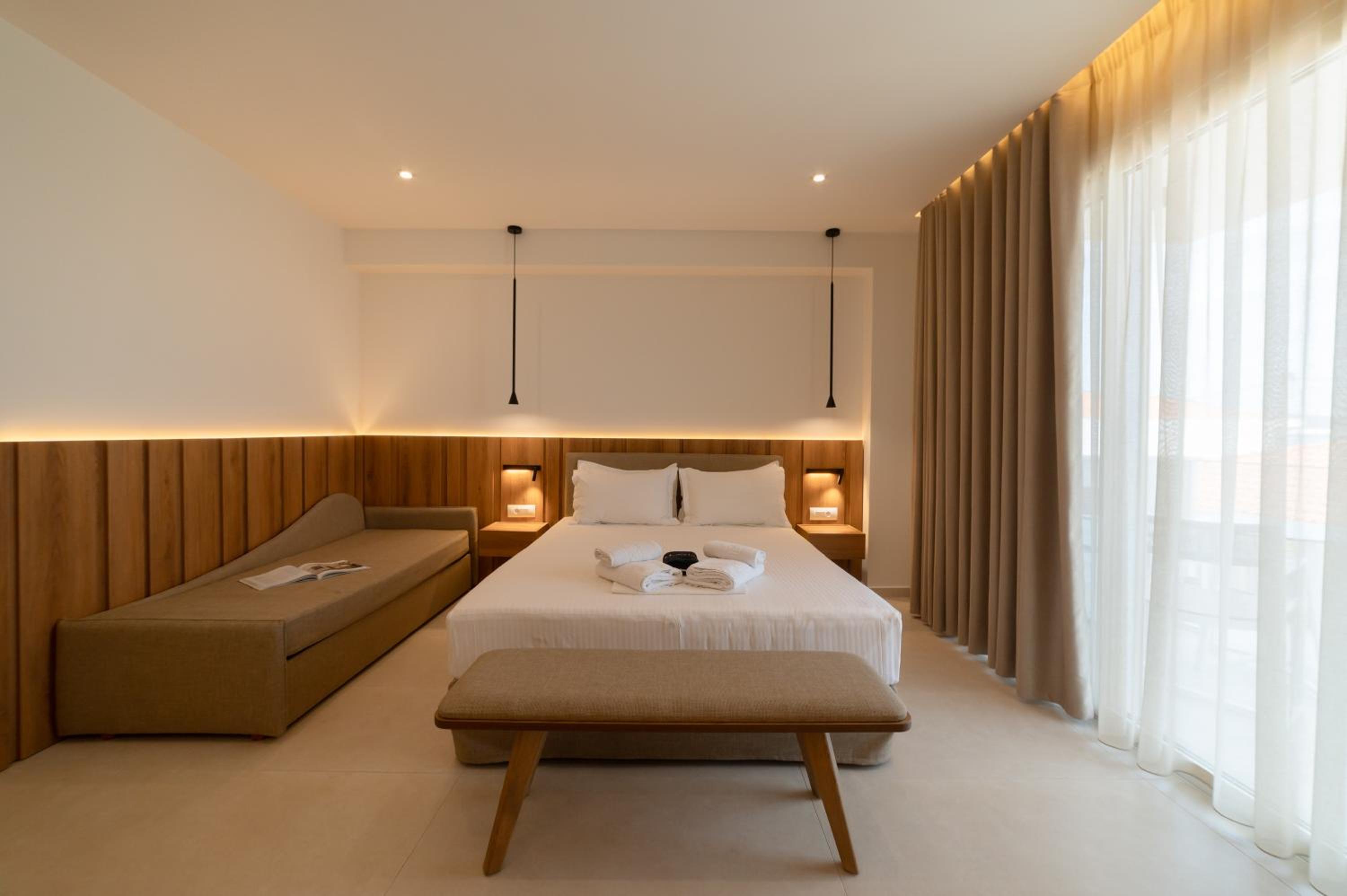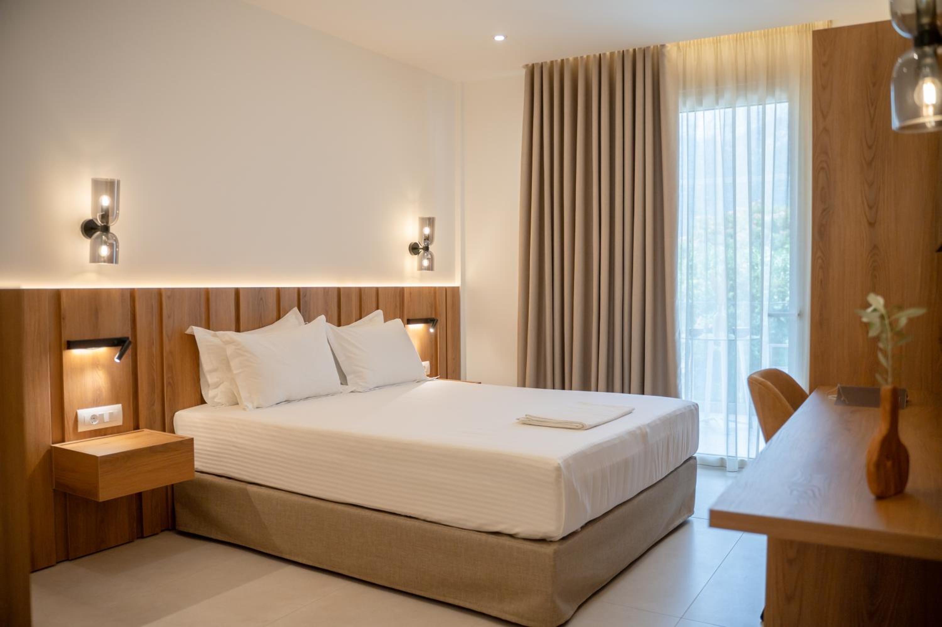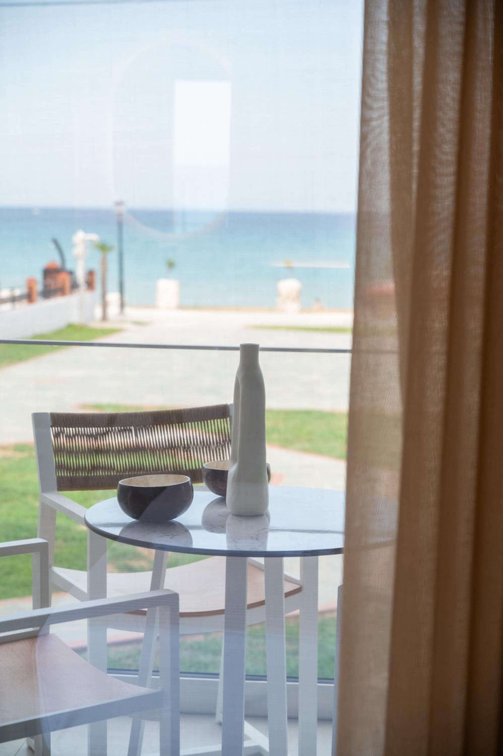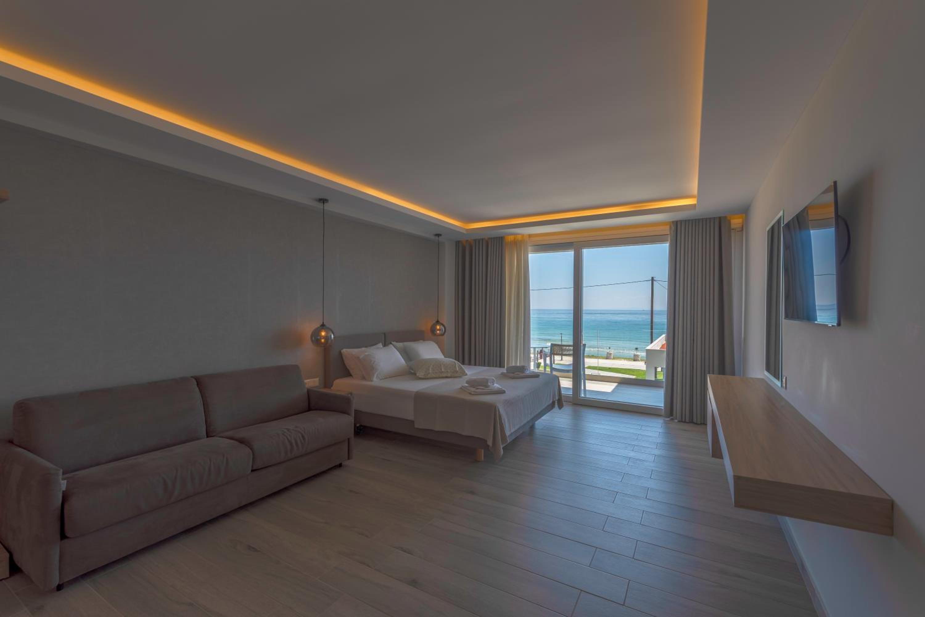 The hotel, room and furniture were very new and clean. Location was perfect, the golden beach and lots of taverns are in a few minutes of walking distance. Room was small but had a nice balcony. If you want to have some snack in your room or a drink before dinner, a well working refrigerator is also in the room.