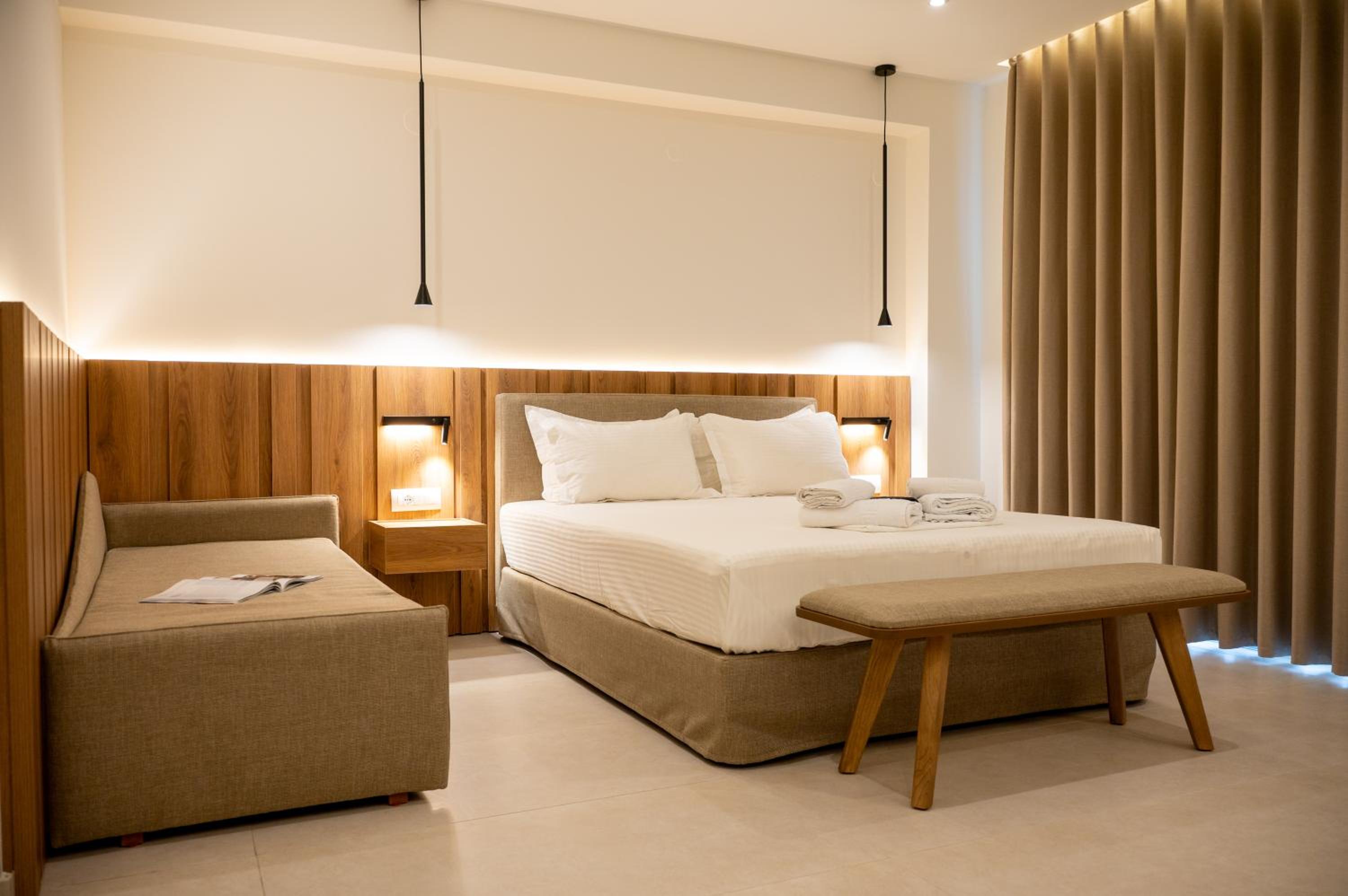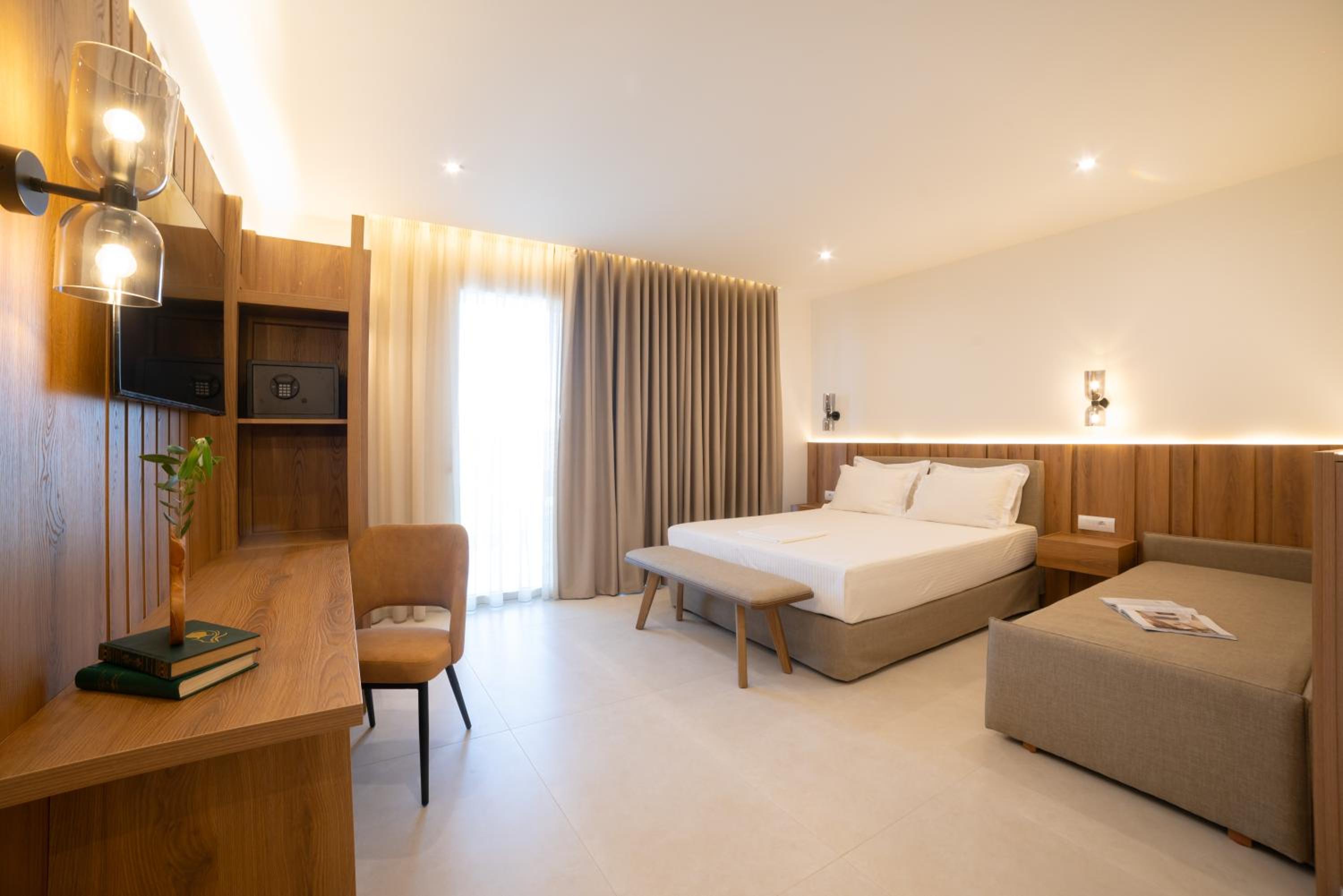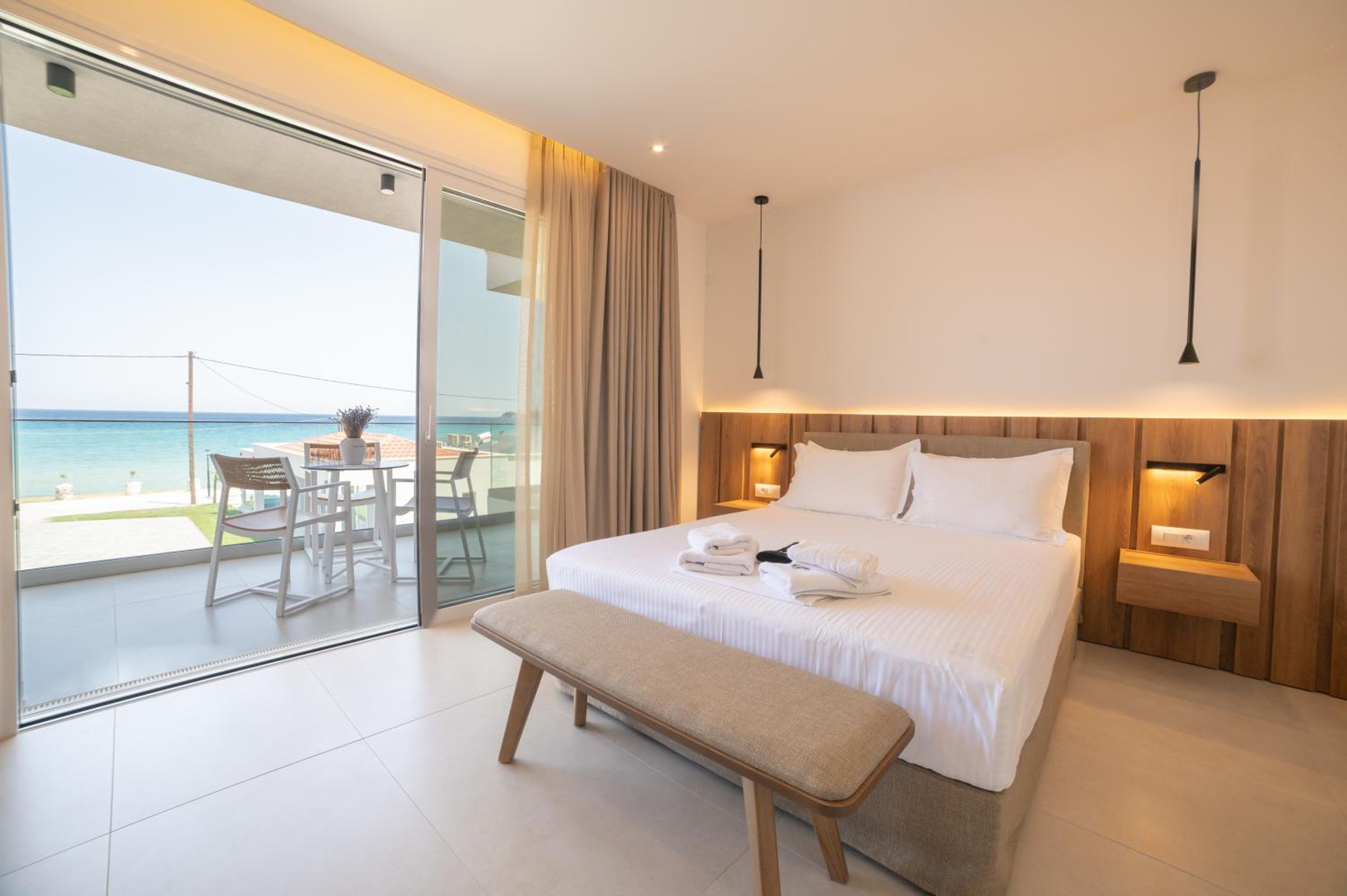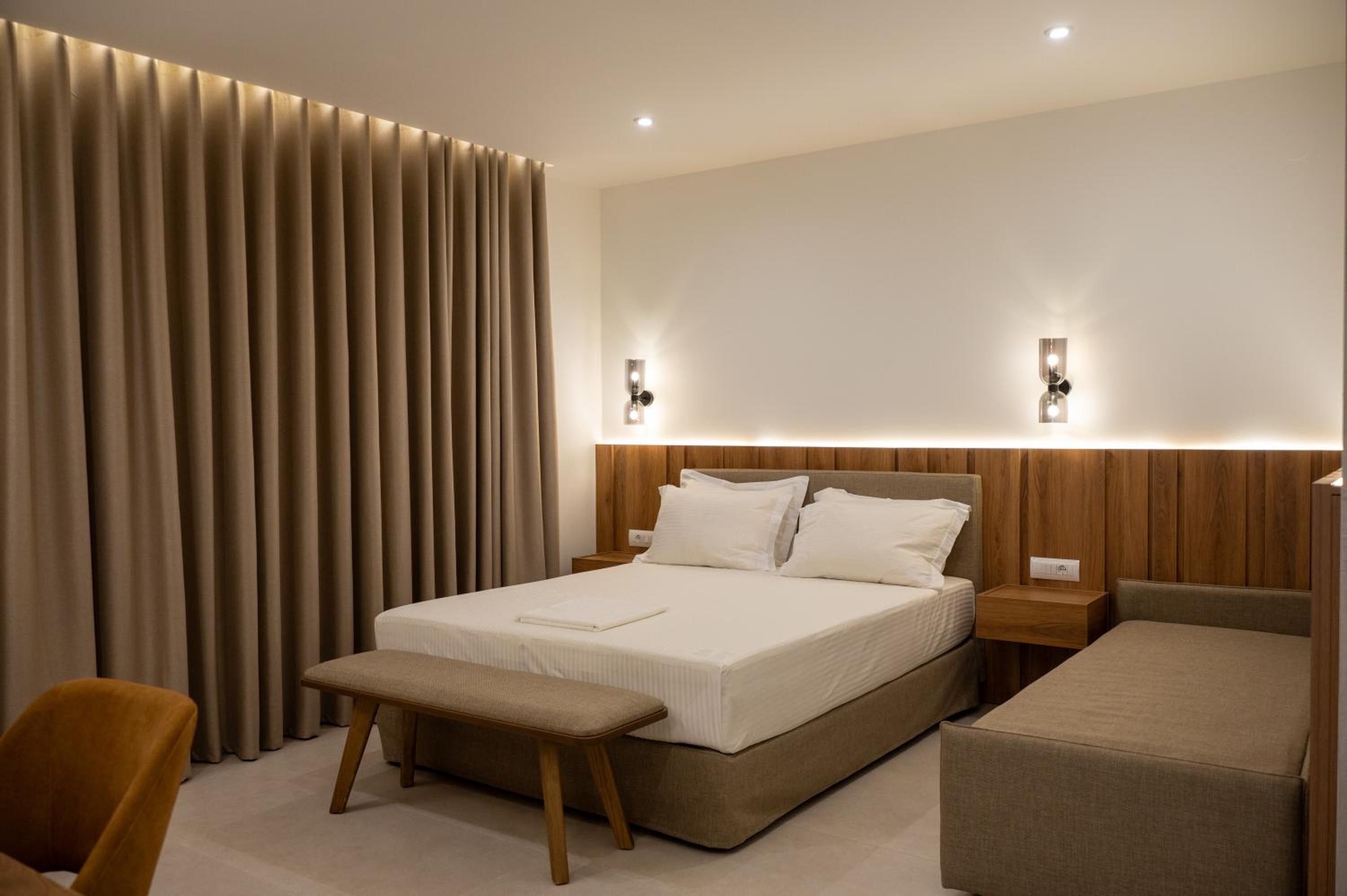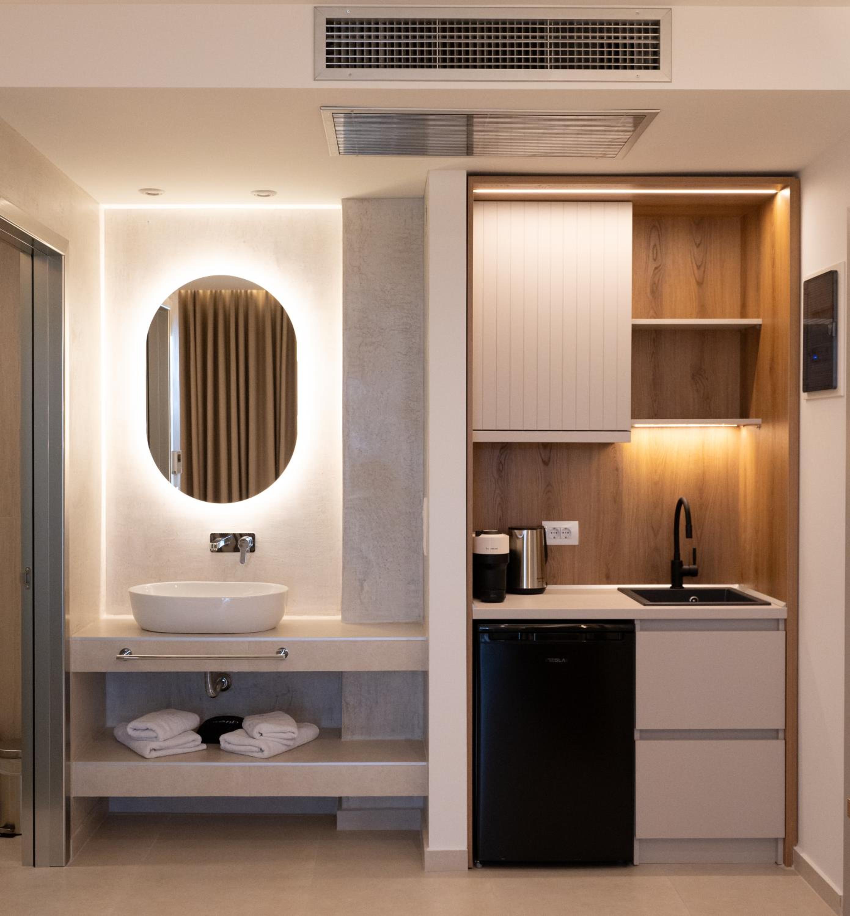 The hotel, room and furniture were very new and clean. Location was perfect, the golden beach and lots of taverns are in a few minutes of walking distance. Room was small but had a nice balcony. If you want to have some snack in your room or a drink before dinner, a well working refrigerator is also in the room.
