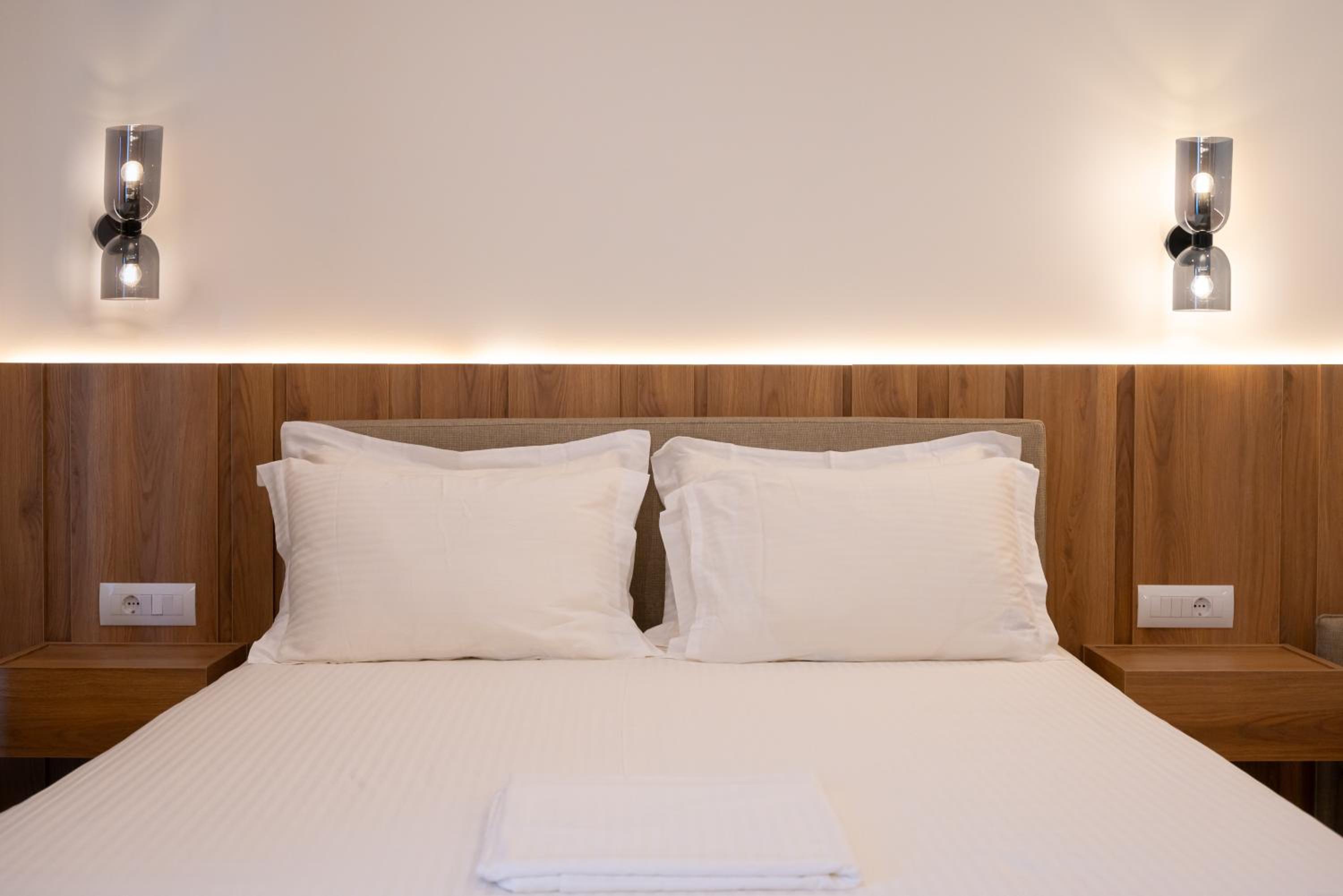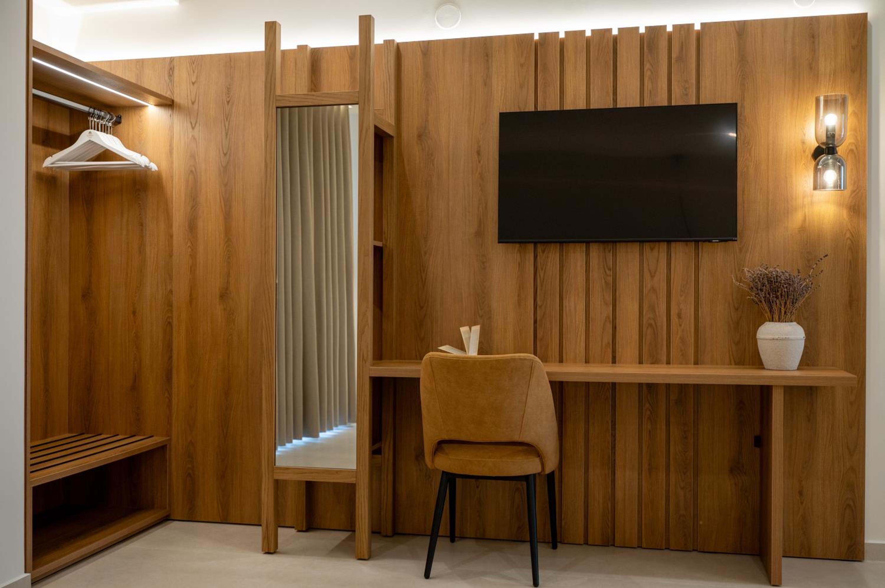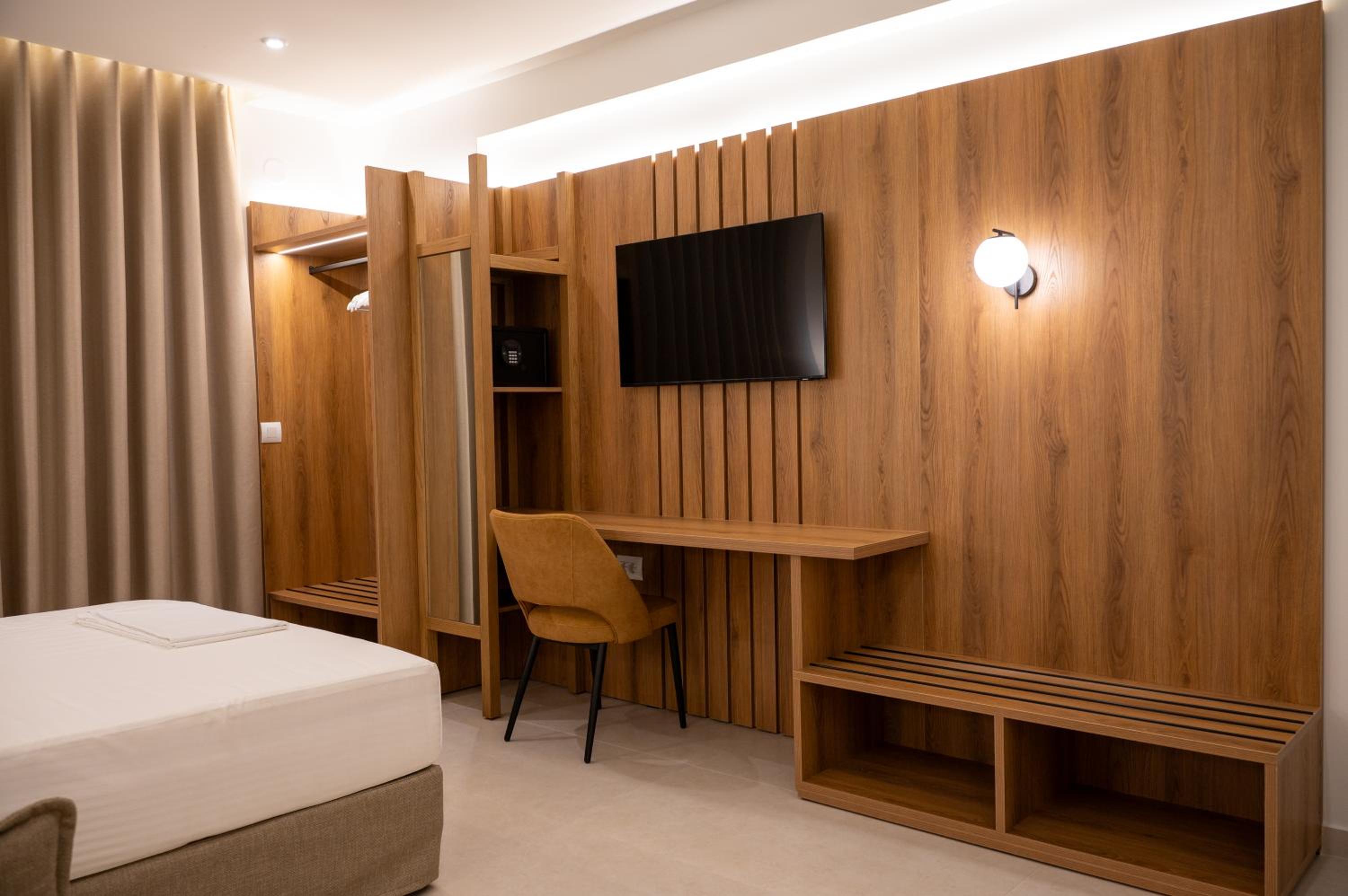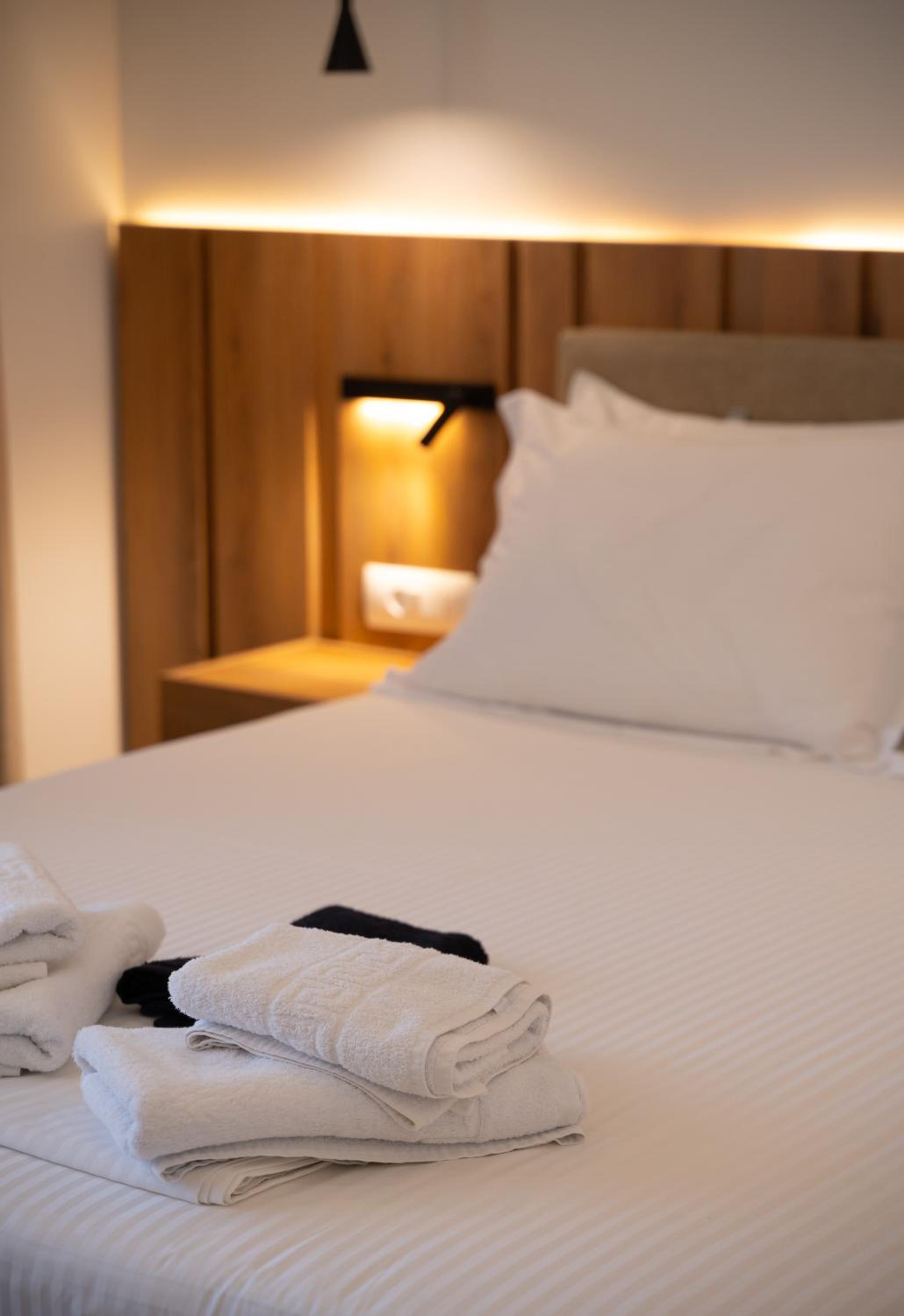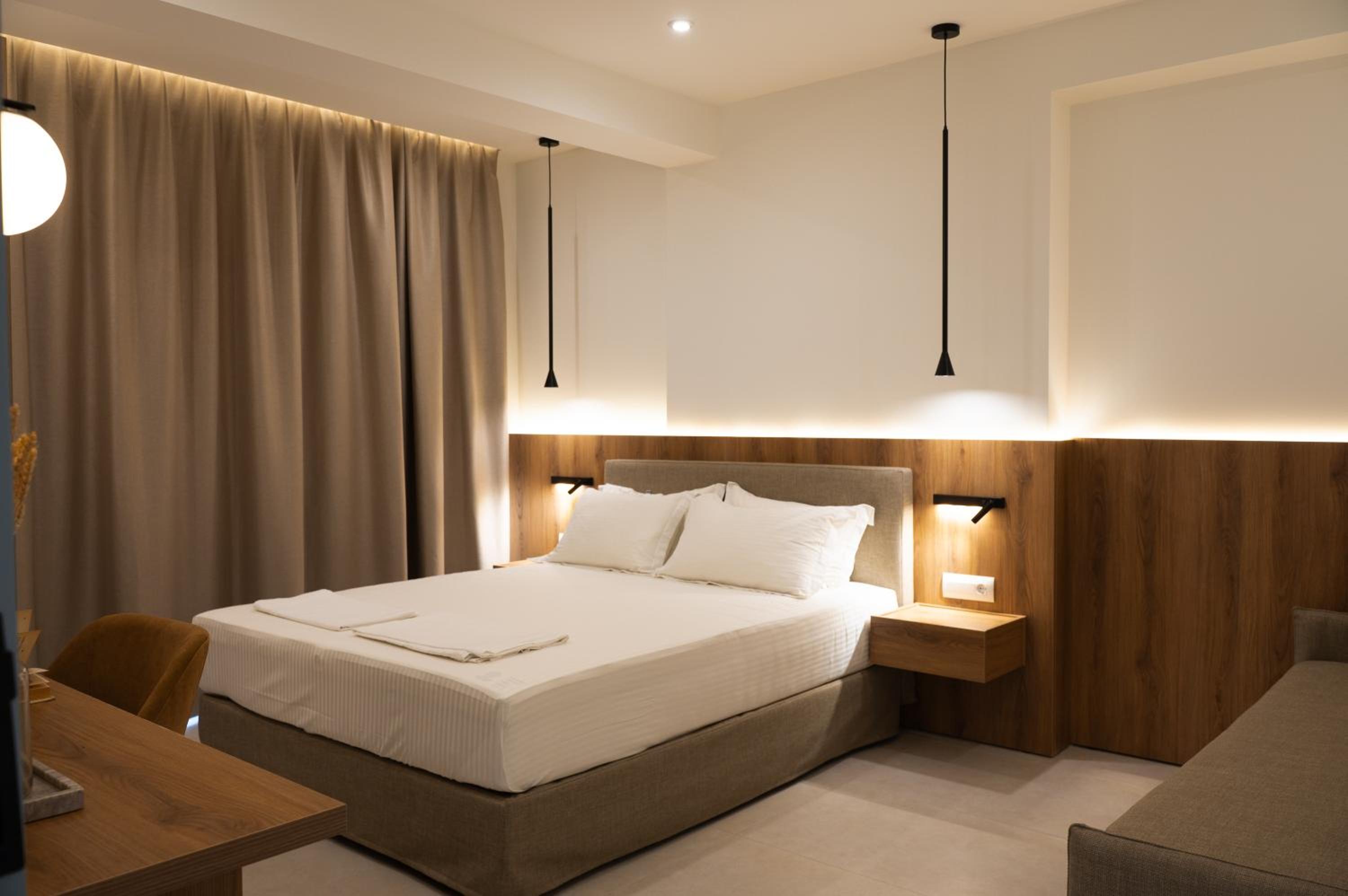 The hotel, room and furniture were very new and clean. Location was perfect, the golden beach and lots of taverns are in a few minutes of walking distance. Room was small but had a nice balcony. If you want to have some snack in your room or a drink before dinner, a well working refrigerator is also in the room.