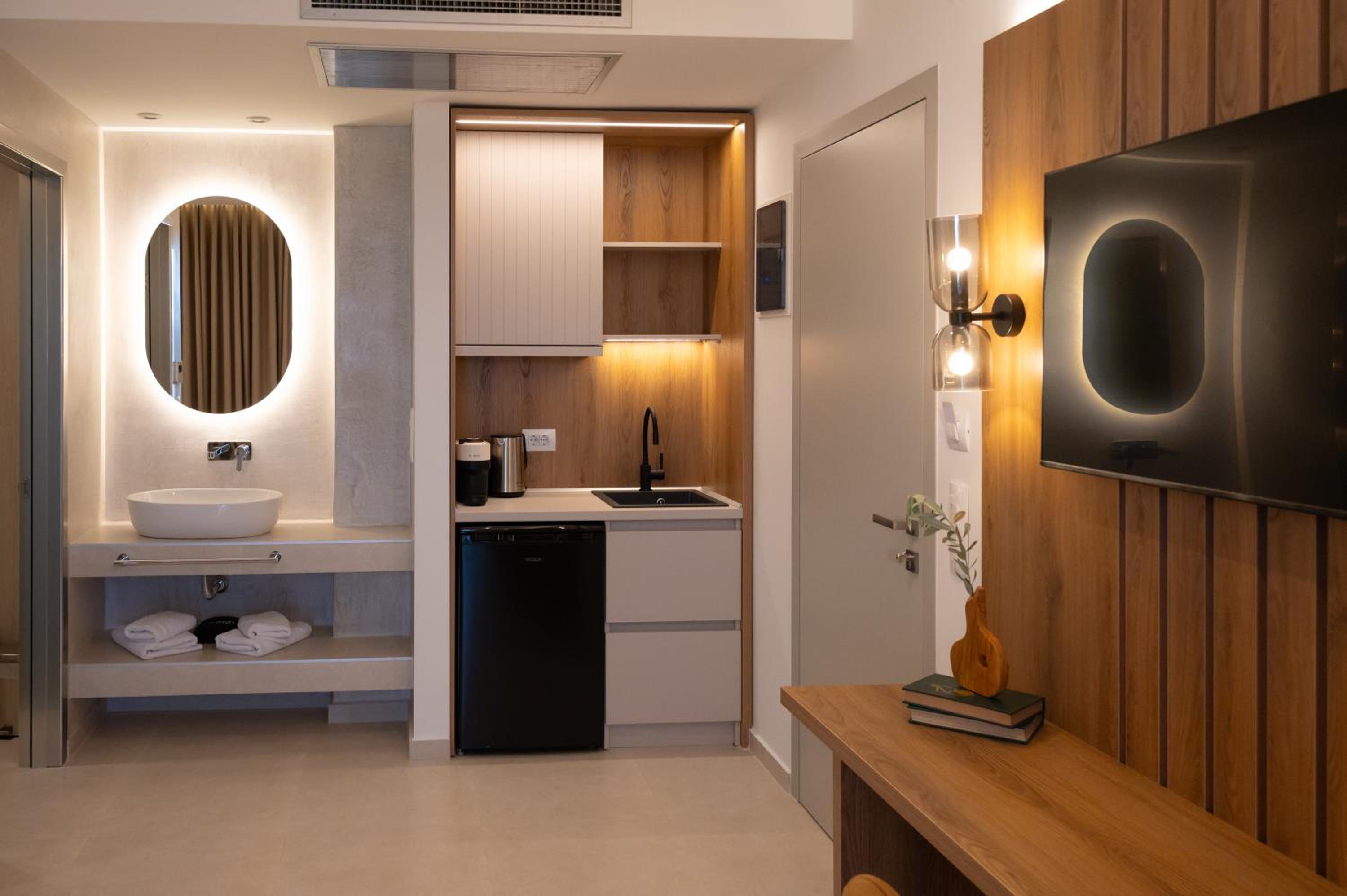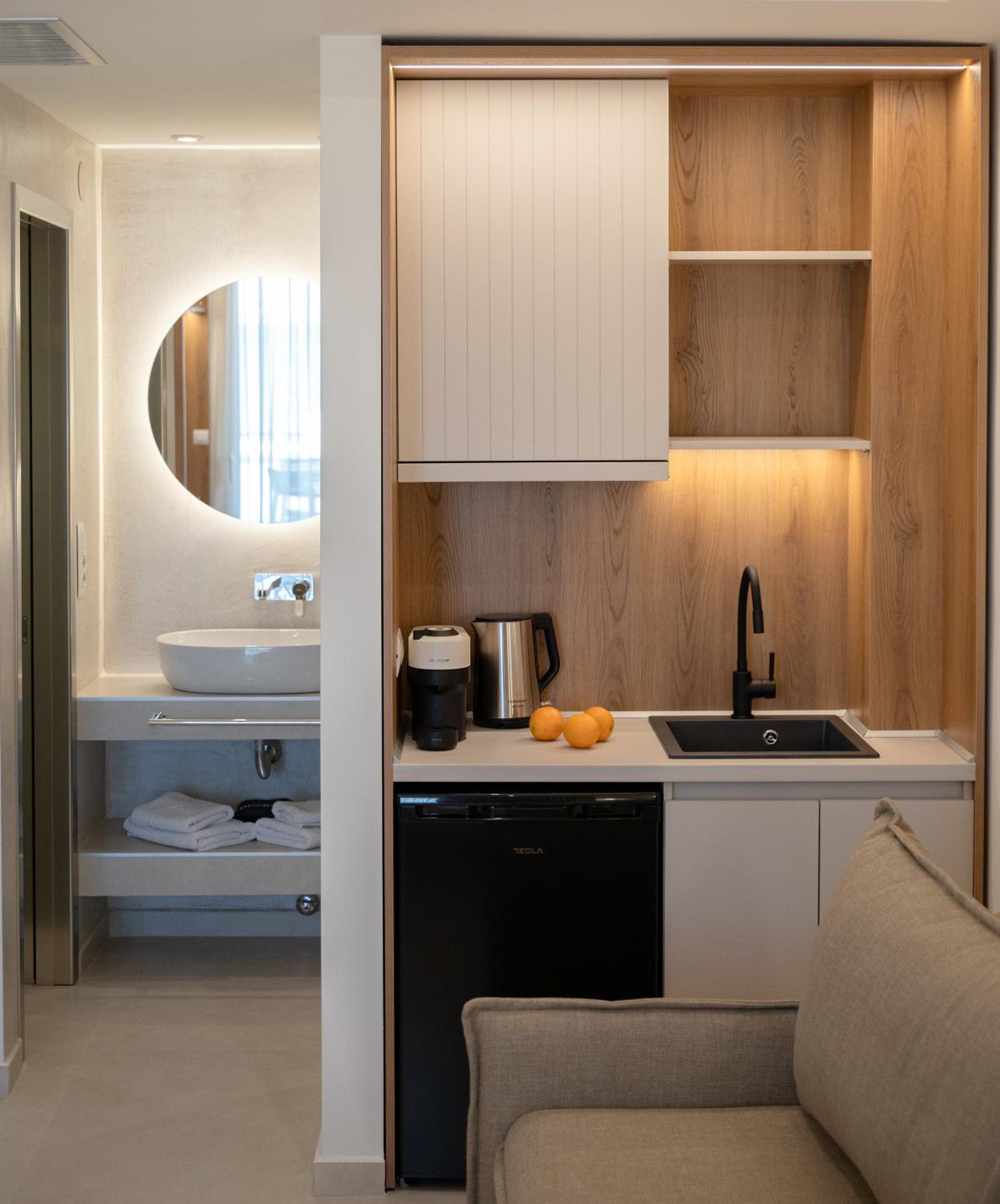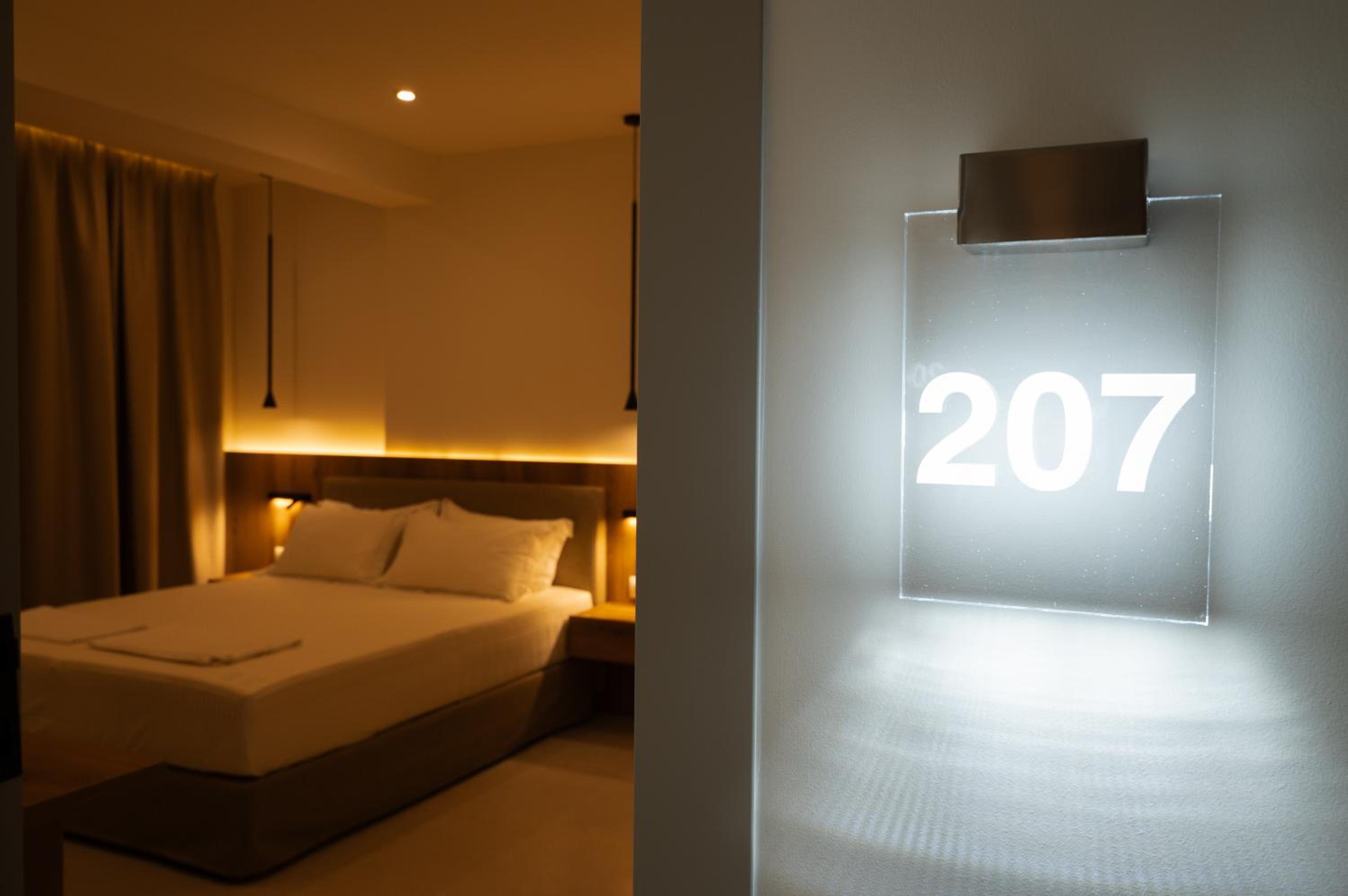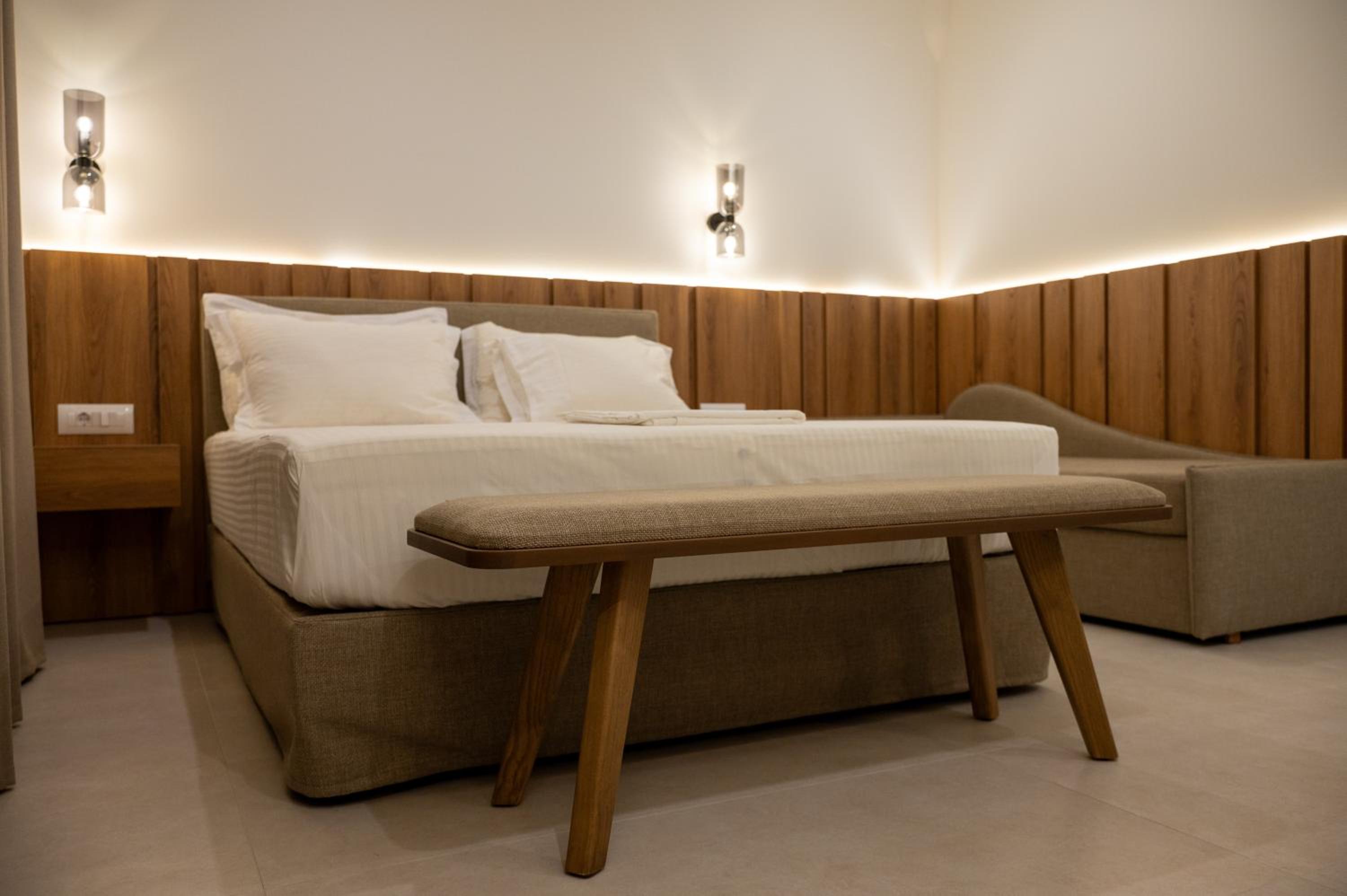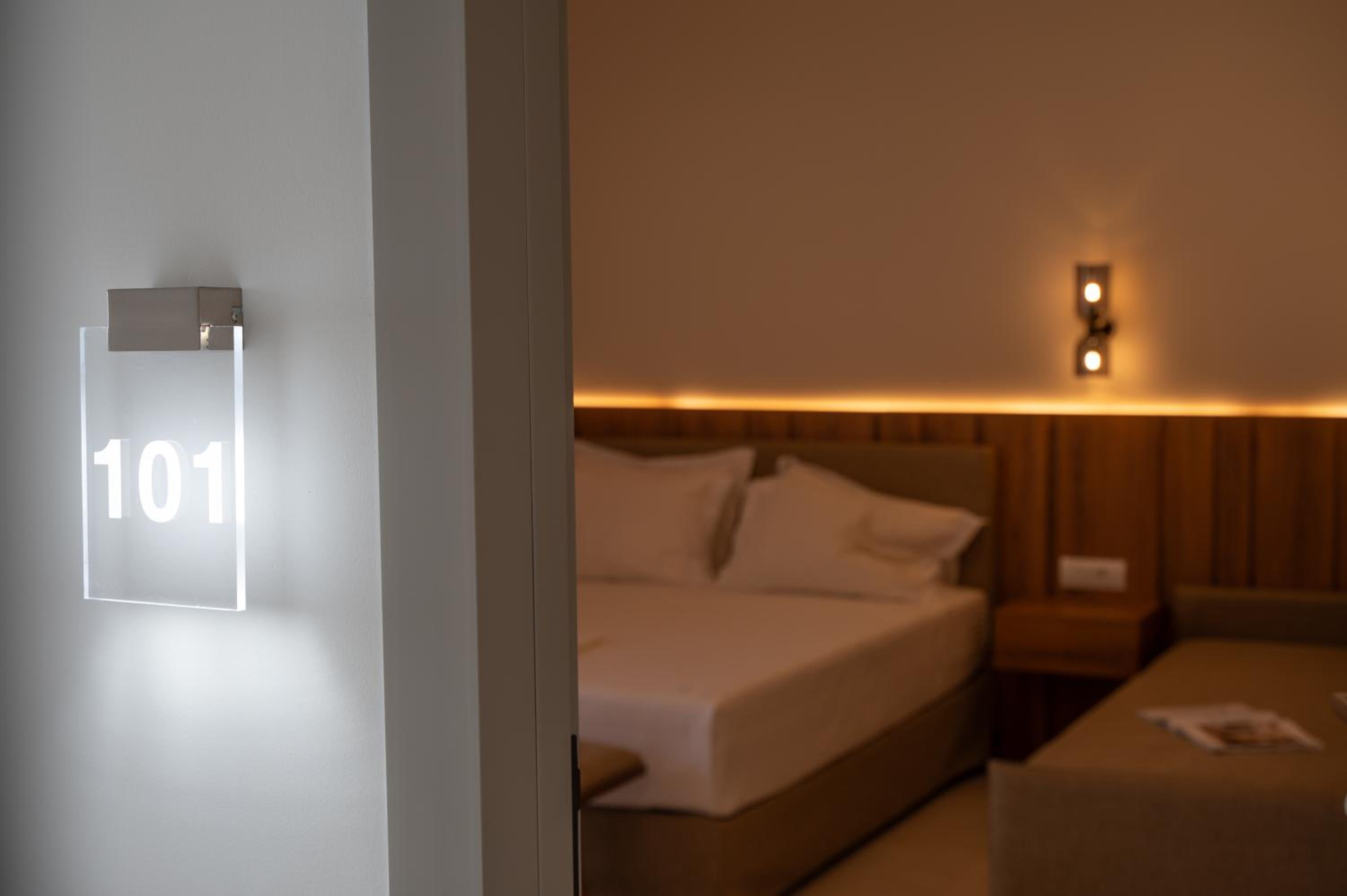 The hotel, room and furniture were very new and clean. Location was perfect, the golden beach and lots of taverns are in a few minutes of walking distance. Room was small but had a nice balcony. If you want to have some snack in your room or a drink before dinner, a well working refrigerator is also in the room.