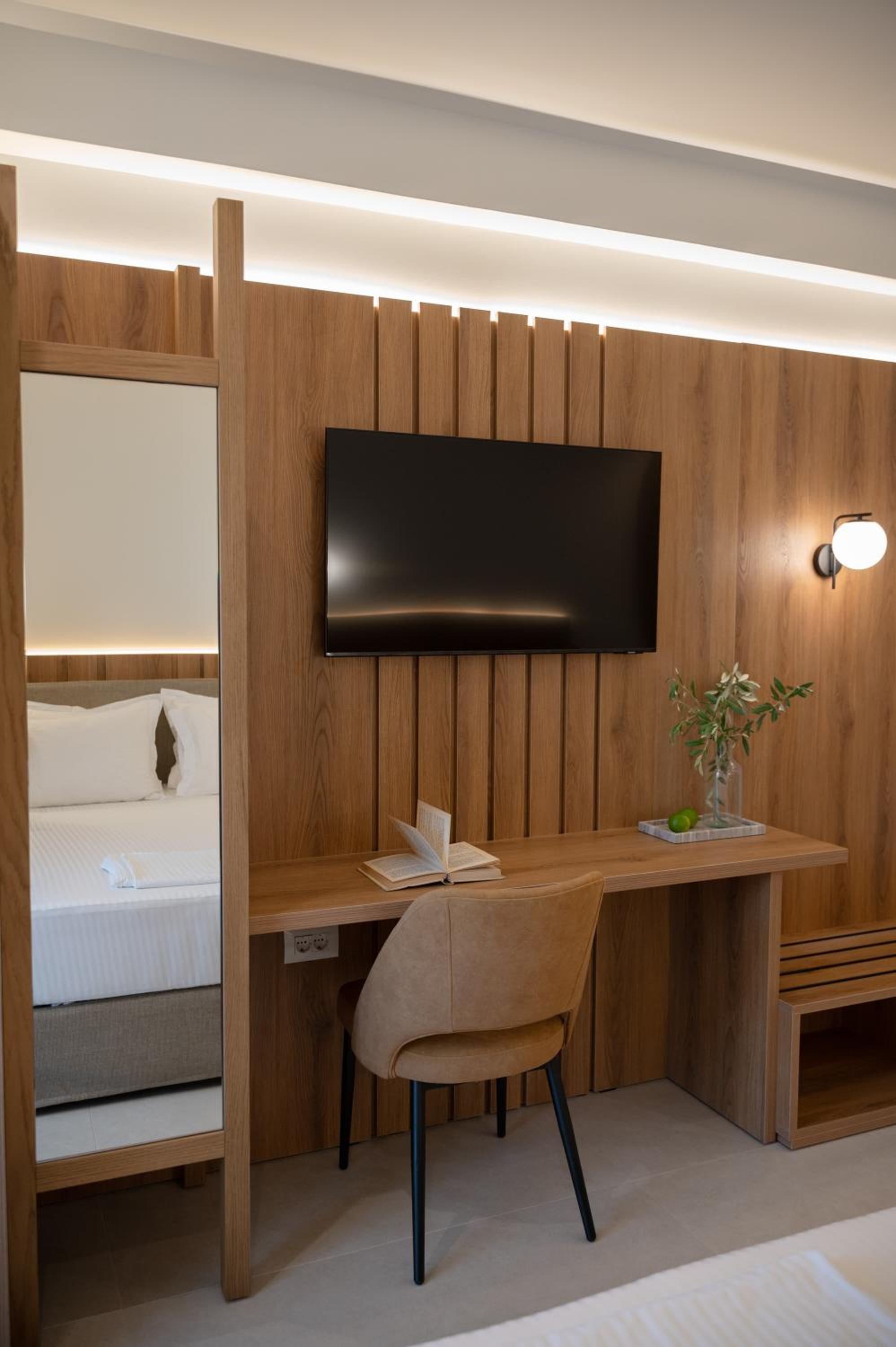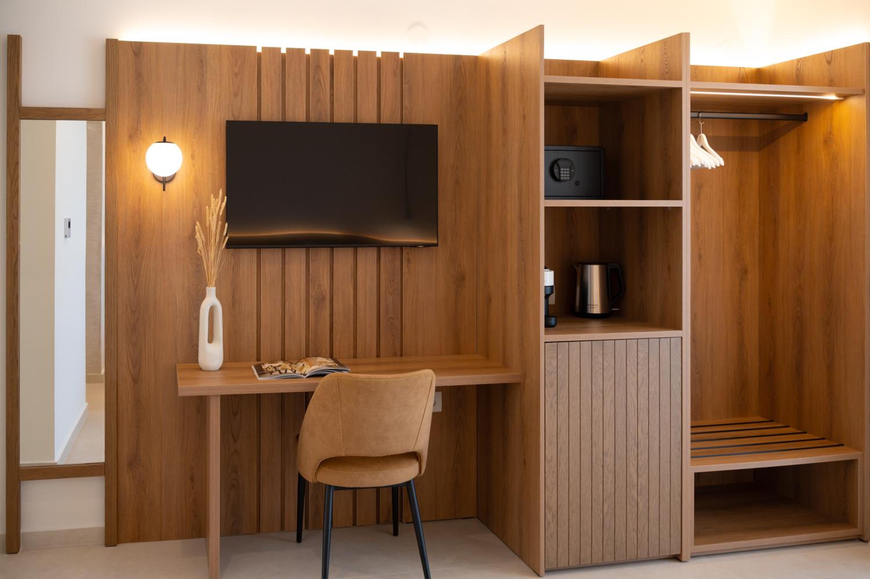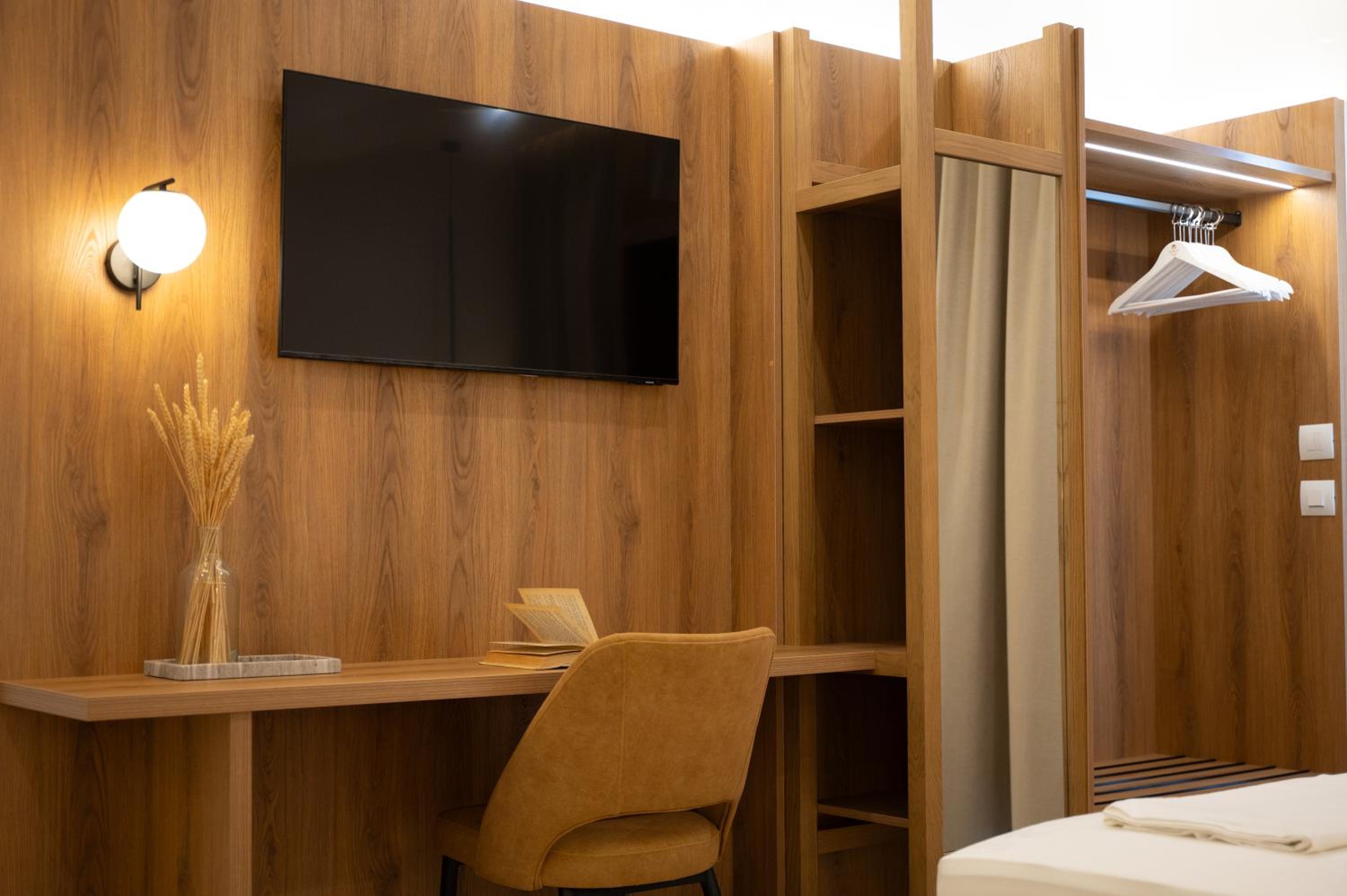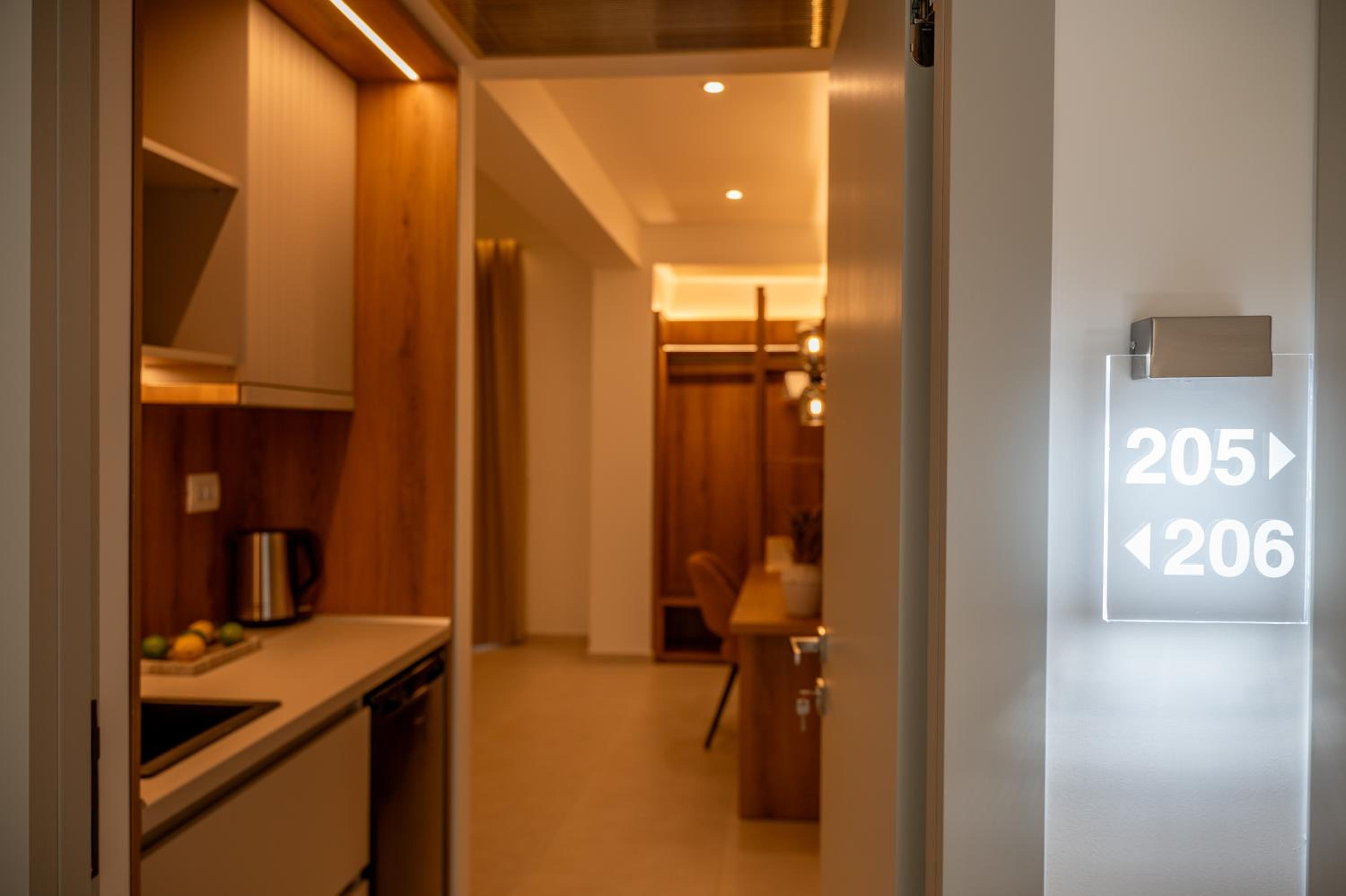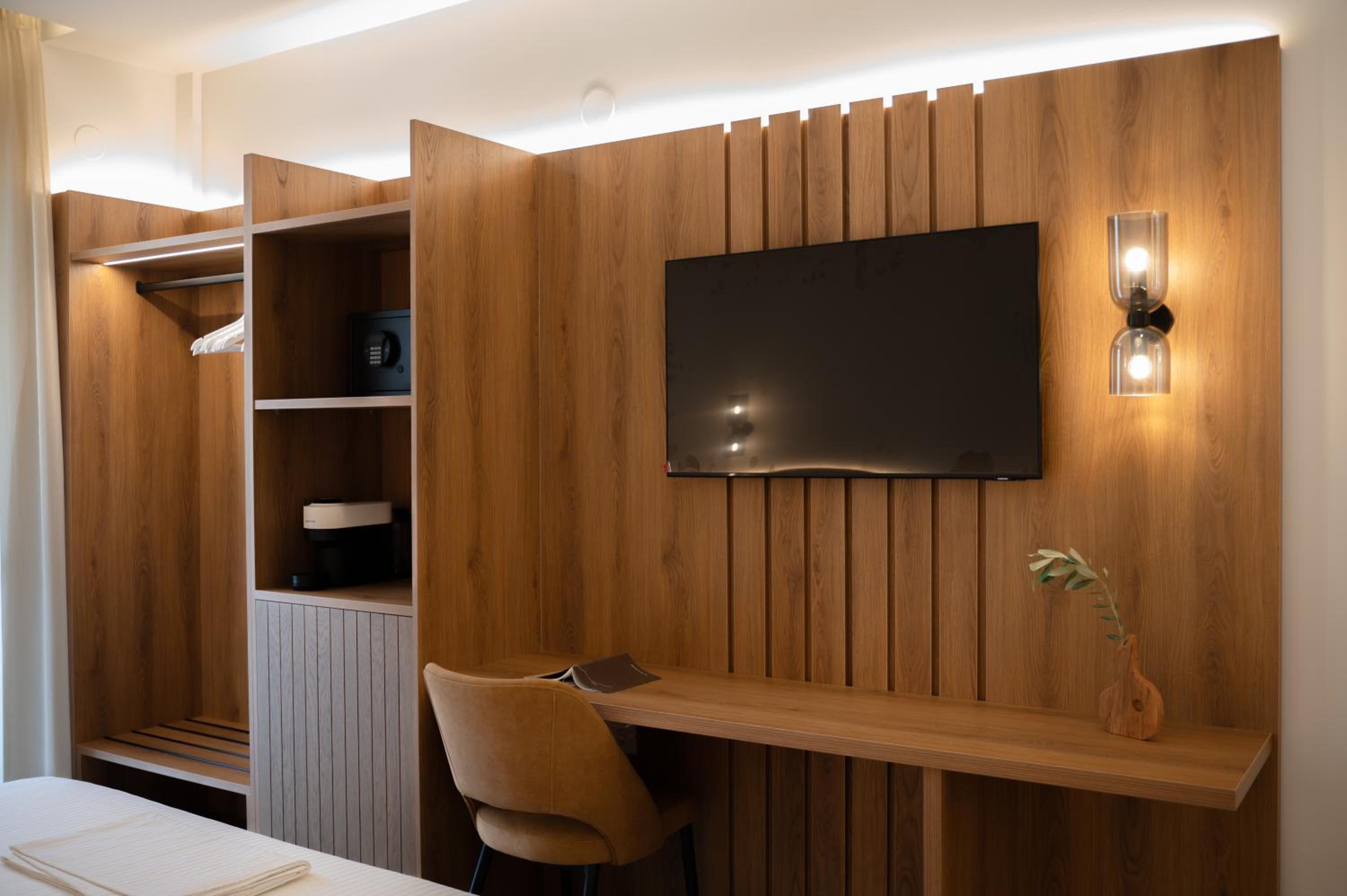 The hotel, room and furniture were very new and clean. Location was perfect, the golden beach and lots of taverns are in a few minutes of walking distance. Room was small but had a nice balcony. If you want to have some snack in your room or a drink before dinner, a well working refrigerator is also in the room.