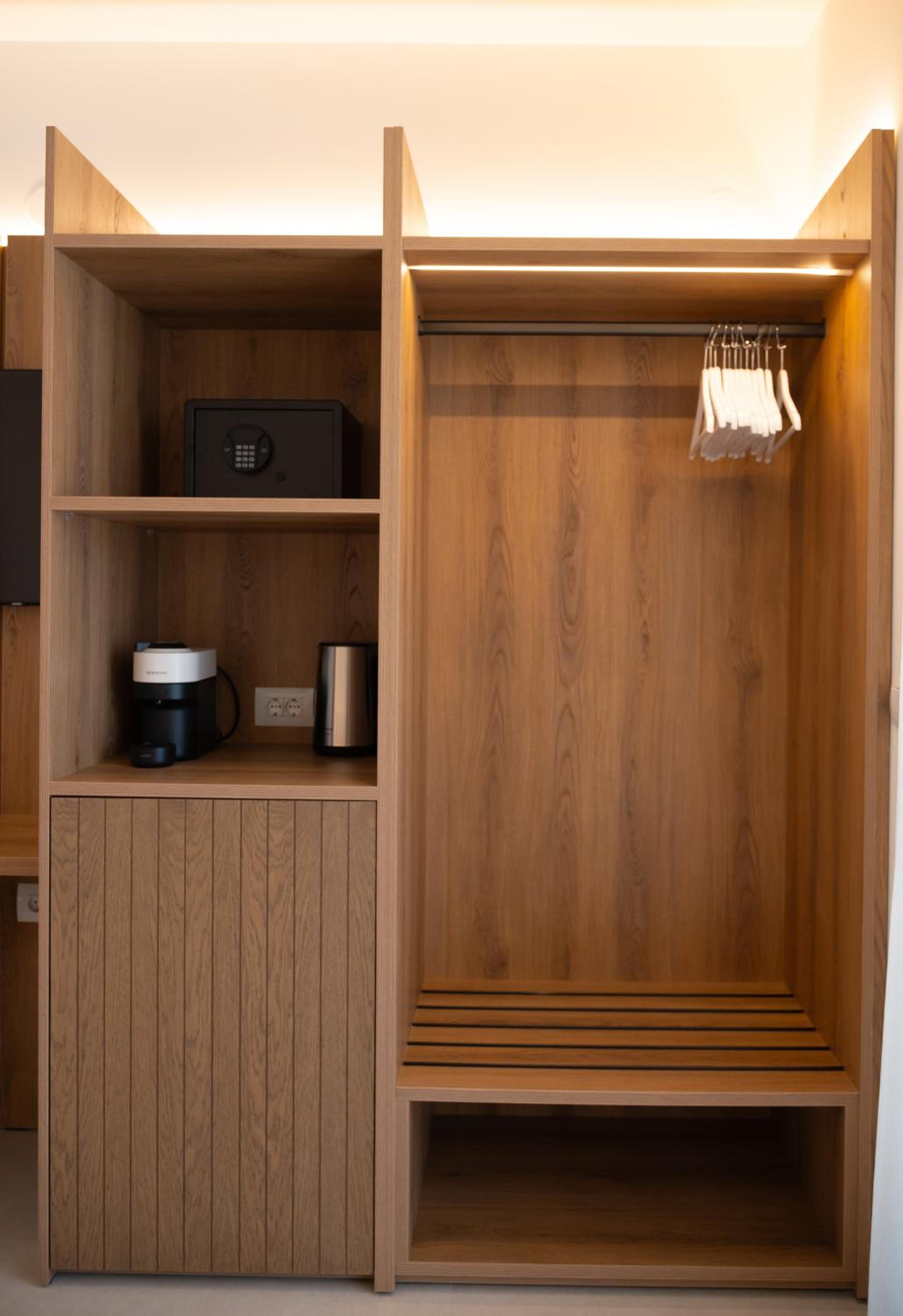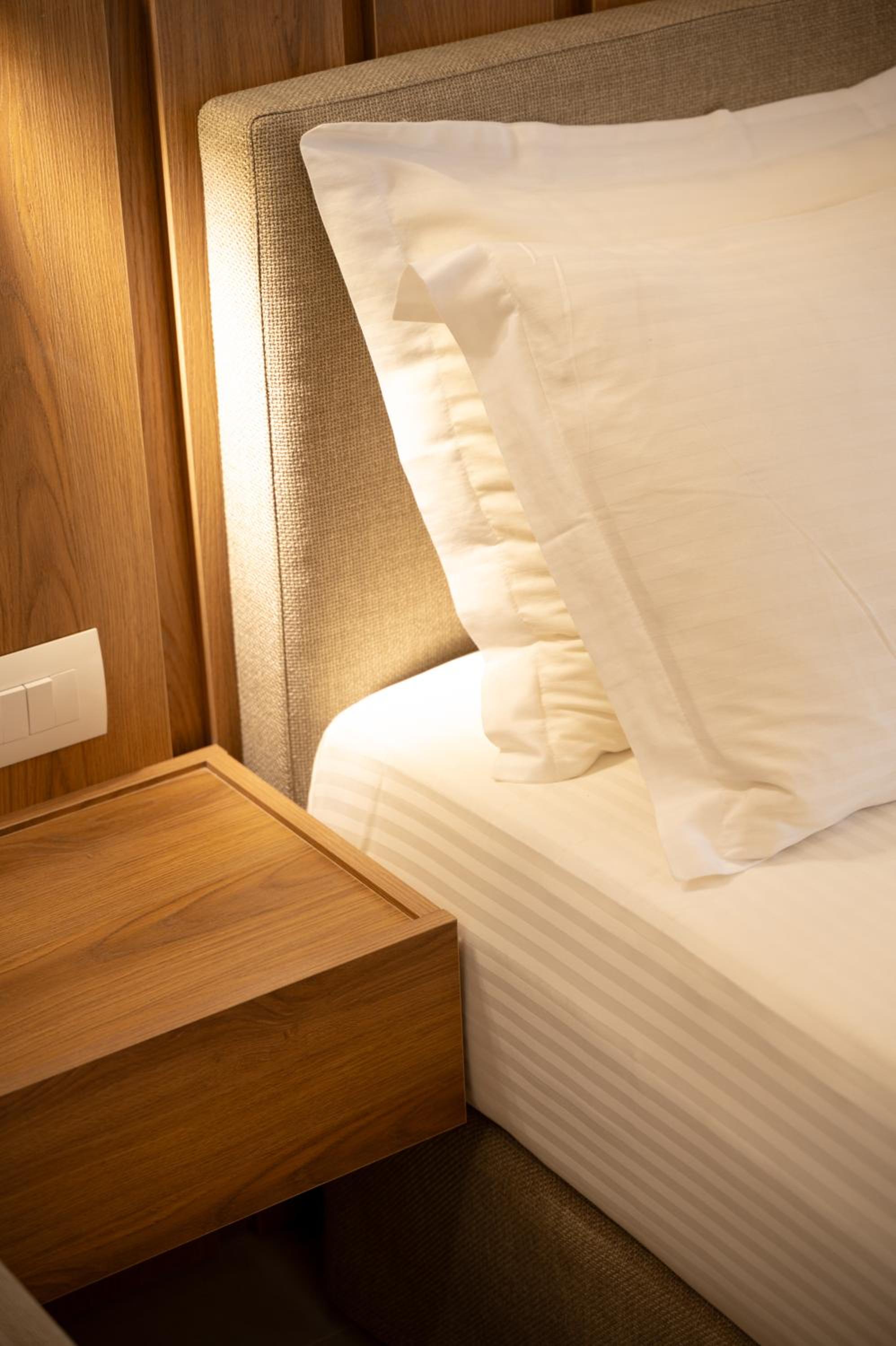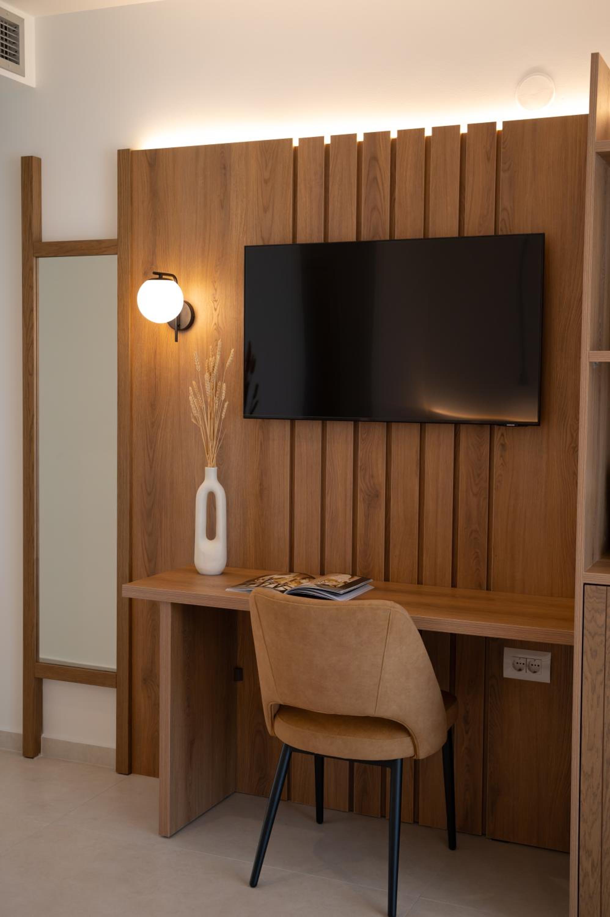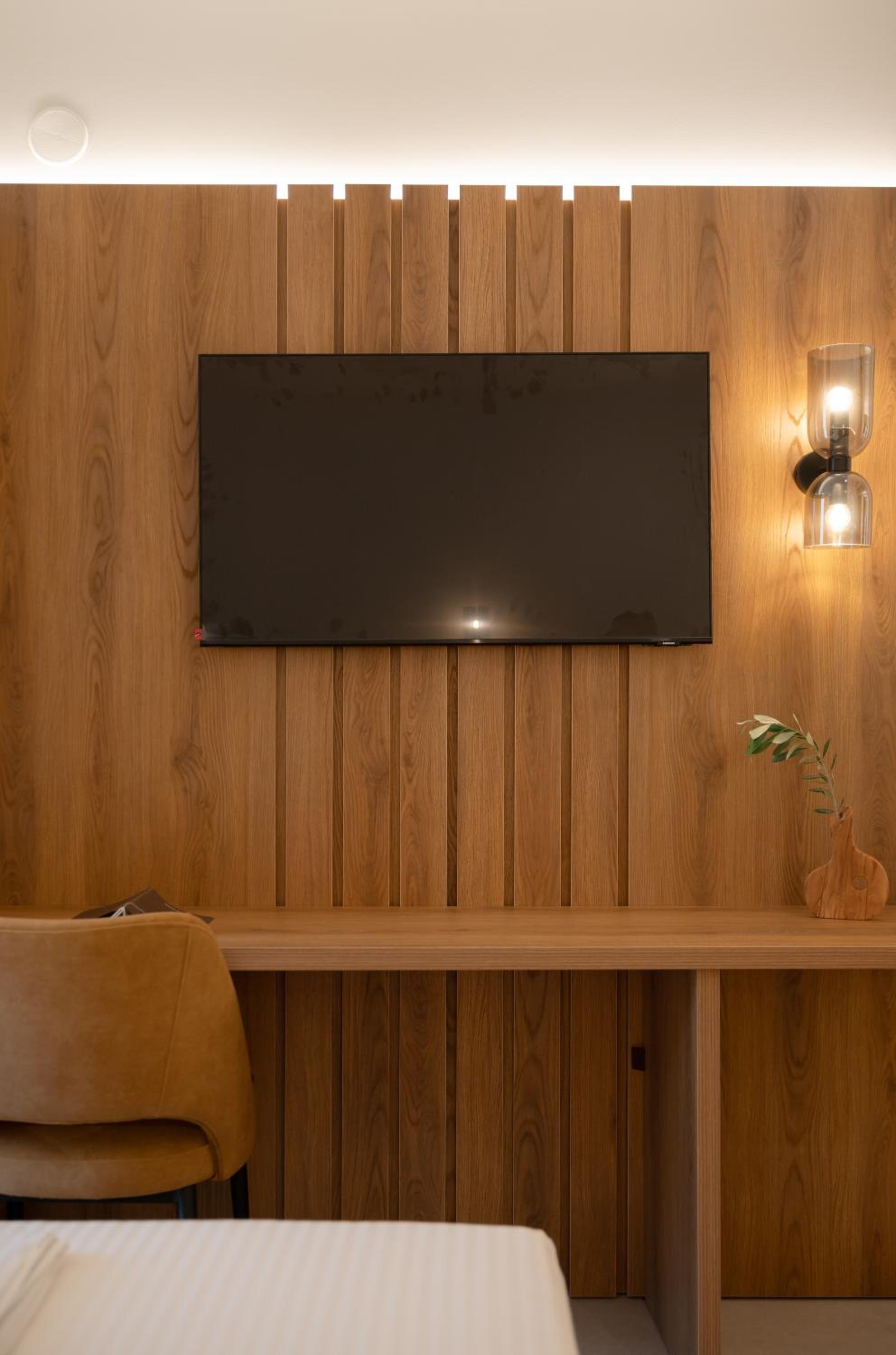 The hotel, room and furniture were very new and clean. Location was perfect, the golden beach and lots of taverns are in a few minutes of walking distance. Room was small but had a nice balcony. If you want to have some snack in your room or a drink before dinner, a well working refrigerator is also in the room.