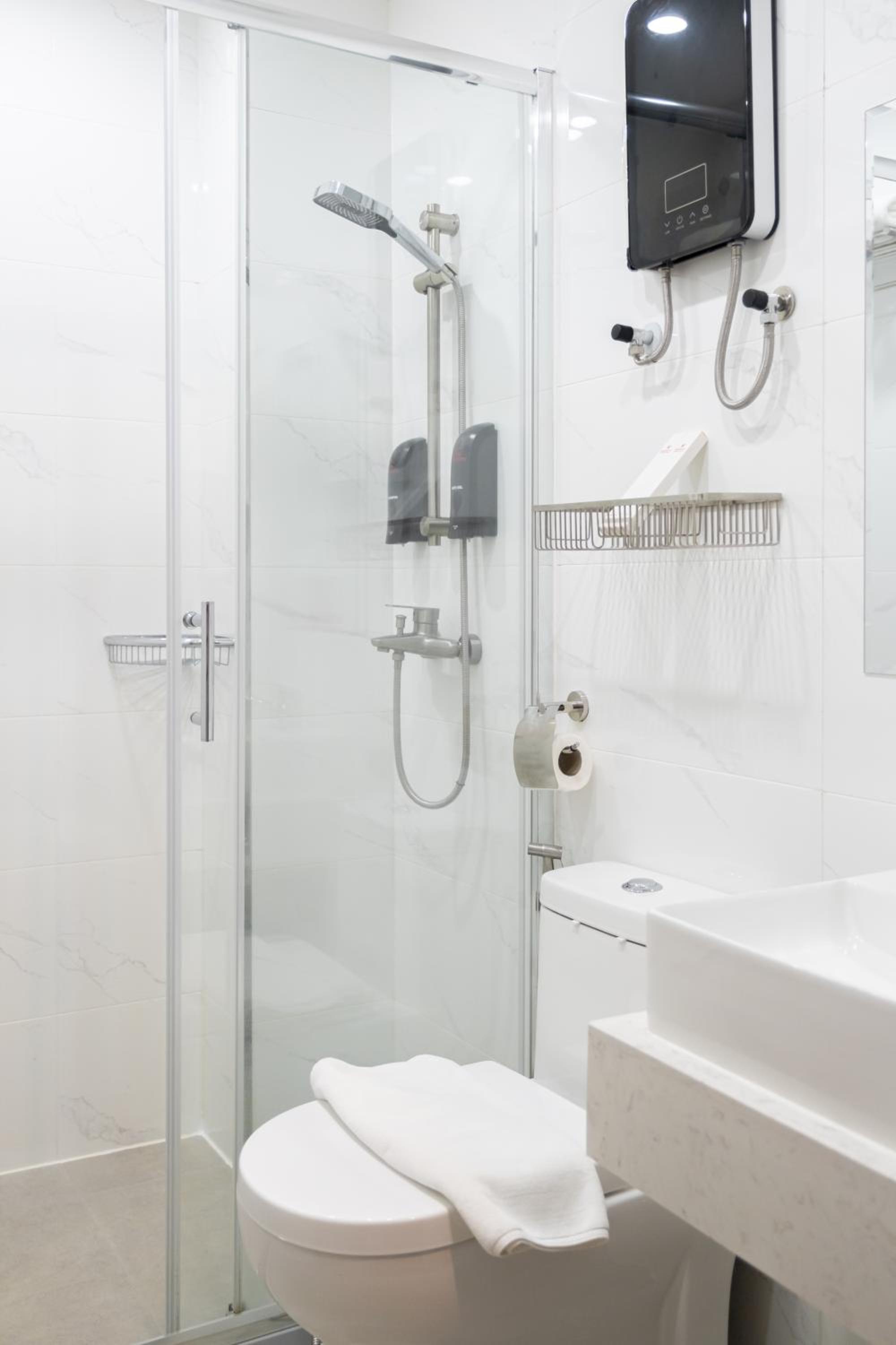 No mat was provided for the slippery shower floor. I fell in the shower due to it's extreme slipperiness. Everything else was fine.