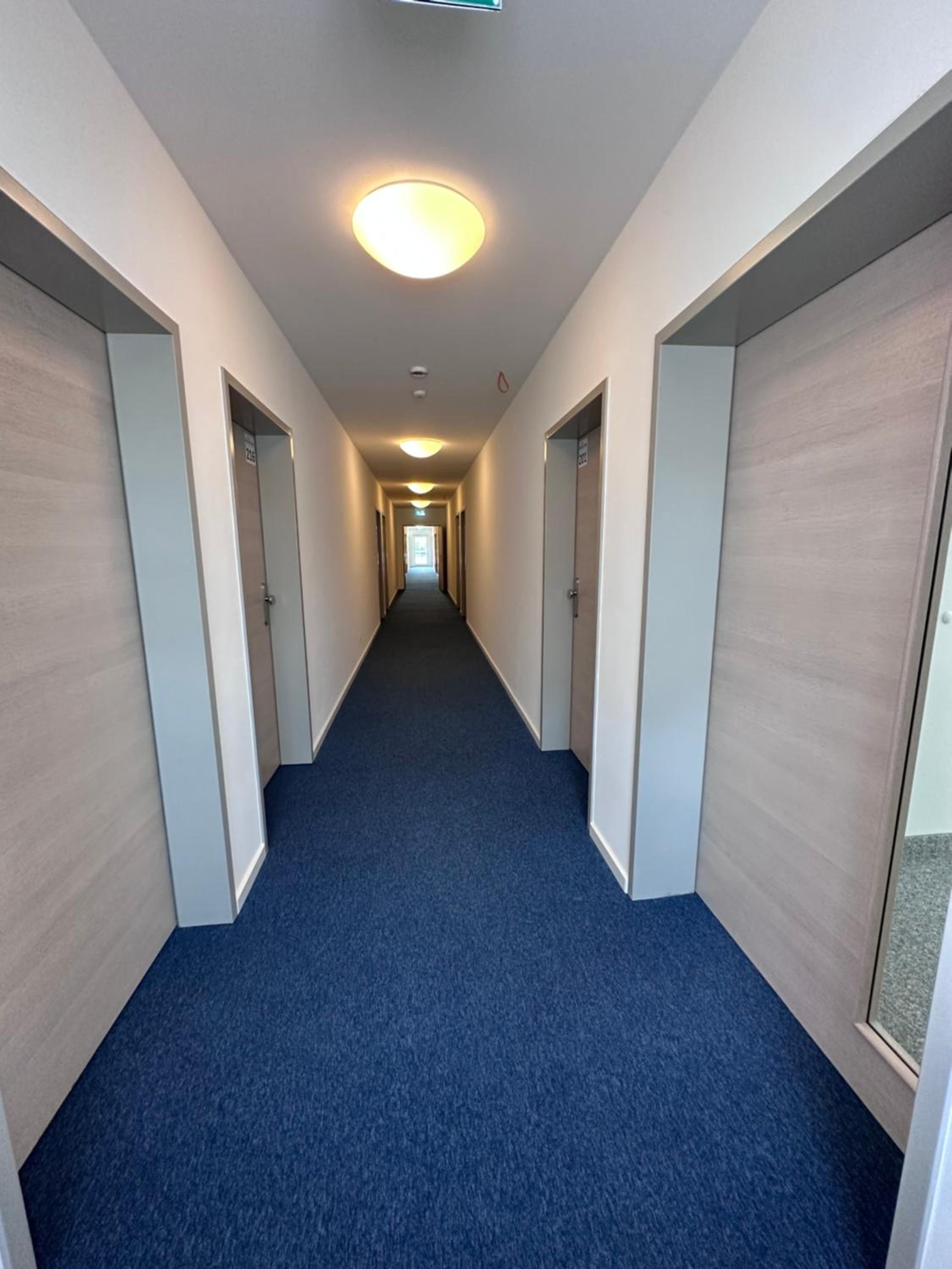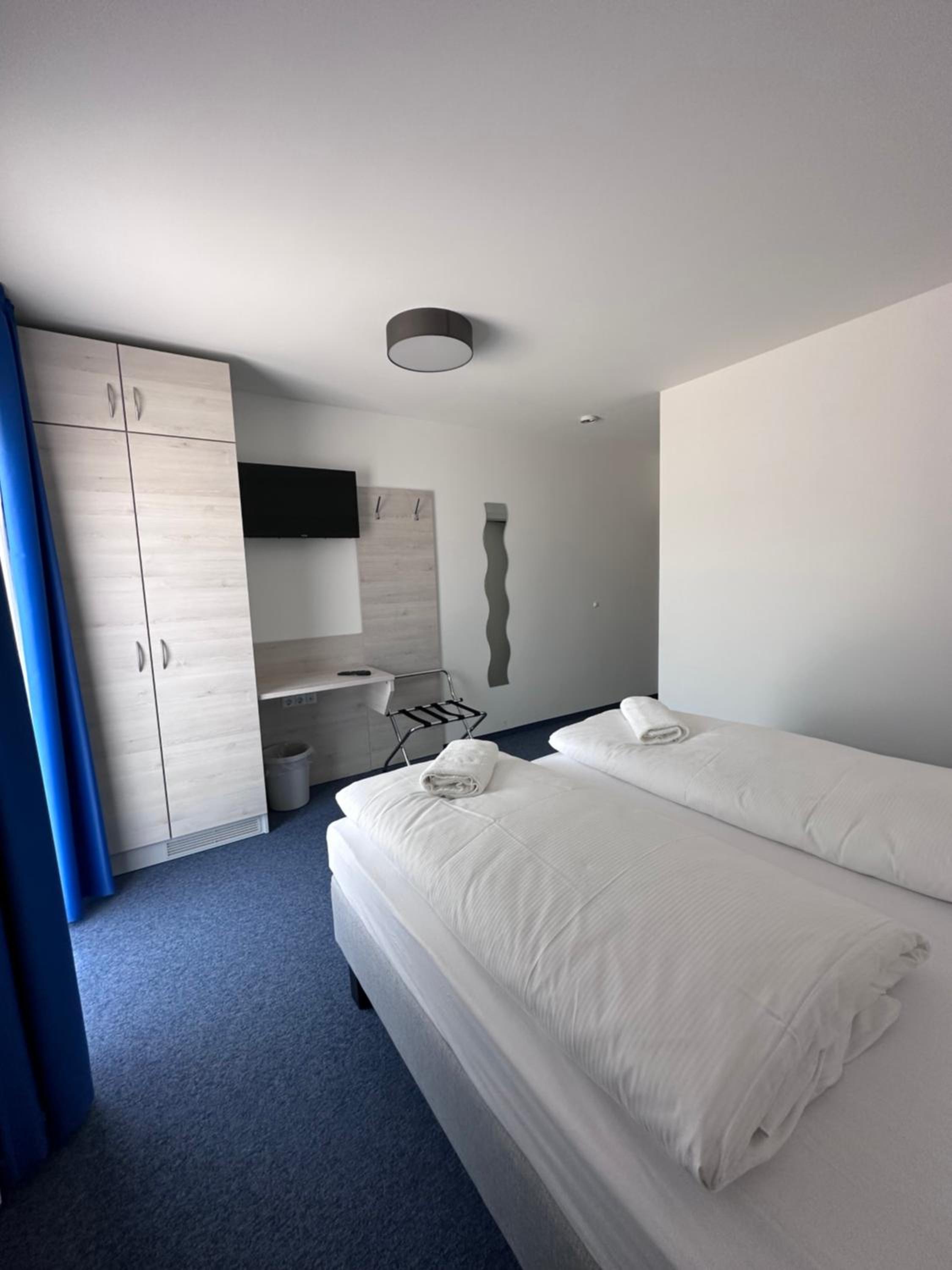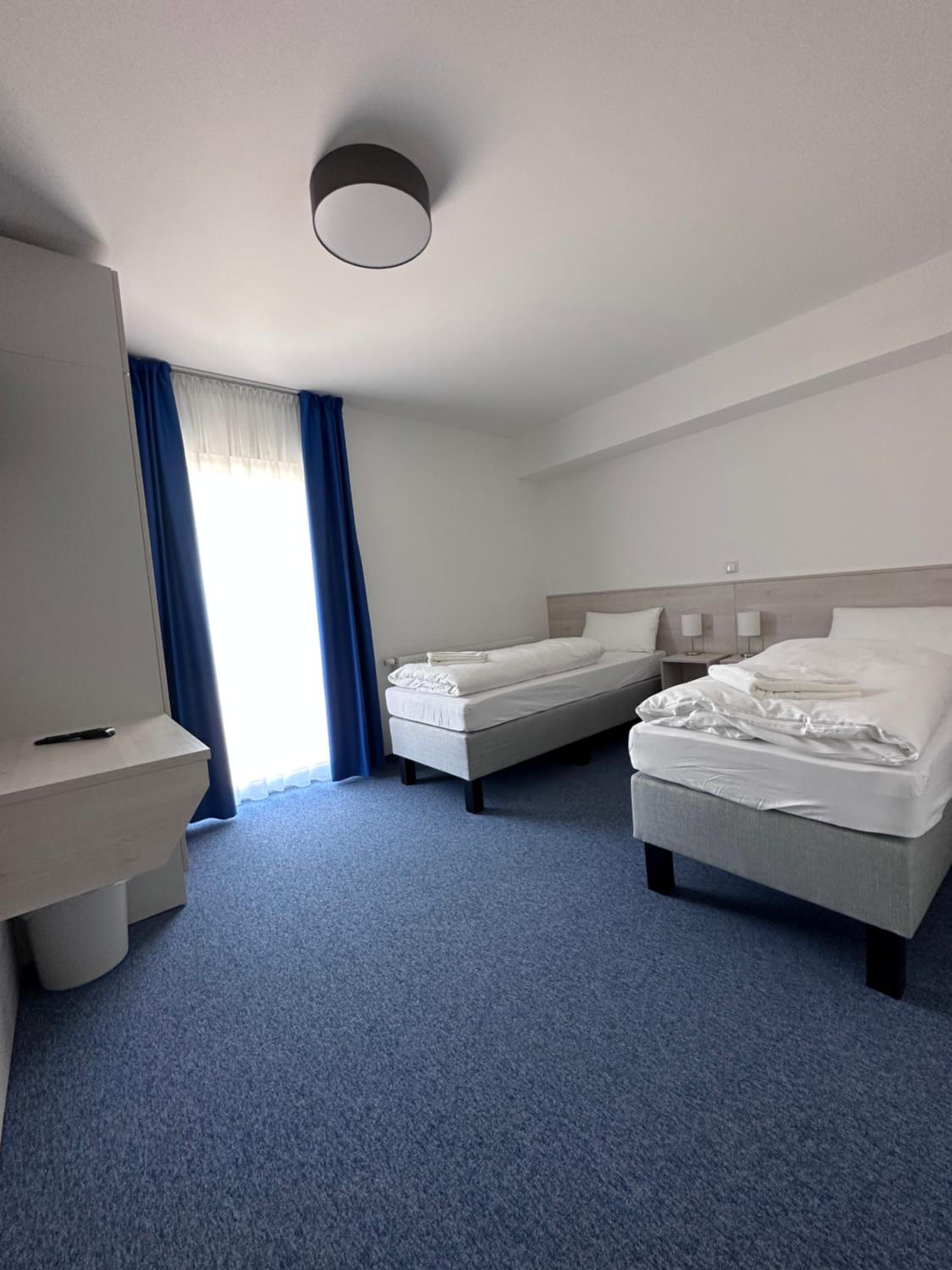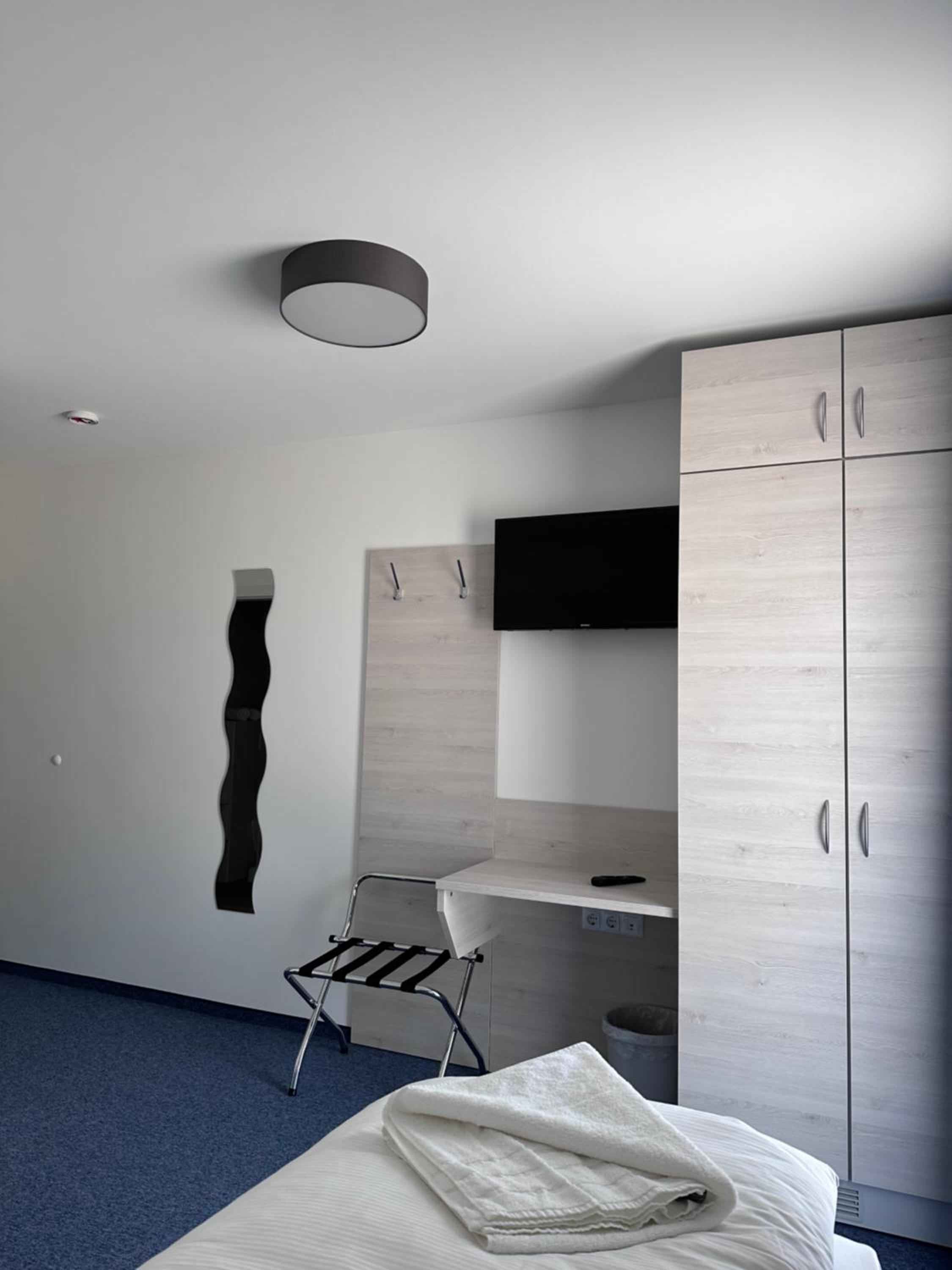 Die Zimmer sind sehr nüchtern, kahl sowie zweckmäßig eingerichtet.