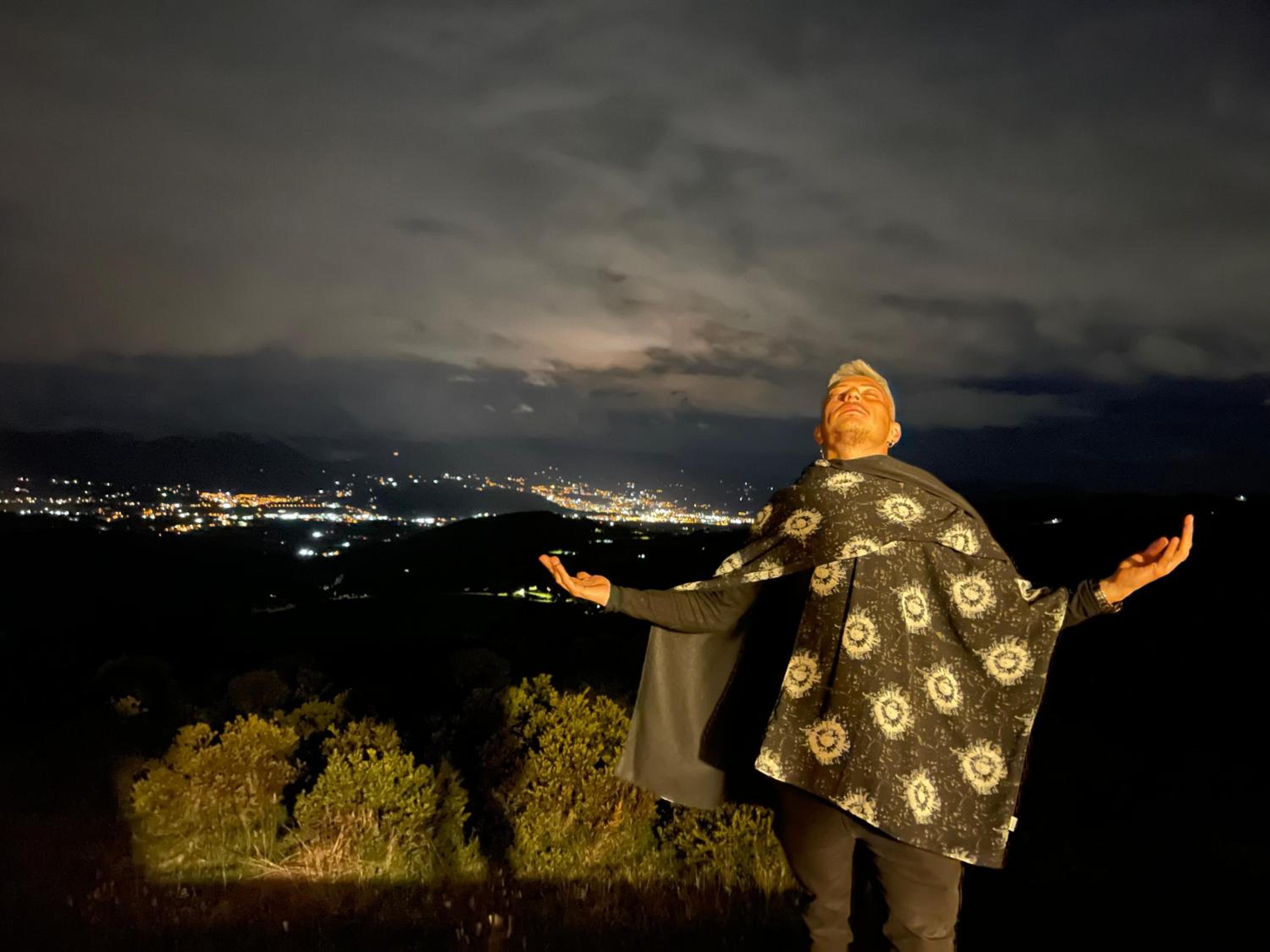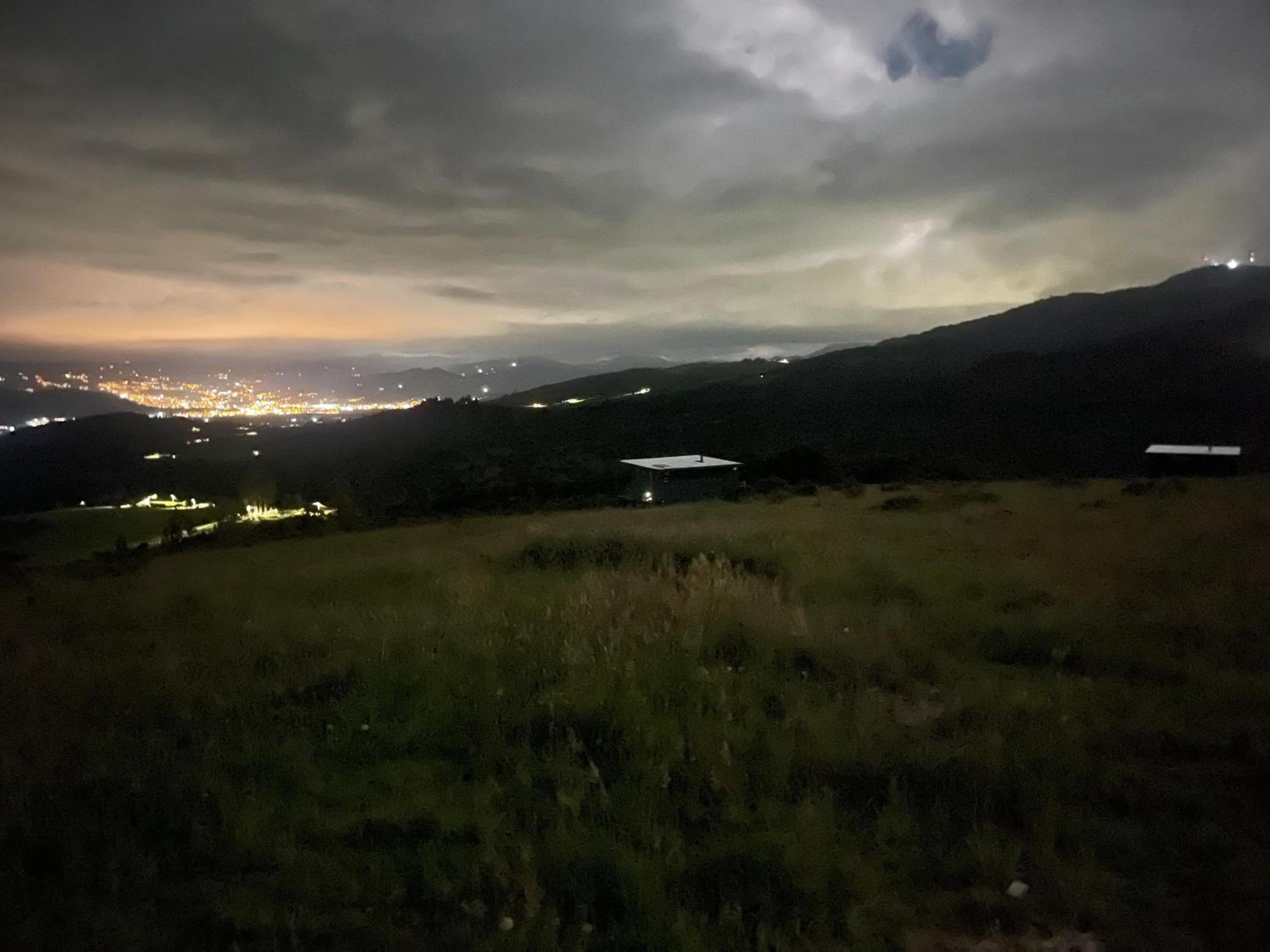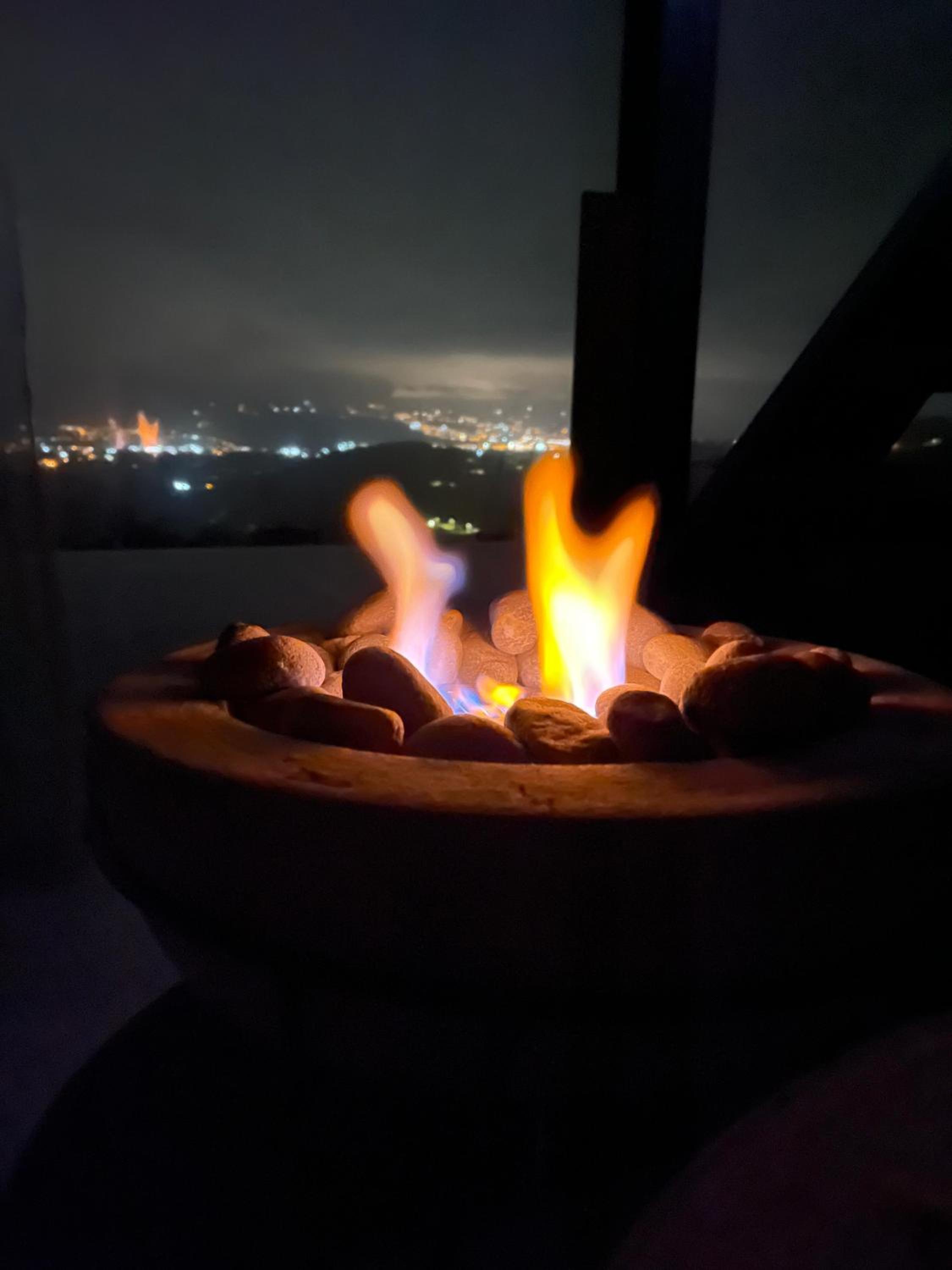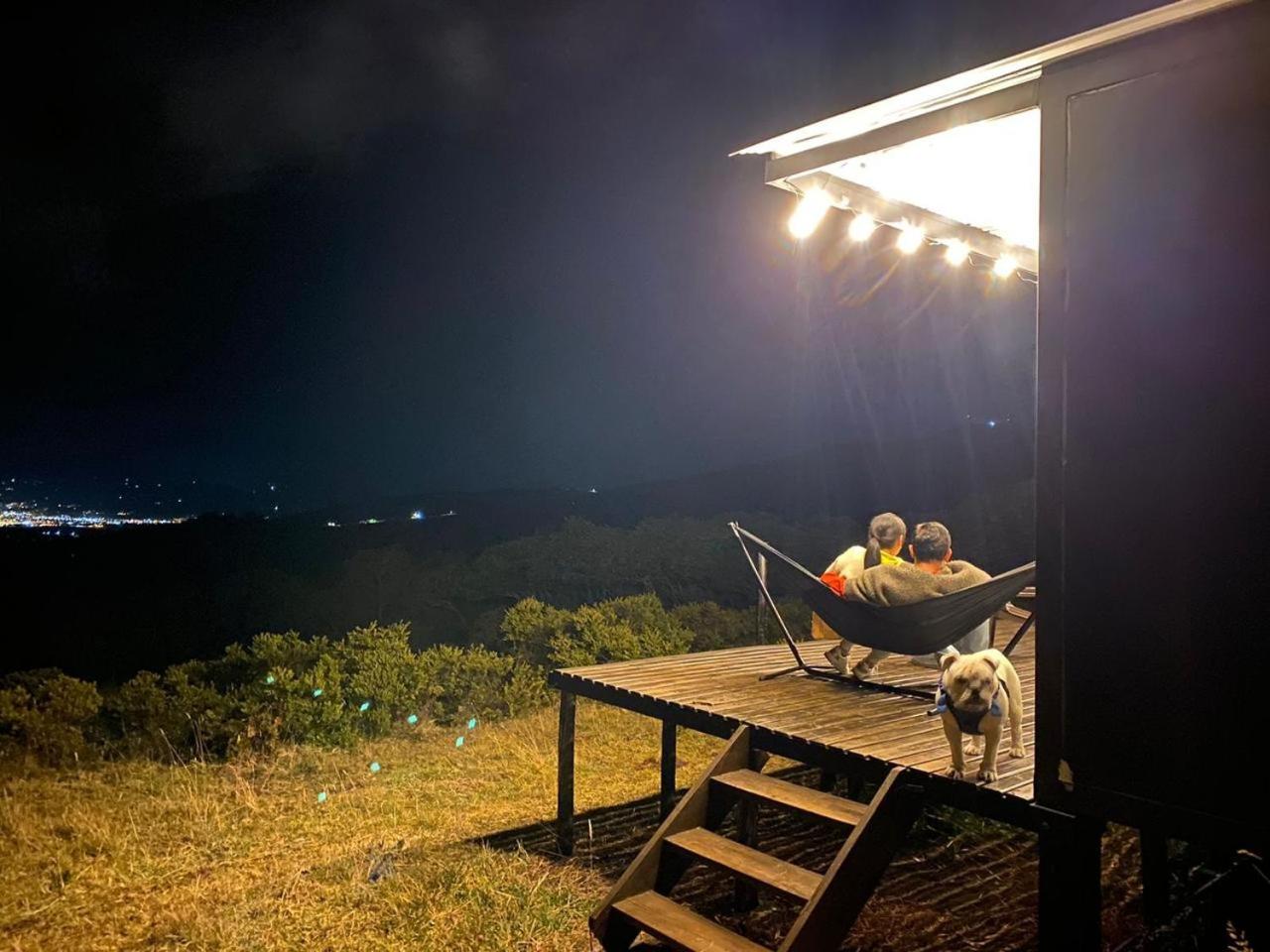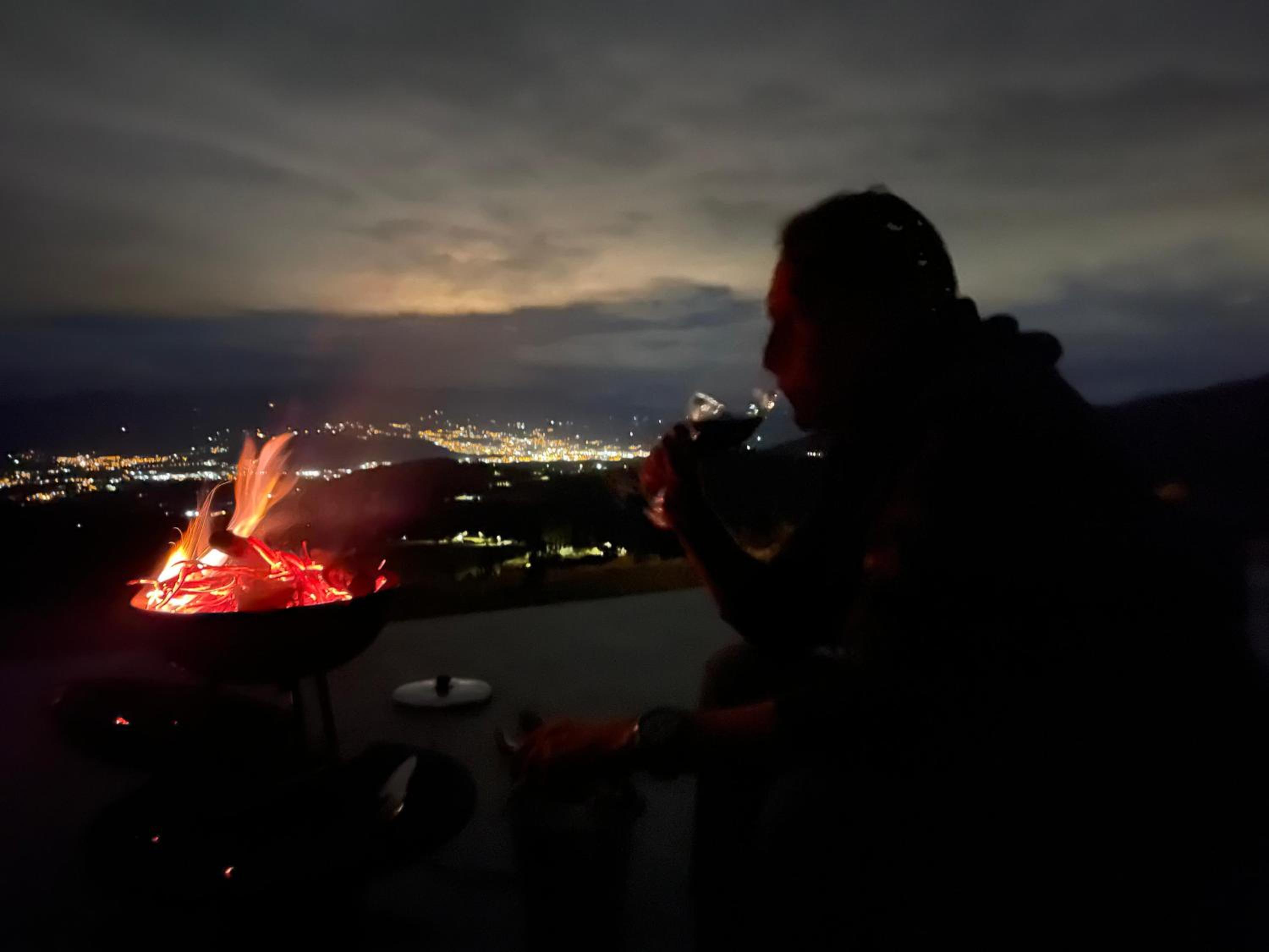 Enjoy breathtaking city views and relax in the serene garden setting of Glamping La Cordillera's terrace.