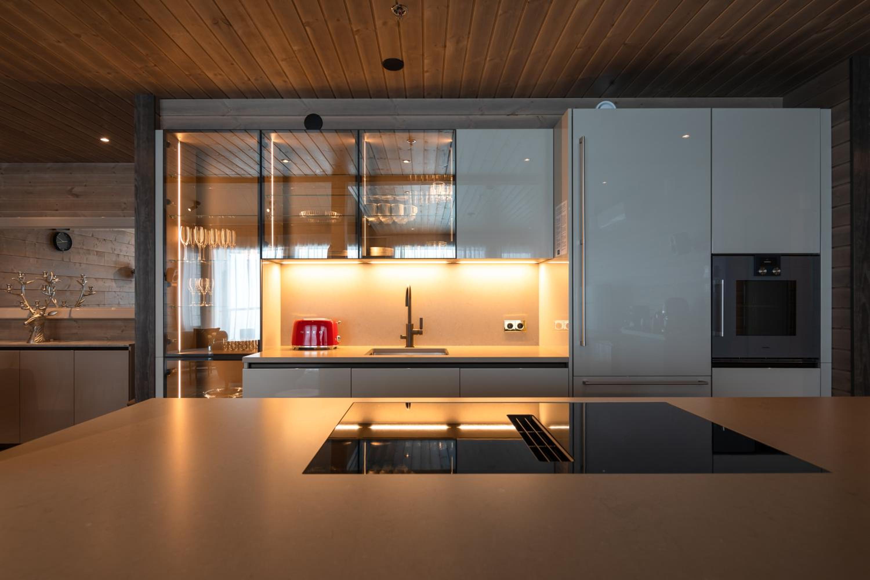 Kitchen ) within 2 min walking distance. Balcony looks out to the ski slope and we saw the northern lights from there. The top floor has 2 en-suite bed rooms but only one shower. So with 6 people on the first floor where all the bedrooms are you have one shower and two toilets but you have three showers downstairs where the sauna and hot tub is and one additional toilet. They had 4 sledges in the apartment which was great as well otherwise you have to rent them from the ski shop. Some board games as well which was great for the evenings.