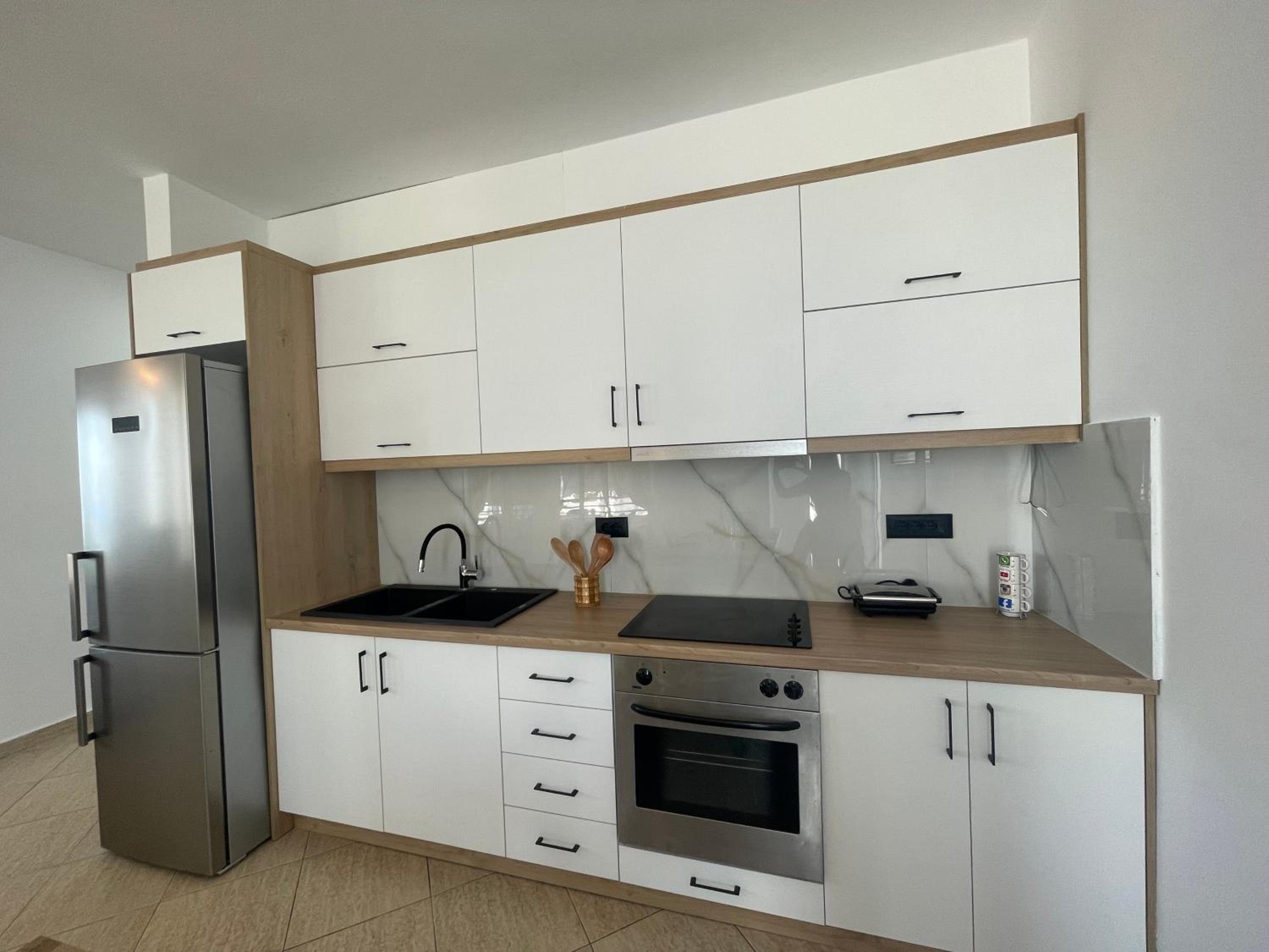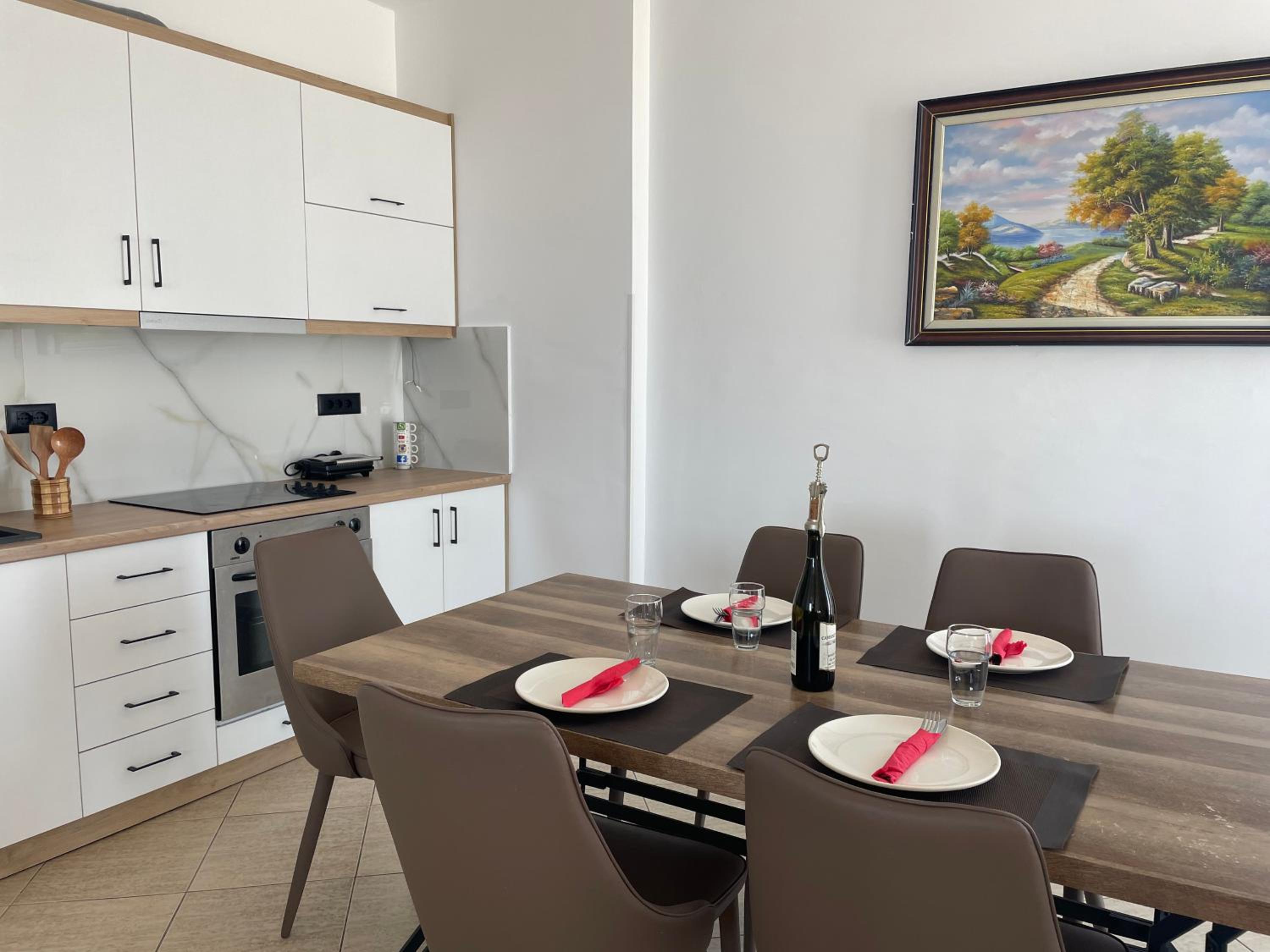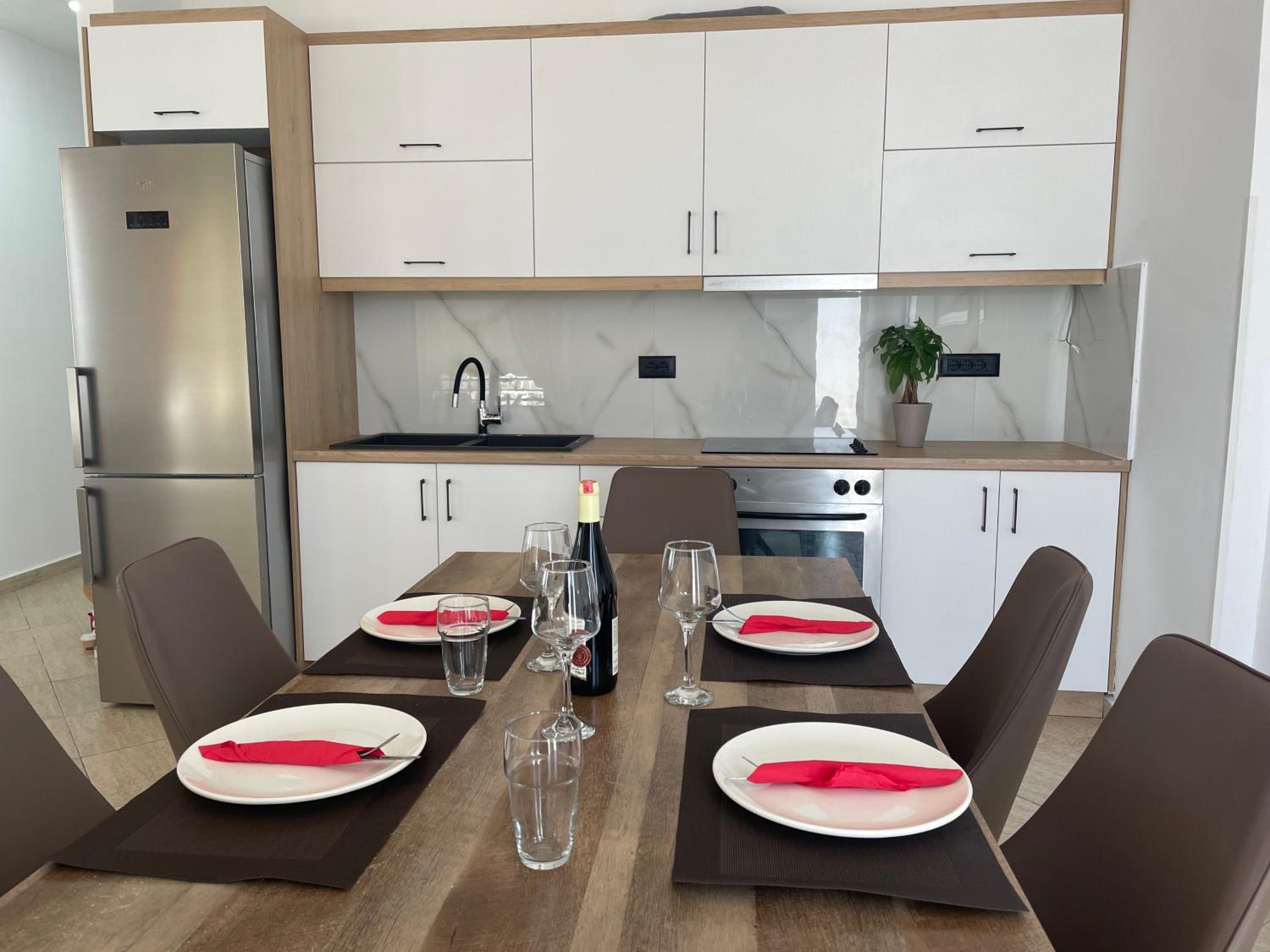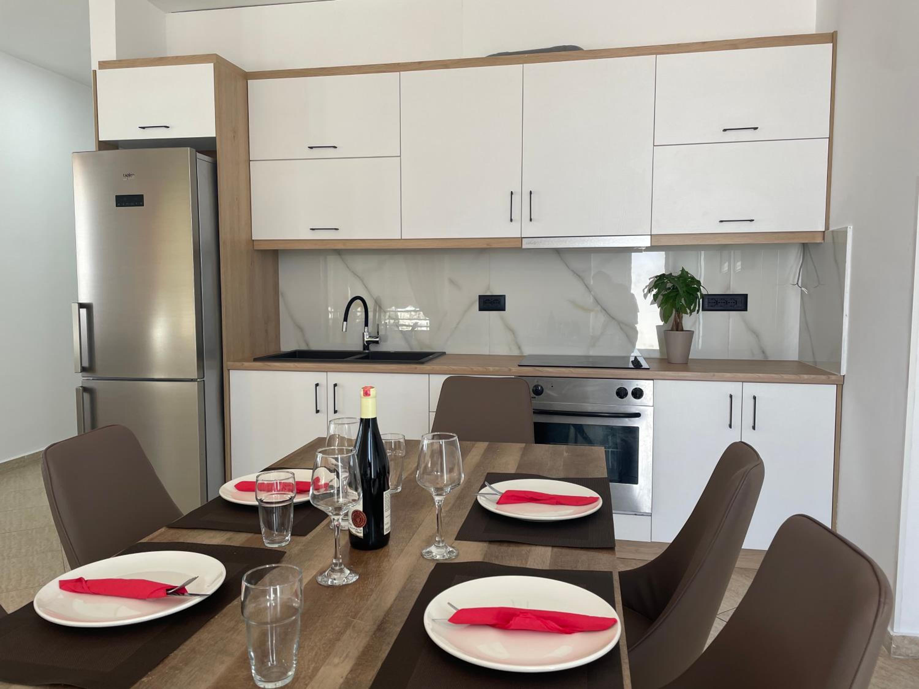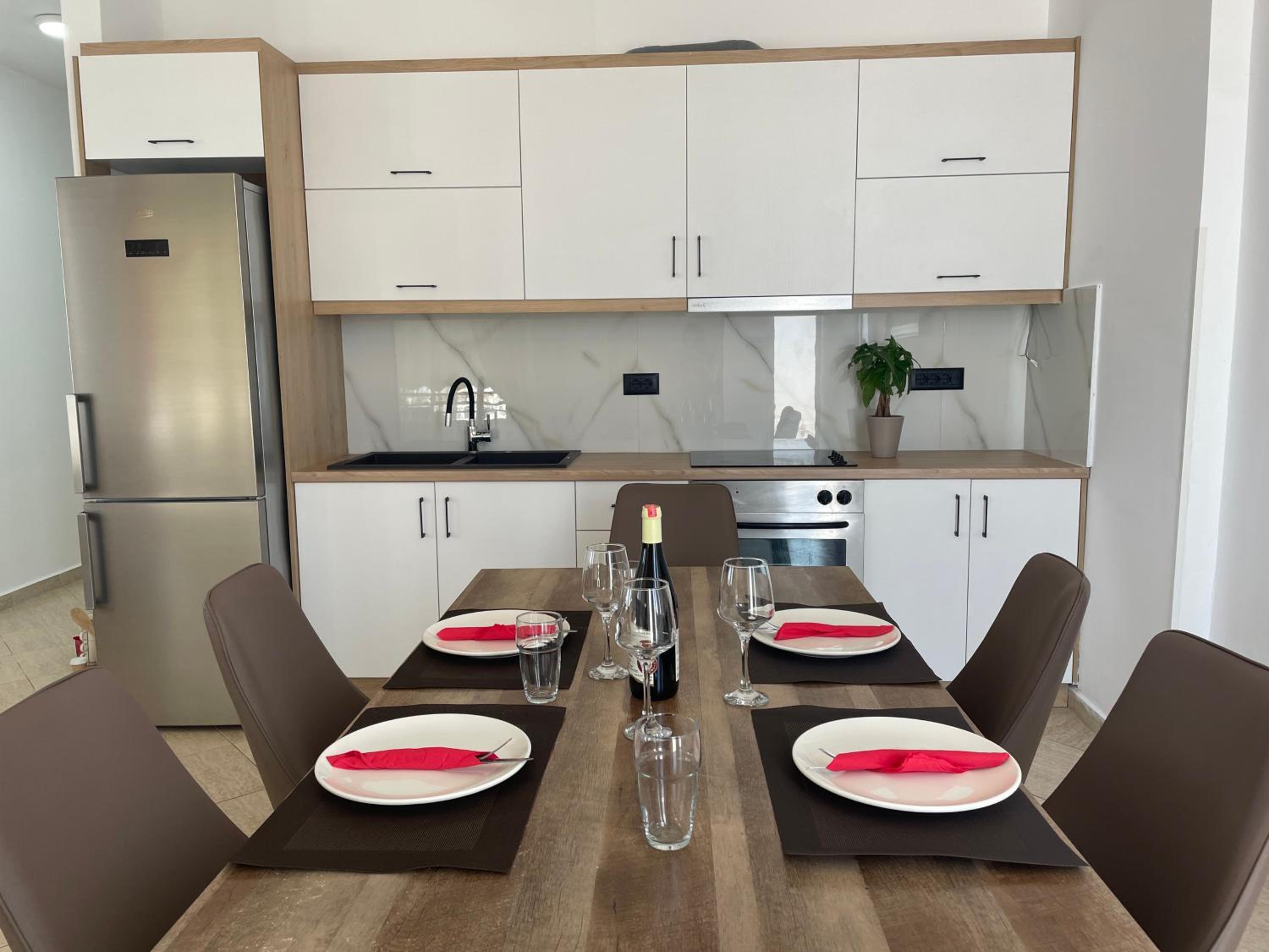 El departamento que alquilamos no tiene cocina, pero lo sabíamos de antemano. La ubicación no es l más céntrica de Sarandë. Estás a 13 minutos andando del centro.