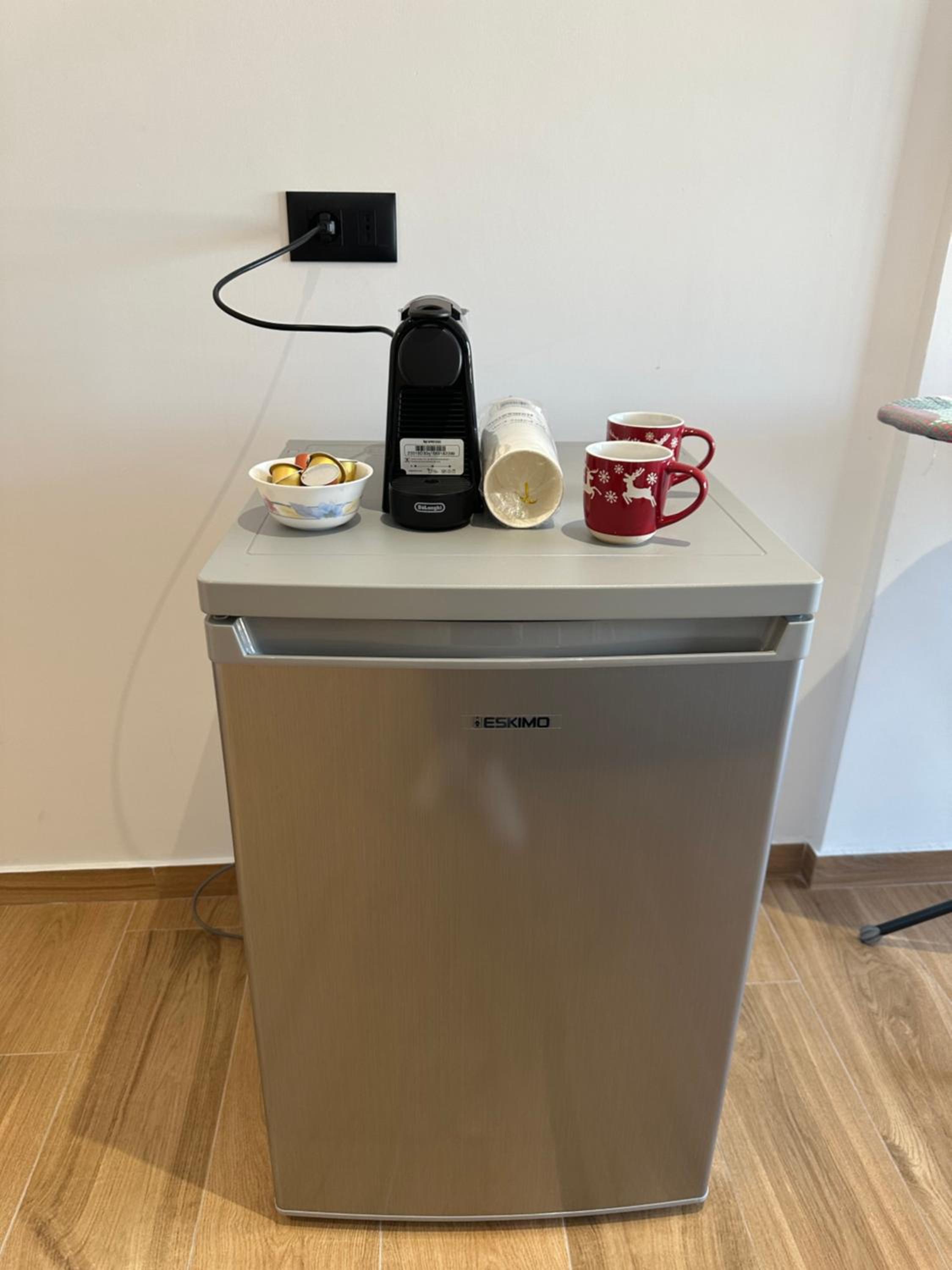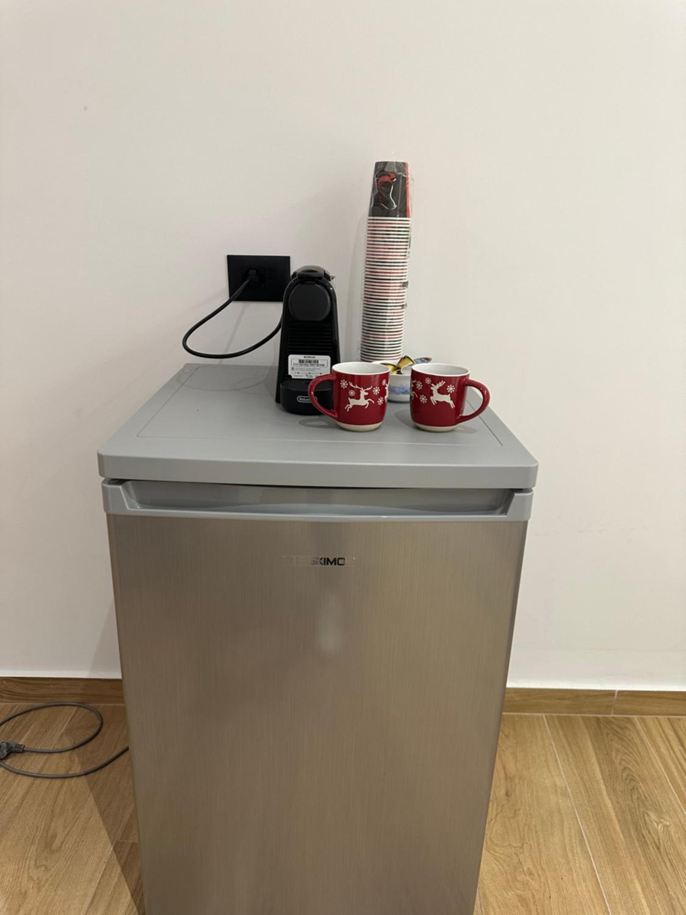 Good conditioner, clean room, new furniture, in room fridge, coffee machine, dryer, iron, as well has washing machine on floor to use