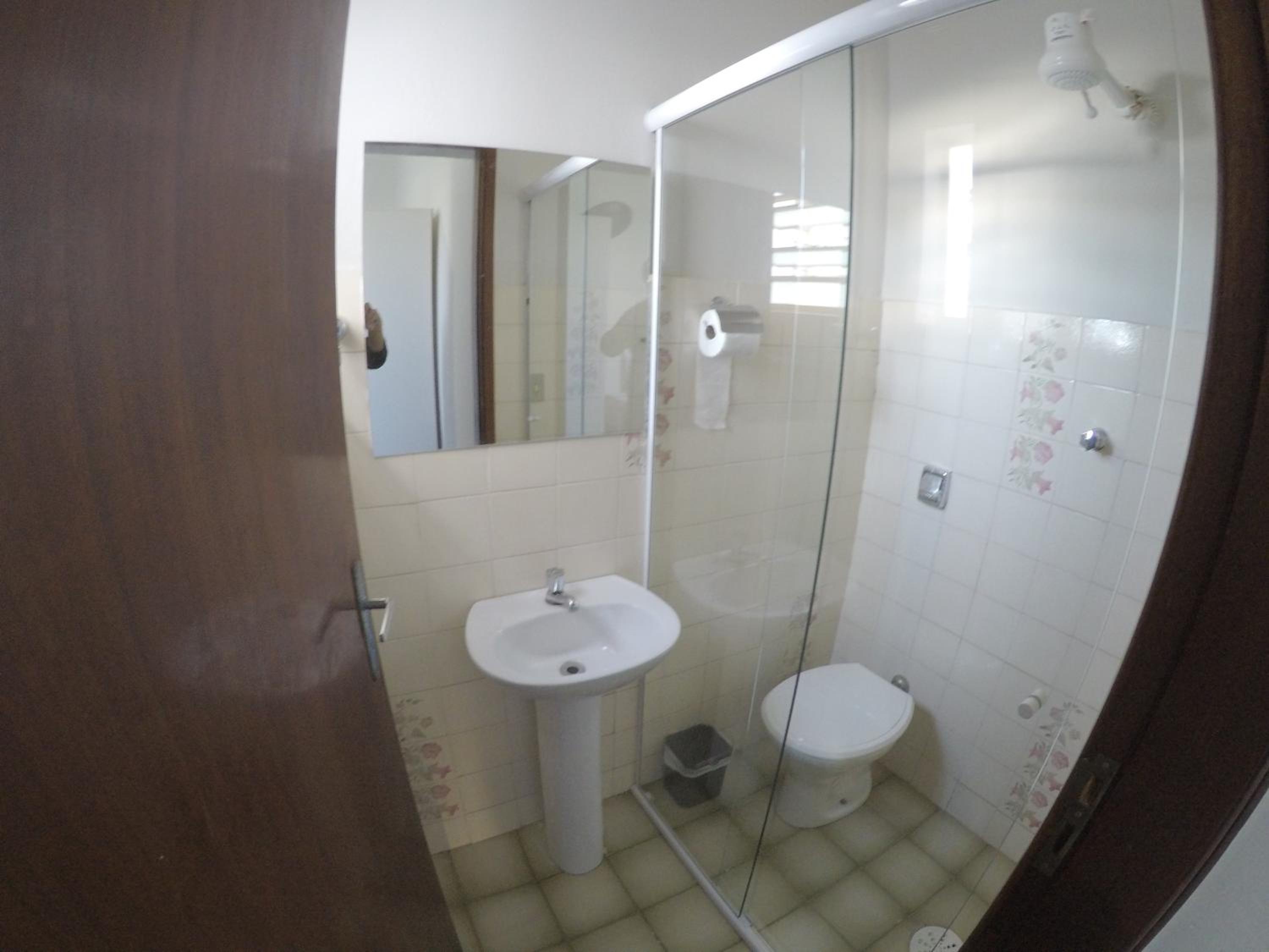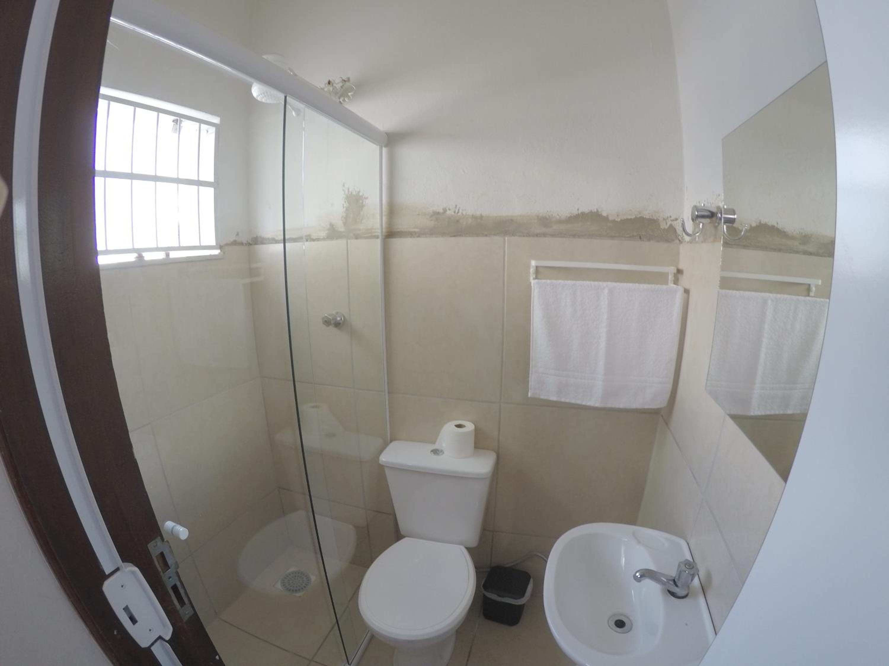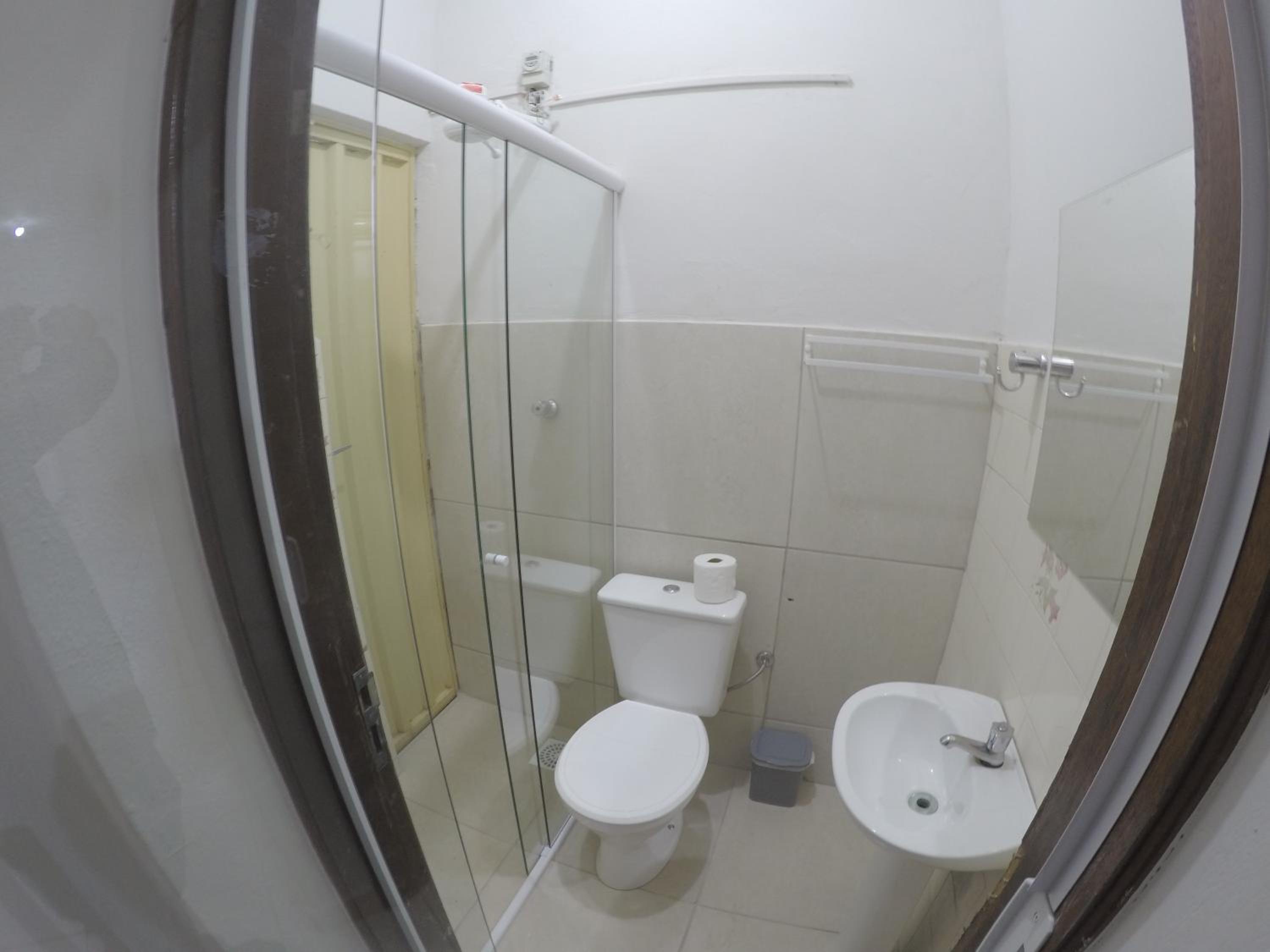 O banheiro é muito apertado e com o vaso sanitário dentro do box. Ao tomar banho molha todo o vaso.