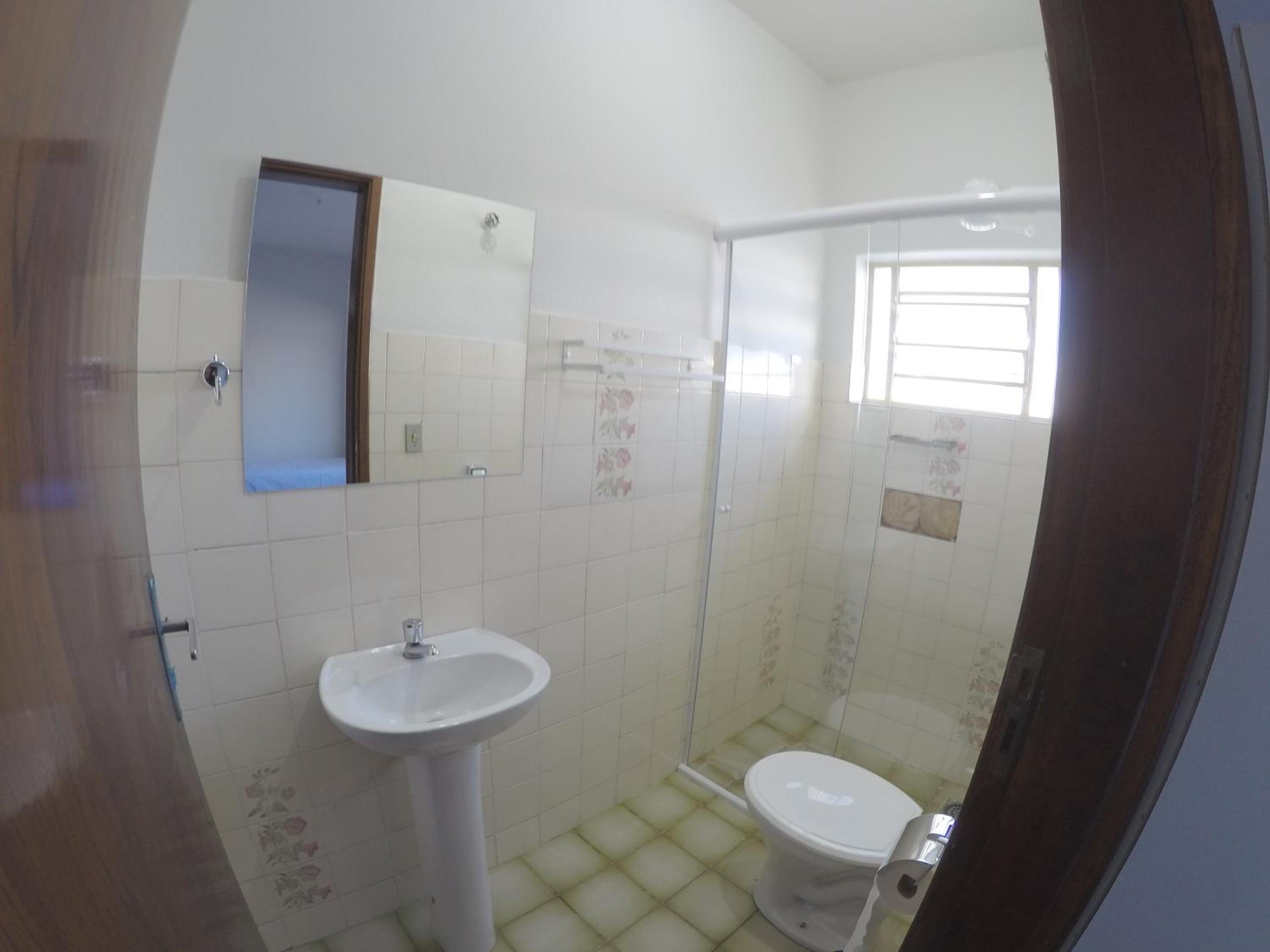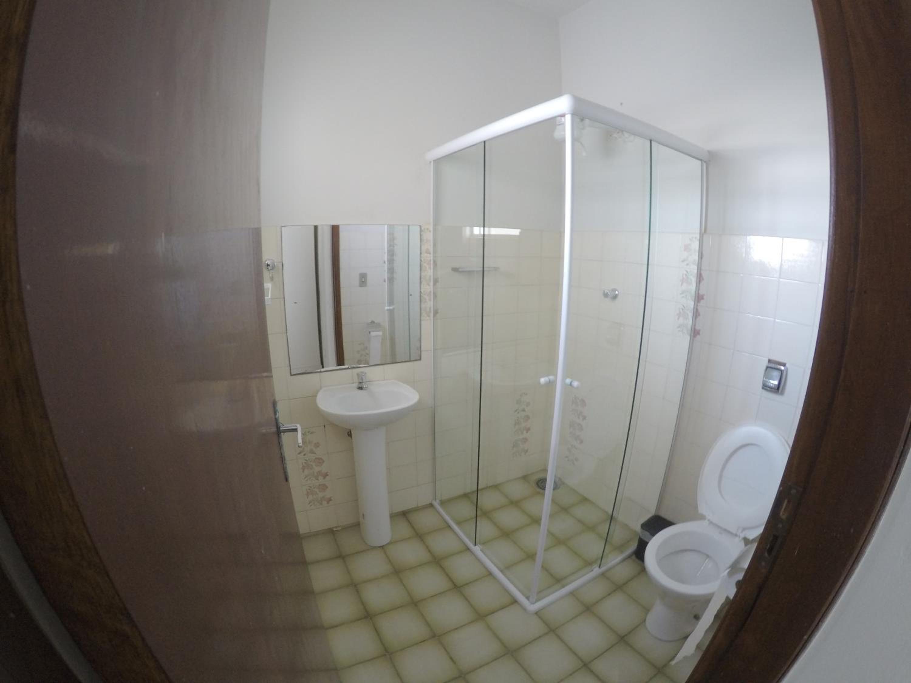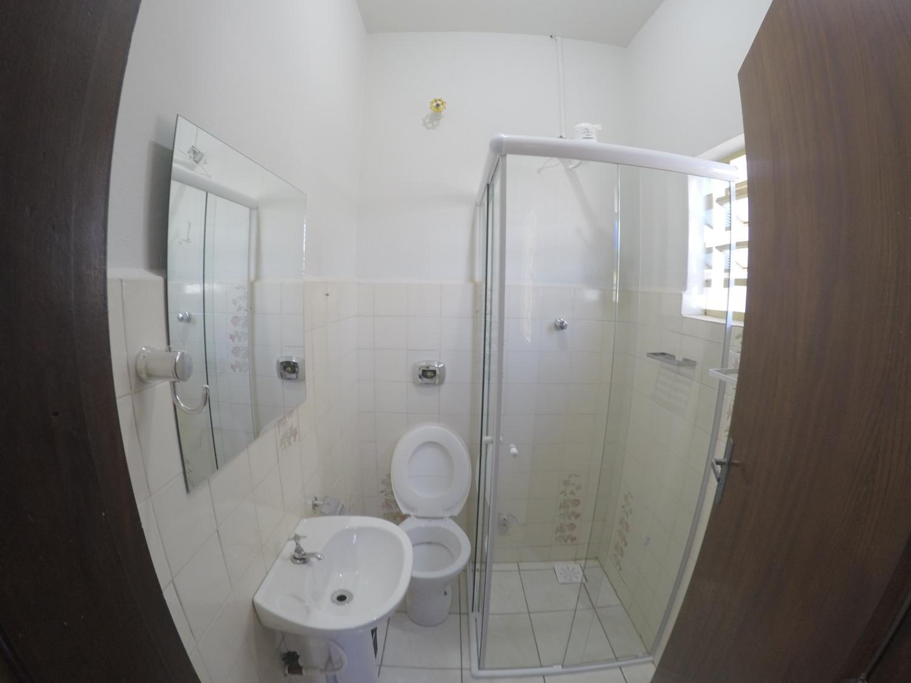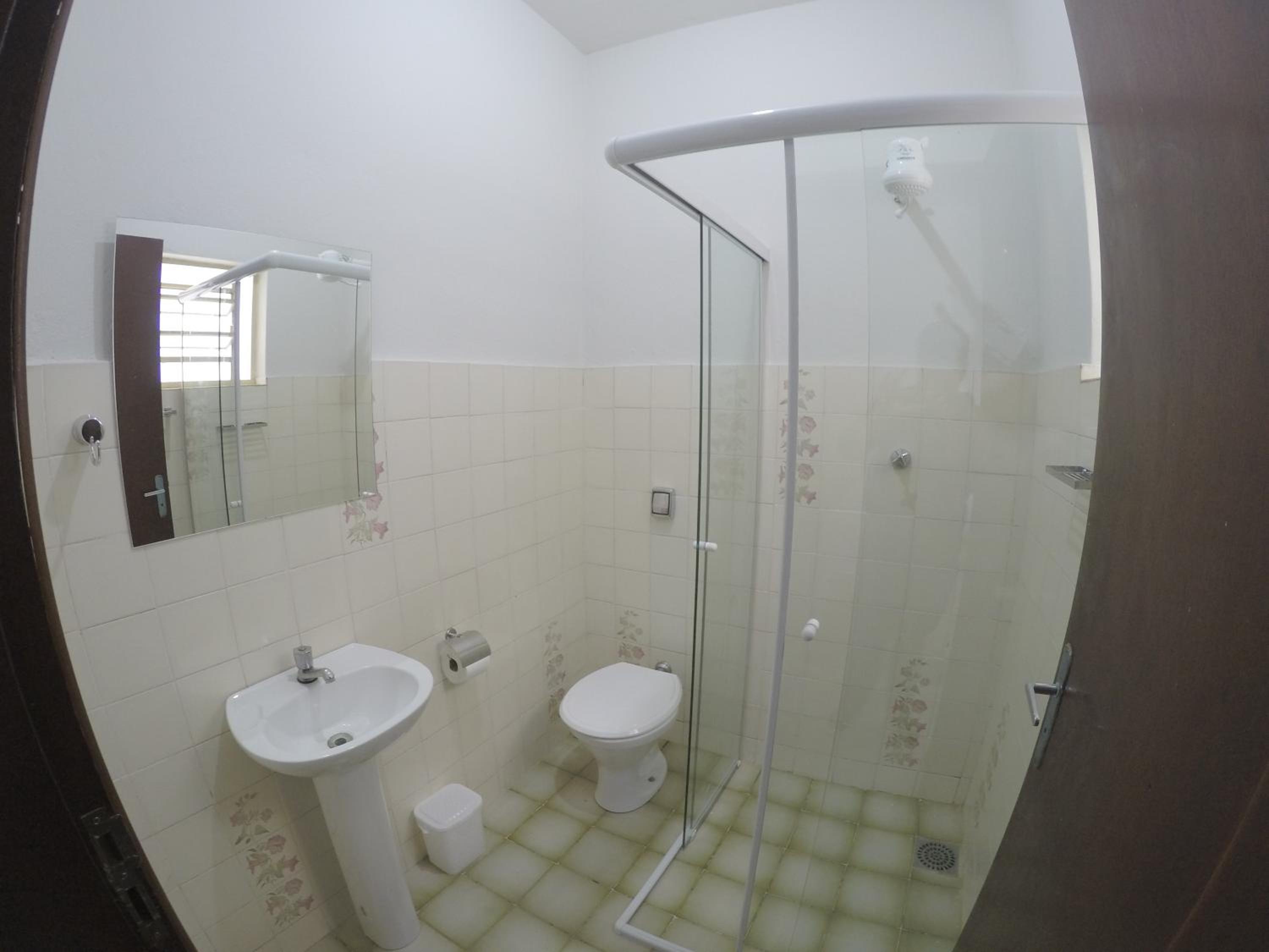 O banheiro é muito apertado e com o vaso sanitário dentro do box. Ao tomar banho molha todo o vaso.