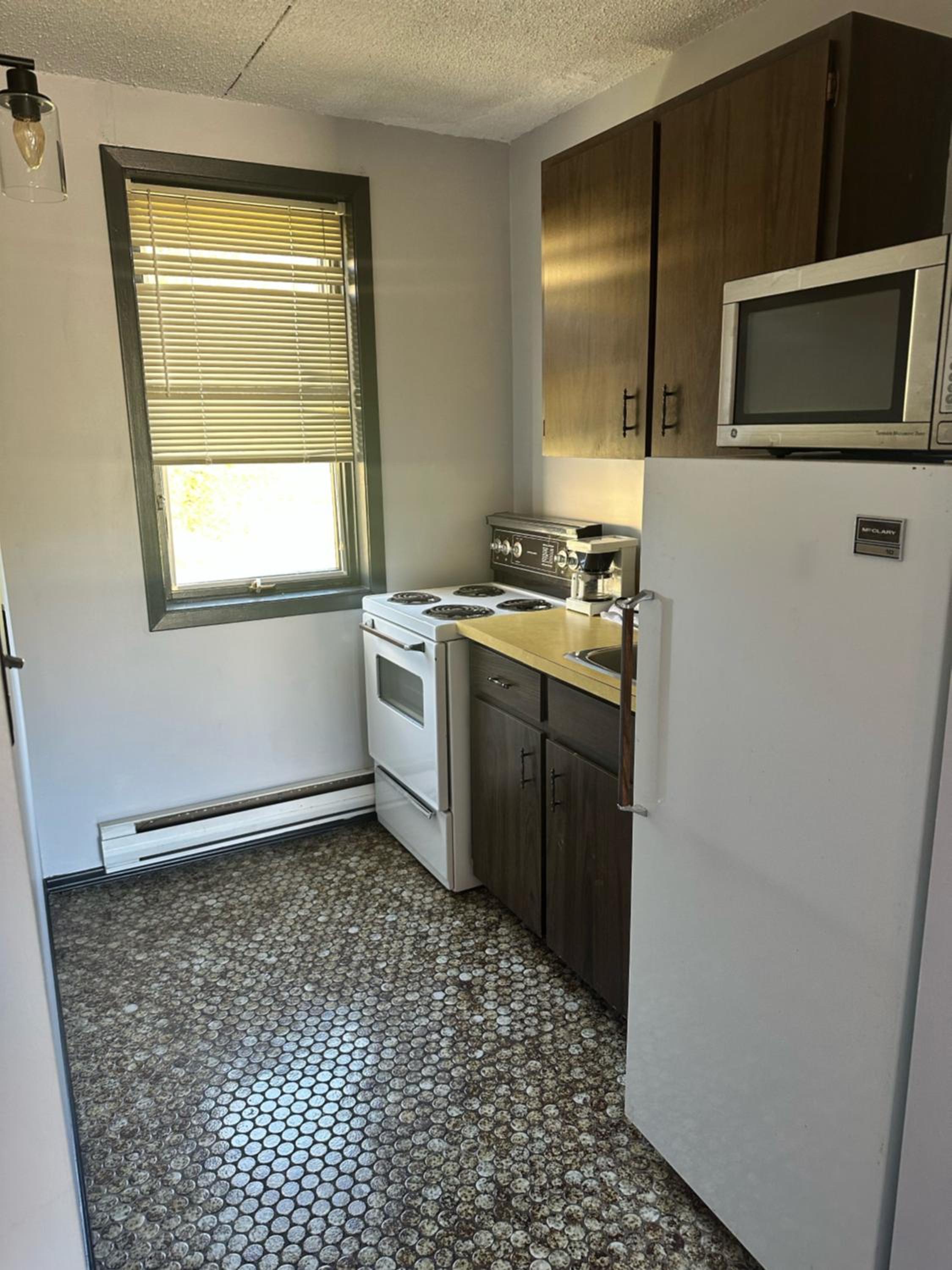 Faded interior. Dirty fridge. Floor covered with bits of leaves needed a vacuum. Filthy towel found under the sink. Small room crowded with old furniture. Needs an overhaul.