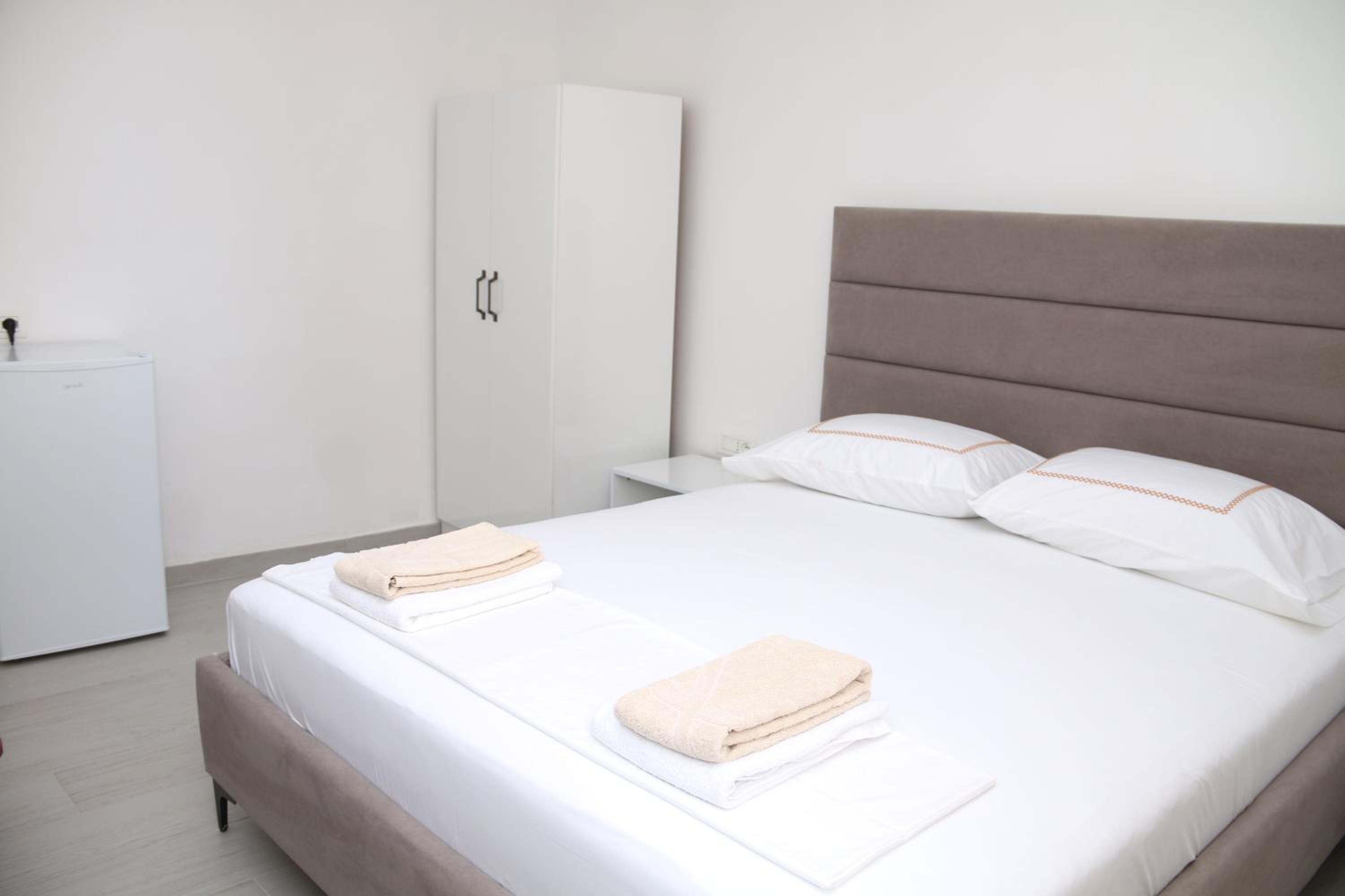 Big double bed. Comfortable mattress. 2 pillows and blankets. Cupboard and mini fridge. But no hot plate, electric kettle or microwave oven. Clean bathroom with good hot water and strong pressure.