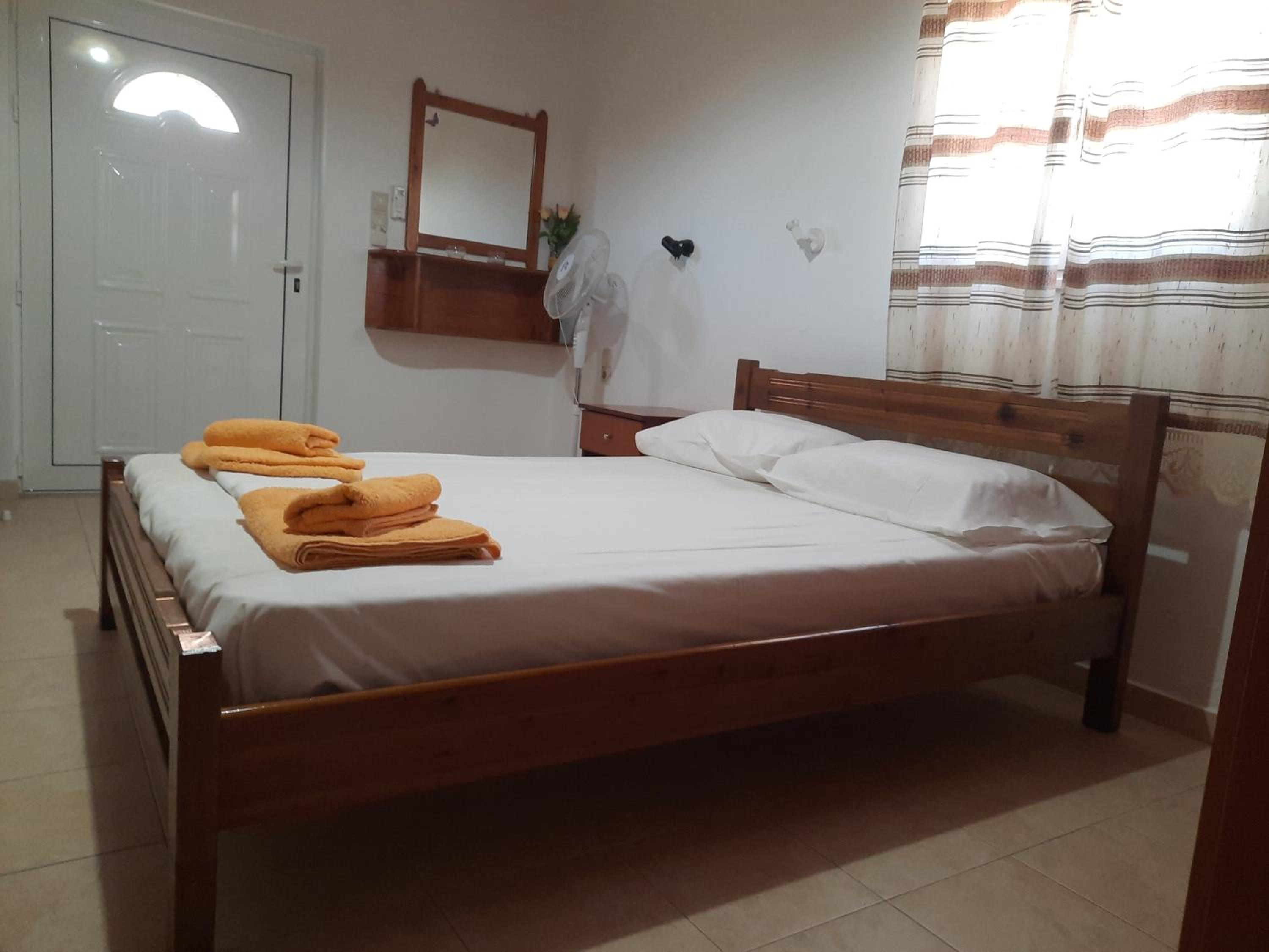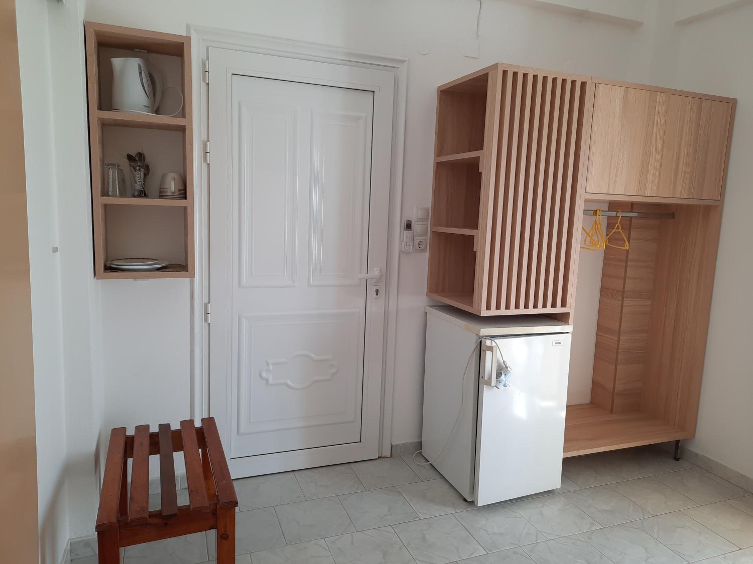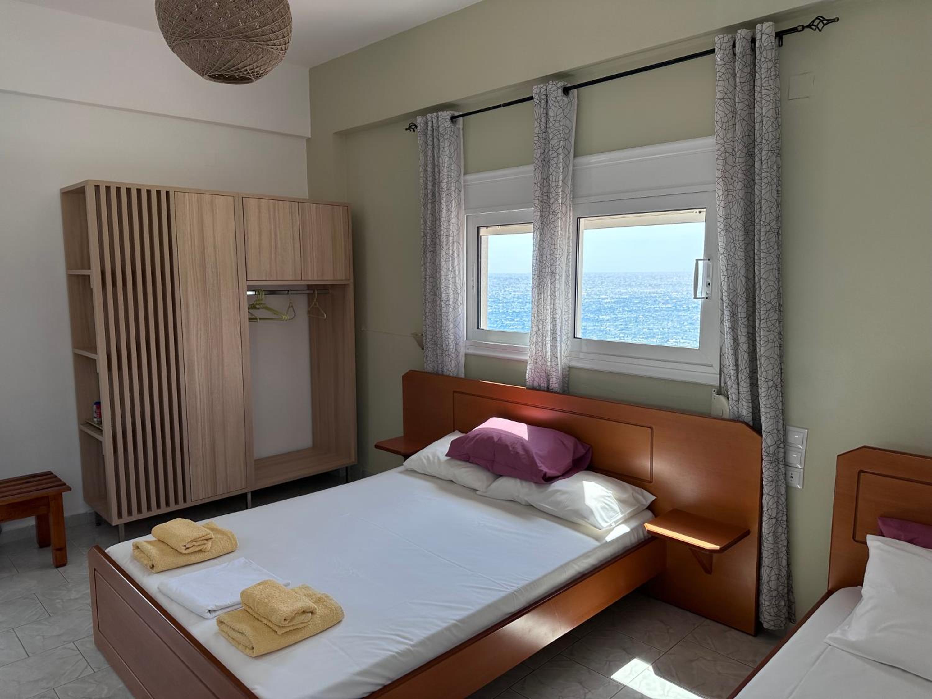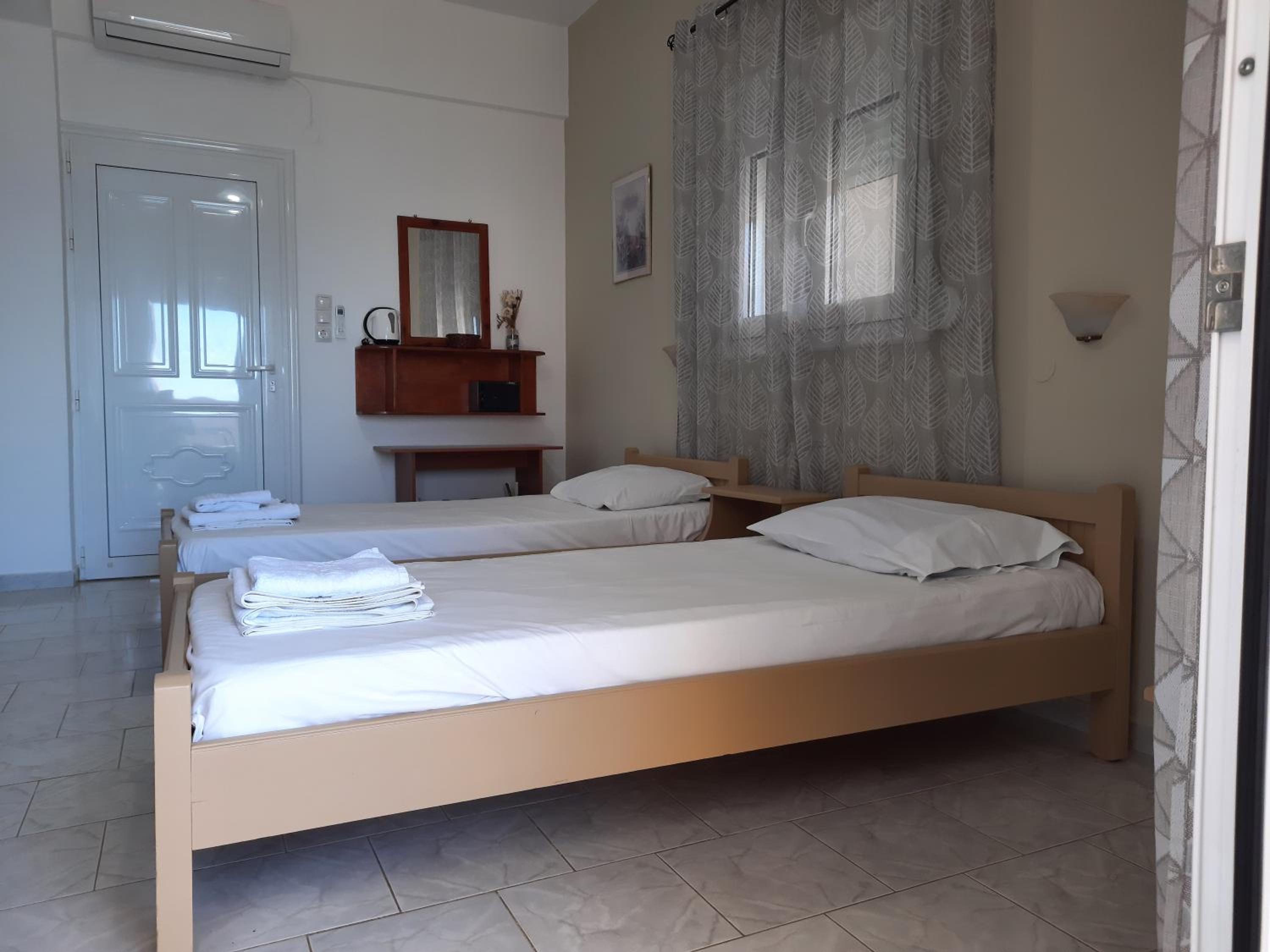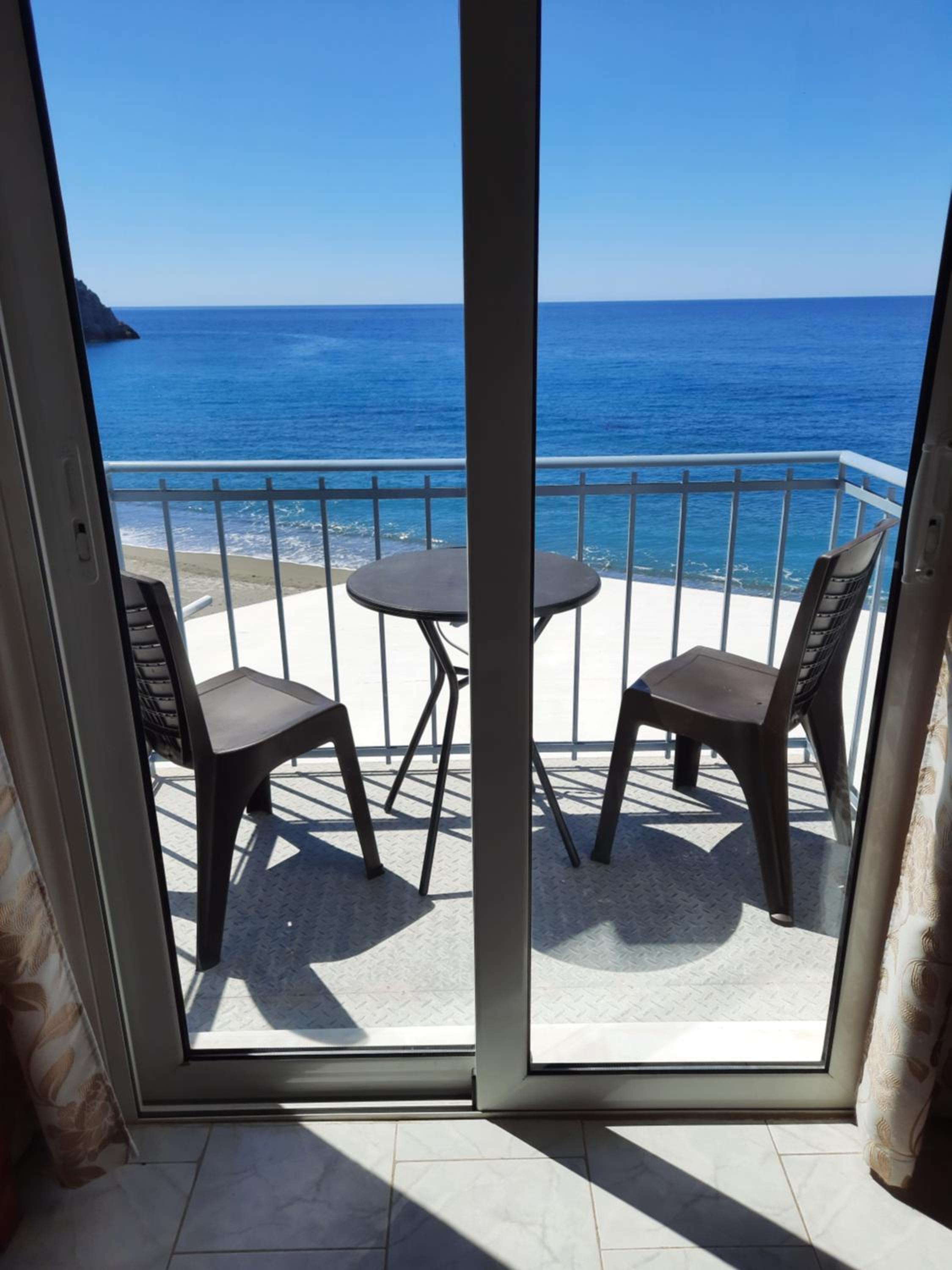 Very nice clean triple room with a small balcony oriented towards the sea. Directly on the beach, beautuliful location. A/C functional. Fridge, electric kettle, few plates, cups, glasses, cutlery, hair dryer. Below the room is also a restaurant with local food, good quality for a good price. We enjoyed it with our family. The owners are very kind, helpful and take care about the facility.