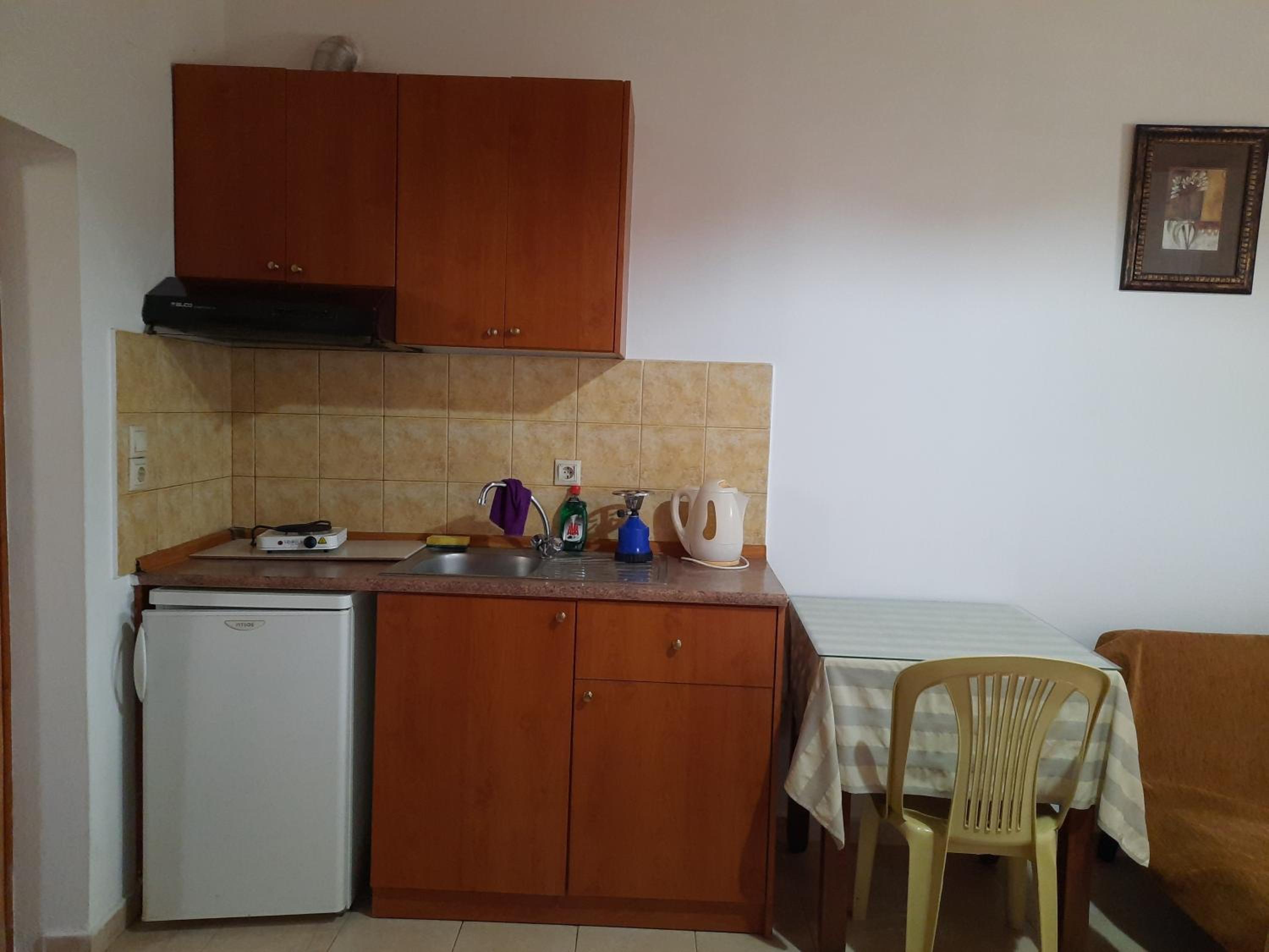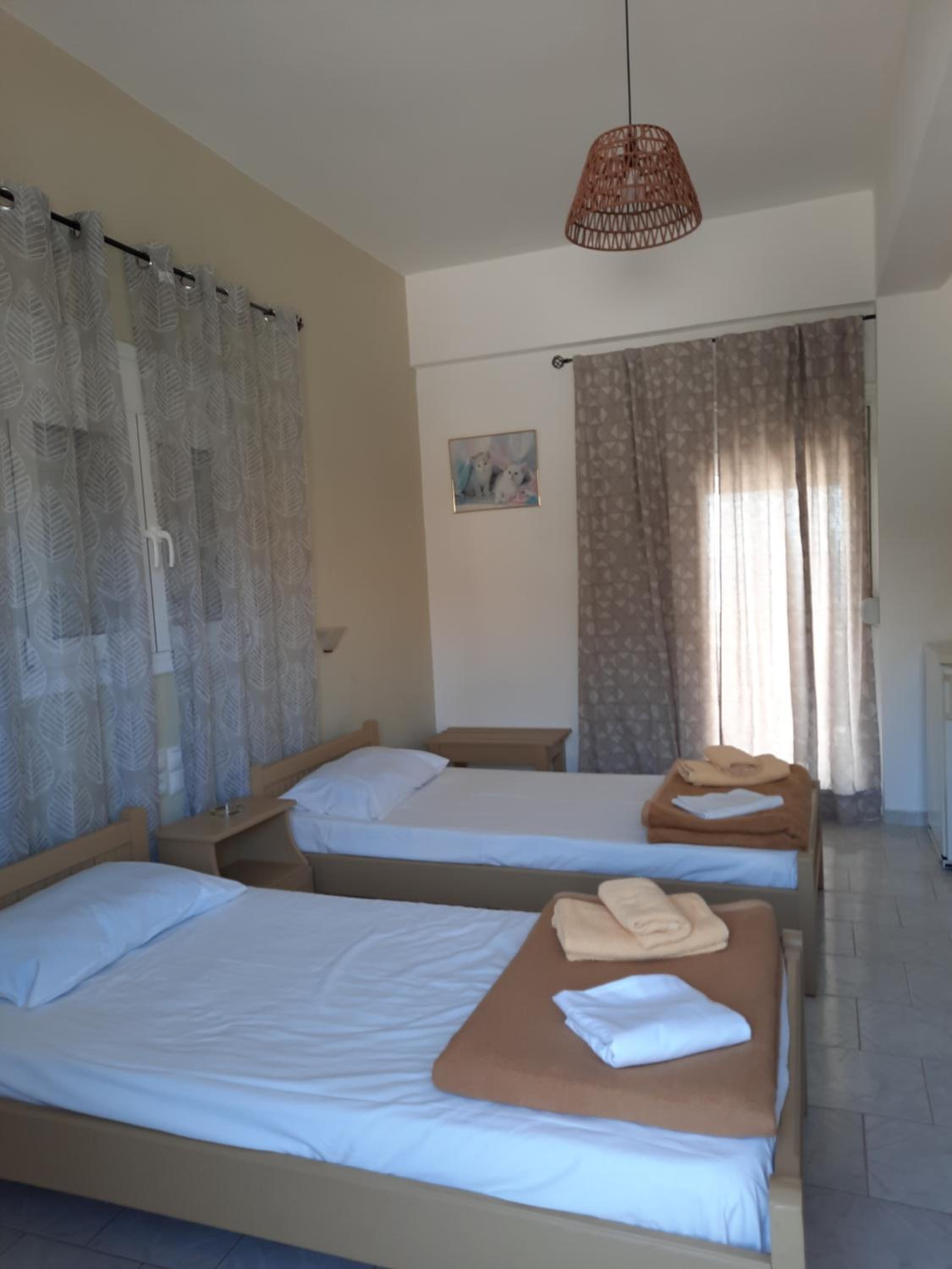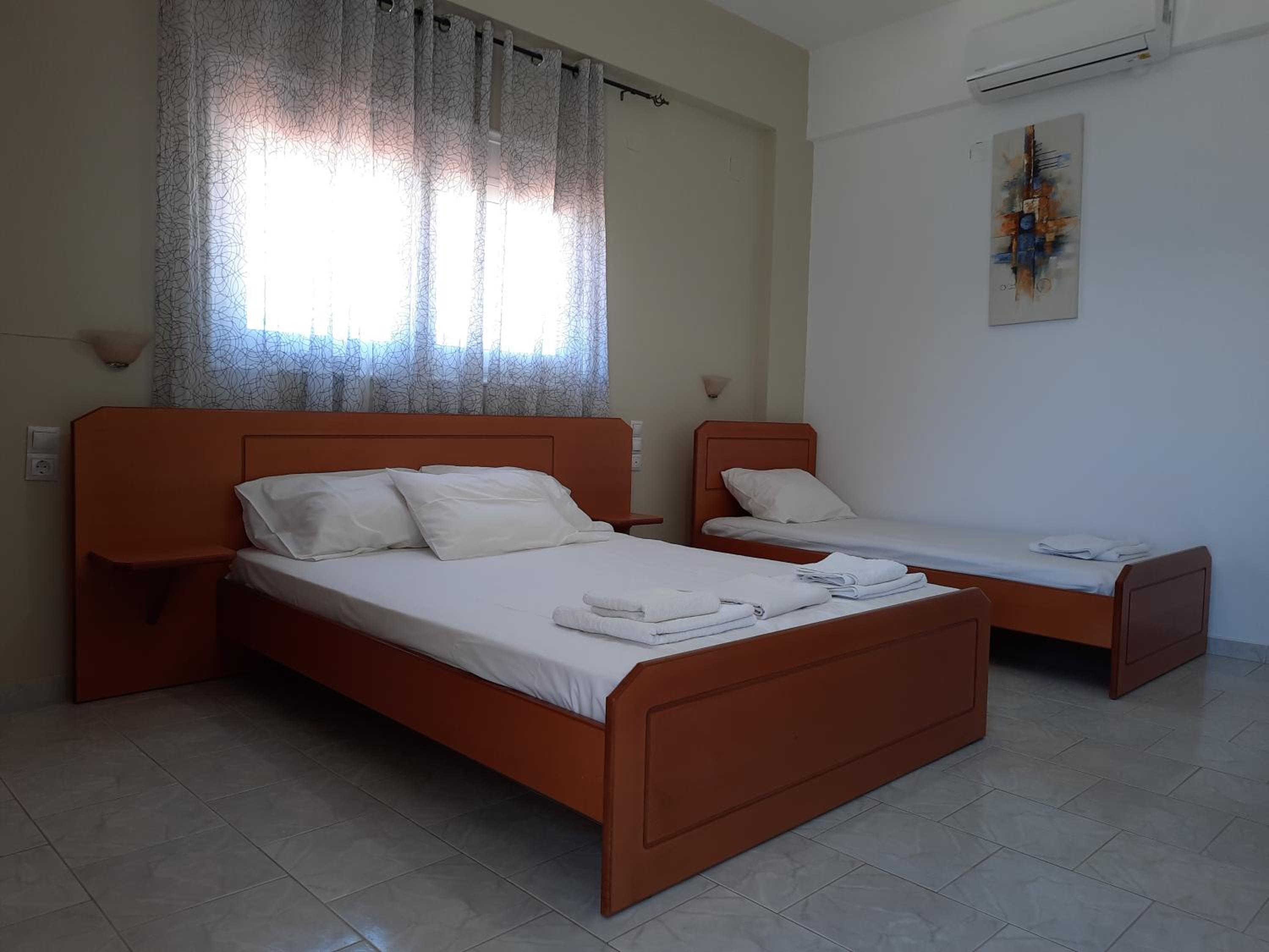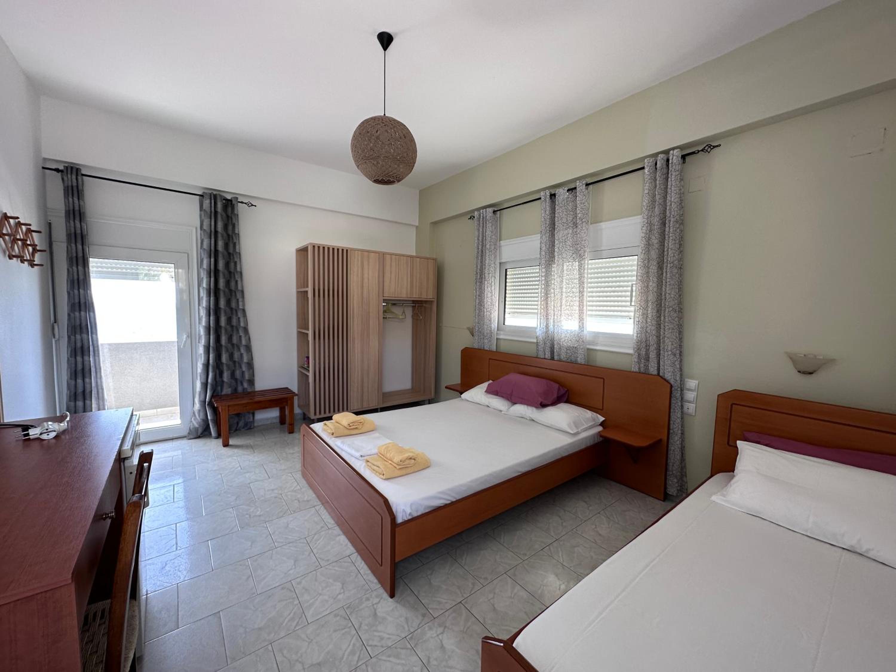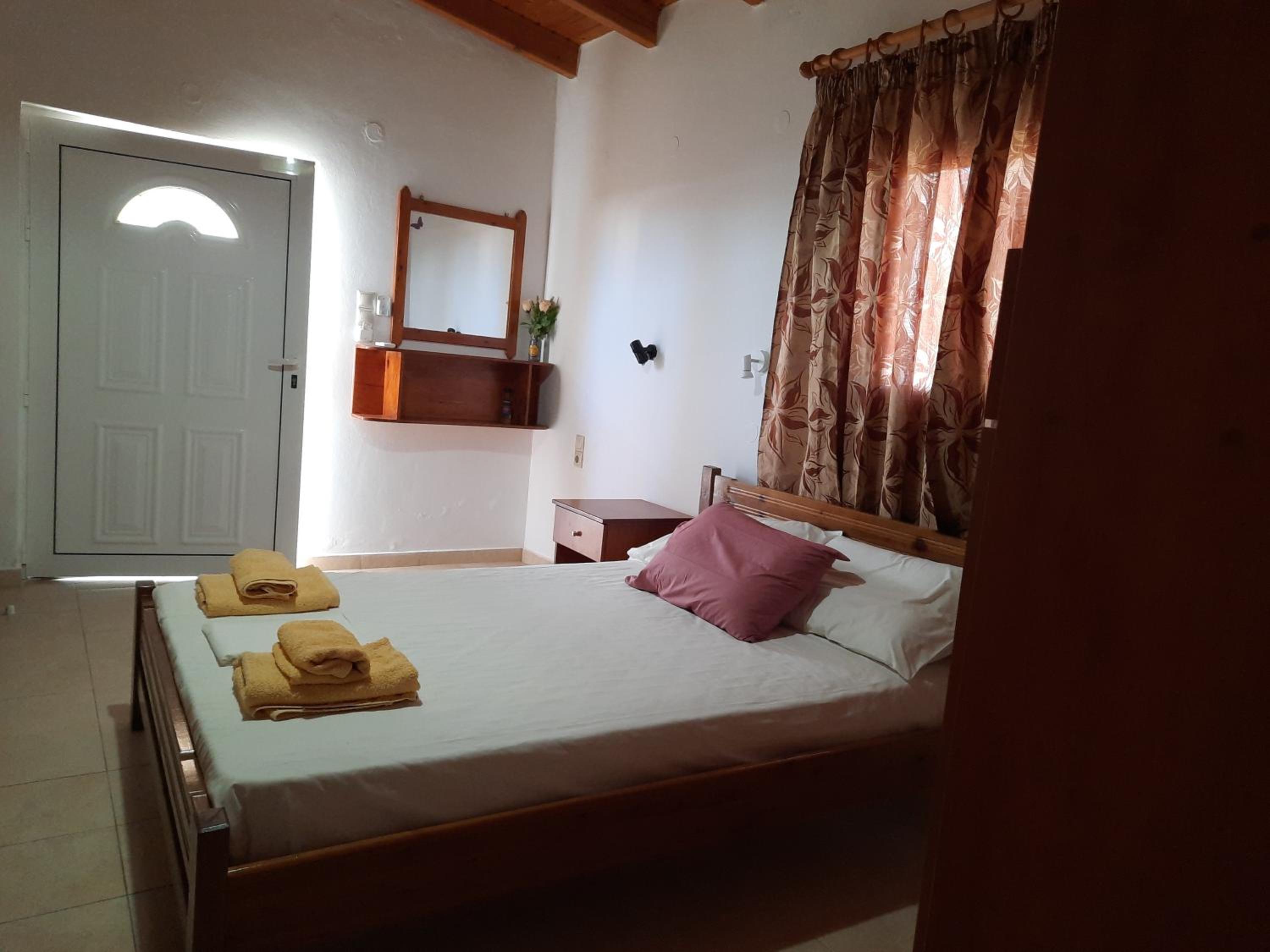 Very nice clean triple room with a small balcony oriented towards the sea. Directly on the beach, beautuliful location. A/C functional. Fridge, electric kettle, few plates, cups, glasses, cutlery, hair dryer. Below the room is also a restaurant with local food, good quality for a good price. We enjoyed it with our family. The owners are very kind, helpful and take care about the facility.