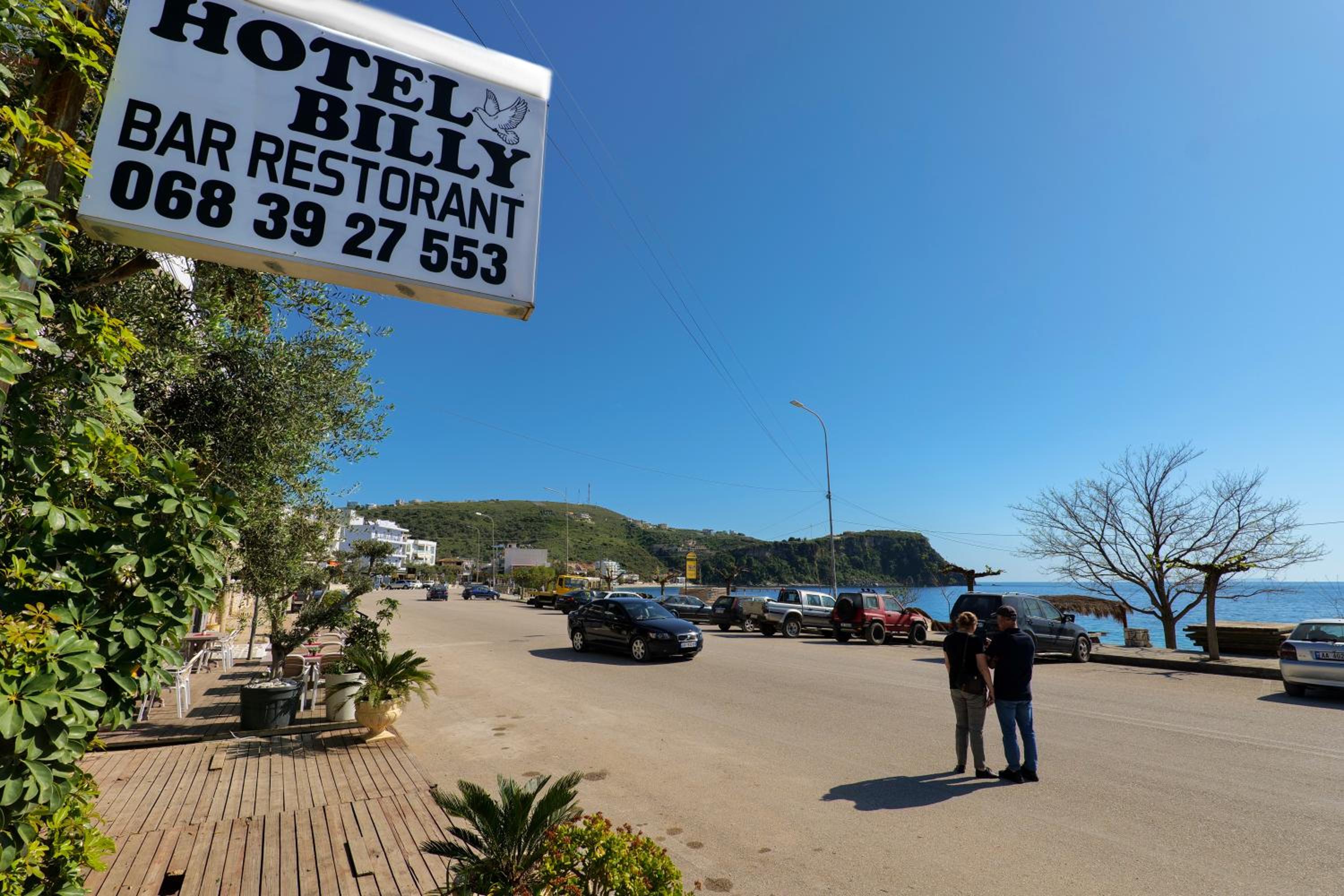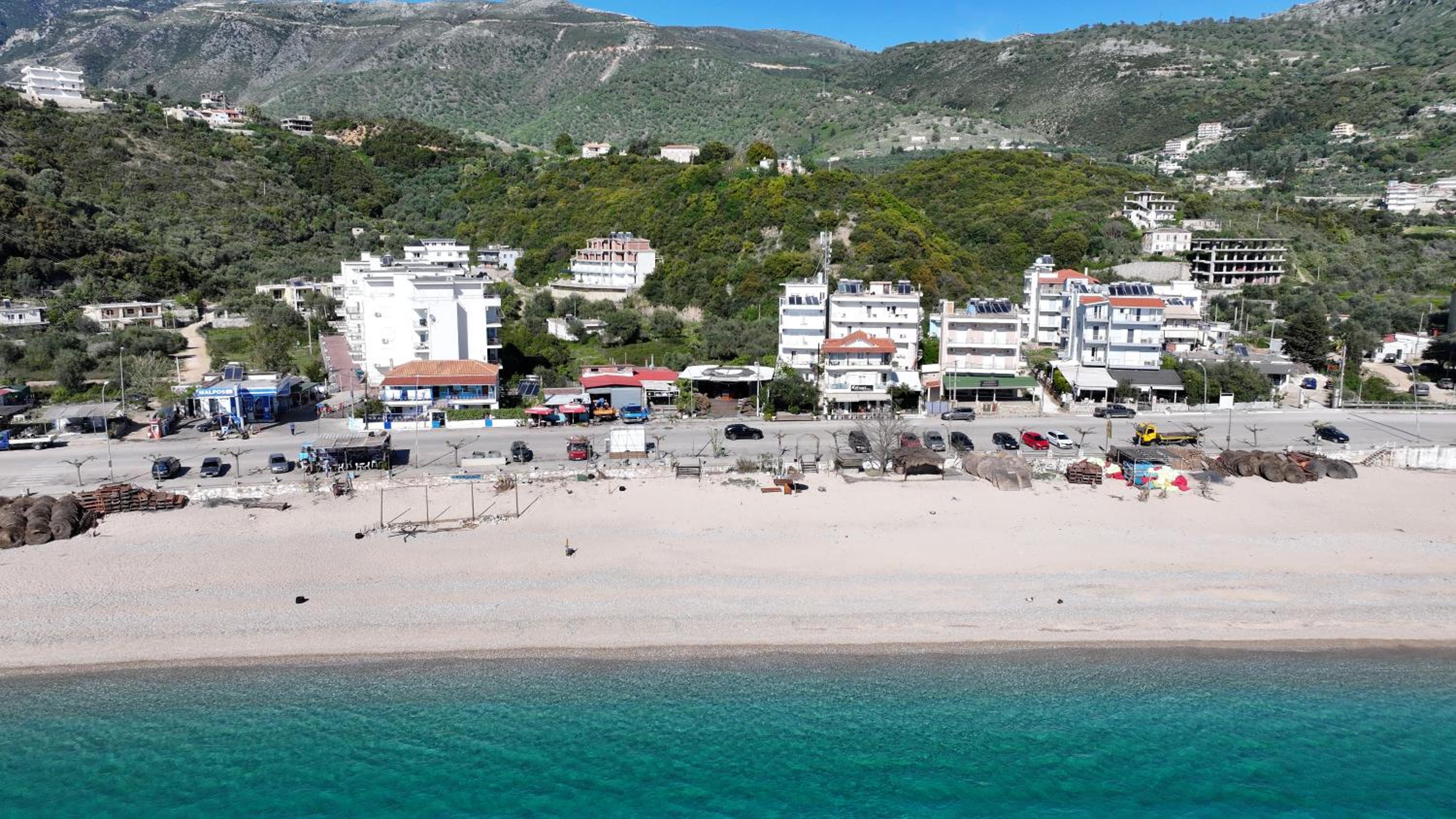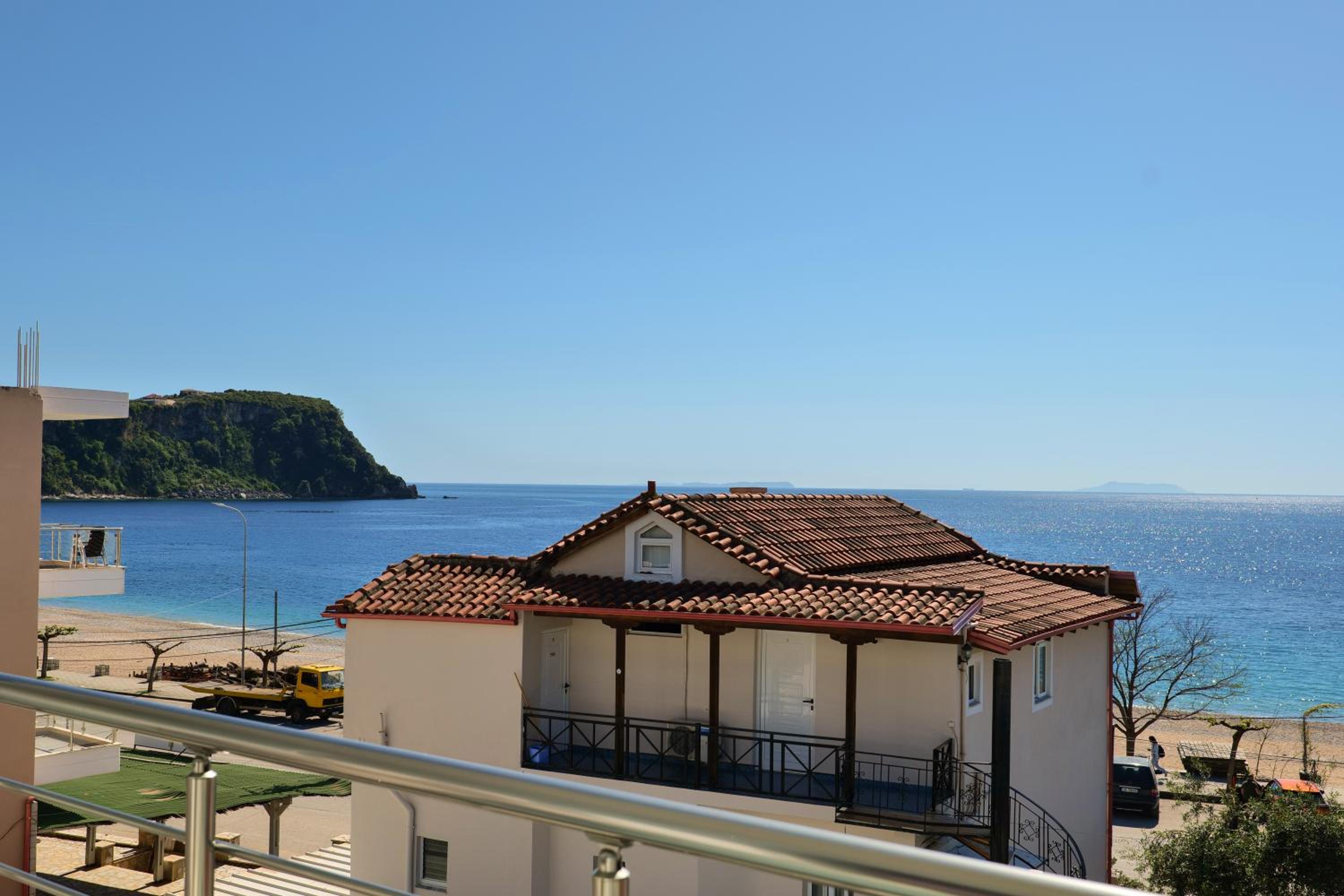 l’emplacement est bien car du côté d’himaré où la musique n’est pas à fond le soir, on a juste à traverser pour aller sur la plage ou l’on dispose de transat, il y a également une place de parking, la dame voulait que nous nous garions en partie sur la route! Nous avons refusé nous tenions à notre caution de location, avons eu la chance de trouver une place en face.
