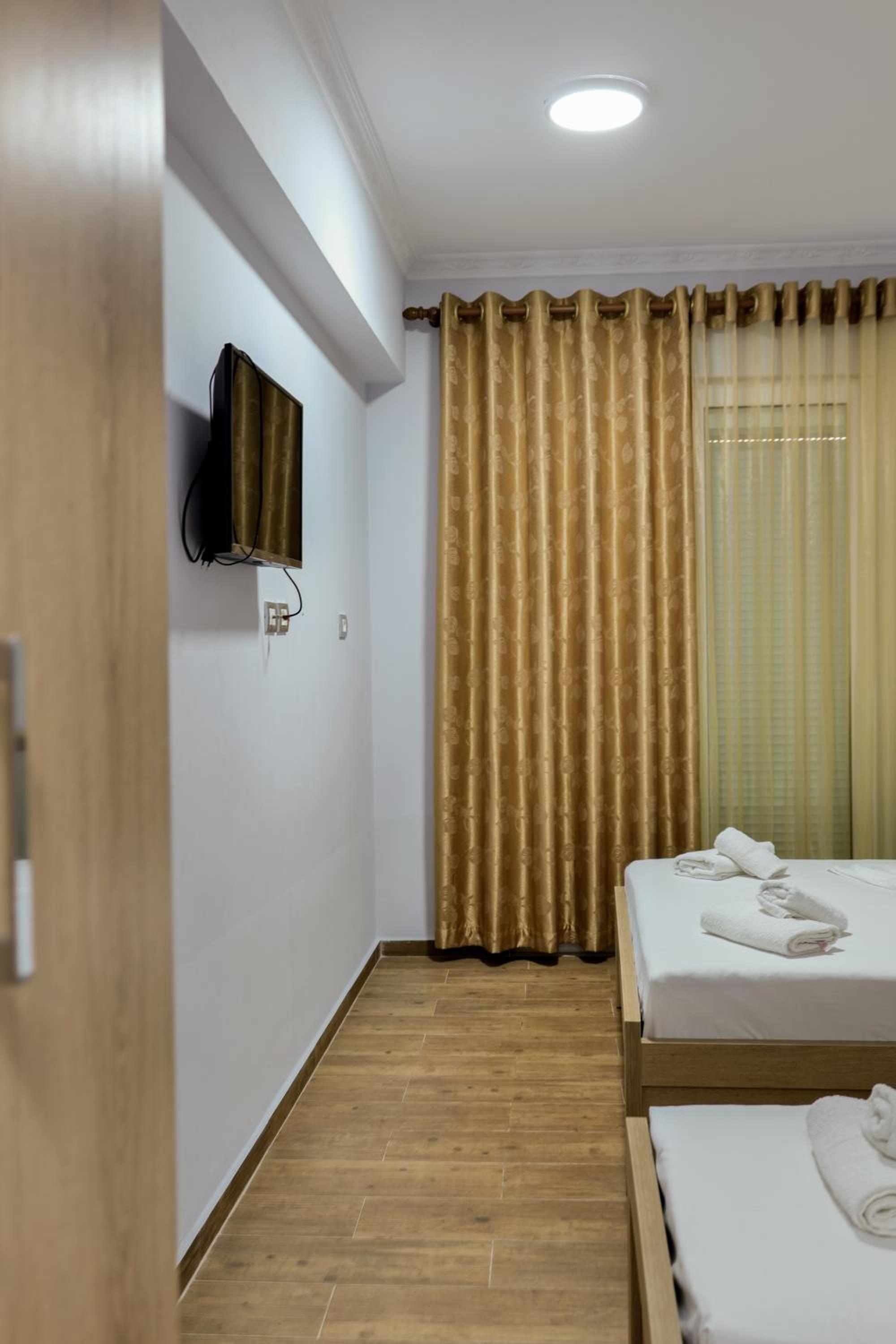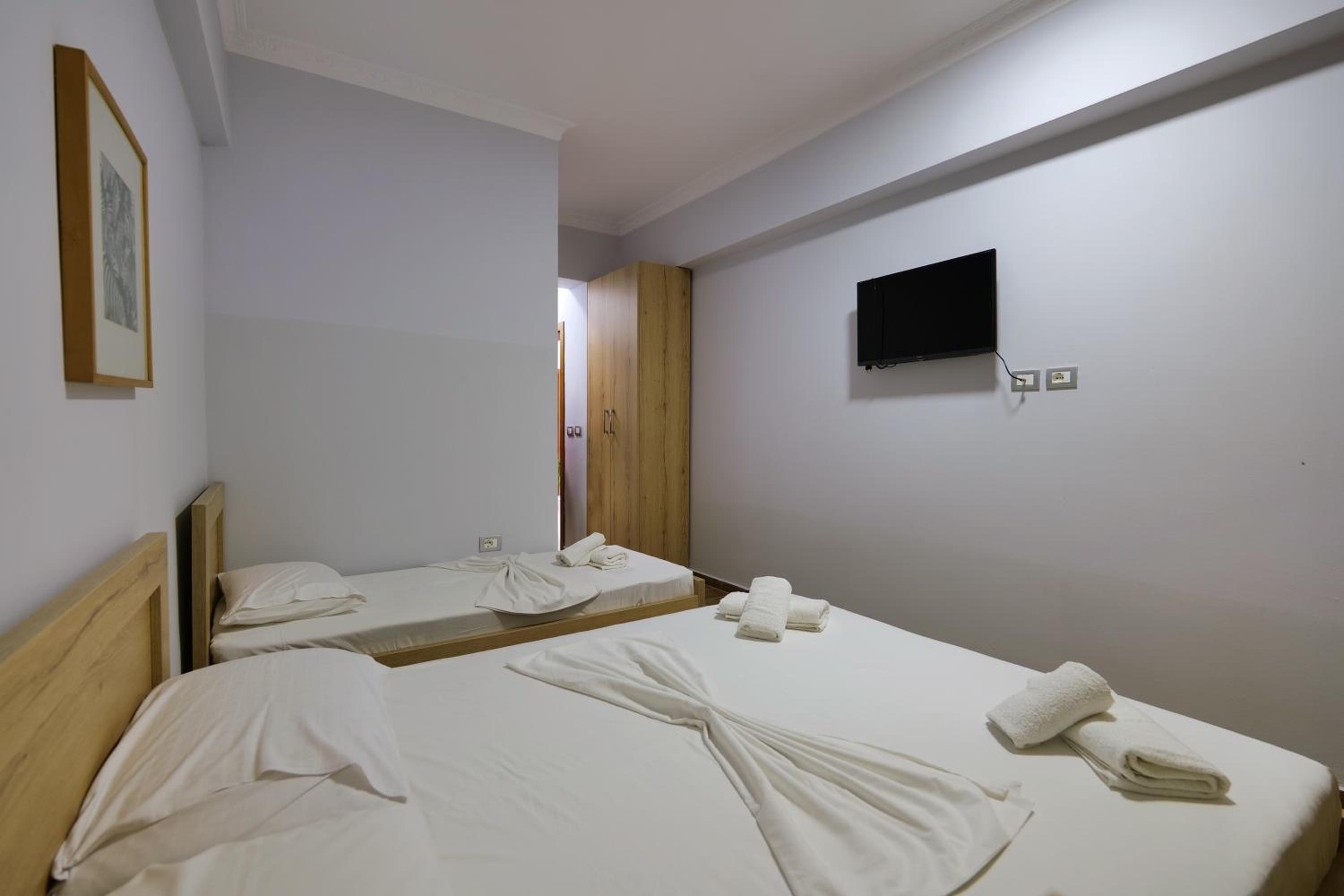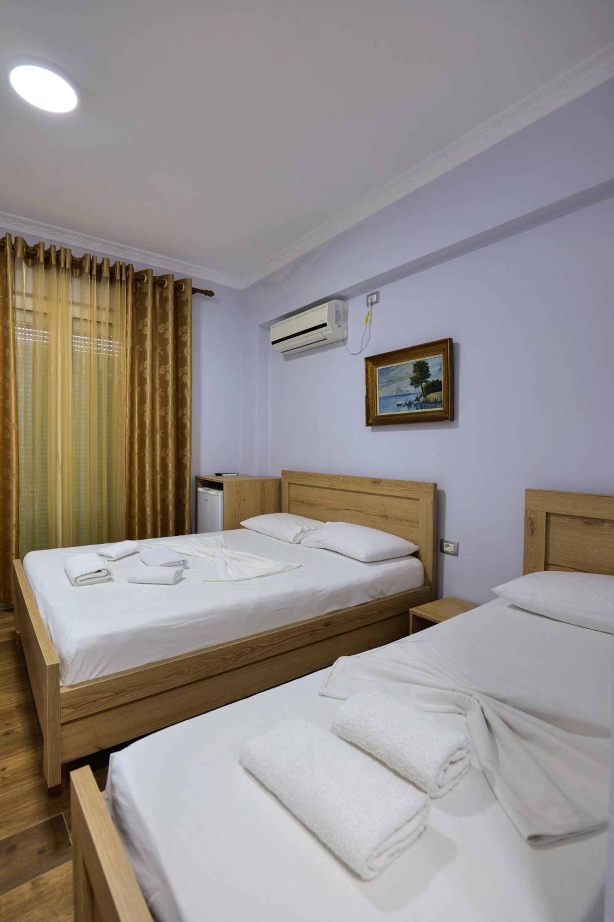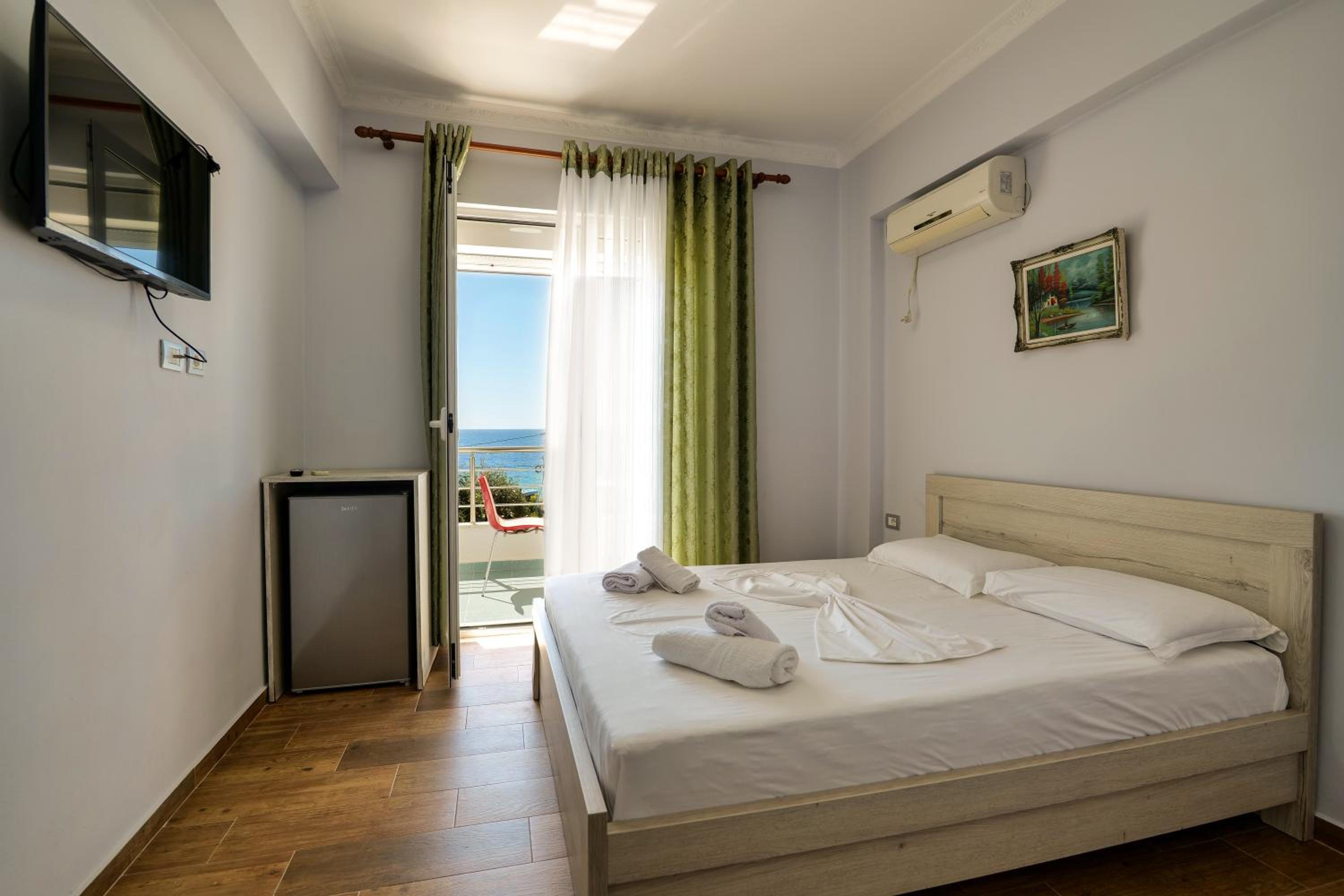En ce qui concerne la chambre 100€/nuit c’est cher pour ce que c’est, nous étions côté montagne, certainement le fait d’être en bord de mer, car pour 10€ de plus à Berat nous avions une chambre qui faisait le double ultra propre et moderne avec un petit déjeuner gargantuesque, ici pas de petit déjeuner, la tv ne fonctionne pas, la chambre était propre sauf la salle de bain où il restait des traces de savons dans l’emplacement des savons, encore beaucoup de cheveux et poils dans la douche (il n’y a d’ailleurs pas de douchette c’est un pommeau en hauteur qui ne bouge, pas impossible de ce laver les cheveux long car peu de pression) un coup chaud froid fillet d’eau.