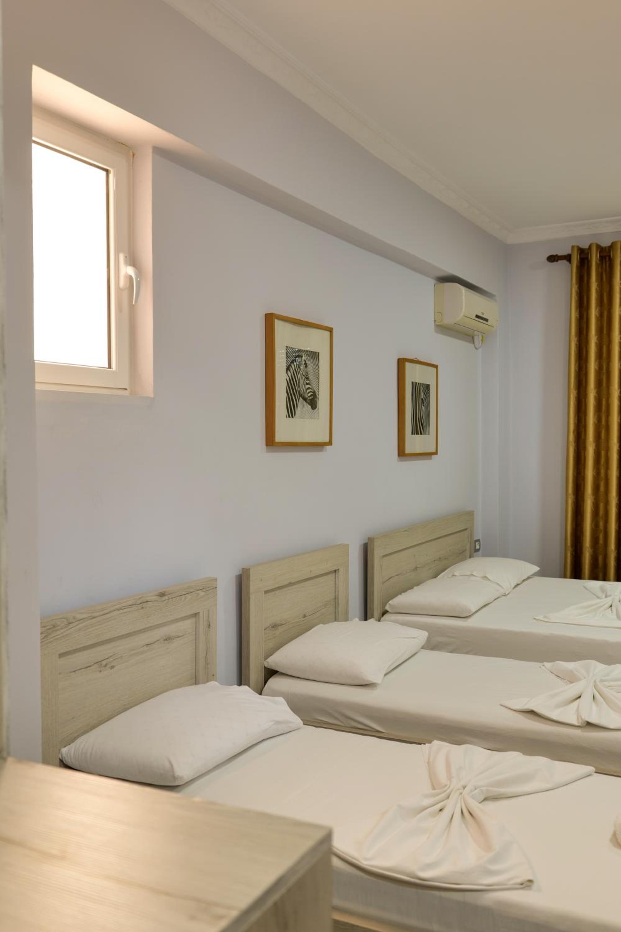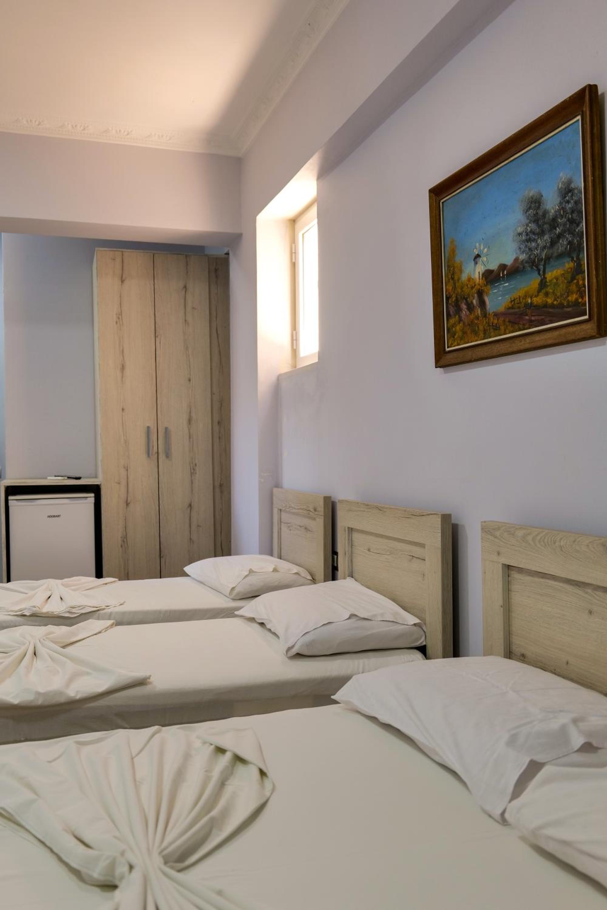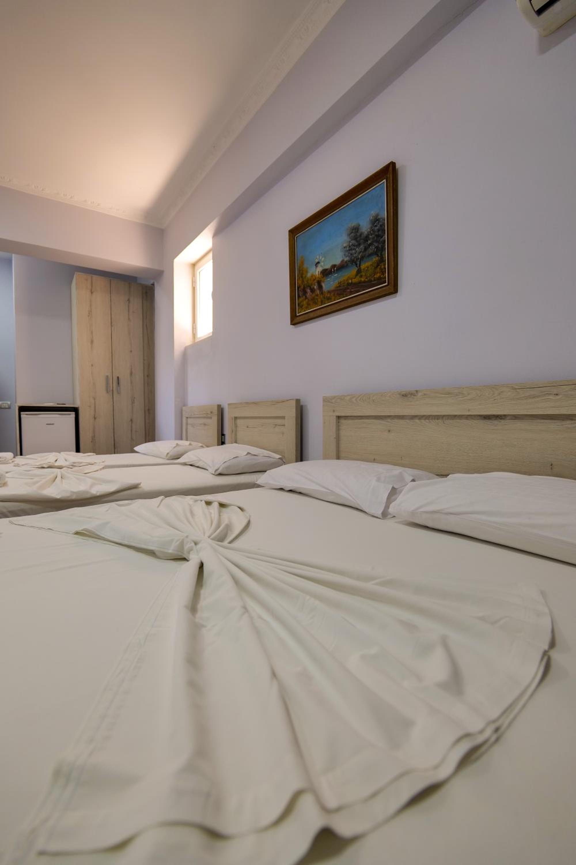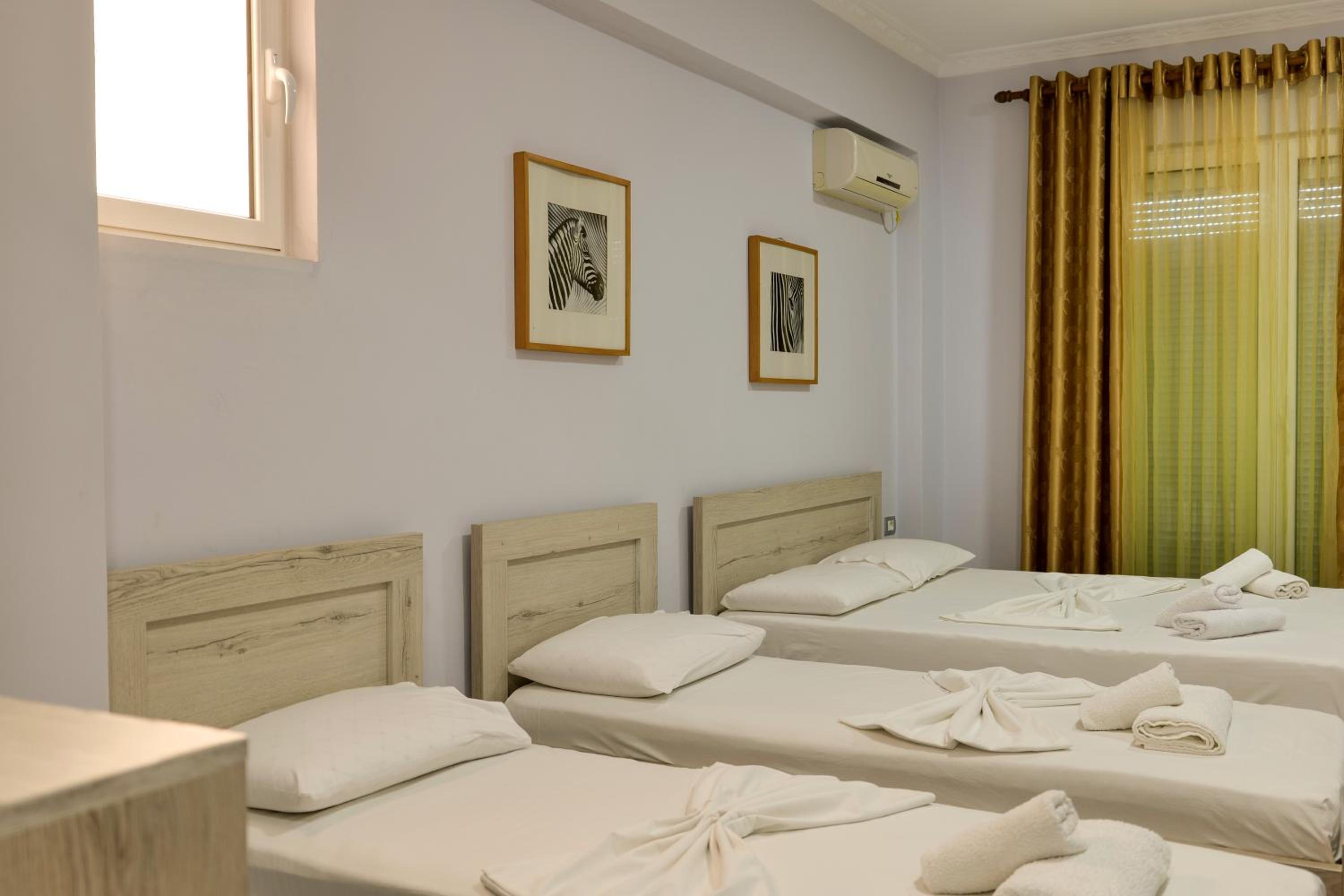 En ce qui concerne la chambre 100€/nuit c’est cher pour ce que c’est, nous étions côté montagne, certainement le fait d’être en bord de mer, car pour 10€ de plus à Berat nous avions une chambre qui faisait le double ultra propre et moderne avec un petit déjeuner gargantuesque, ici pas de petit déjeuner, la tv ne fonctionne pas, la chambre était propre sauf la salle de bain où il restait des traces de savons dans l’emplacement des savons, encore beaucoup de cheveux et poils dans la douche (il n’y a d’ailleurs pas de douchette c’est un pommeau en hauteur qui ne bouge, pas impossible de ce laver les cheveux long car peu de pression) un coup chaud froid fillet d’eau.
