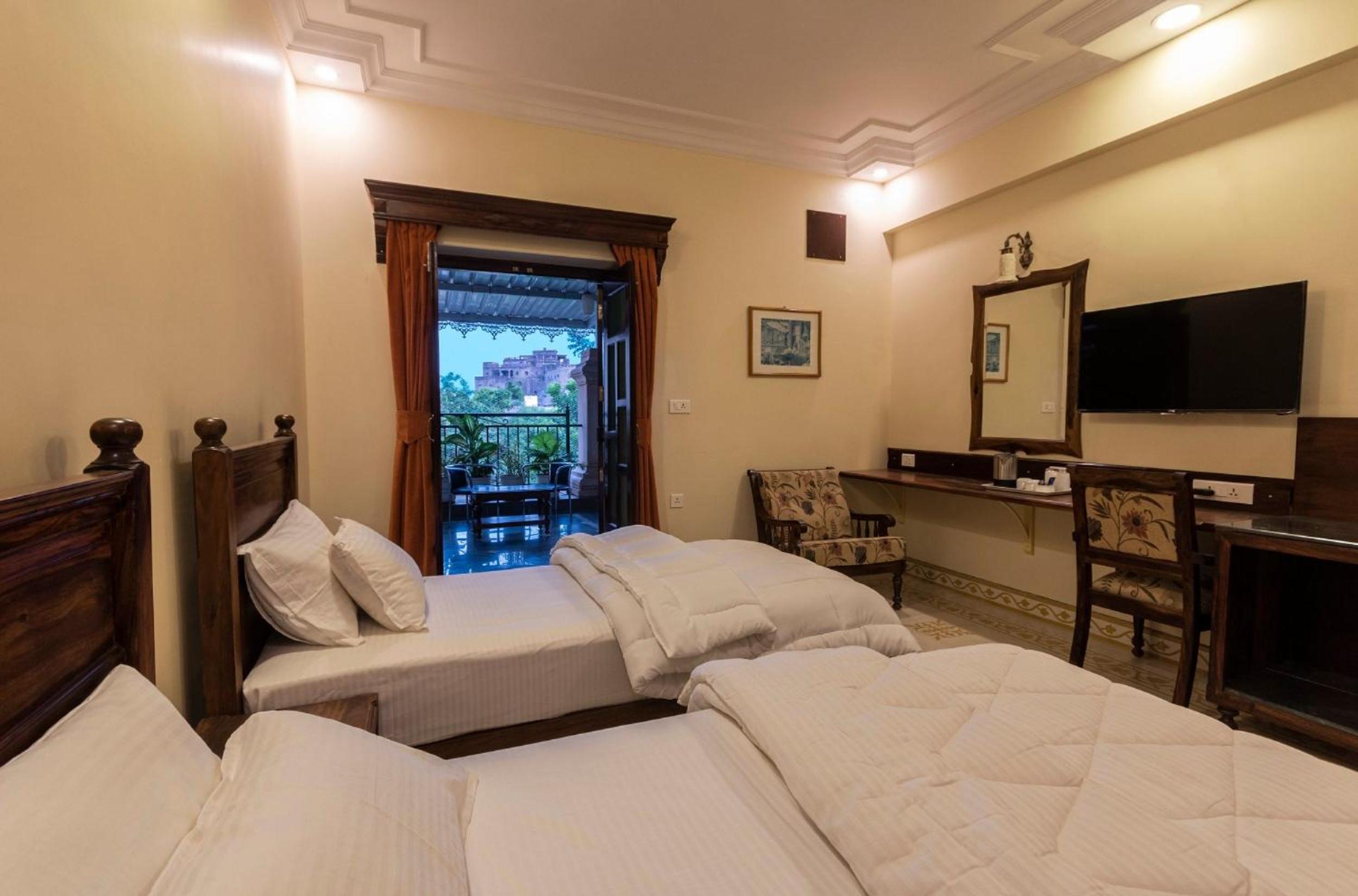 Luxurious Accommodation: Hanuwant Niwas Jodhpur offers elegantly furnished rooms with modern amenities including flat-screen TVs and private bathrooms. Some rooms even feature balconies with stunning city views.