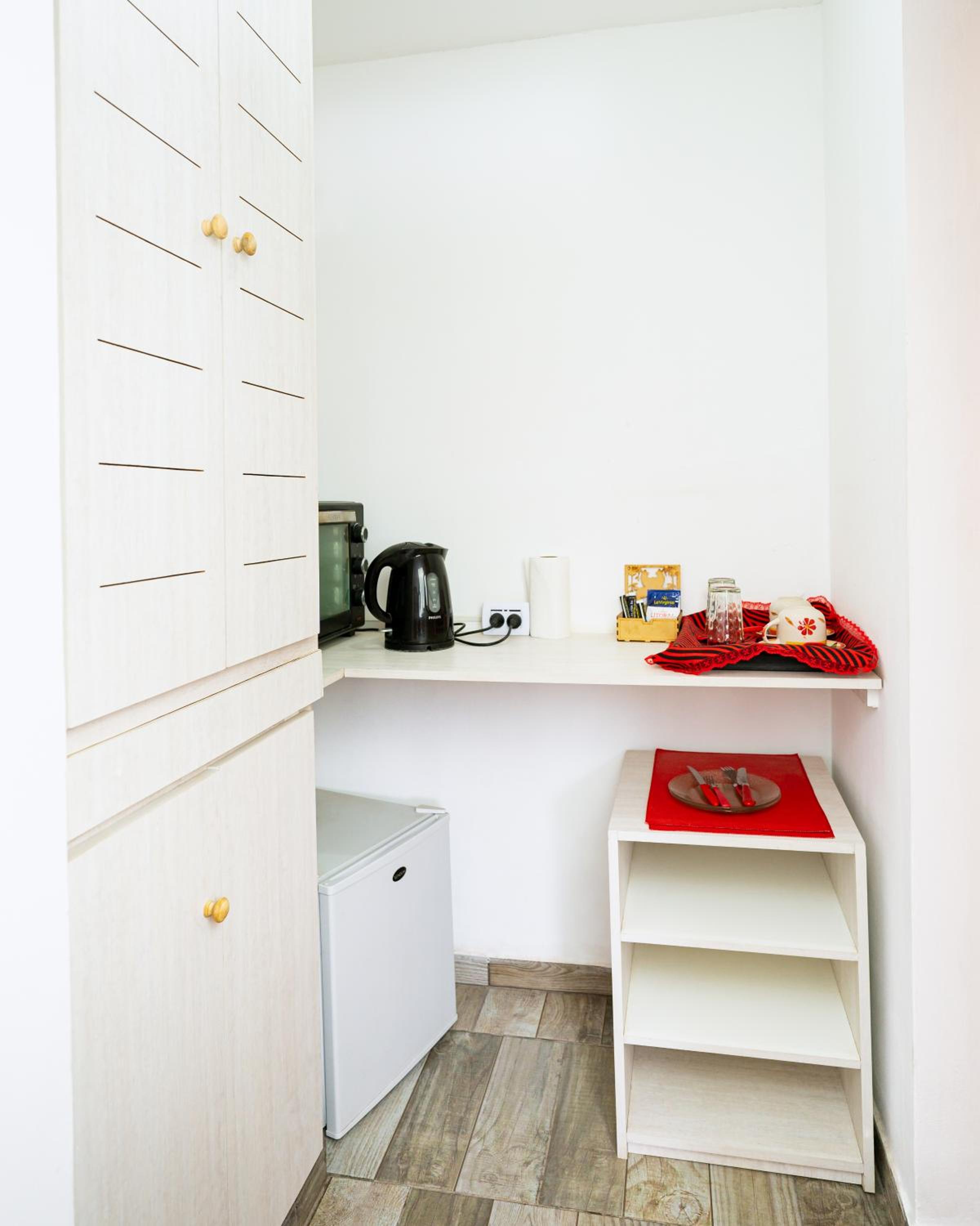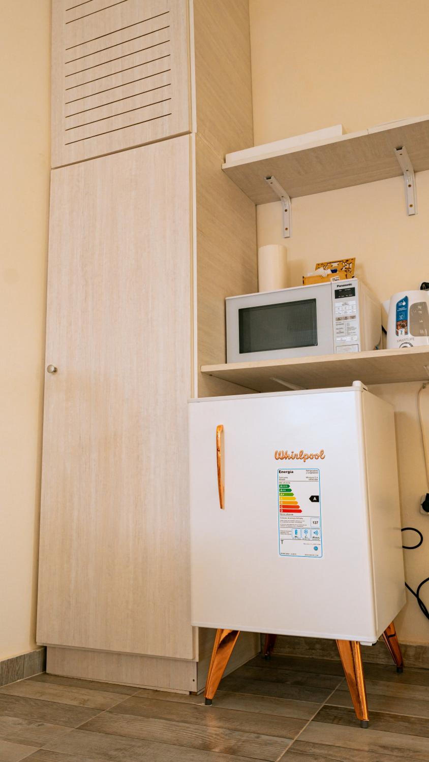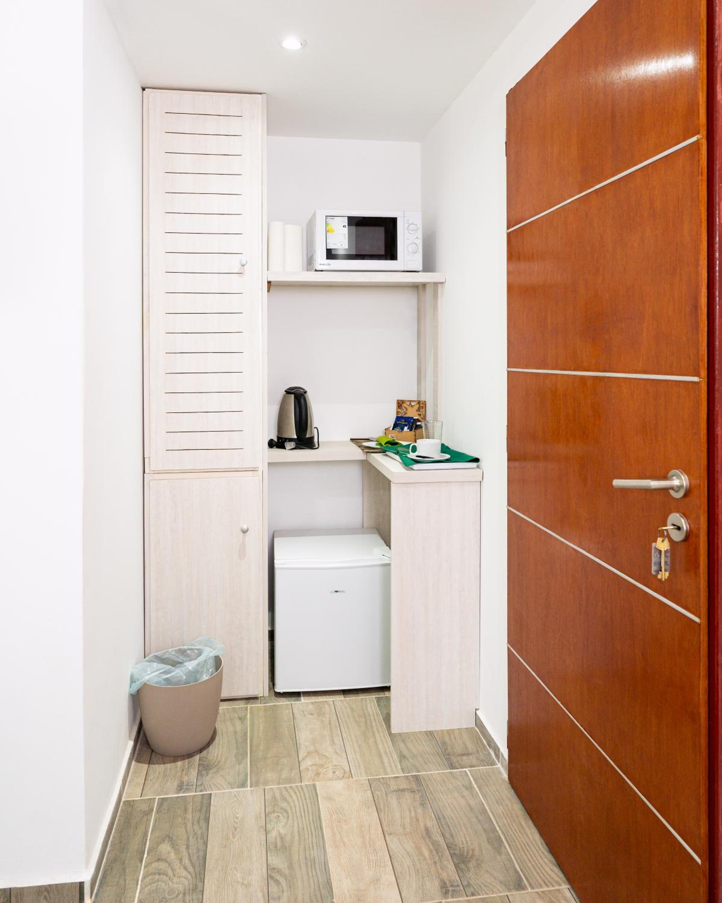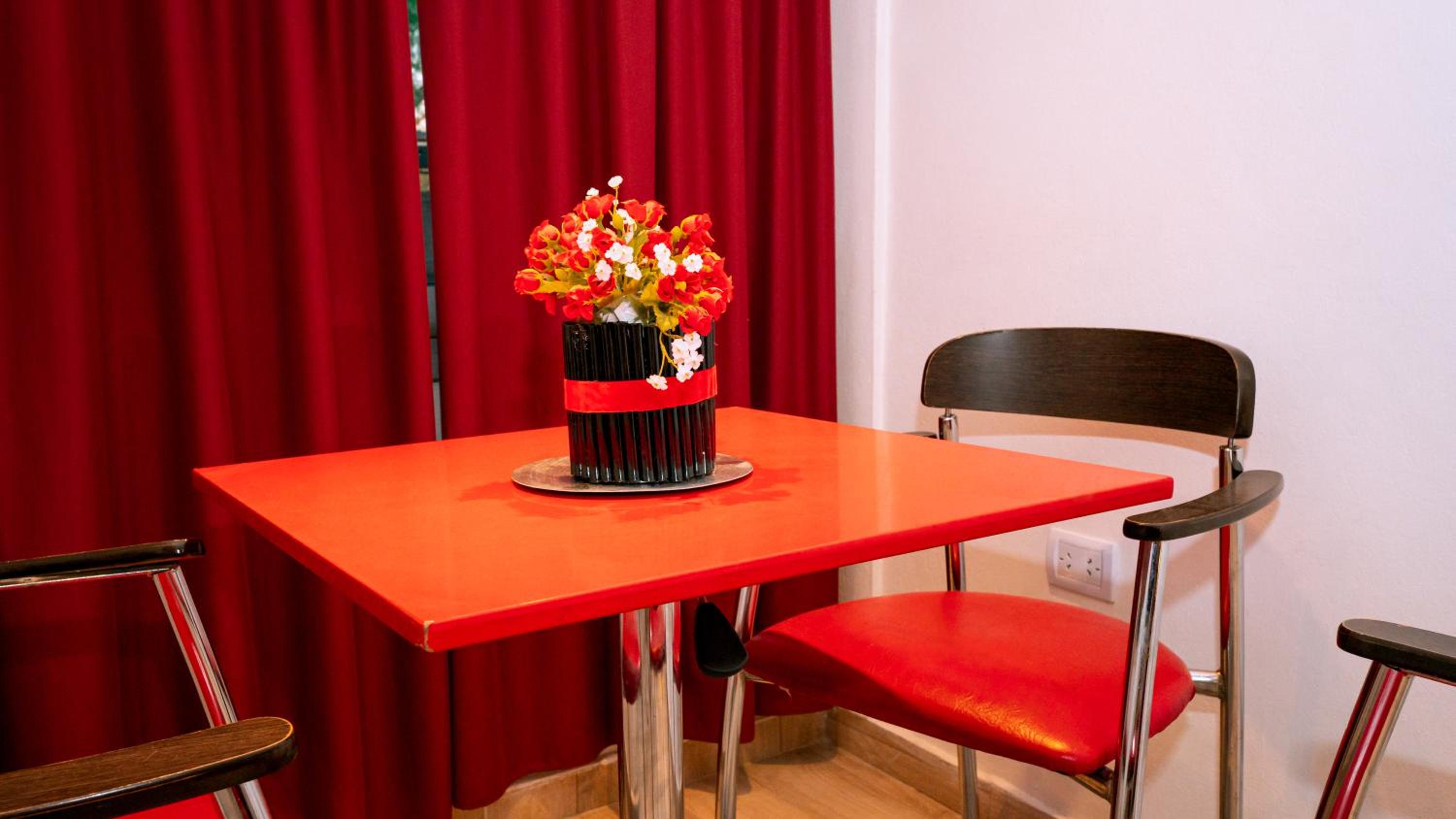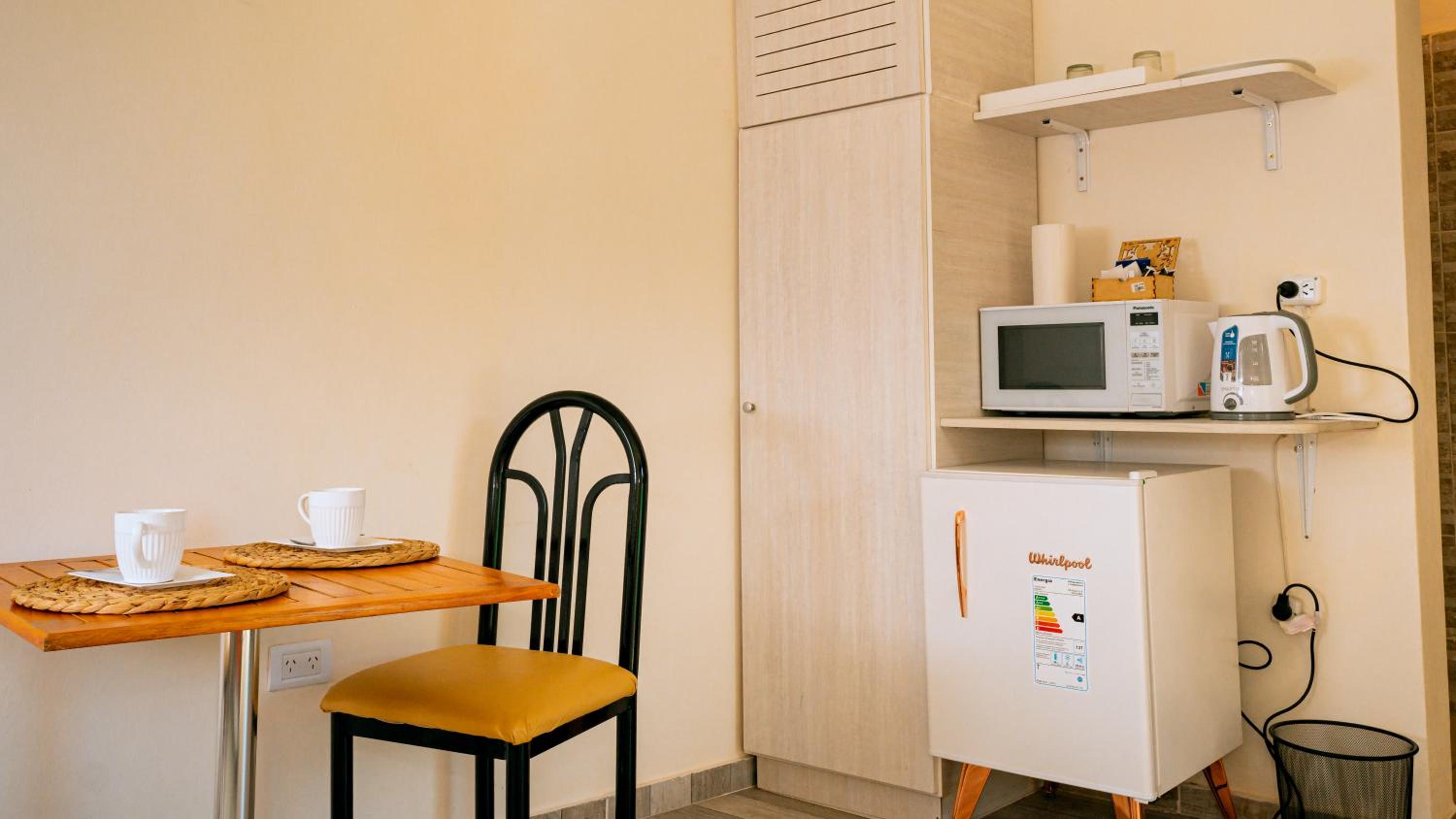 The lady at the reception was very nice! Location is excellent, you can walk everywhere. There is a cerveceria about 4 blocks away behind a gasstation, live music and great food. It totally gives you the small town vibe:-). The room is a good size, did not expect a red interior as all in blue and green on the outside. Colourful sheets, a corner with microwave, kettle and fridge.