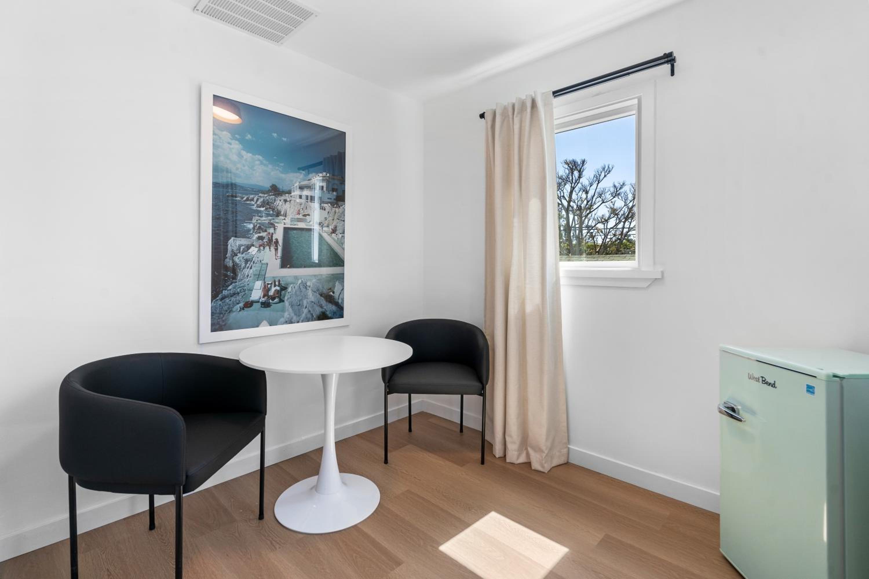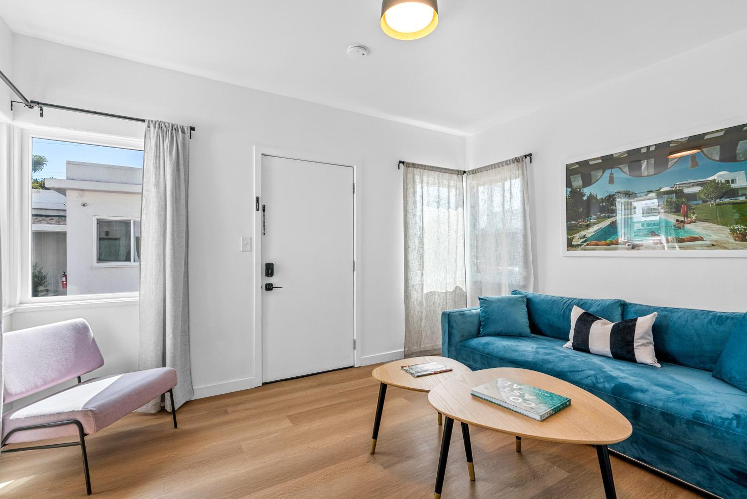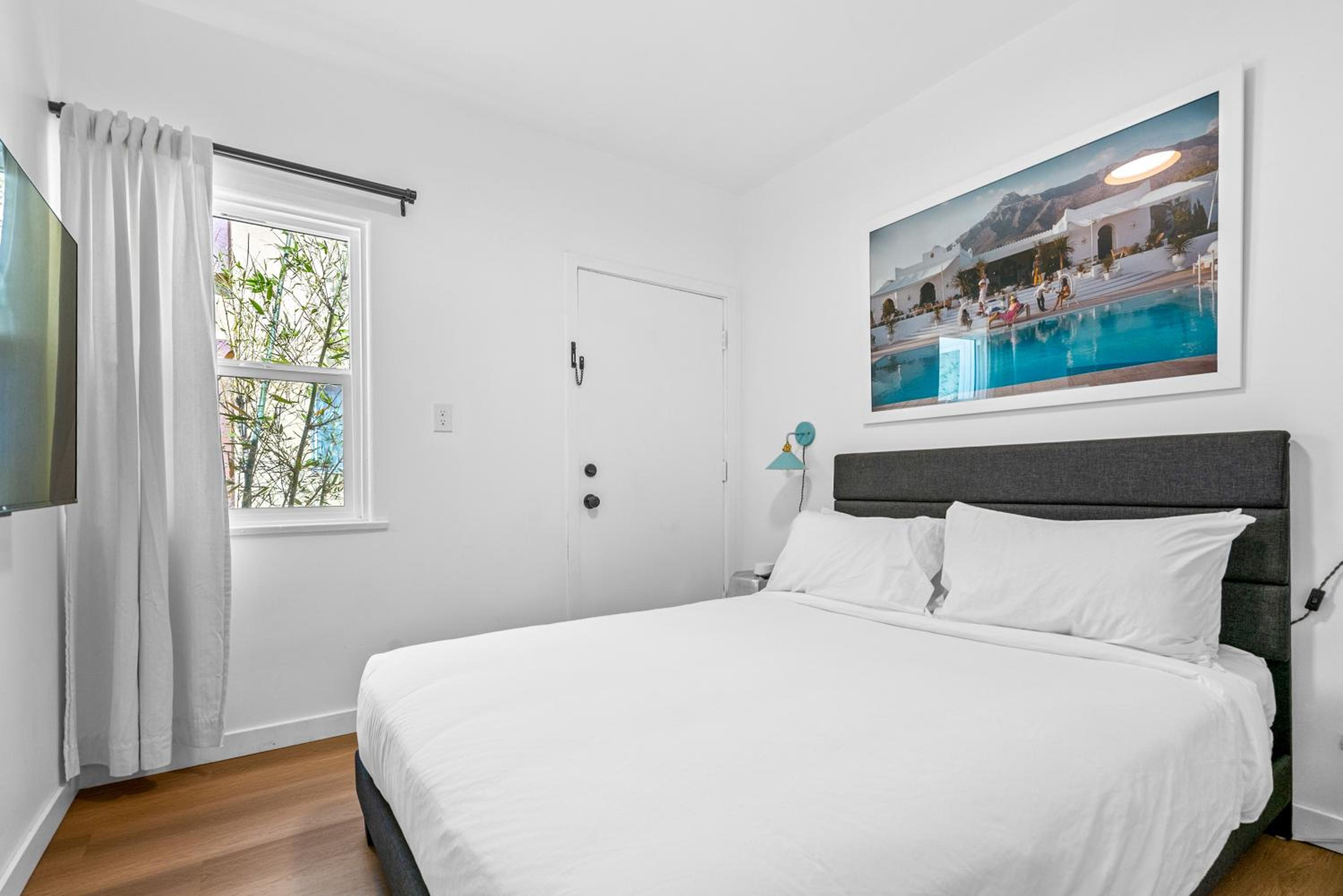 Если зарегистрироваться заранее за день до заселения присылают номер комнаты и код доступа, нет никакой коммуникации с персоналом, выселение такое же простое. Номер большой просторный, отличный душ, тоже просторный, большая кровать. Есть бесплатная парковка на территории. Есть персонал в отдельном здании, там же есть кофе, чай, вода, настольные игры и зона отдыха. До пляжа Санта Моника пешком 15 минут, через дорогу супермаркет с продуктами.