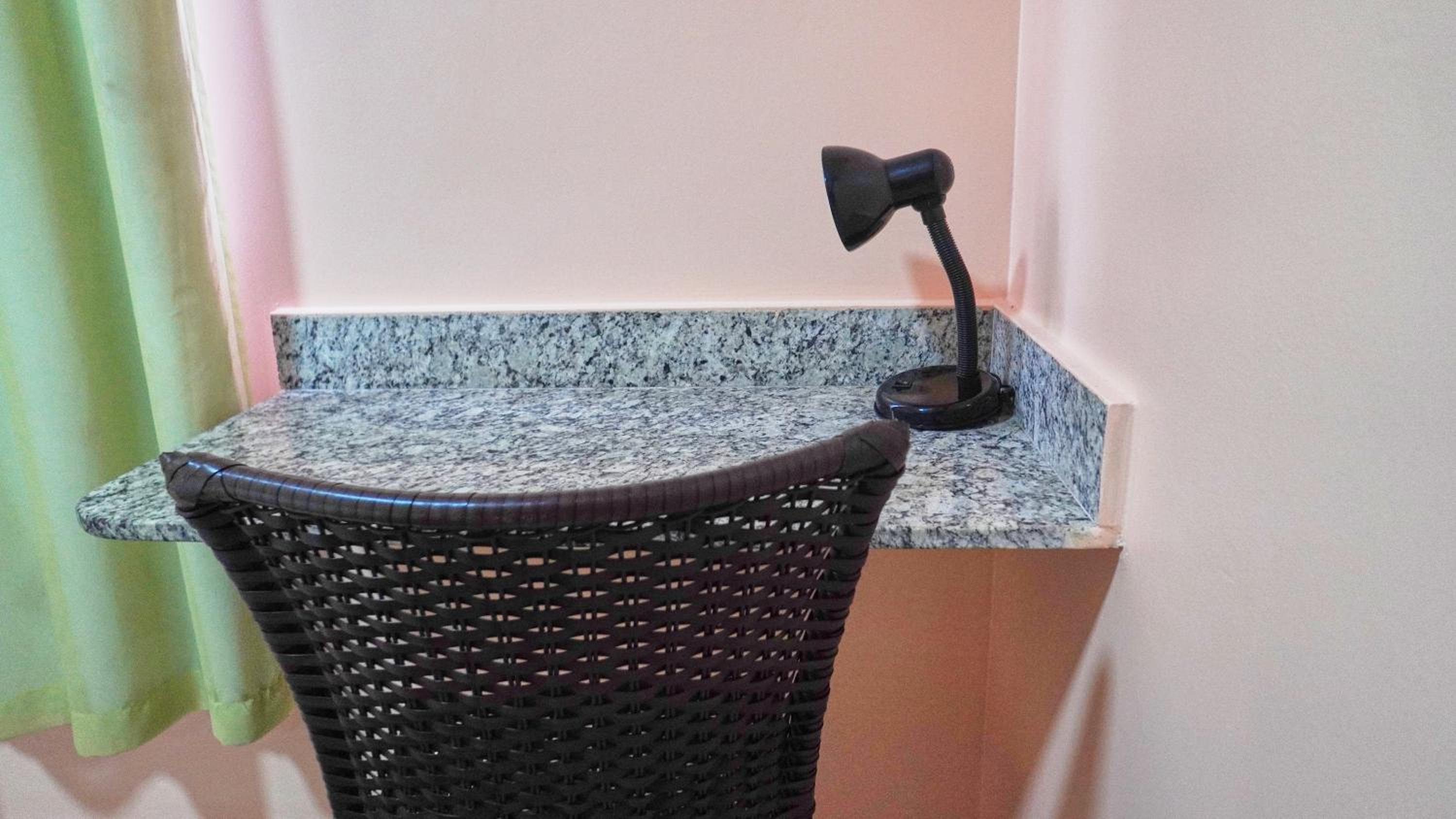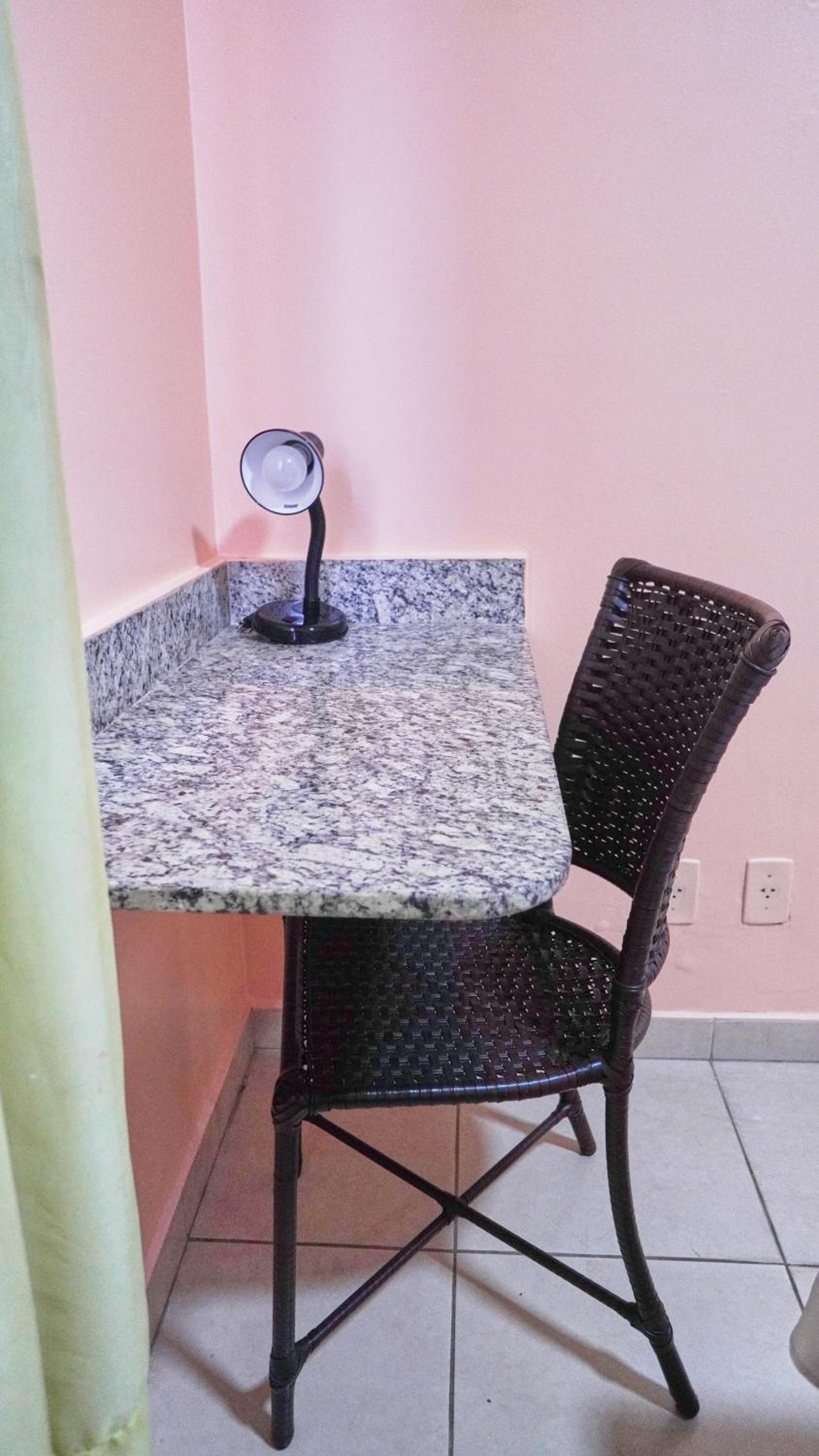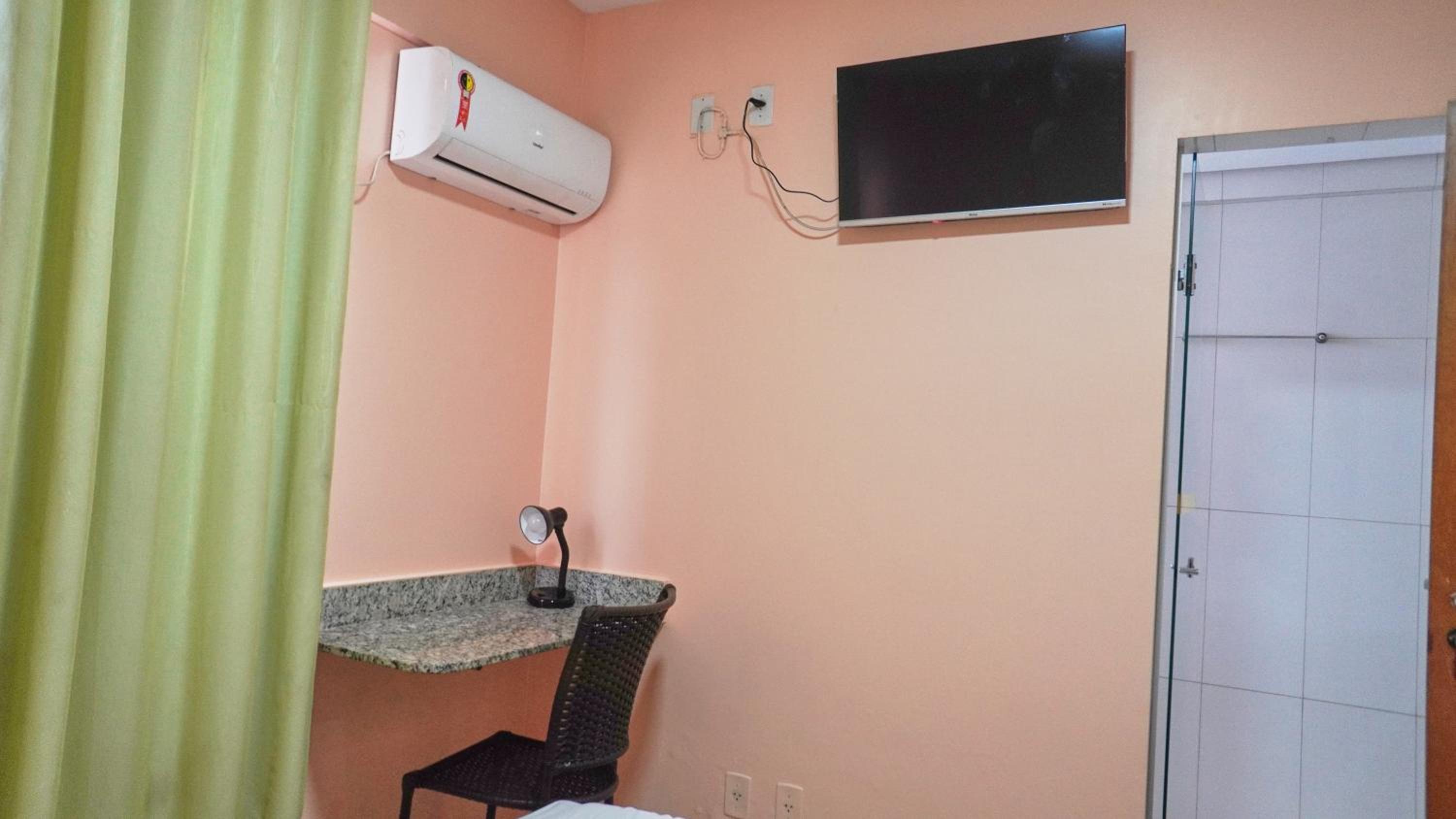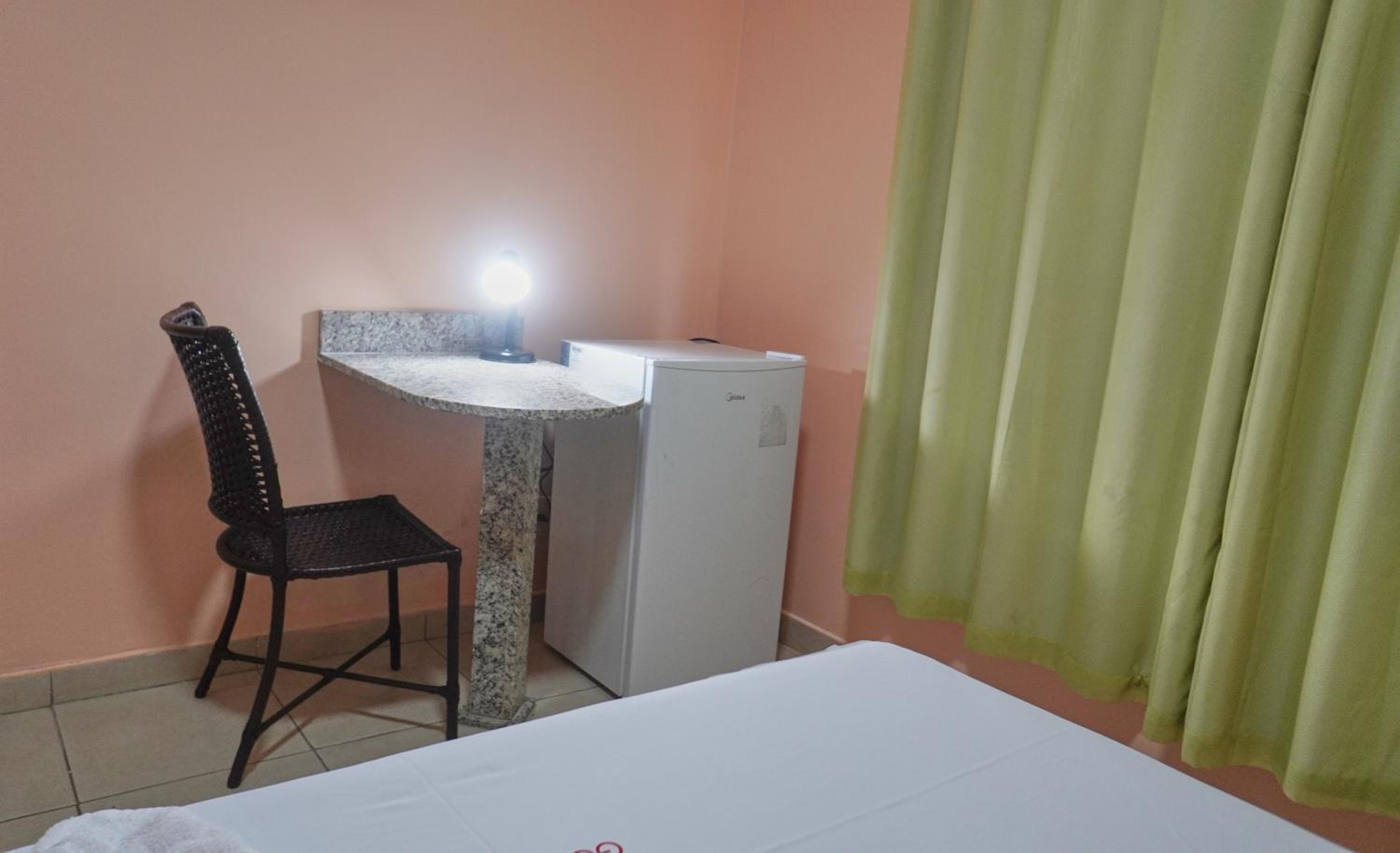 Quarto: frigobar vazio mas funcionando bem caso desejasse comprar comida e guardar; mesa de mármore ao lado do frigobar, no quarto que fiquei não havia cadeira; bancadas de apoio de mamore ao lado da cabeceira da cama; janelas com cortinas de Black out, as cortinas não estavam muito limpas, e tinham um pouco de mofo; TV com receptor de sinal, os controles não estavam funcionando, pra usar fiz tudo nos próprios botões da TV.