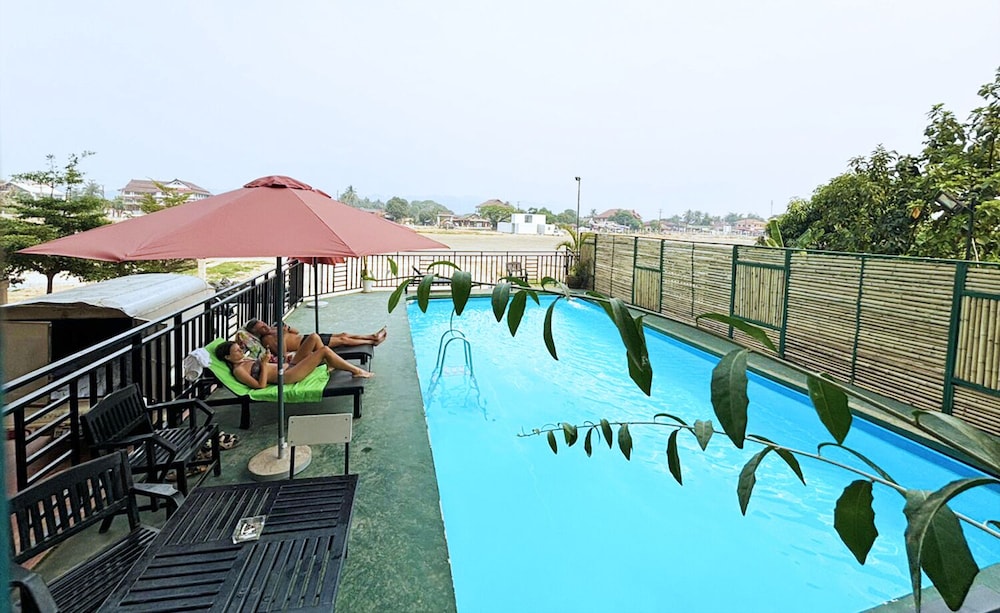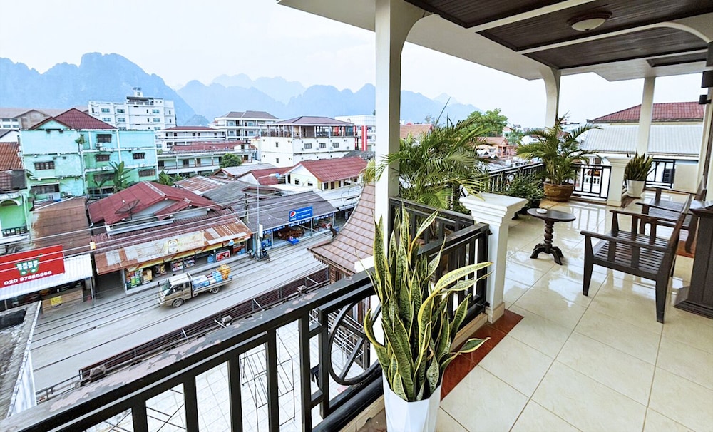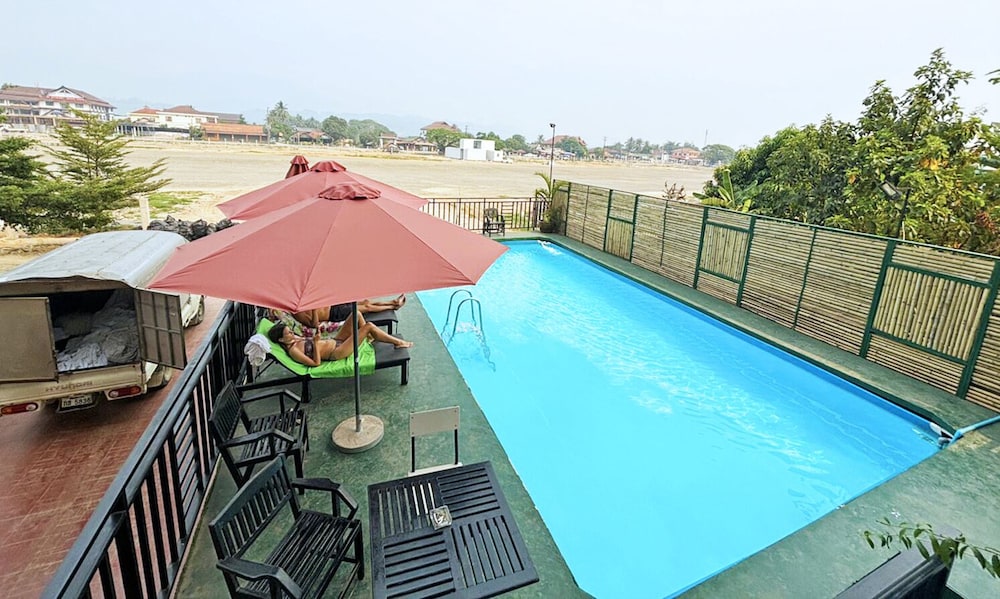 Indulge in the outdoor pool and terrace with stunning views at the VangVieng Central Hotel.