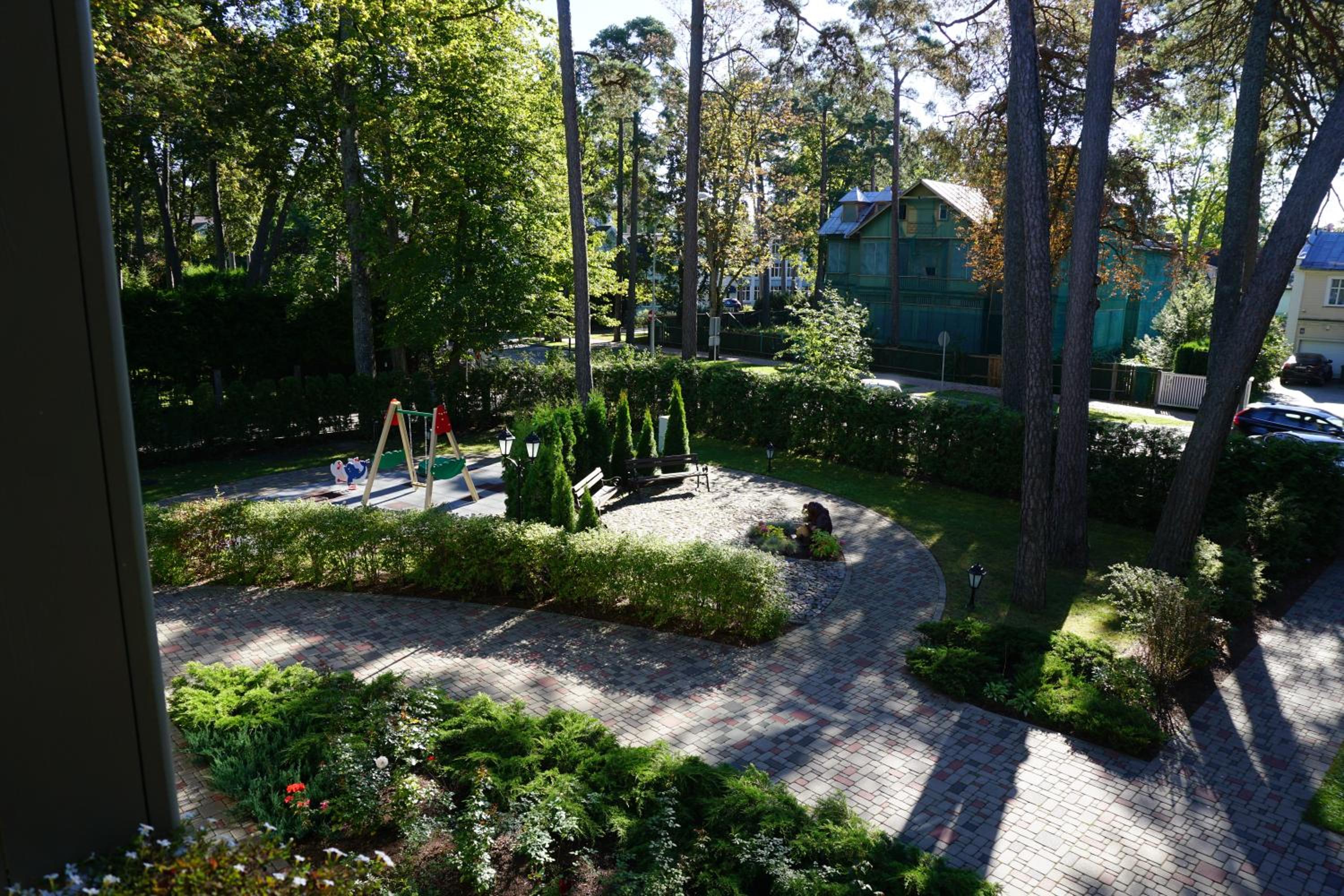 Прежде всего — само здание. Это настоящий, очень выразительный образец юрмальской дачной архитектуры начала XX века с элементами национального романтизма и югендстиля. Резной деревянный декор, ажурные украшения фасадов и окон, башенки, сложный силуэт, высокие потолки и большие, мелкоостеклённые окна — всё это создаёт ощущение, что живёшь не просто в апартаментах, а в исторической вилле с характером и настроением.