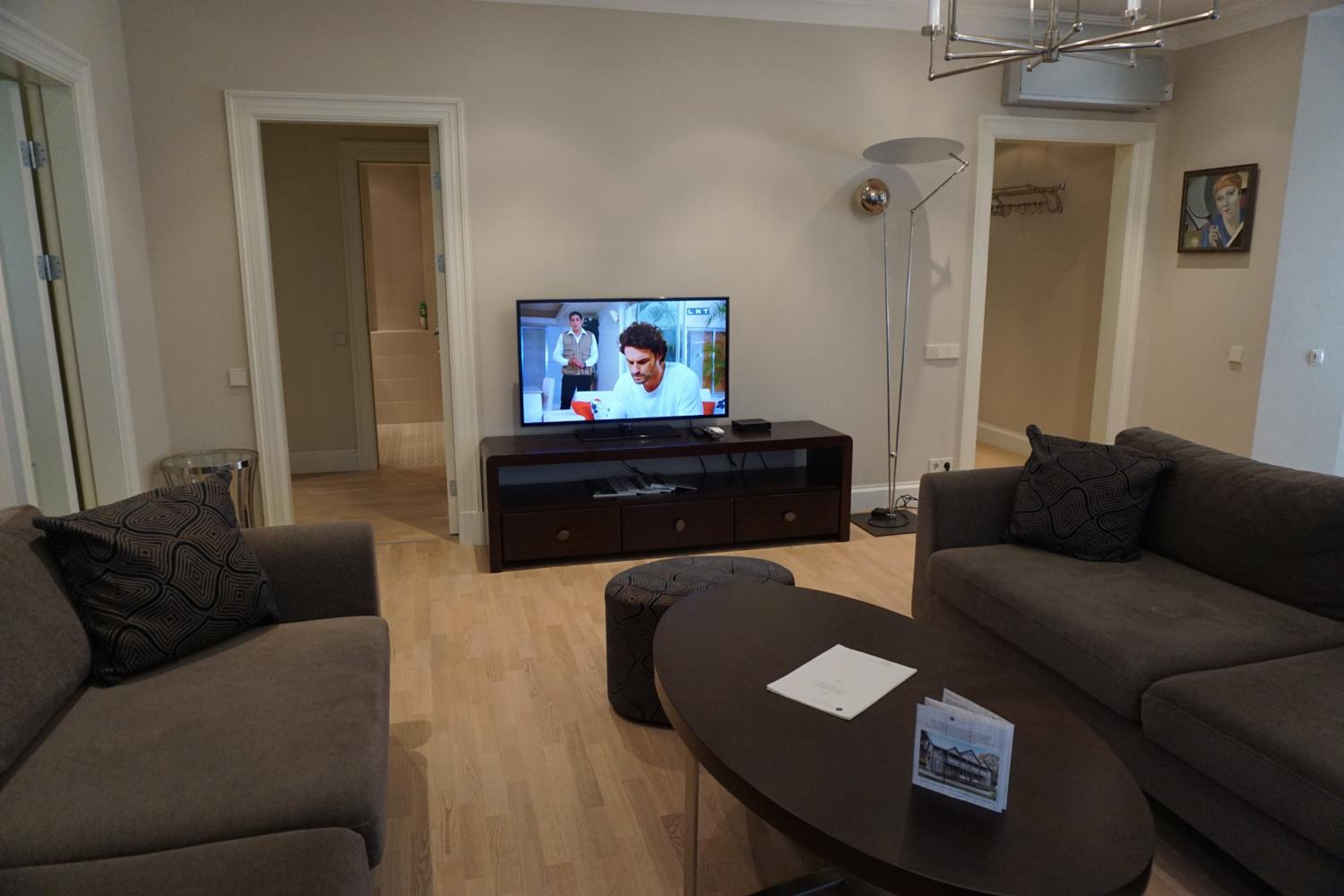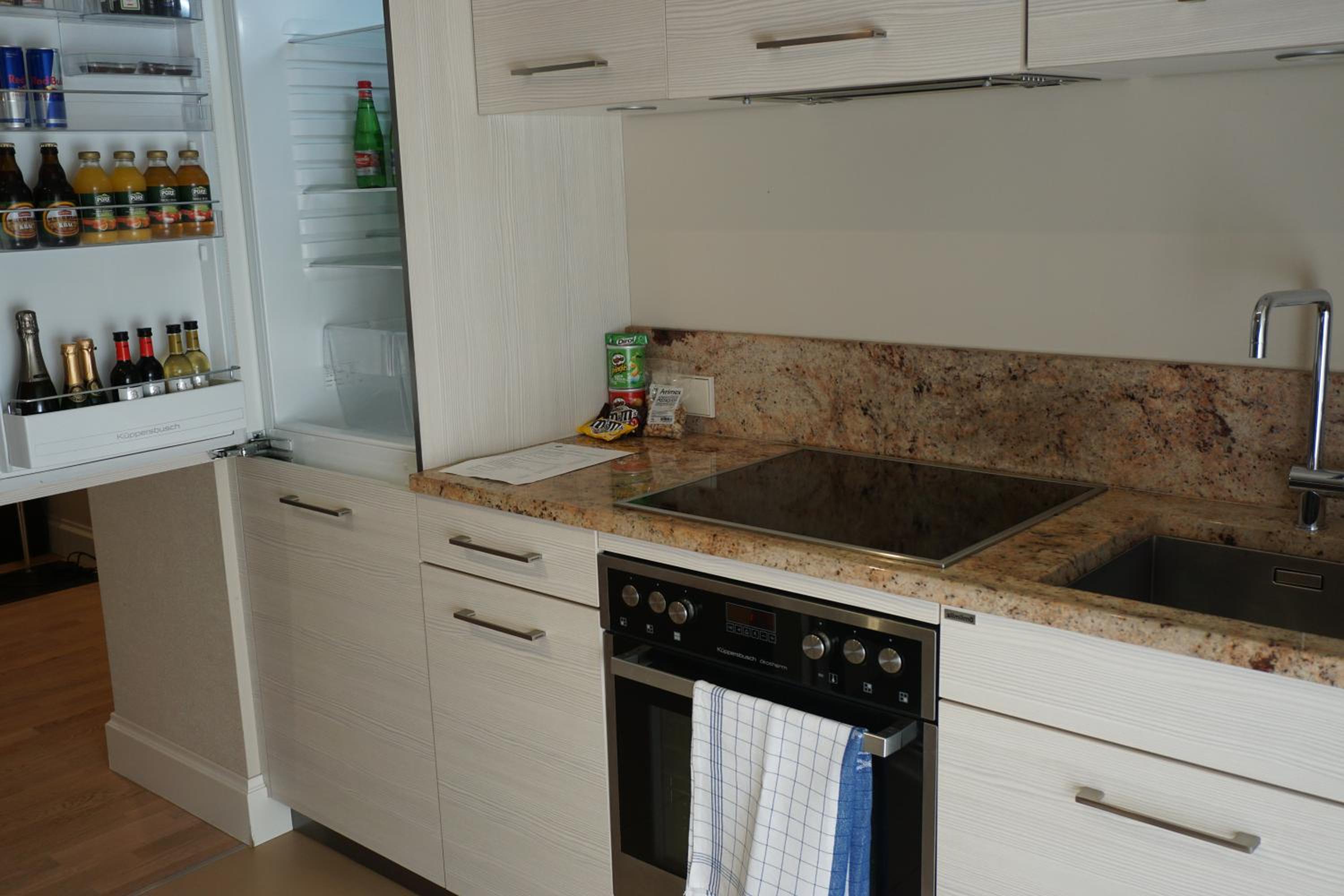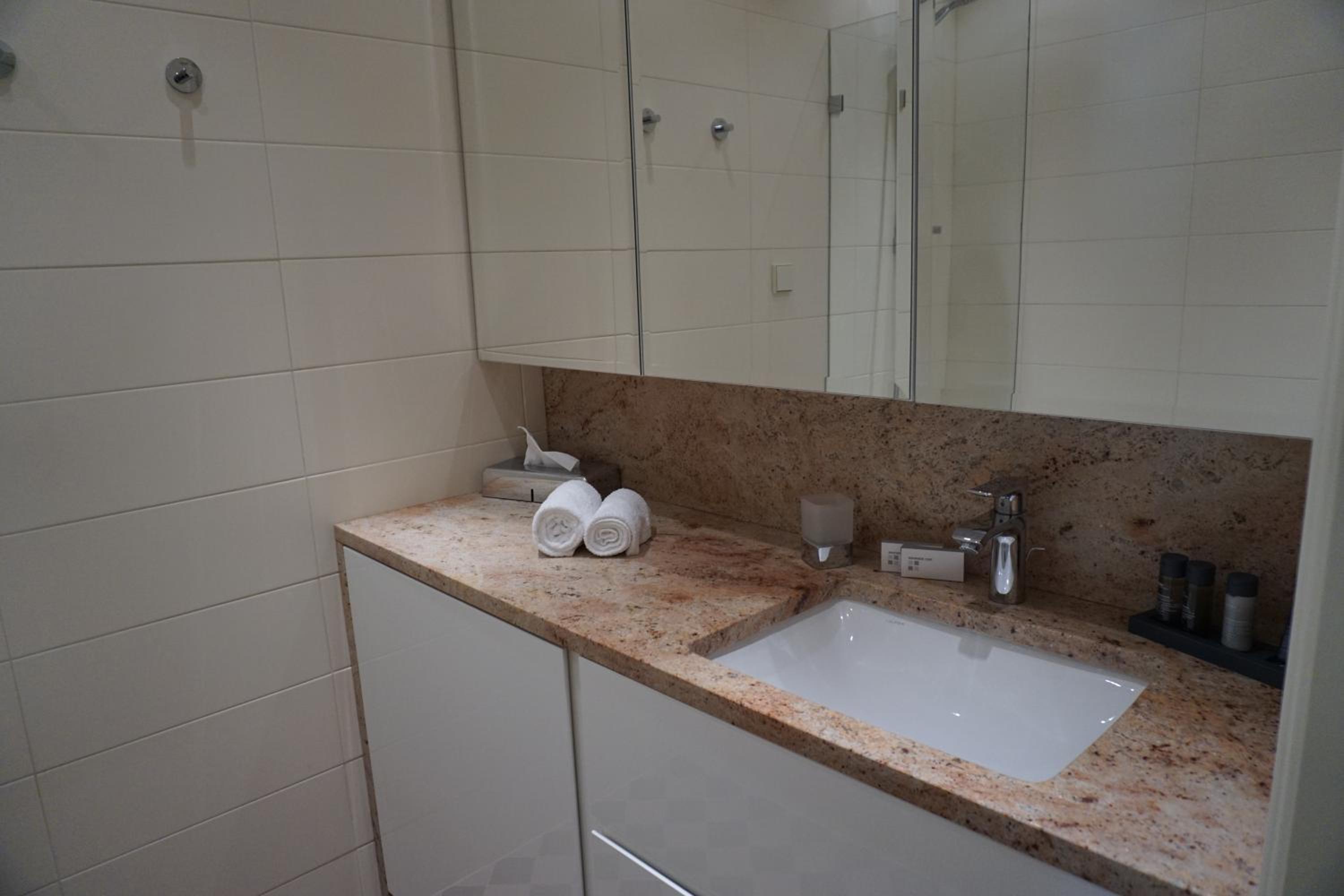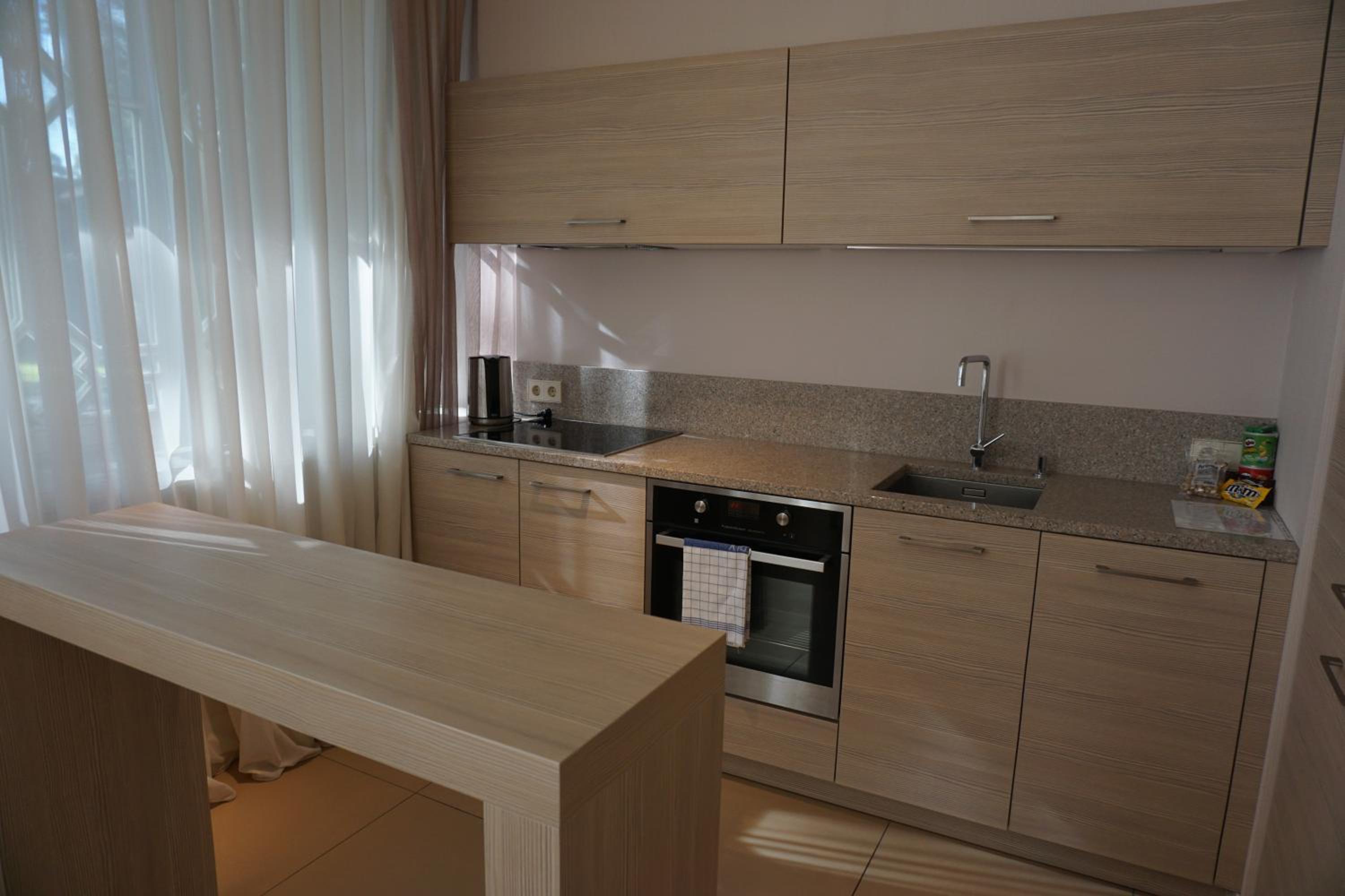 Indulge in the modern comforts of our air-conditioned apartments, each equipped with a flat-screen TV, minibar, and a kitchenette with a dishwasher. Unwind in the luxurious bath and shower combination in the private bathroom, complete with complimentary bathrobes and a hairdryer.