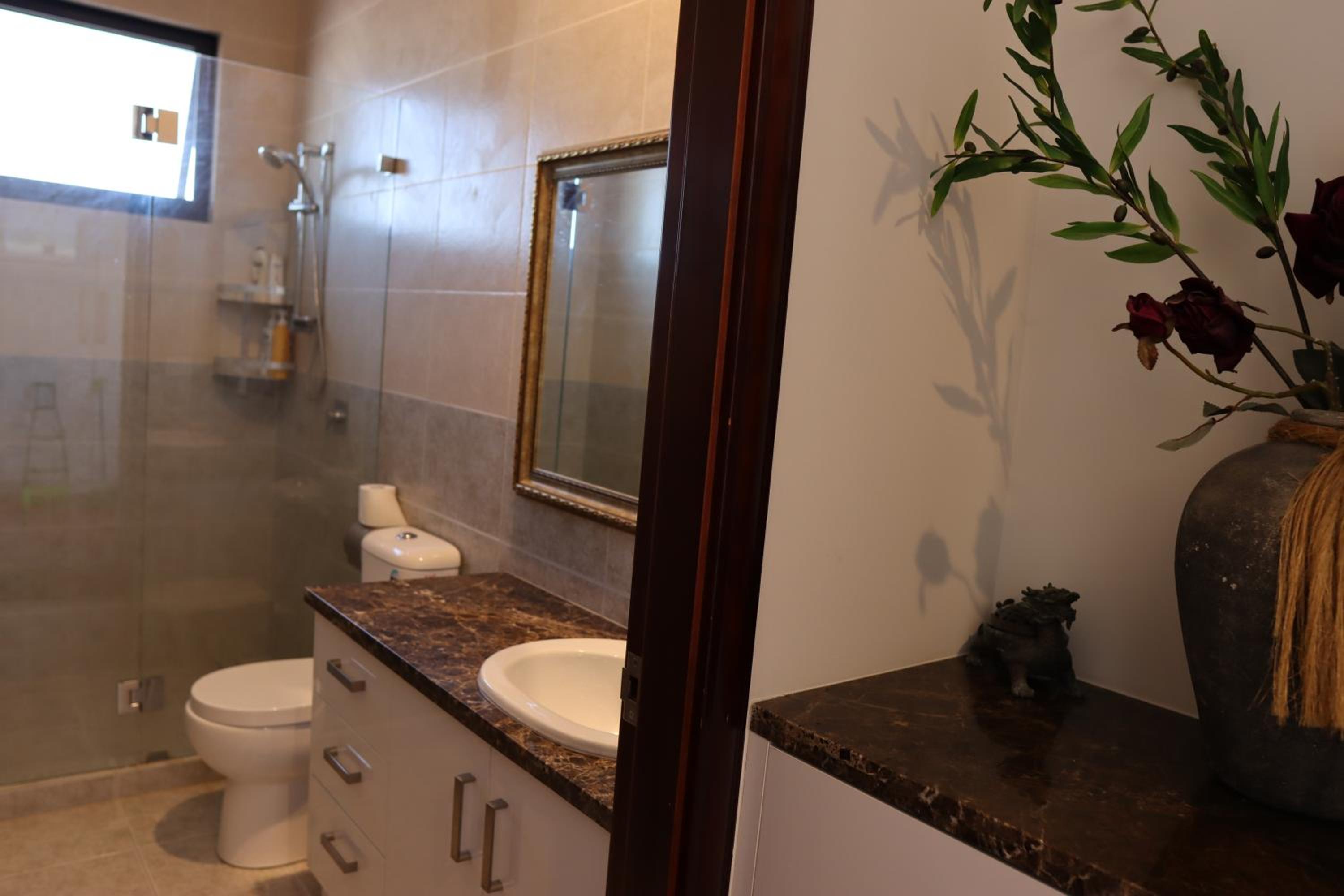 Übers allgemeine Haus kann man sagen dass es geschmackvoll eingerichtet ist, man fühlt sich wie in einem Traum wenn man es zum ersten Mal betritt. Es verfügt über eine freistehende Indoorkücke, eine Outdoorküche, mehreren Sitzmöglichkeiten, einen großen Fernseher mit Couchlounge und einer Waschmaschine mit Trockner. Dies kann von allen Hausbewohner genutzt werden. Insgesamt gibt es 5 Zimmer, nur das Zimmer 1 hat ein eigenes Bad. Man kann in jedem Zimmer die Temperatur selbst regulieren, was ein zusätzlich Pluspunkt ist. Das Hauspersonal wohnt auch im Haus was mega praktisch ist, die Frau ist mega lieb und freundlich und hilft immer gerne wenn man was braucht.