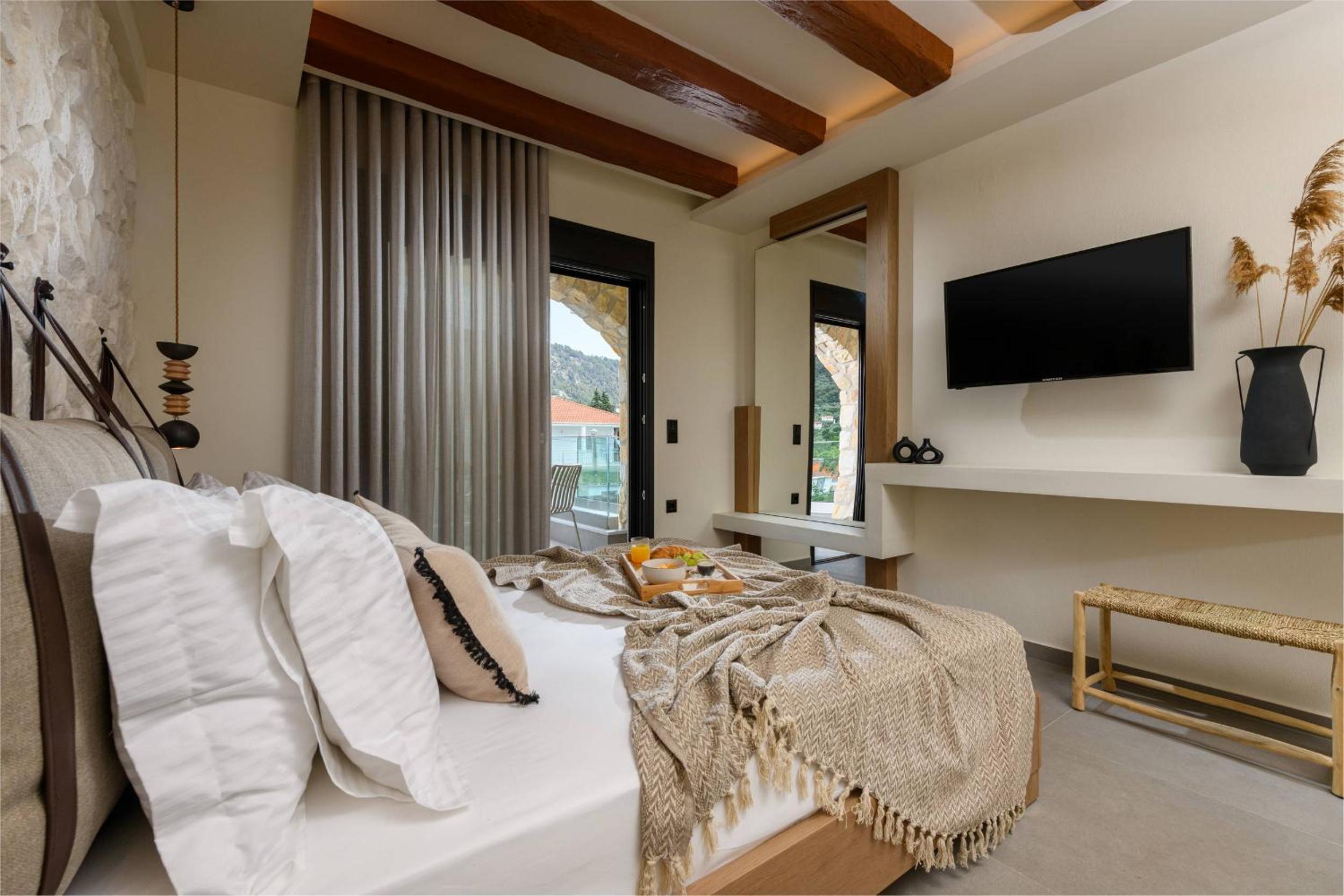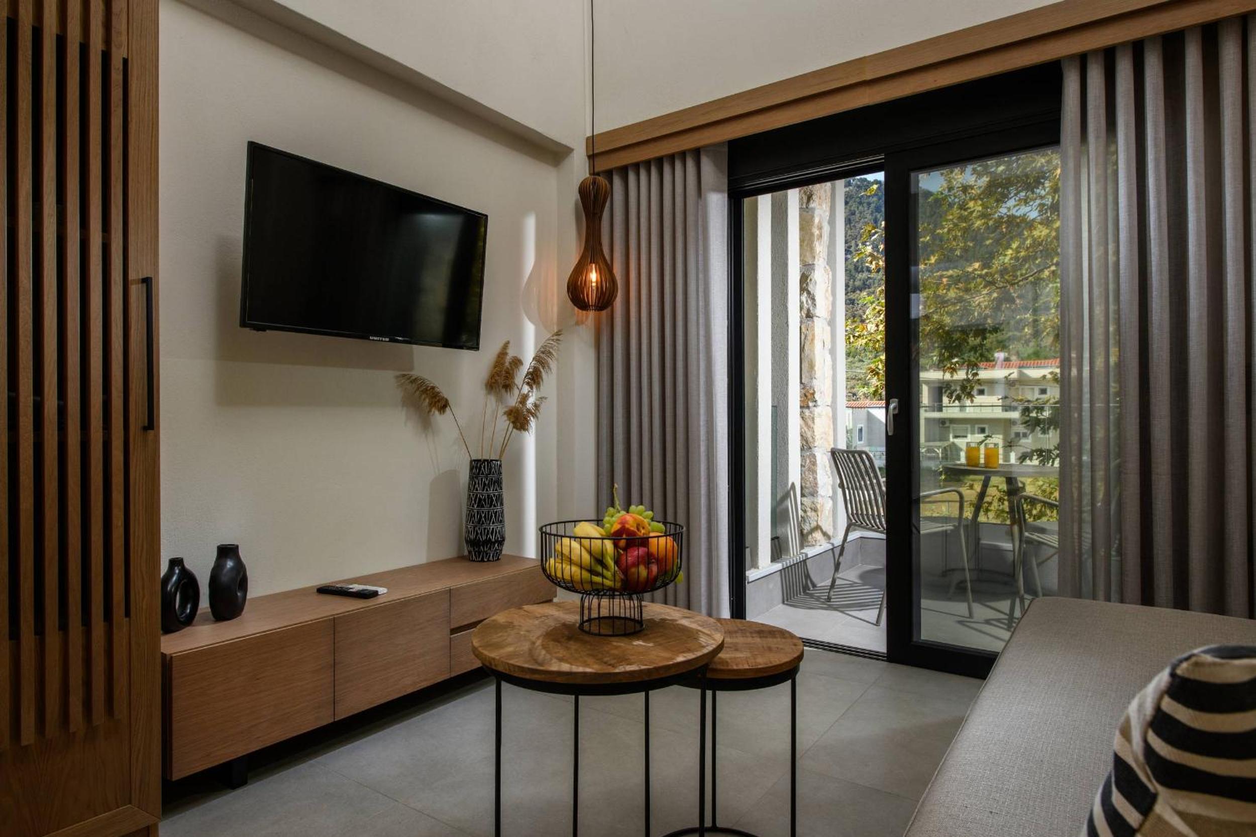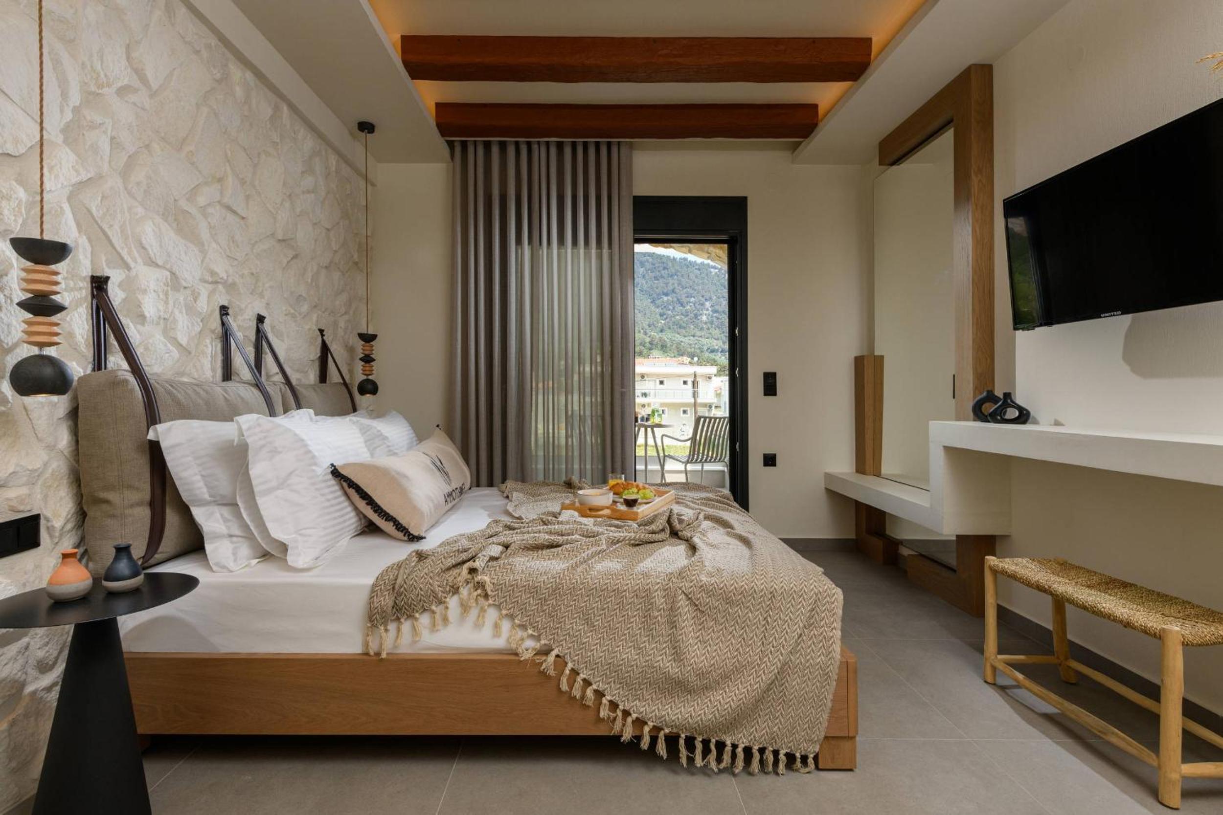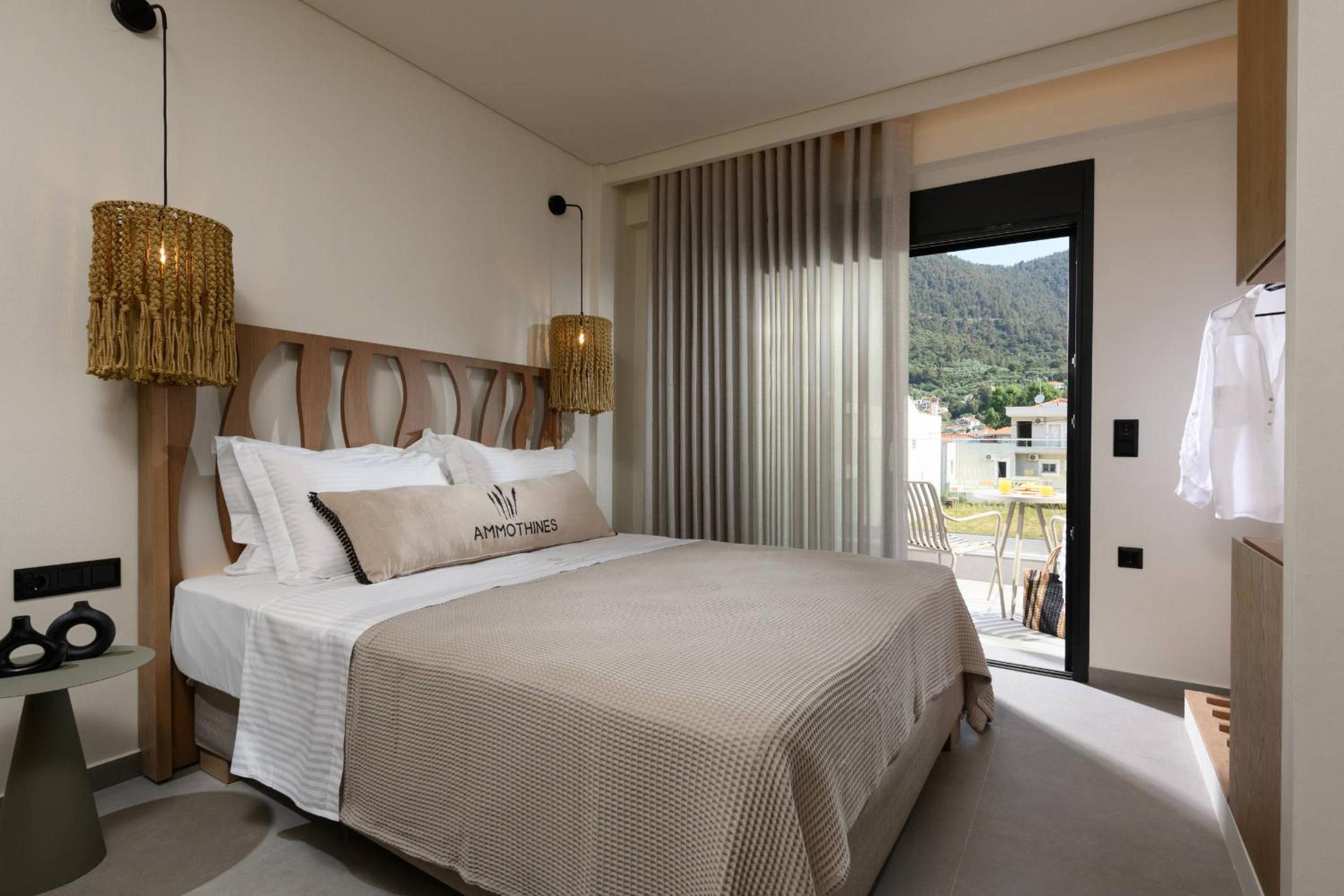 Ammothines Beach Suites offers air-conditioned rooms with a range of modern amenities including a coffee machine, flat-screen TV, and a private balcony. Guests can enjoy breathtaking mountain views and relax in comfort with room service and free WiFi available throughout the property.