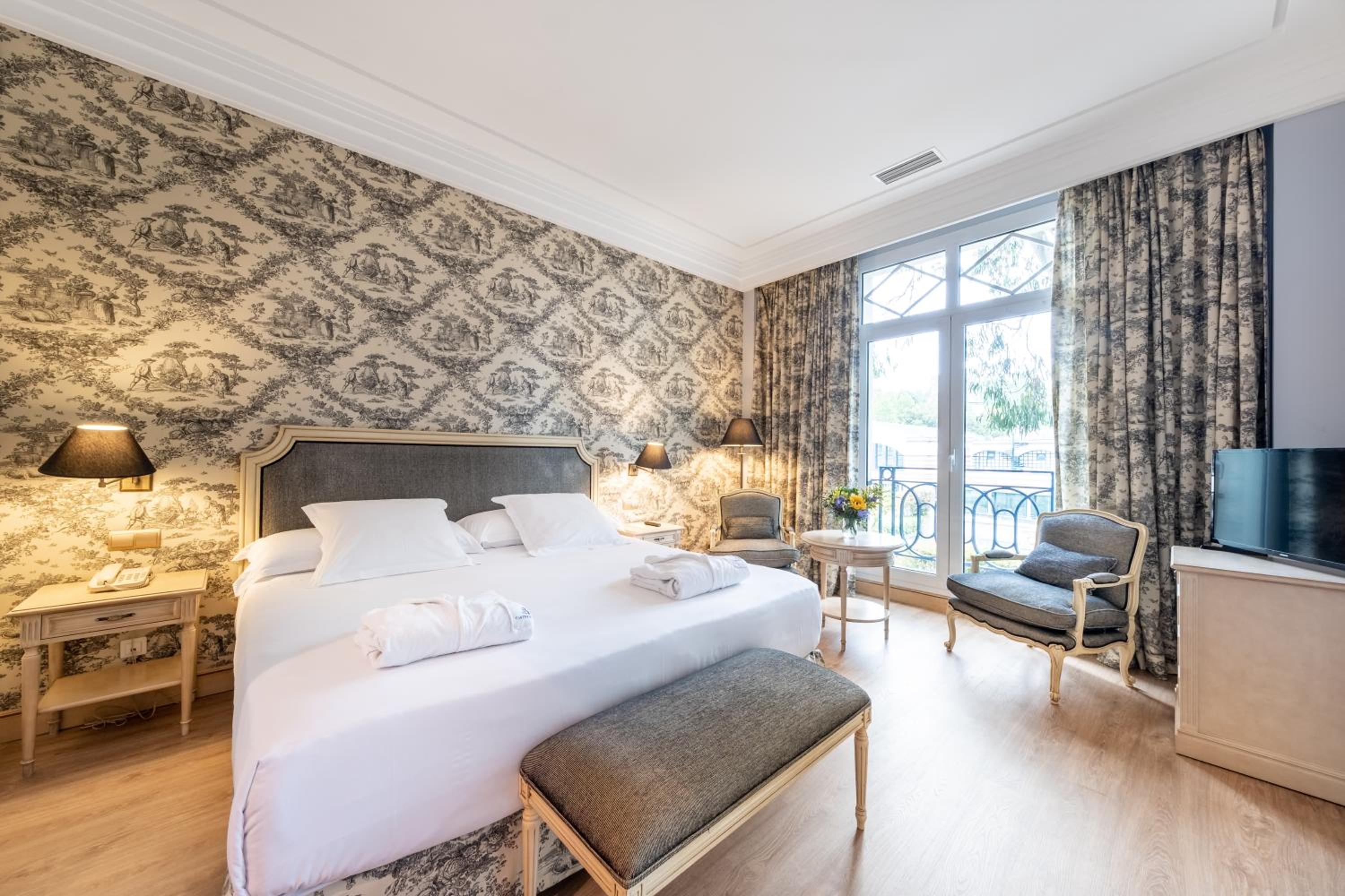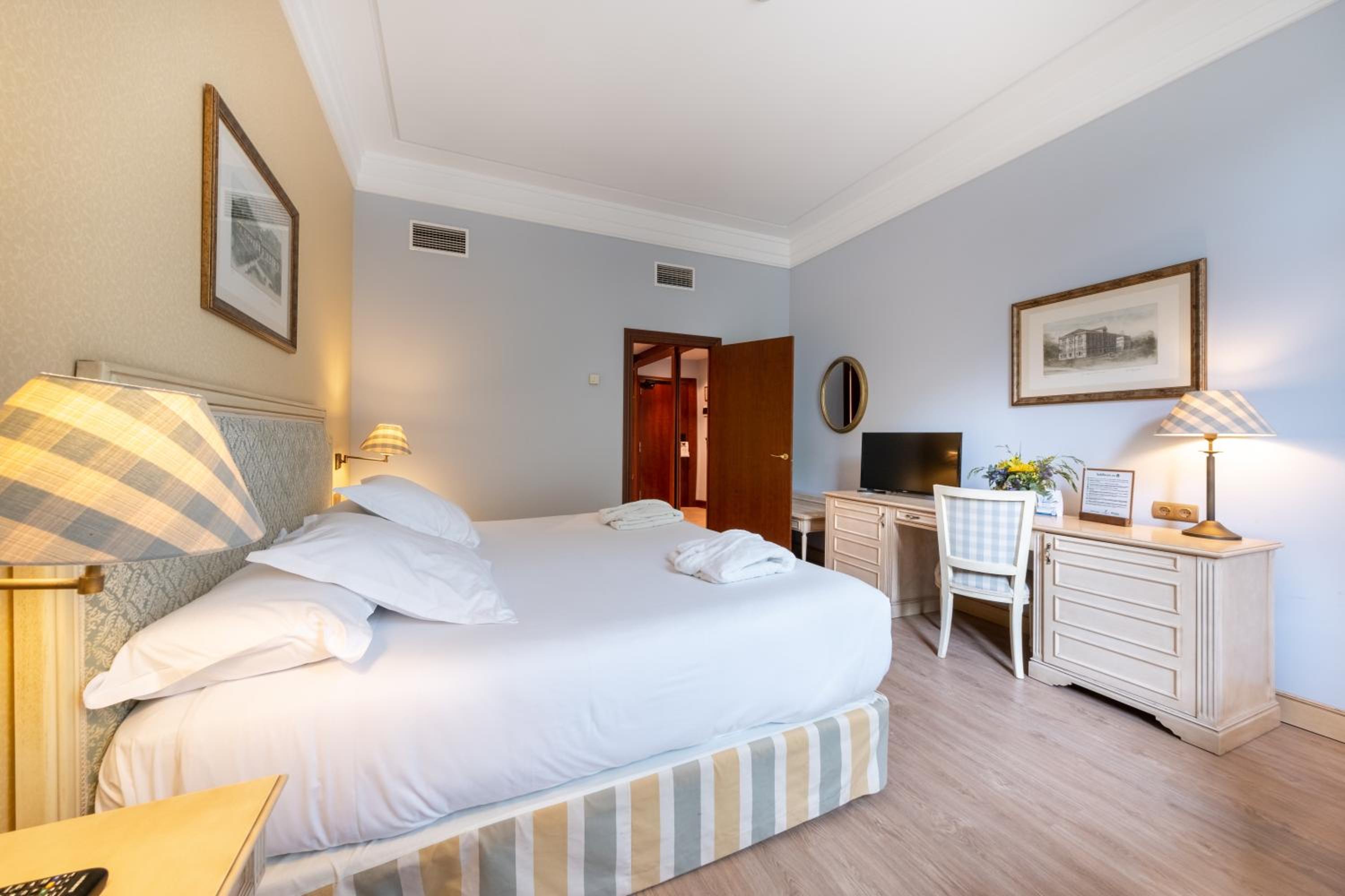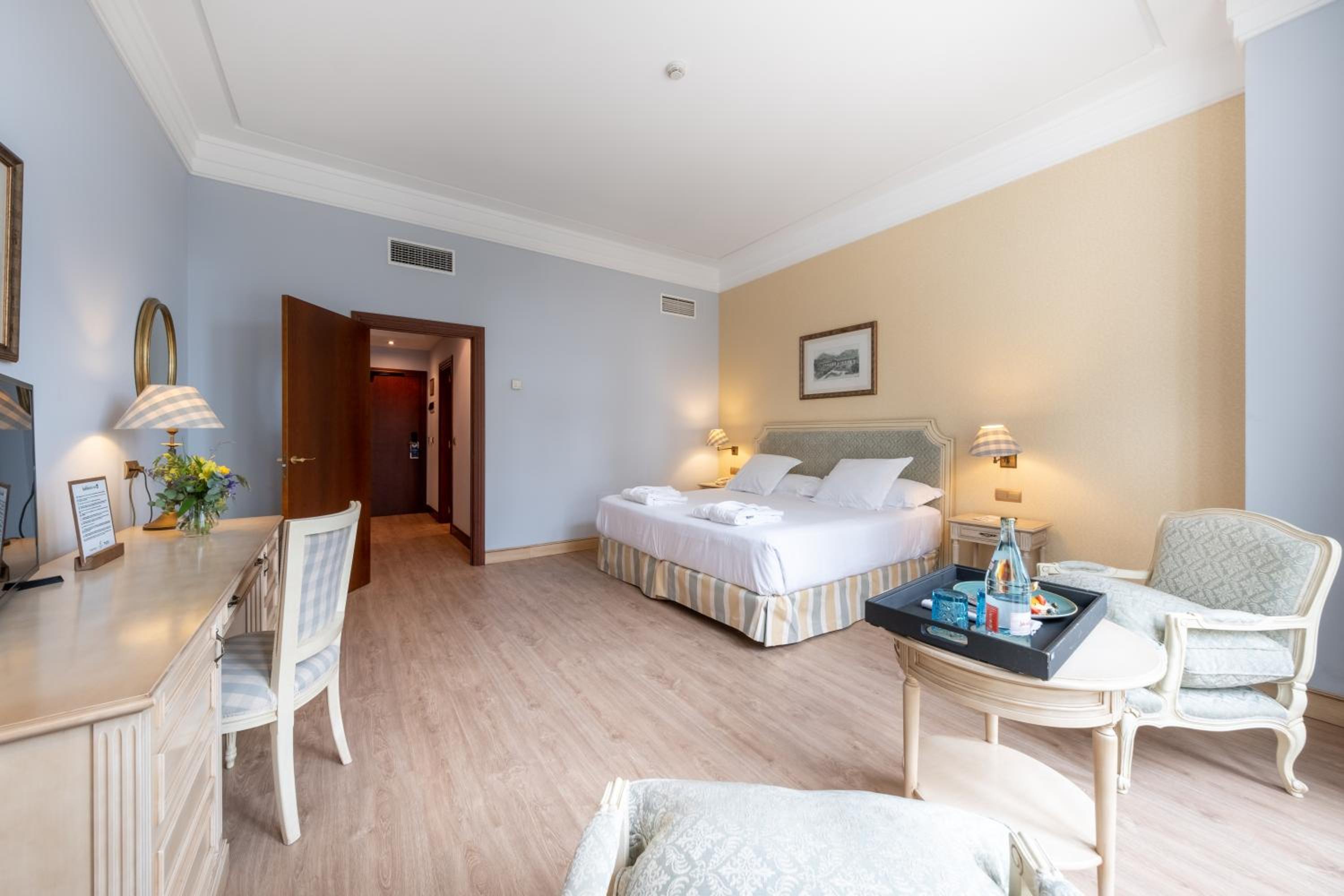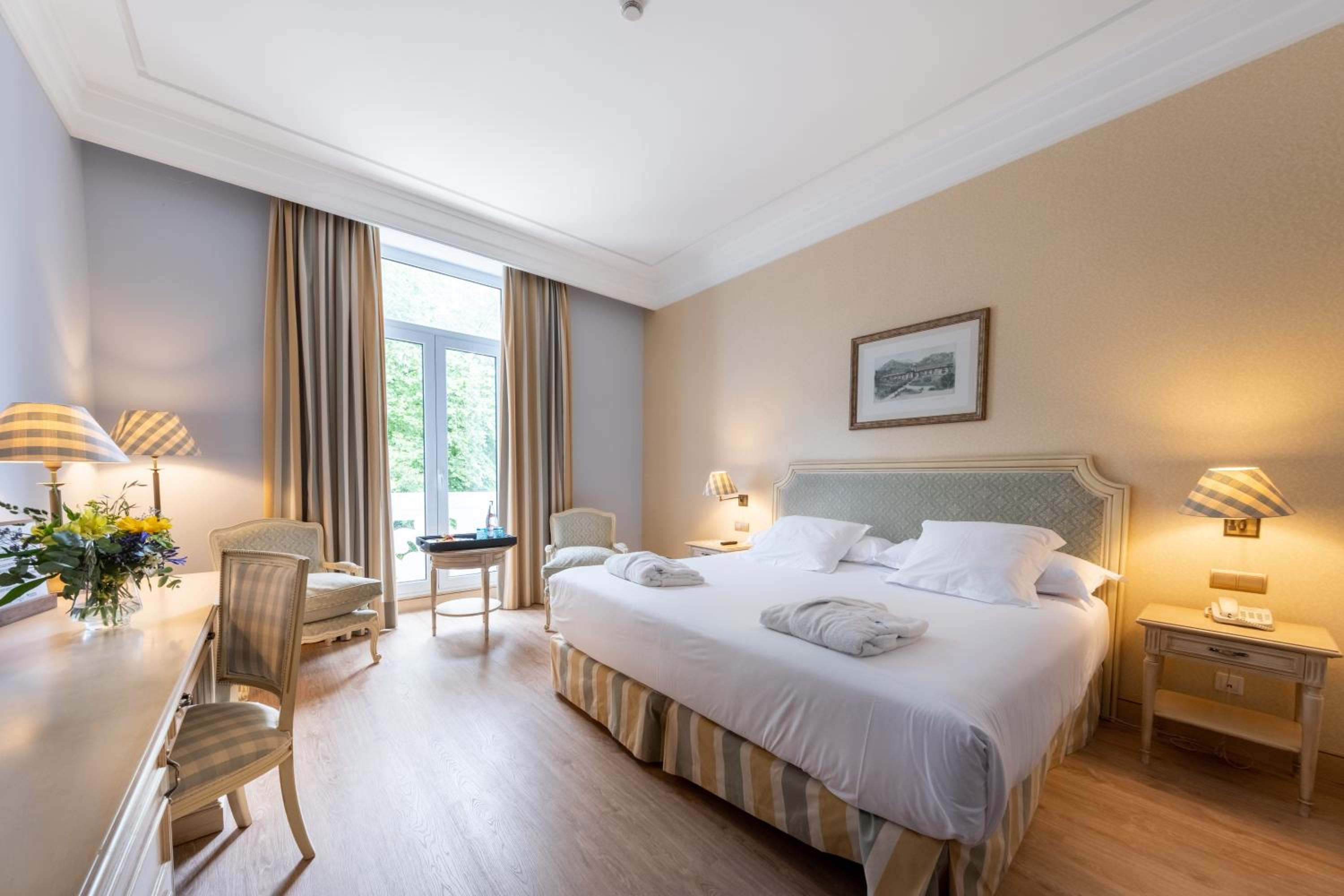 Comfortable and Modern Rooms: The rooms at Castilla Termal Balneario de Solares are designed for comfort and modern living, with natural light and views of the park or garden, equipped with air conditioning, a minibar, and a TV.