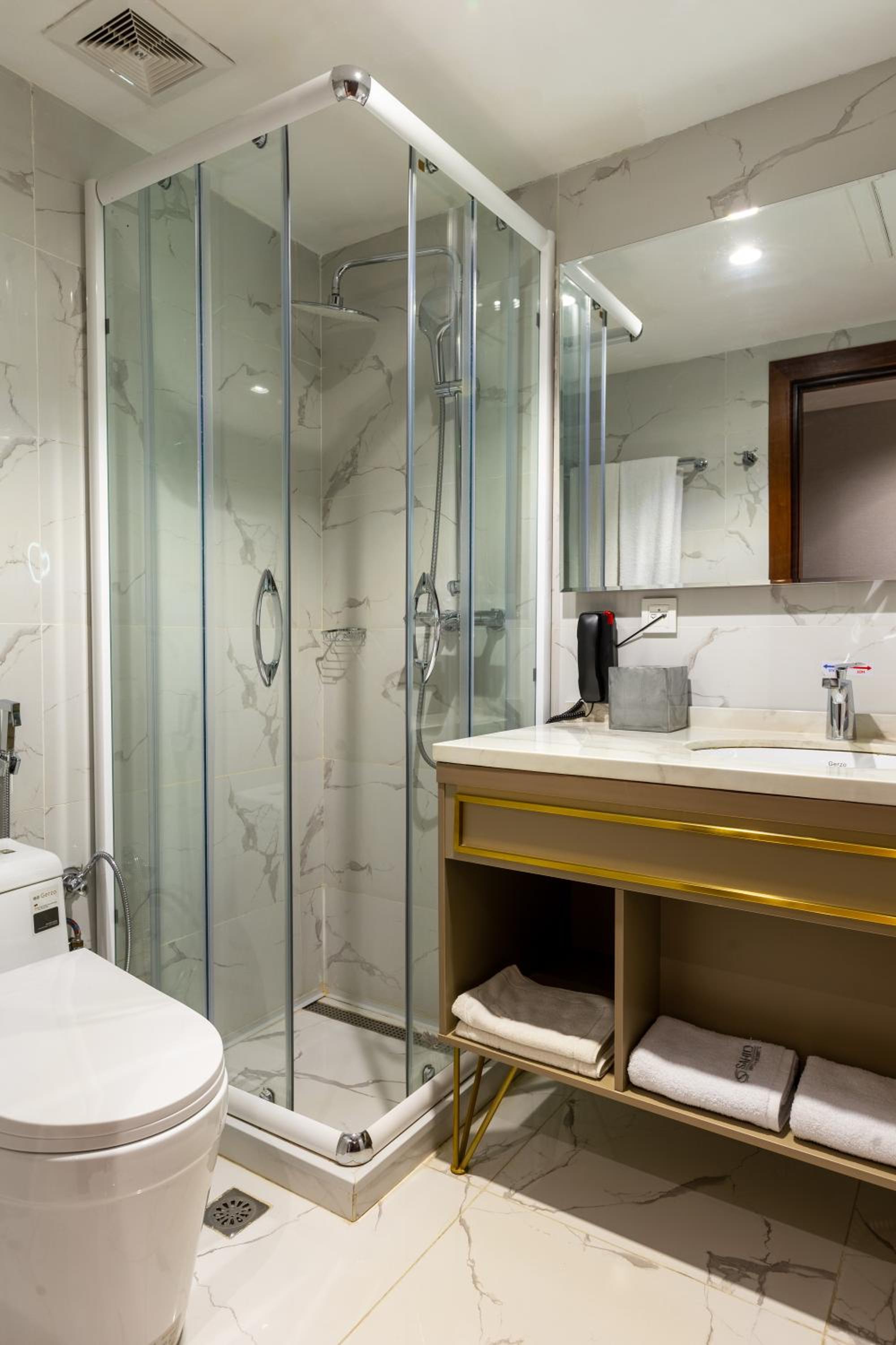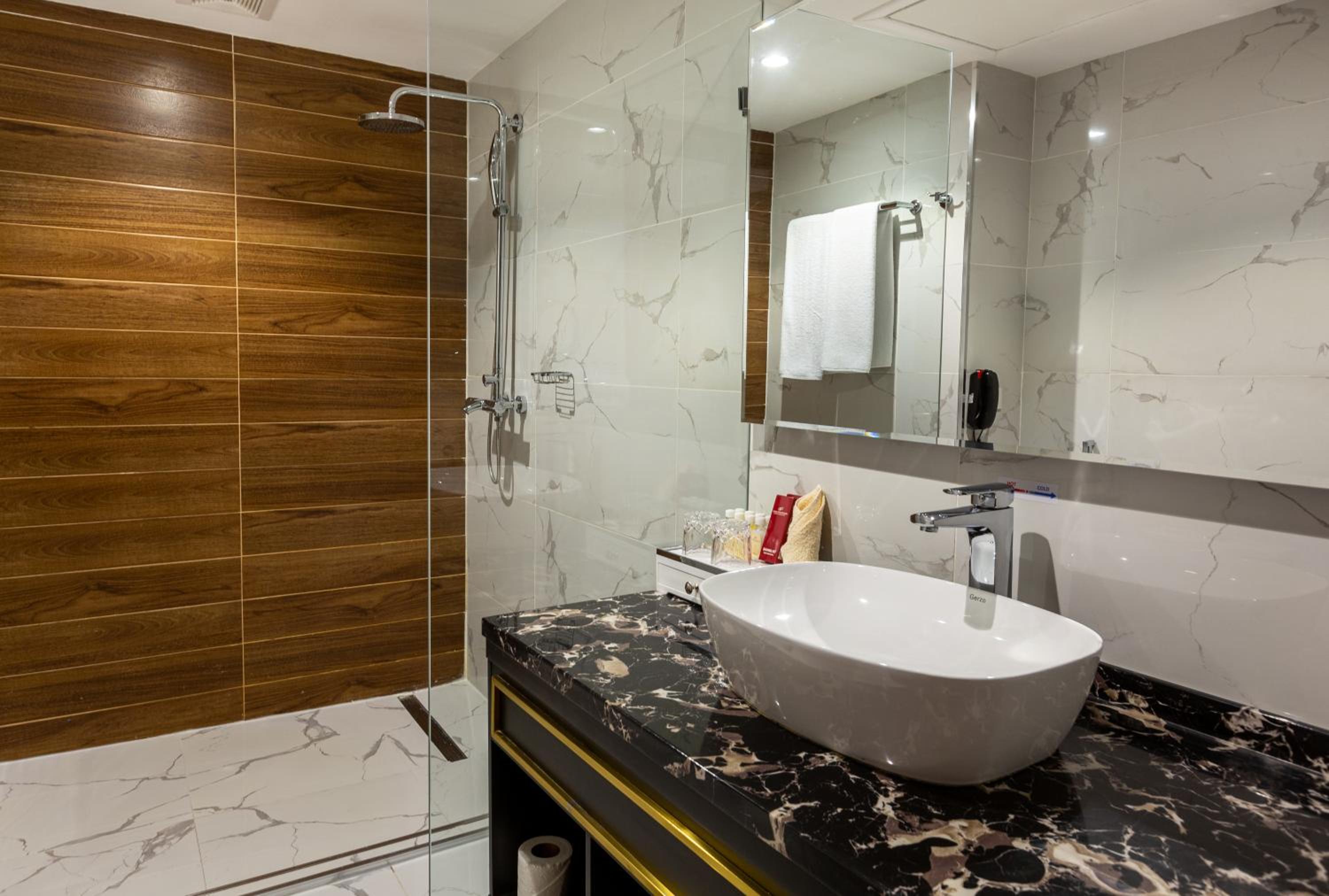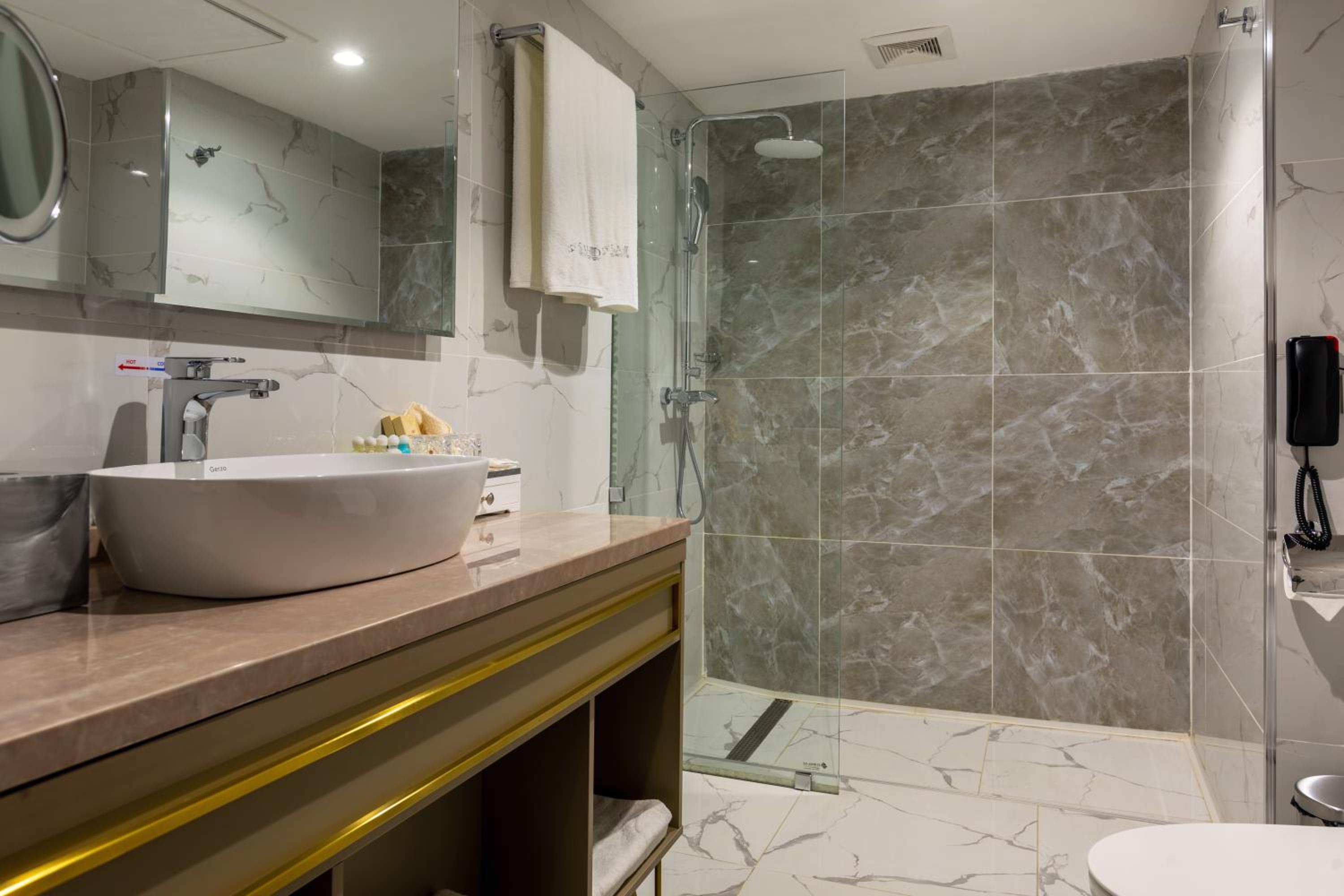 Не работал выключатель в душе, нельзя нормально выключить душ и почти нельзя настроить температуру воды. Плохо работал унитаз невозможно нажать на слив. Не работали полотенце сушители в душевой холодно. Раковины установлены на столешницы под встройку, и они очень высокие и не удобные. В номере стоят стремные аксесуары, стремная лампа под кожу на столе часы которыми нельзя пользоваться так как при отключении света они сбивают время и их надо перенастраивать. Сейфы не зафиксированы на шкаф, в чем их смысл при весе в 3 кг неясно. Между номерапи в типа сьюте неверно установлены замки и получилось что дети могут нашу спальню закрыть на две двери с замком.