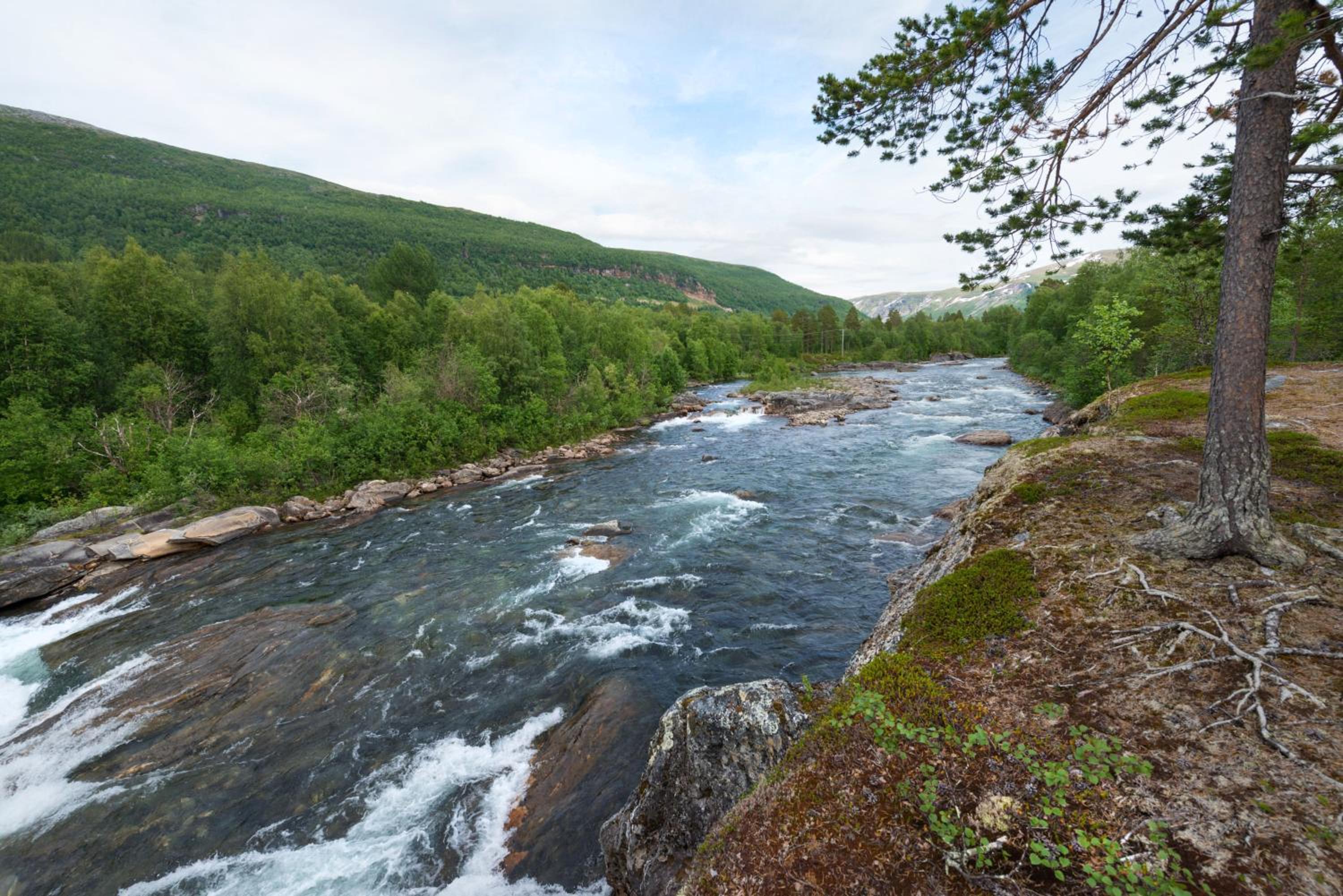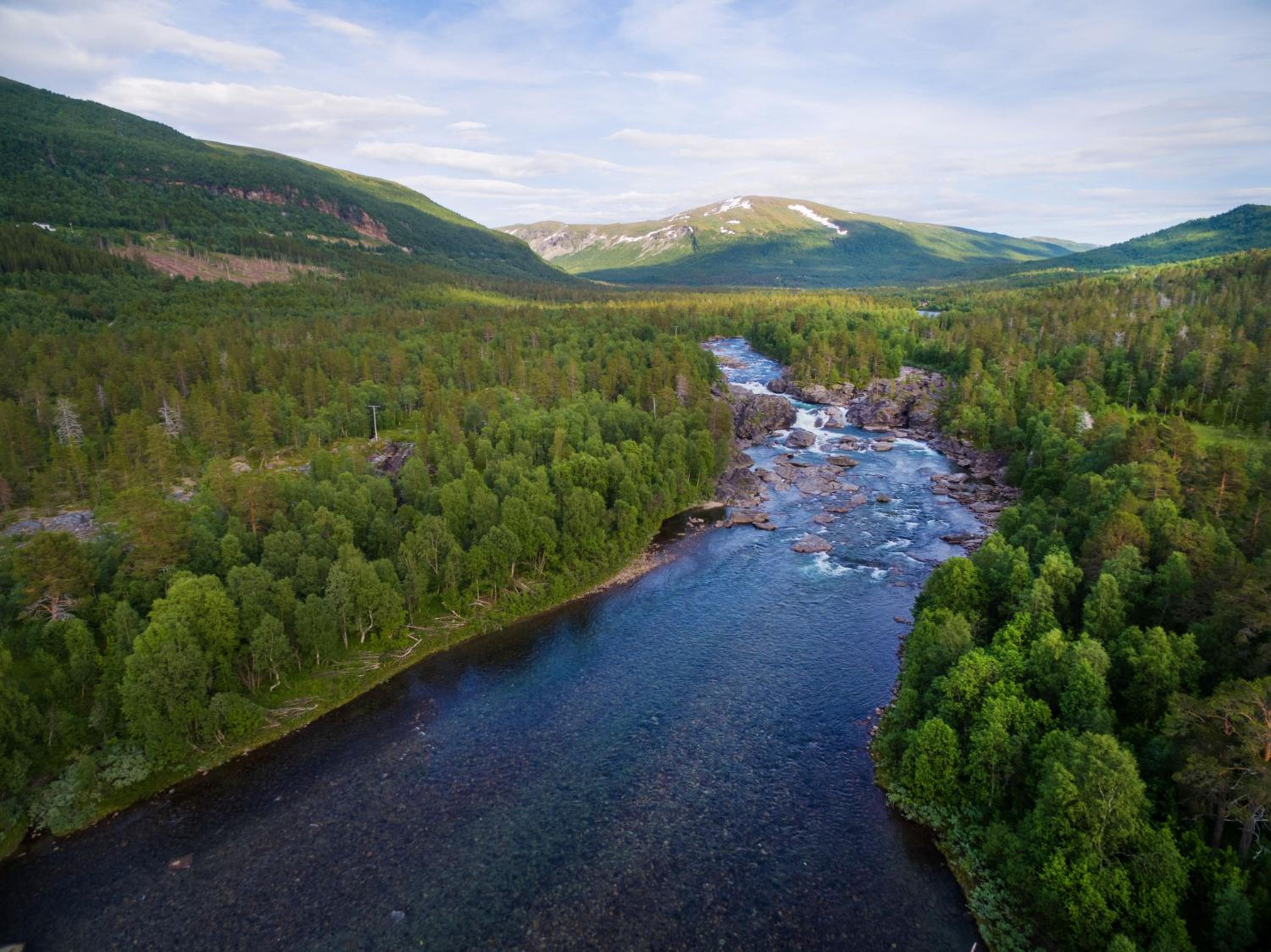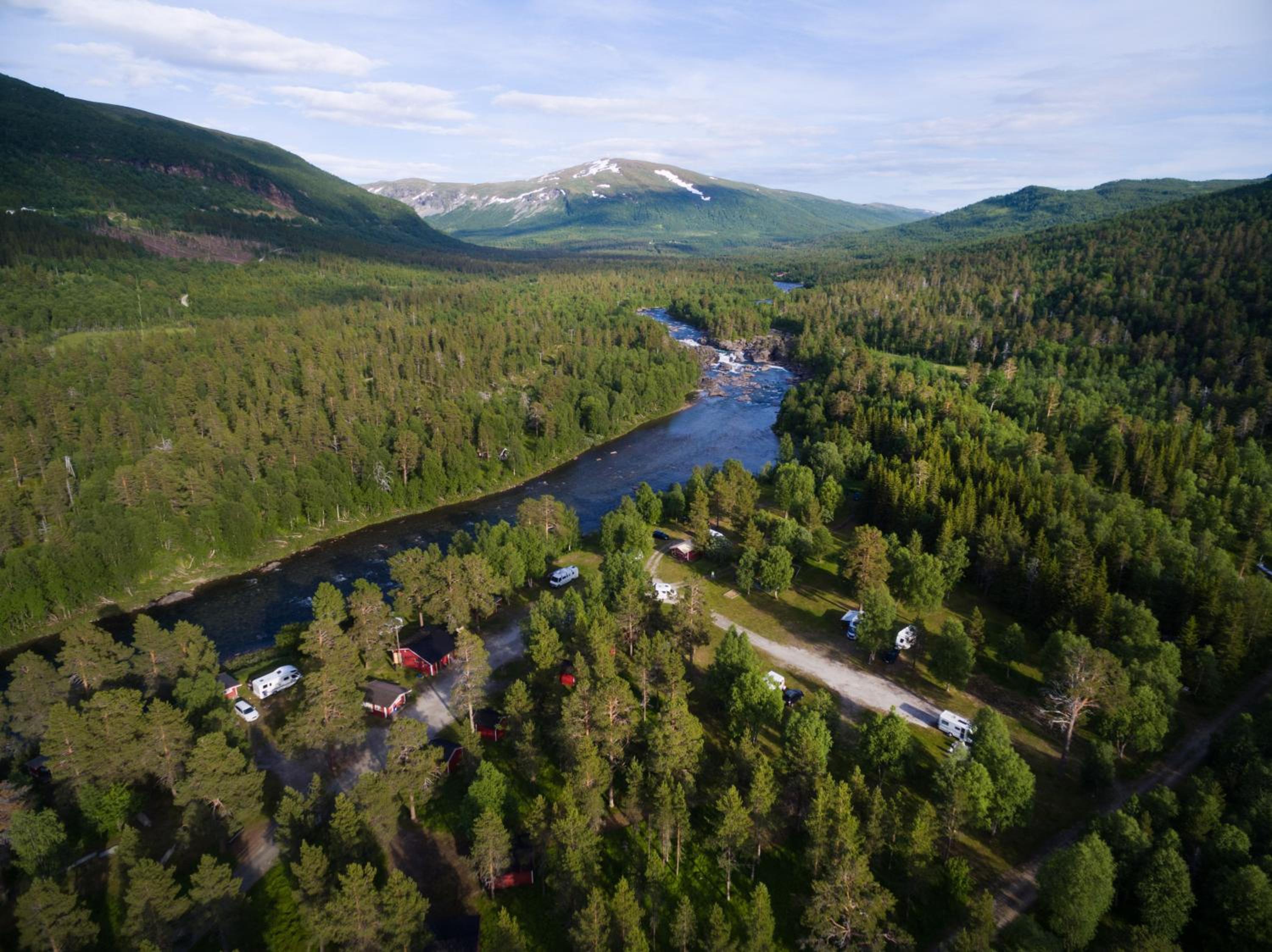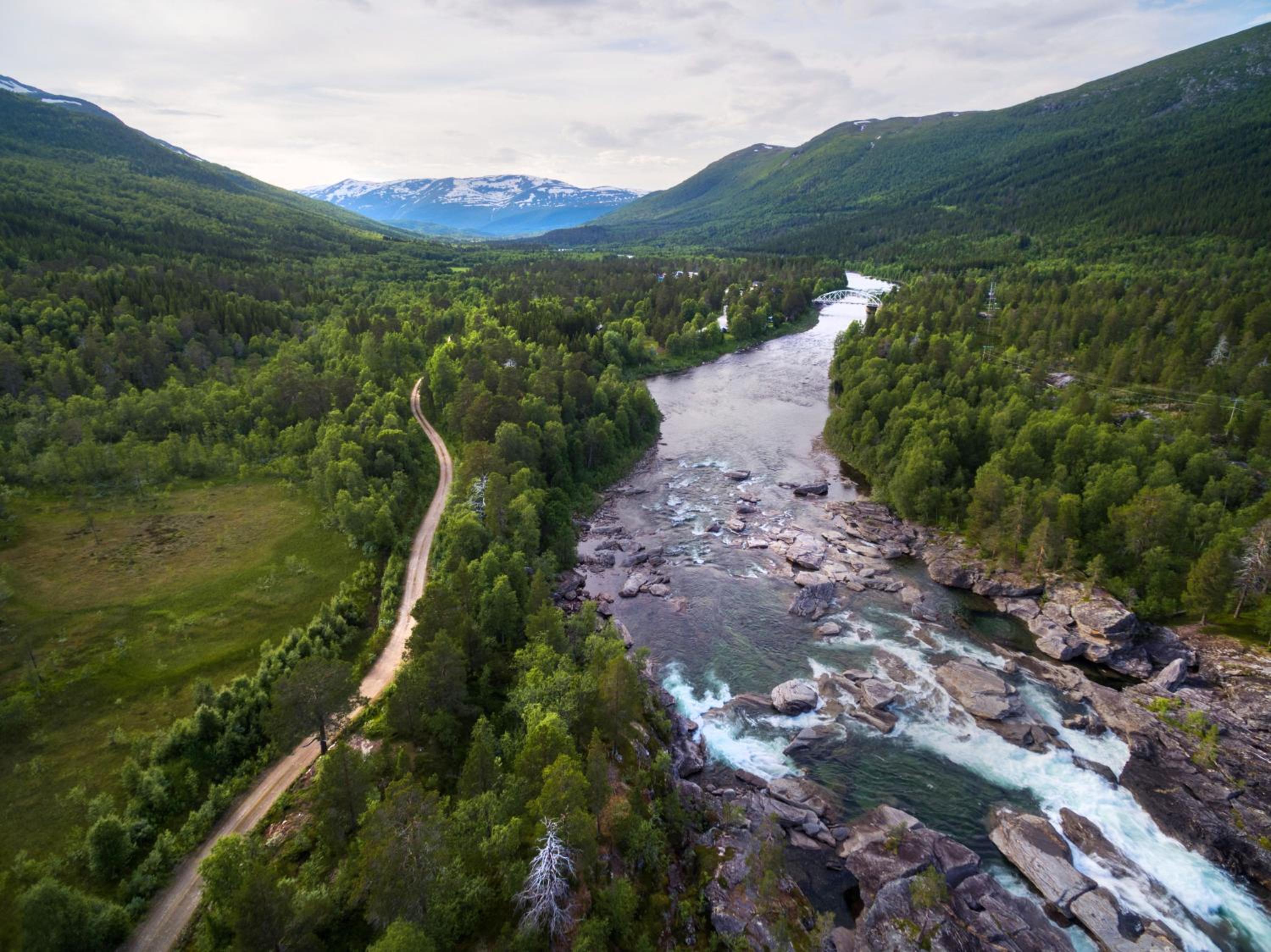 Ett ljuvligt litet fjällhotell med promenadstråk utmed en underbar fors.