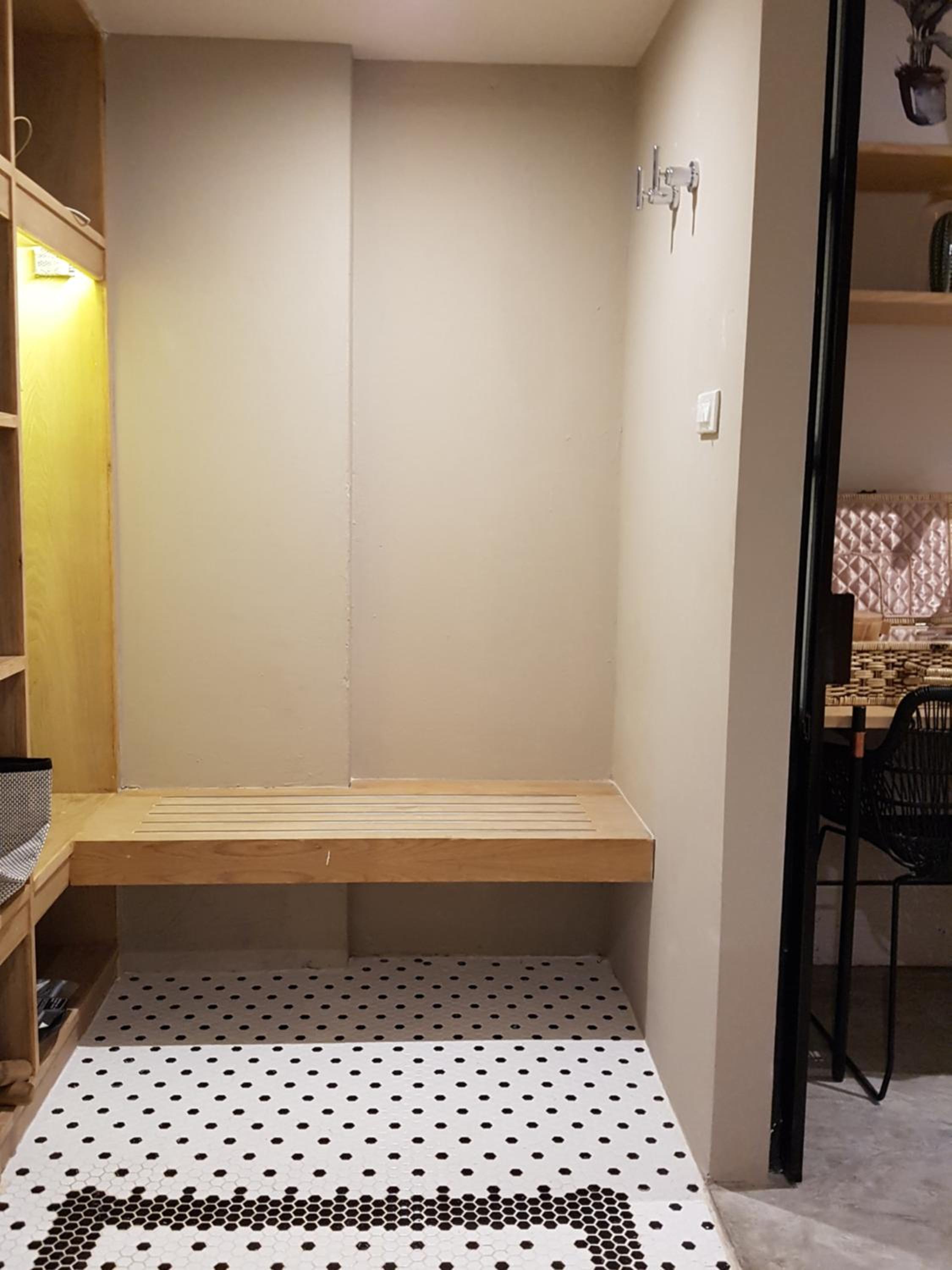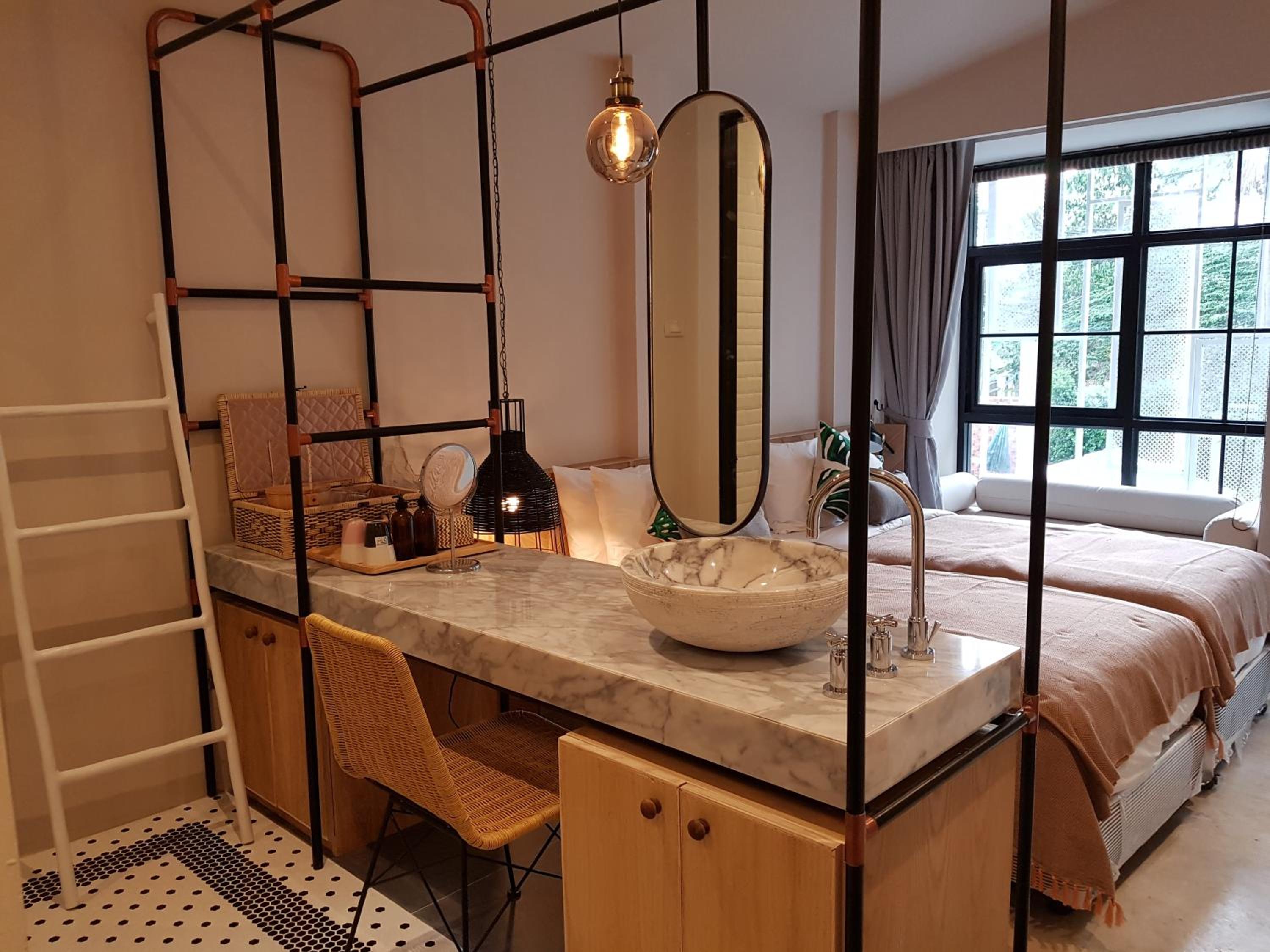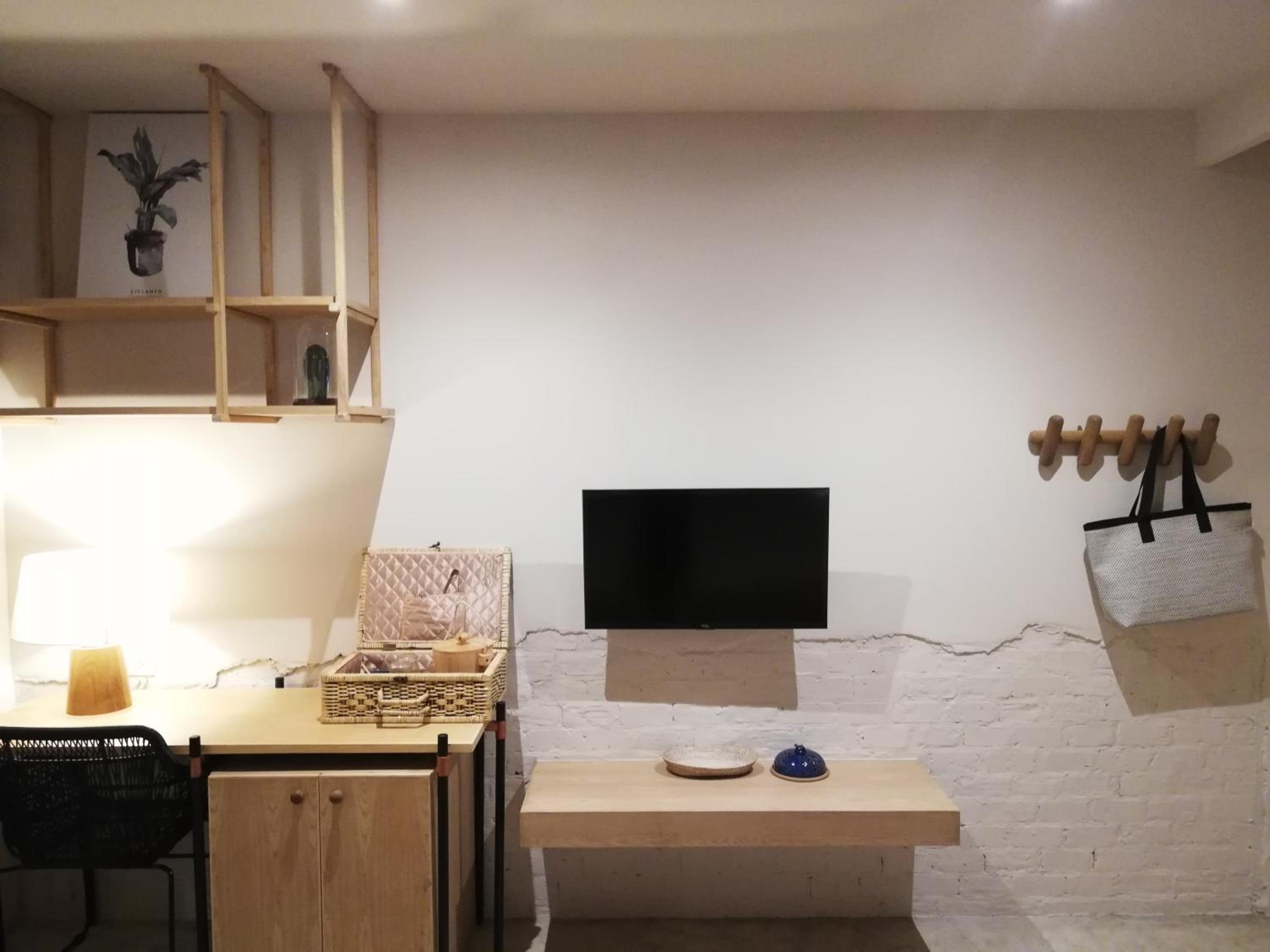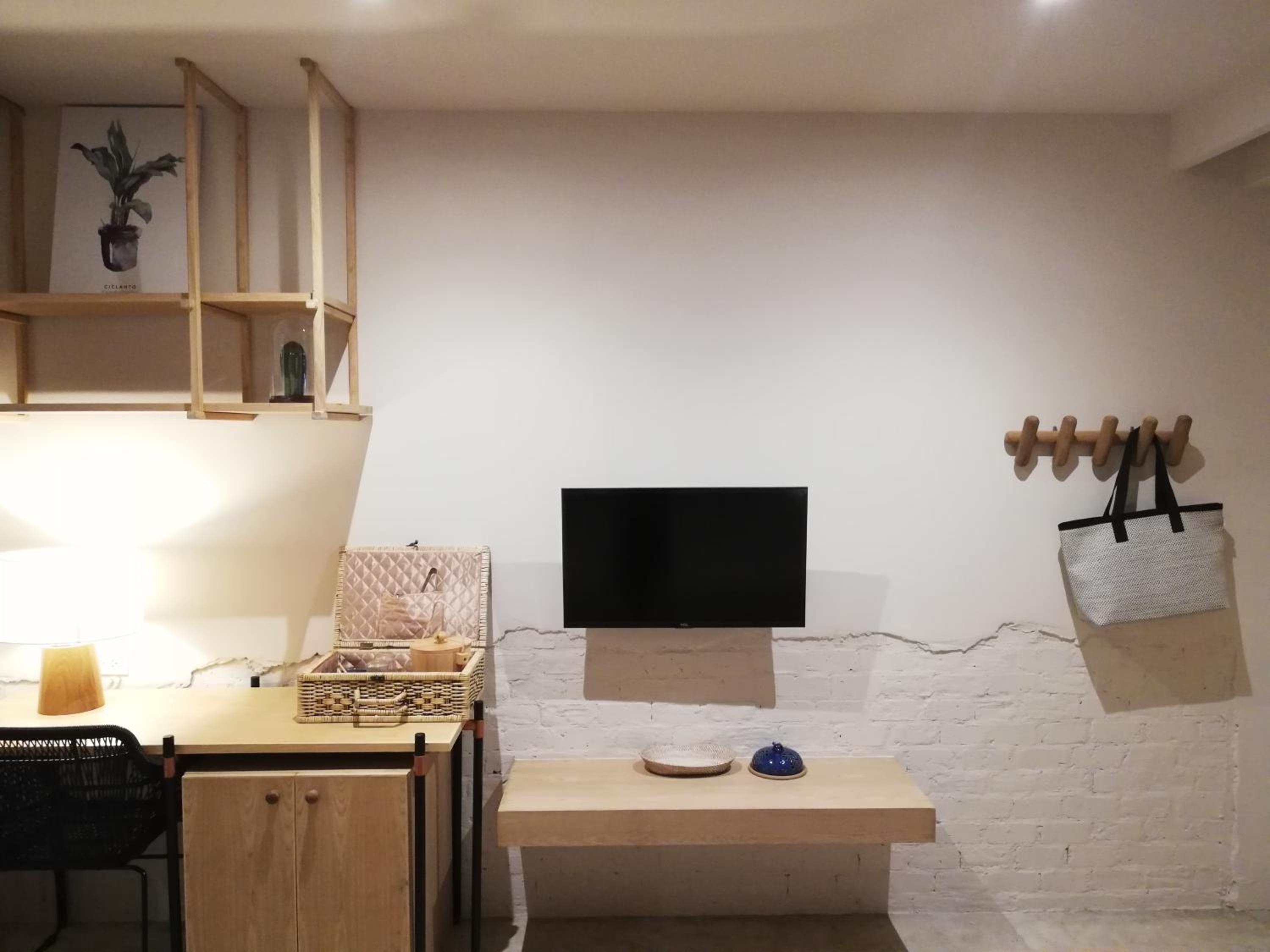 這裡沒有電梯,有重物的話,上樓會比較不方便。房間整體配置比較侷促,看起來是蠻精緻的,但因為格局比較小,如果住多天以上,收納空間會不太夠。