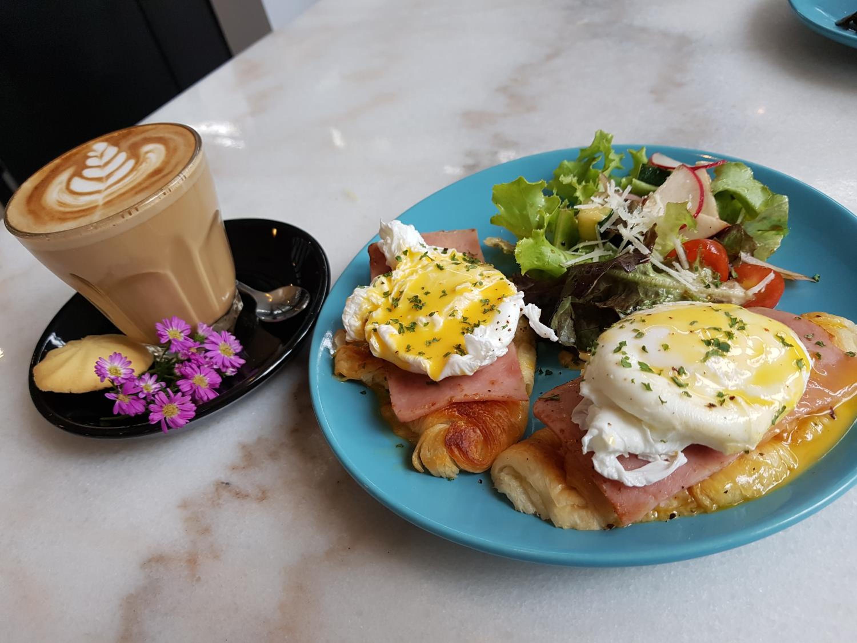 早餐擺盤挺好看的,提供的拿鐵也很用心,但早餐選擇並不多。住宿位置附近有些小攤販,要買水跟小吃都算方便。