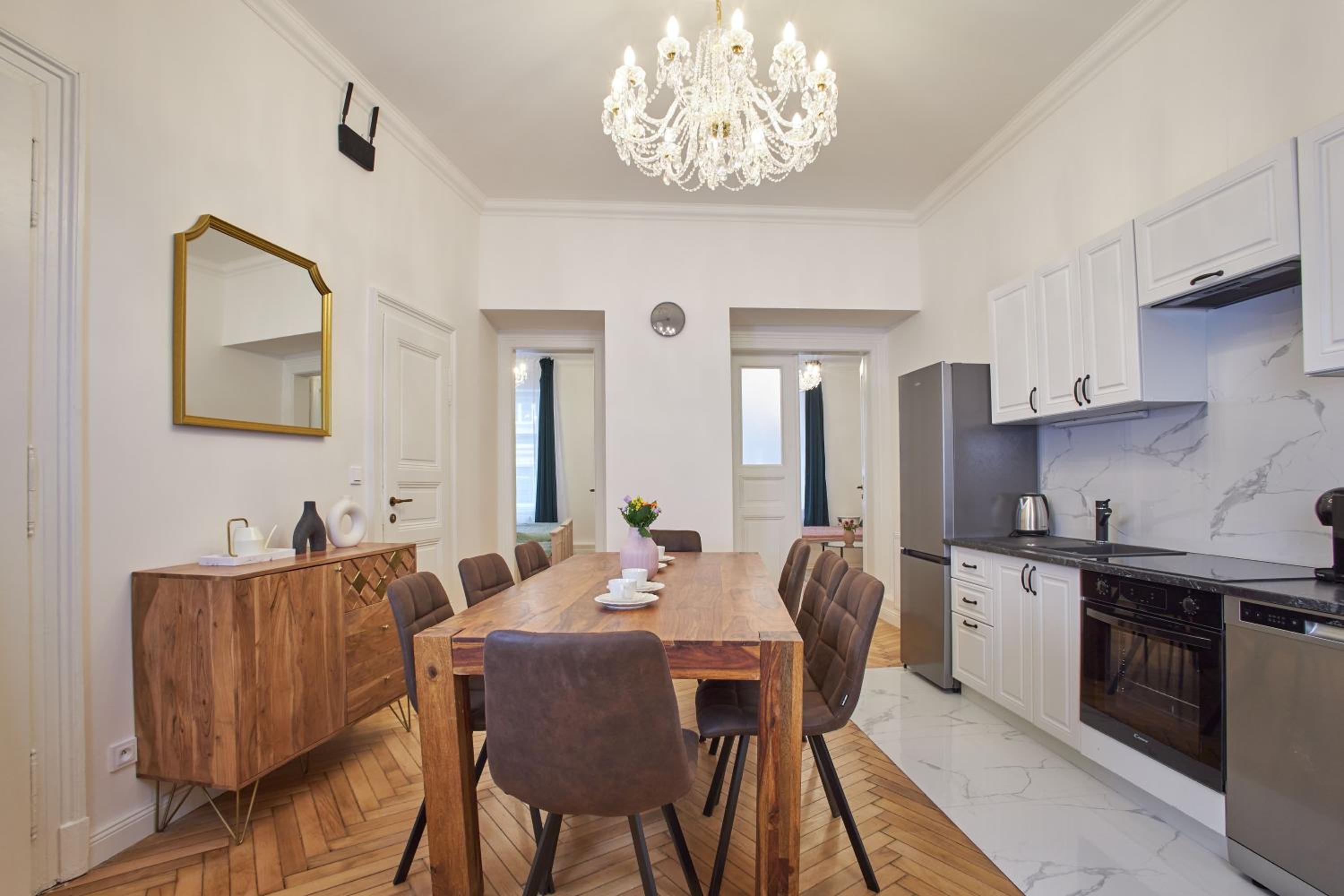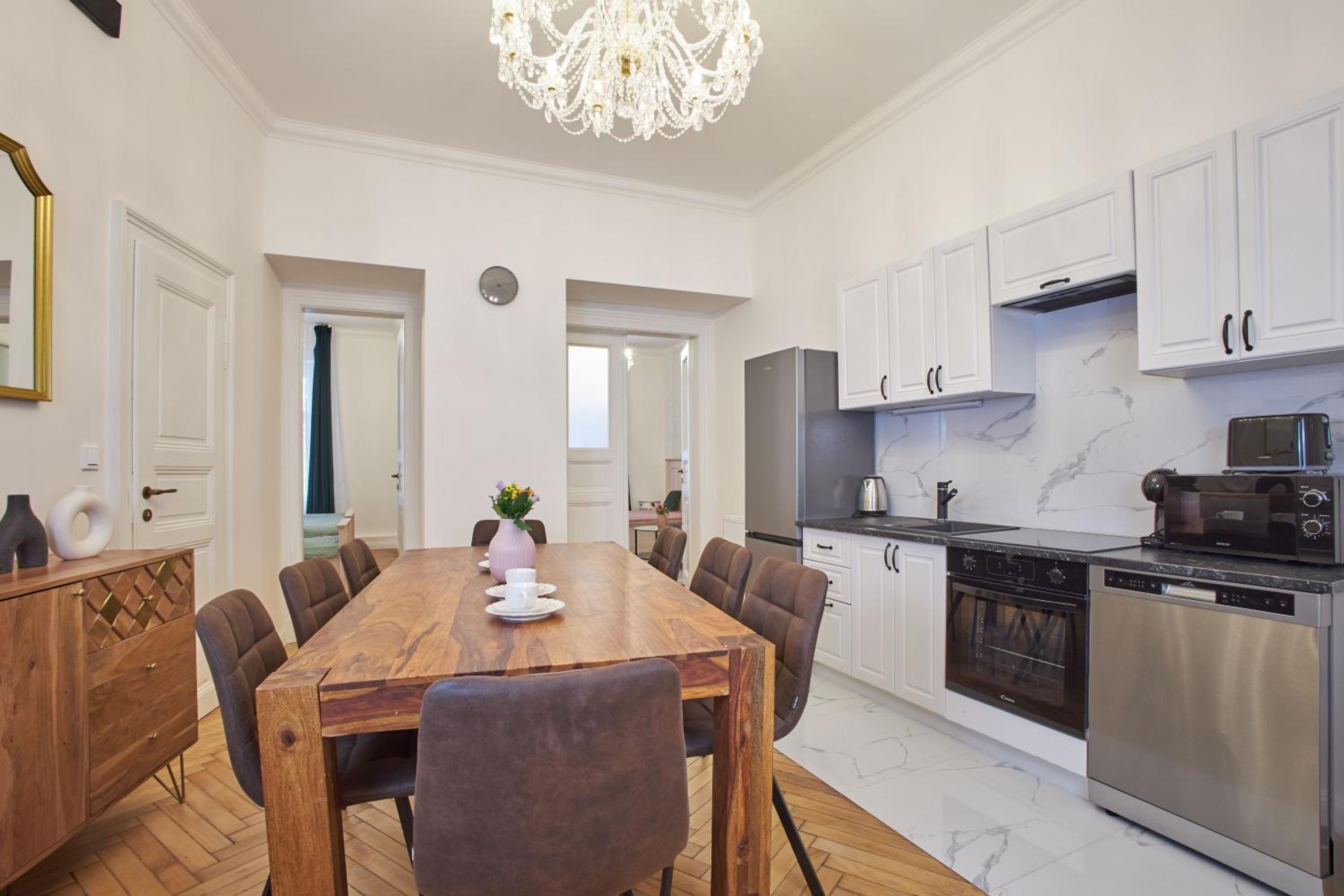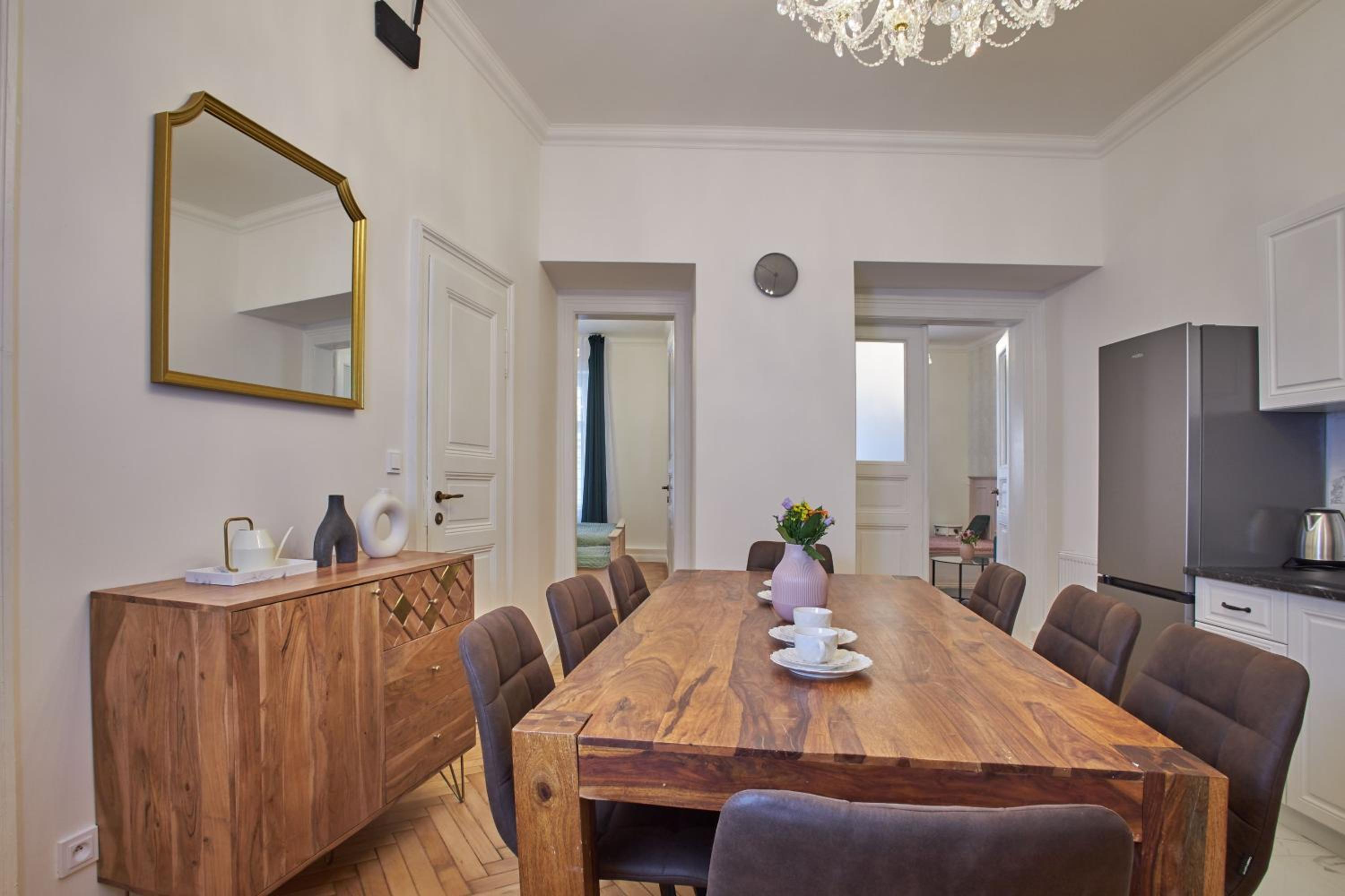 Просторные апартаменты с высокими потолками . Чисто и аккуратно . Большая кухня и холодильник . Имеется стиральная машинка . Удобное расположения для путешествия , в пешей доступности до кафе и достопримечательностей. 100% рекомендую для большой компании .