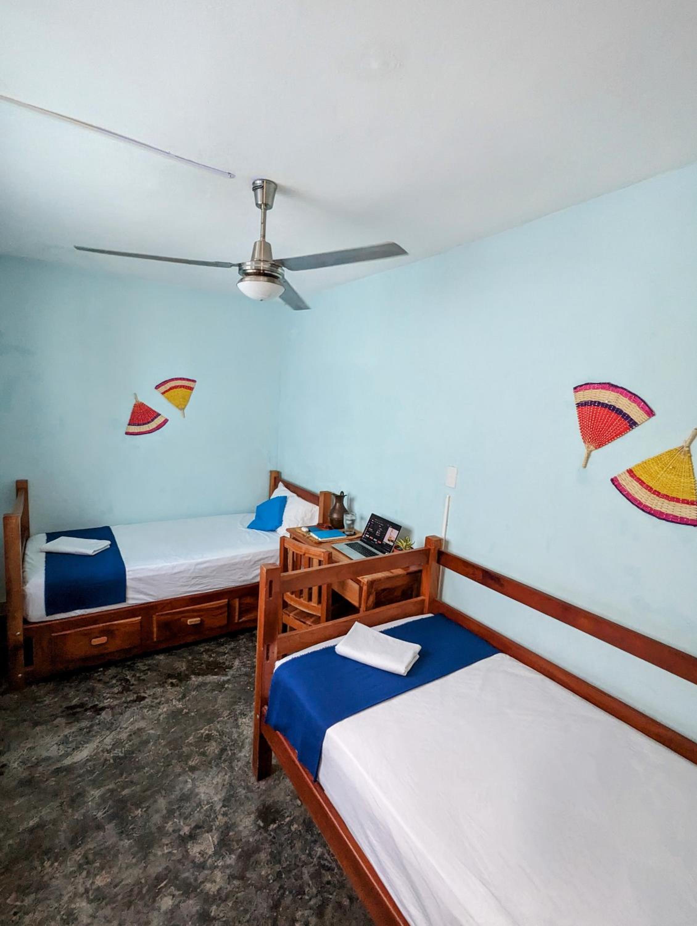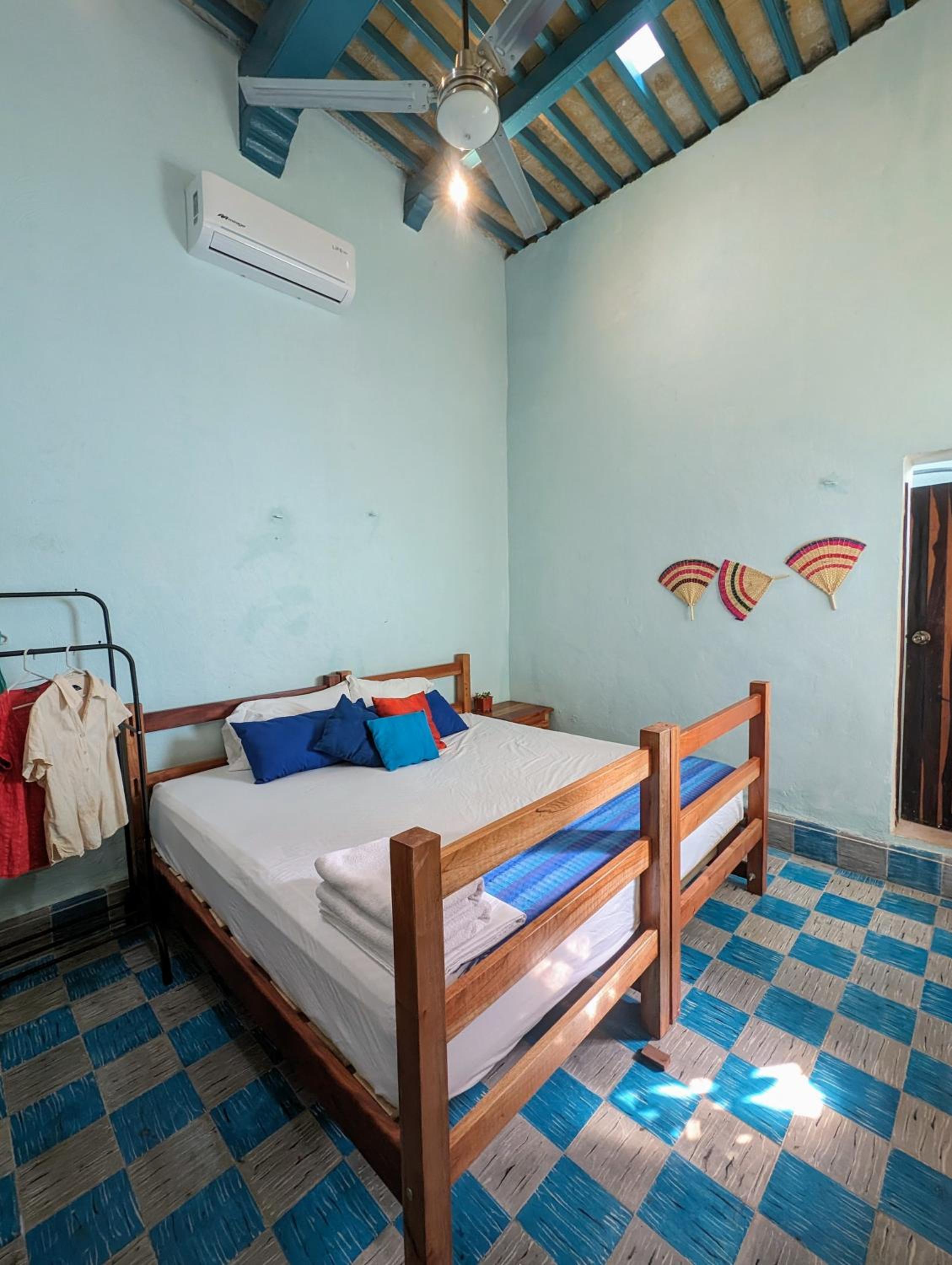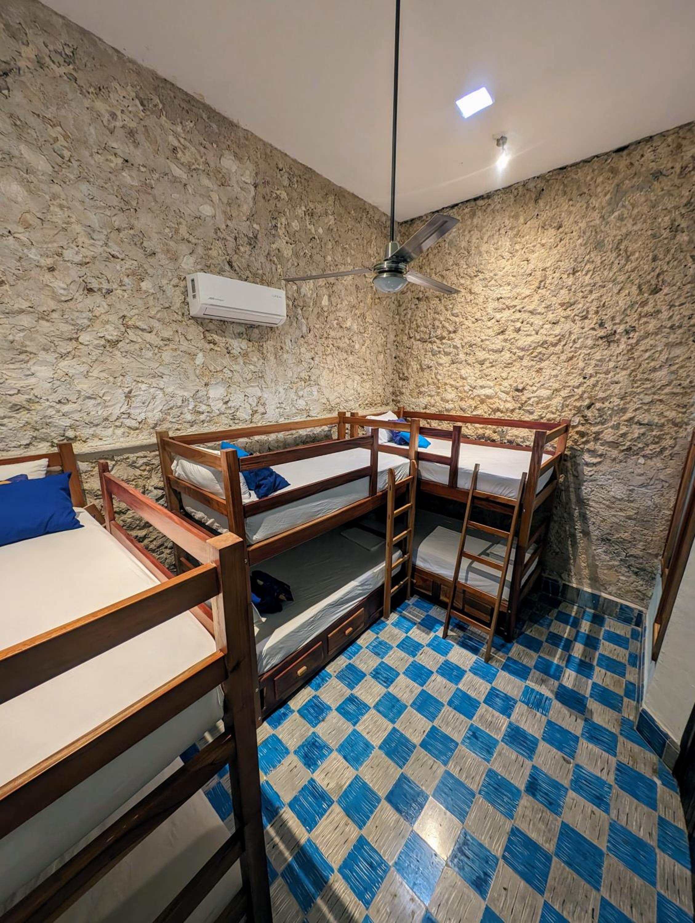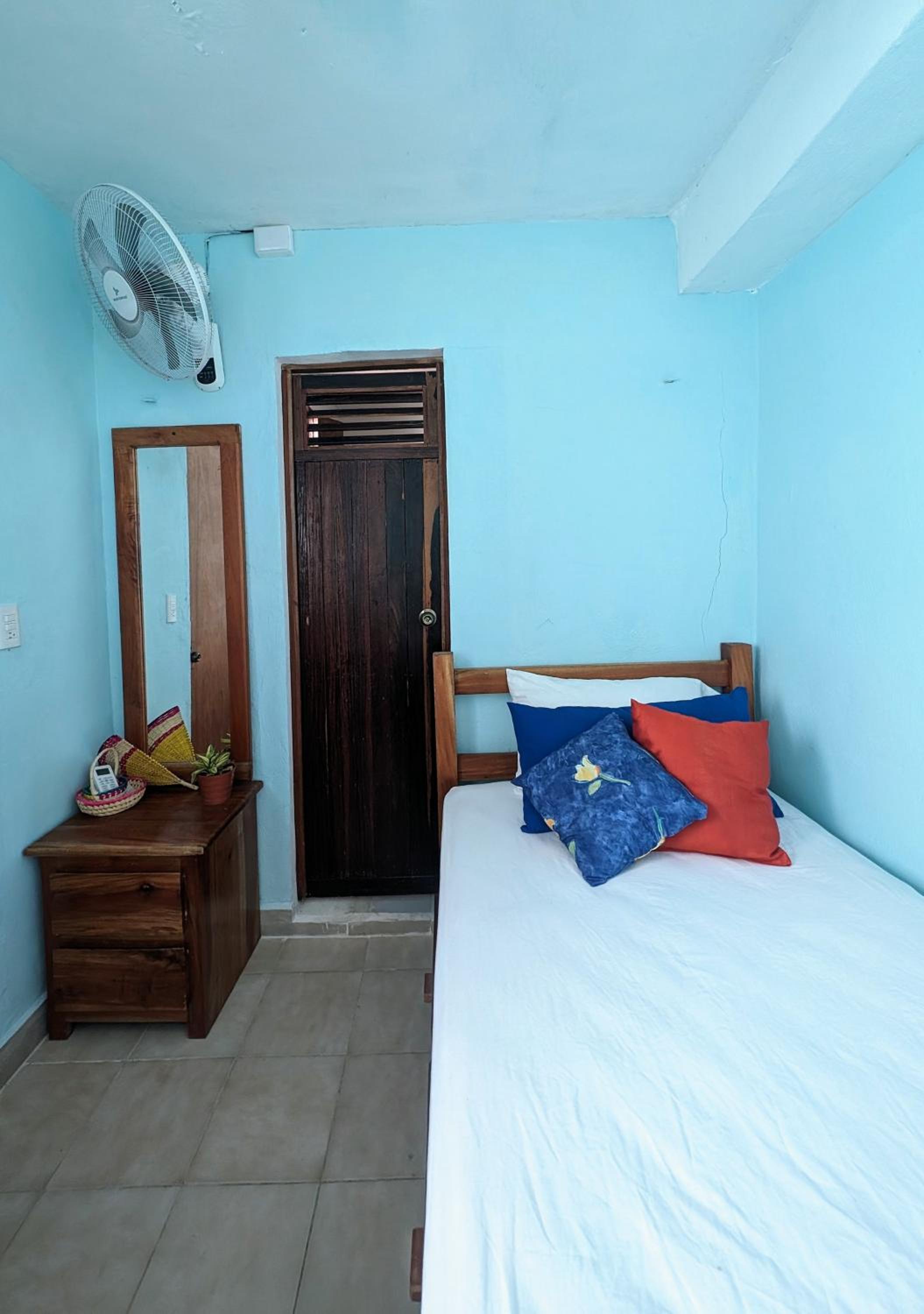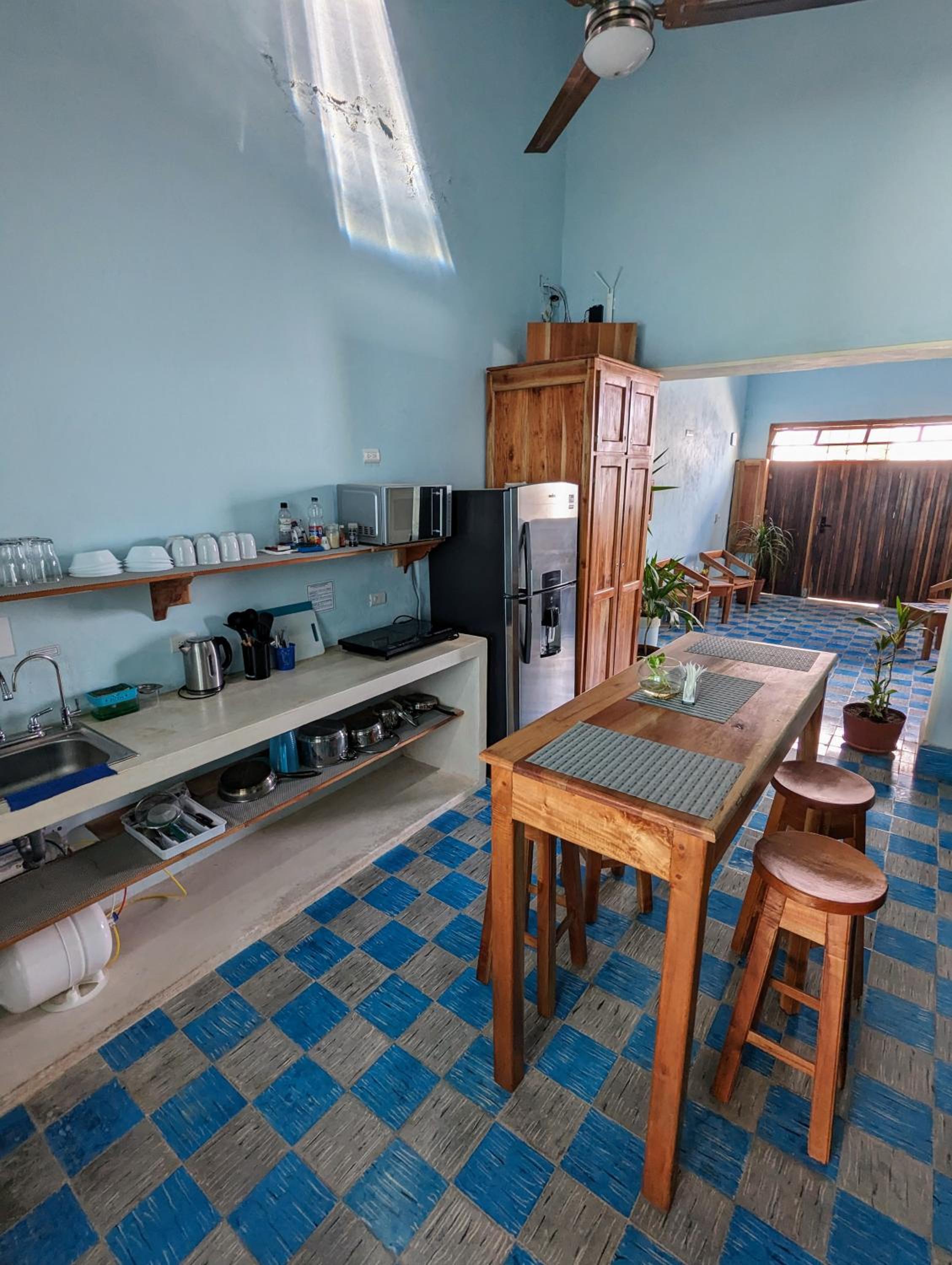 Nice location but several blocks from the main plaza. Warm atmosphere with people coming and going. Clean place with a shared kitchen and eating area. Nice pillows, sheets and a big fluffy towel. Only 2.5 blocks from a convenience store. I liked the ceiling fan as well as the air conditioner.