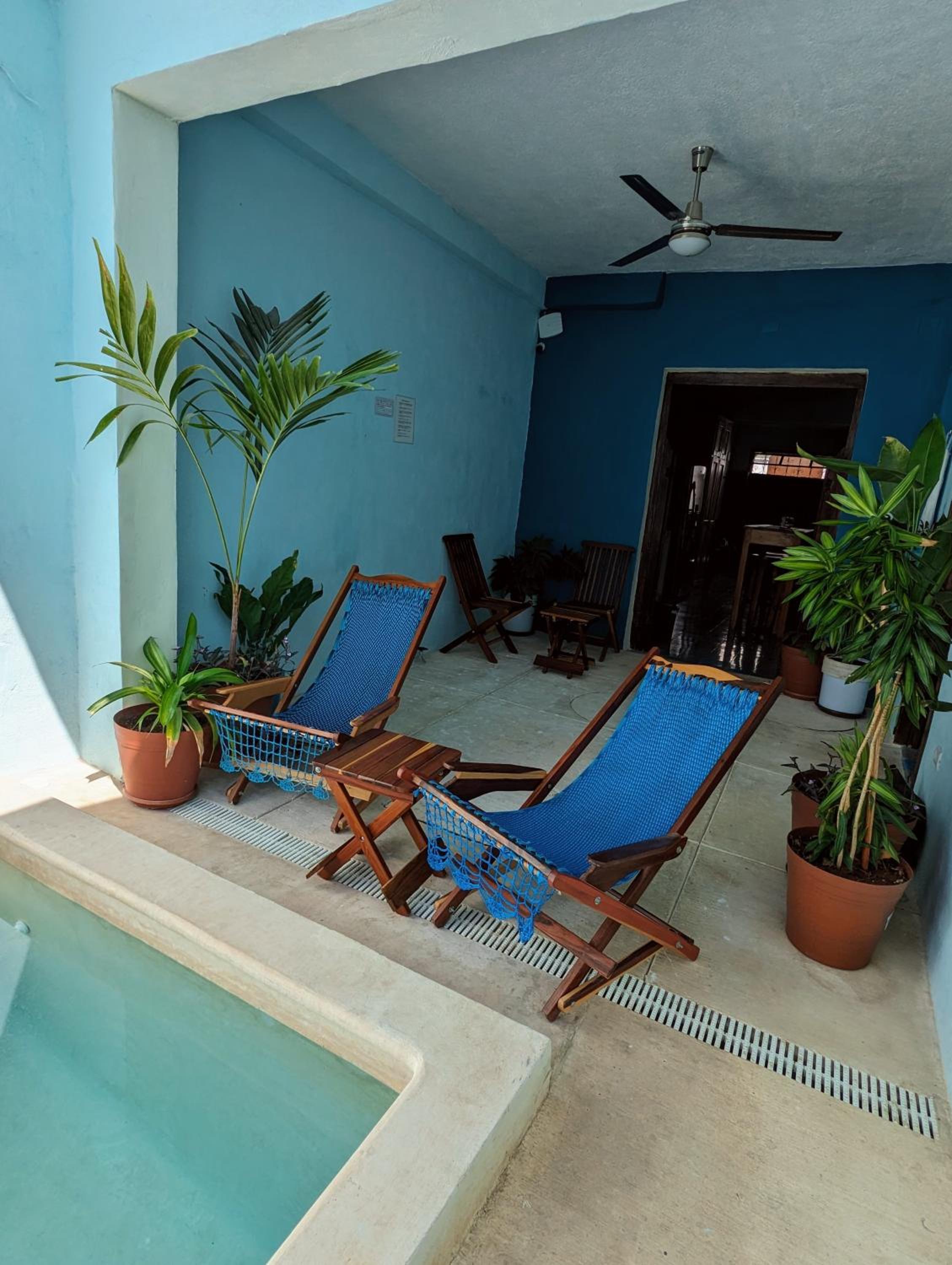 Enjoy a refreshing dip in the outdoor swimming pool at Casa Aguazul, perfect for relaxing under the sun and unwinding after a day of exploring Campeche.