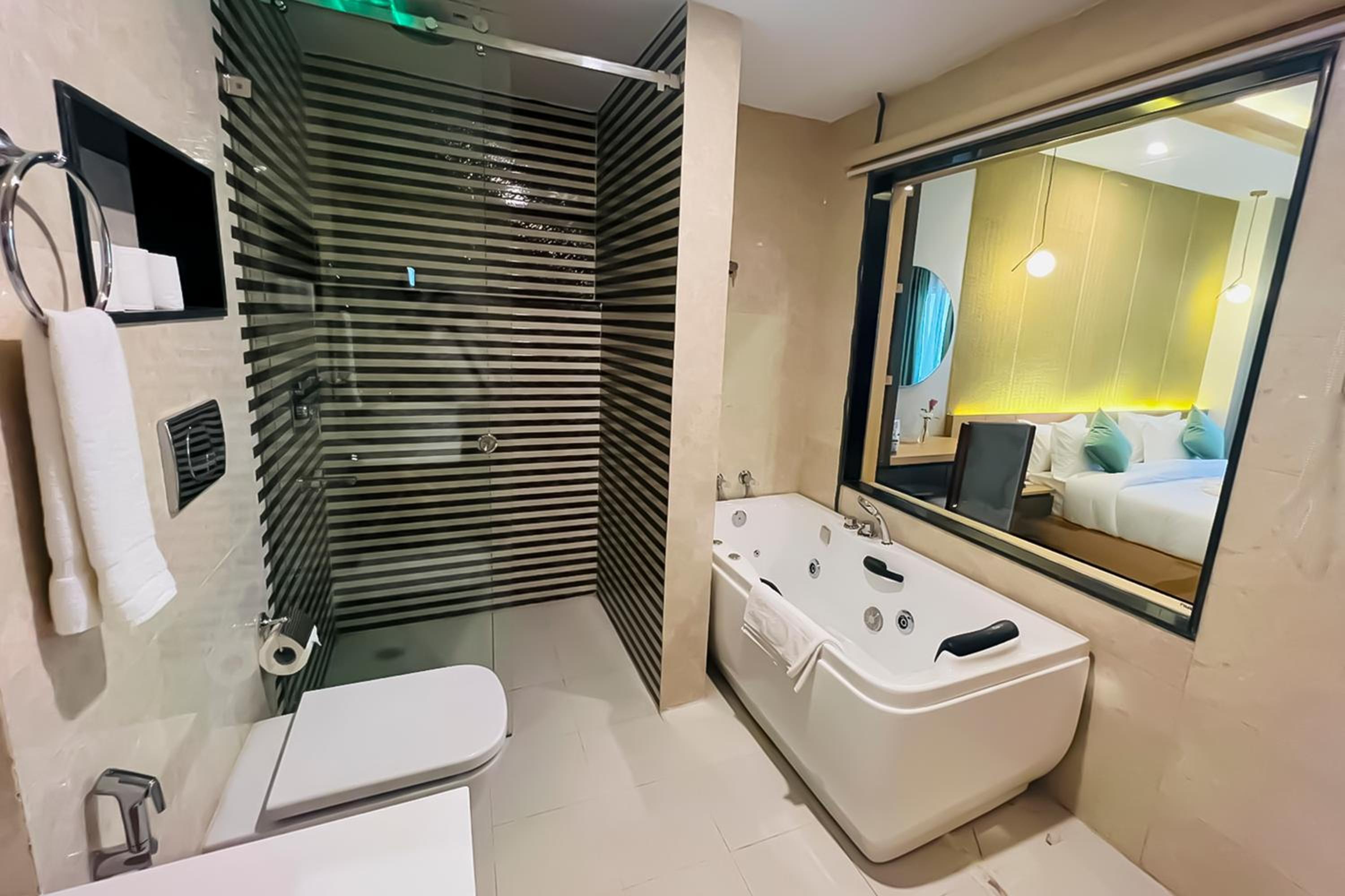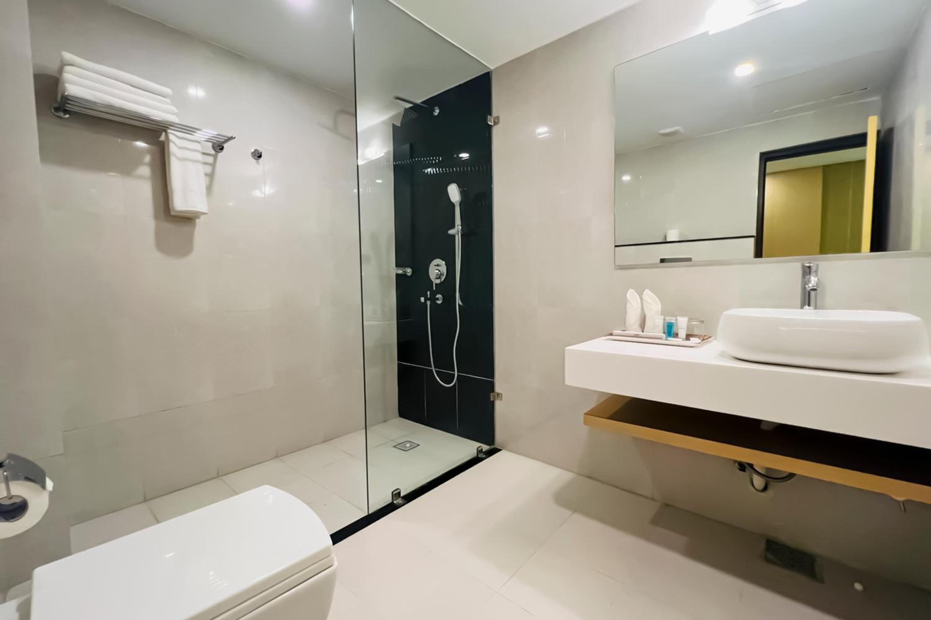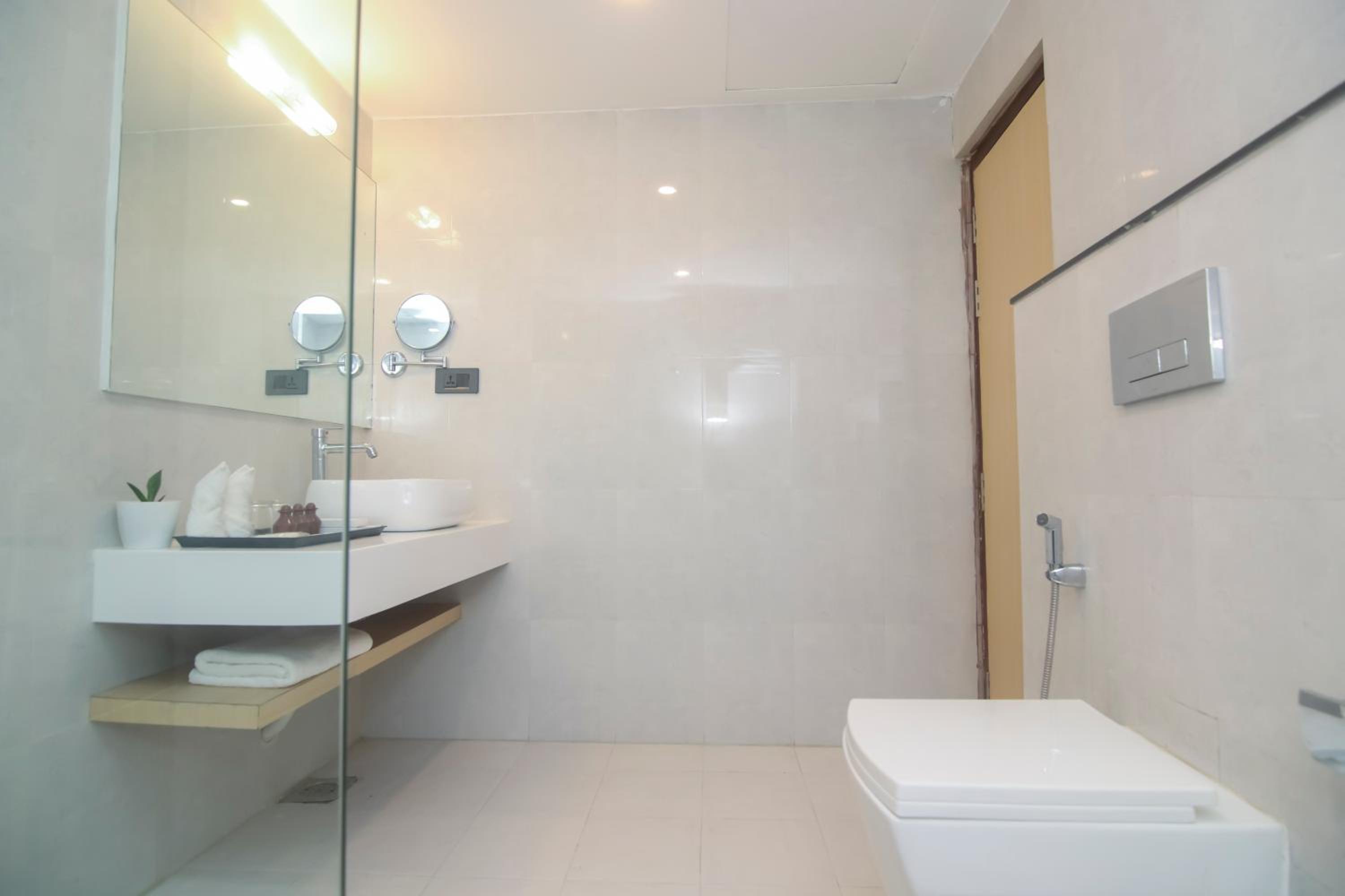 The bathroom should have a shower cubicle otherwise whole bathroom gets wet.