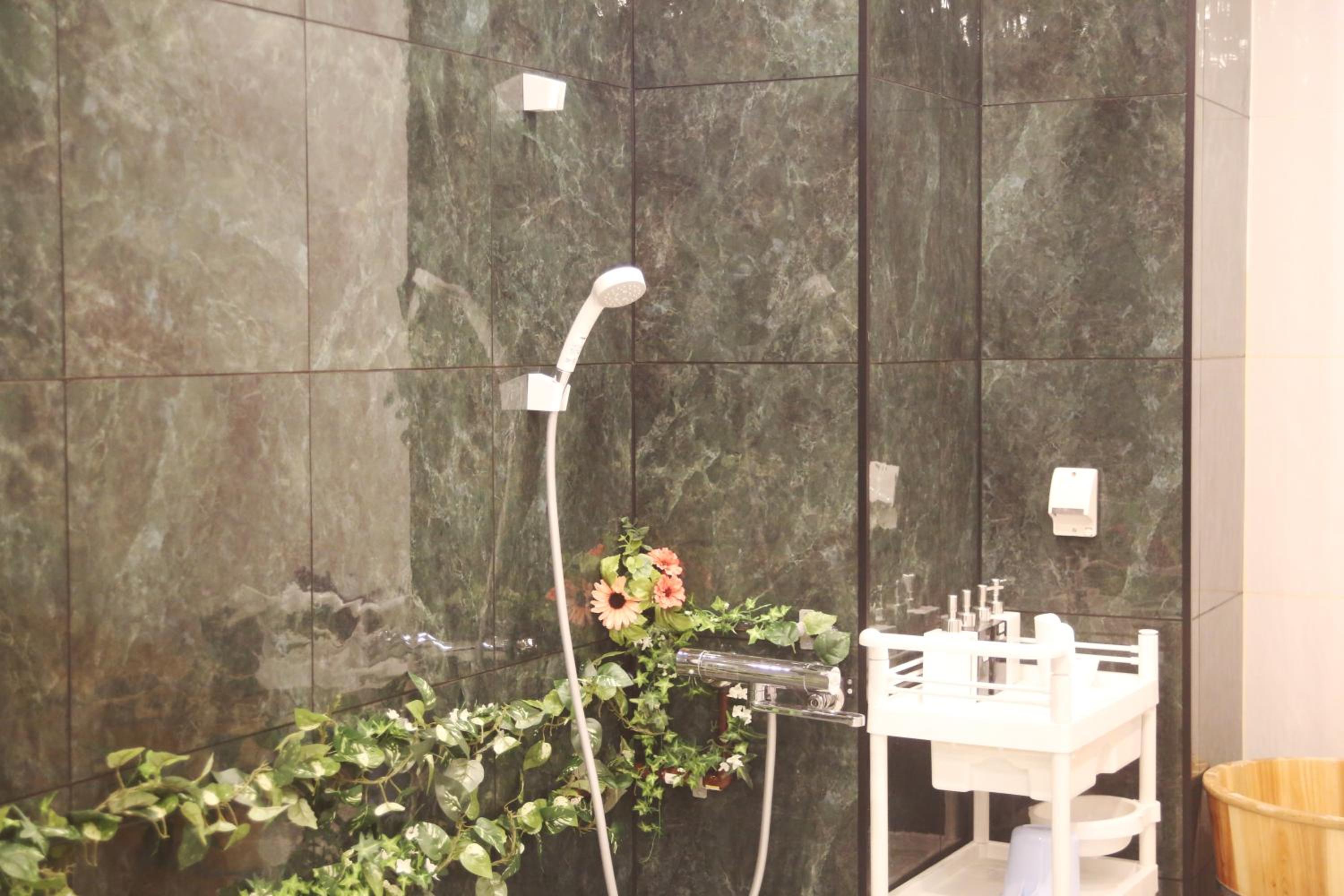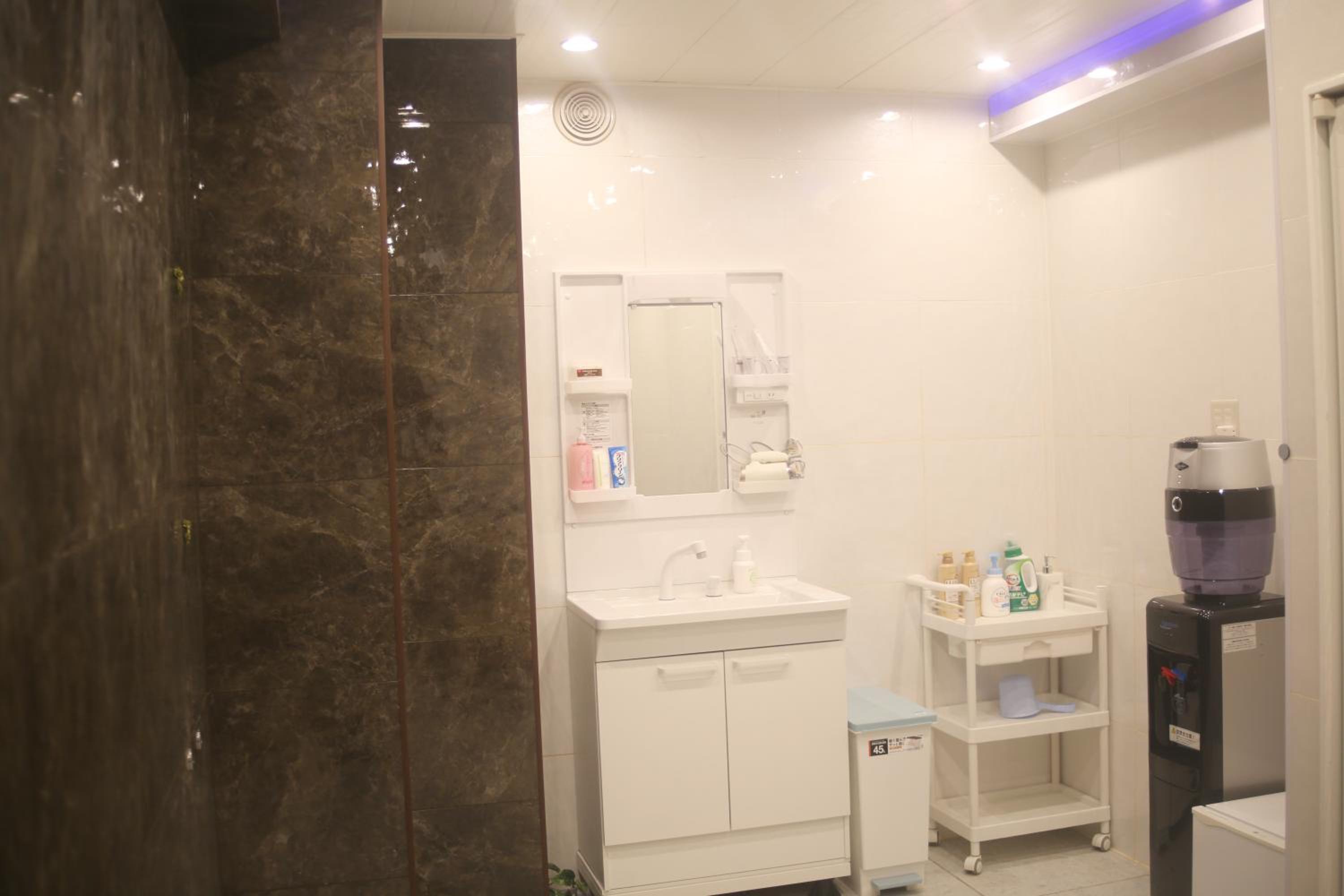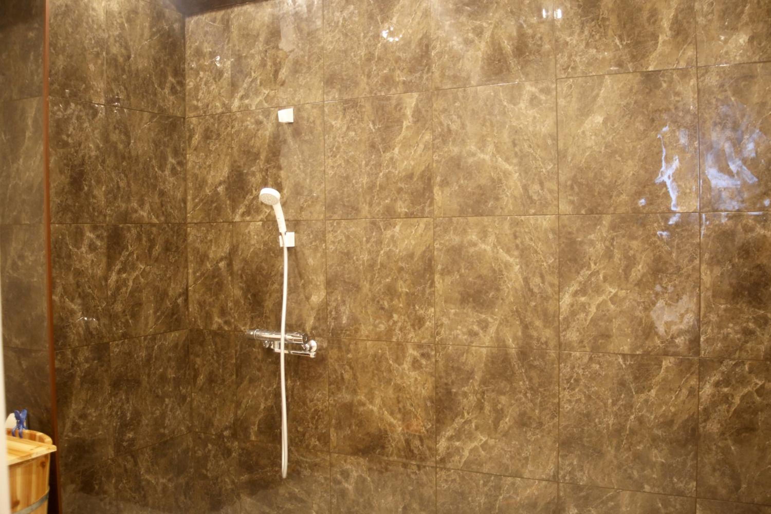 Hot shower in the shared bathroom.