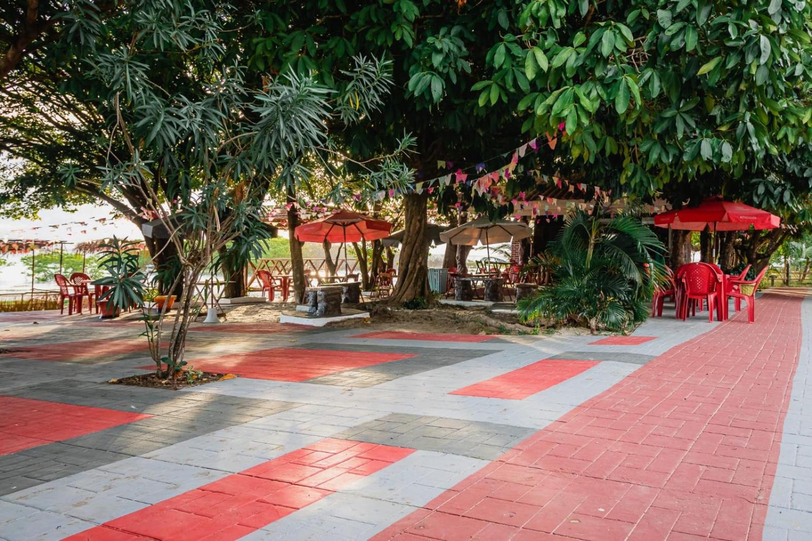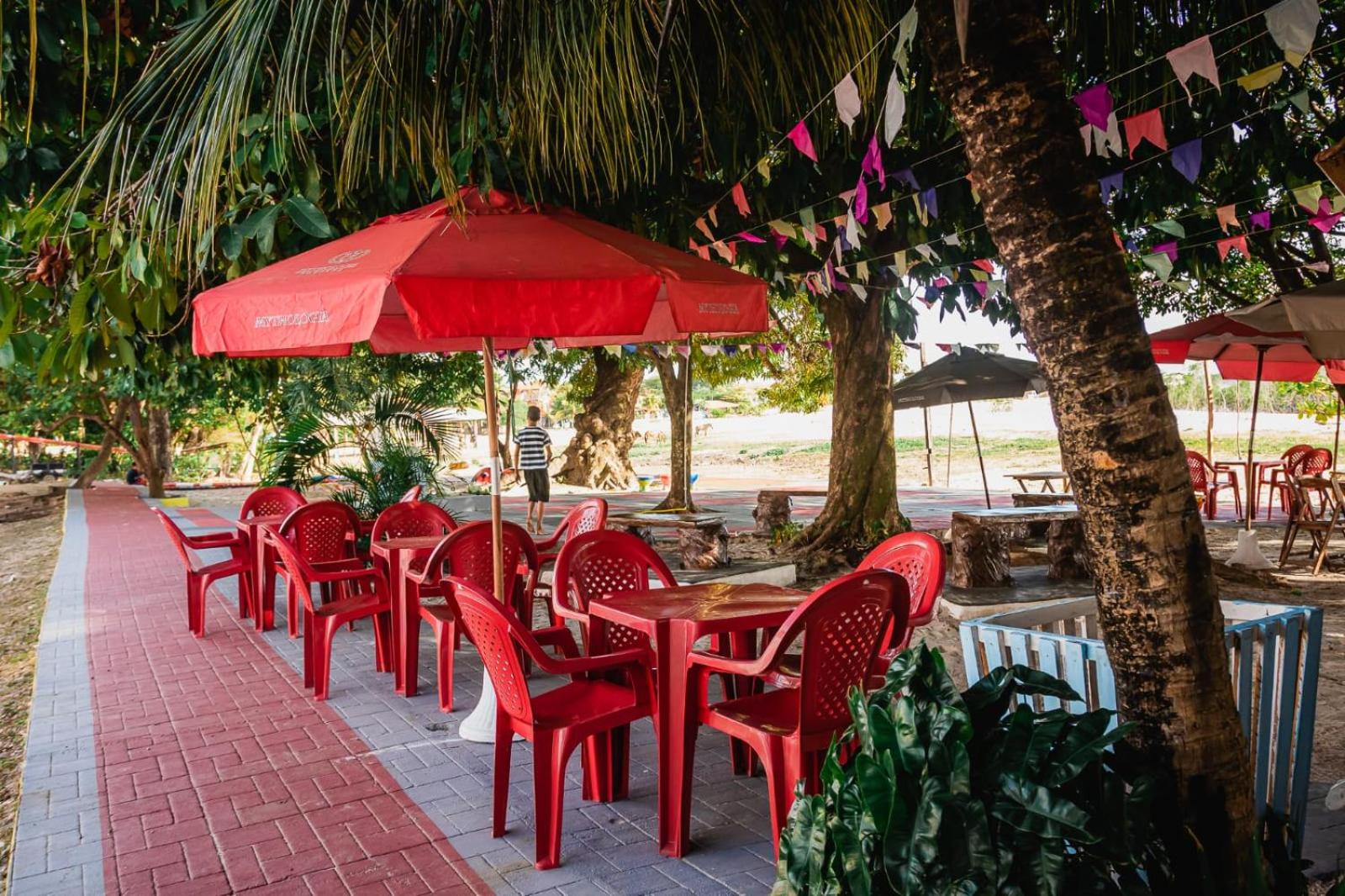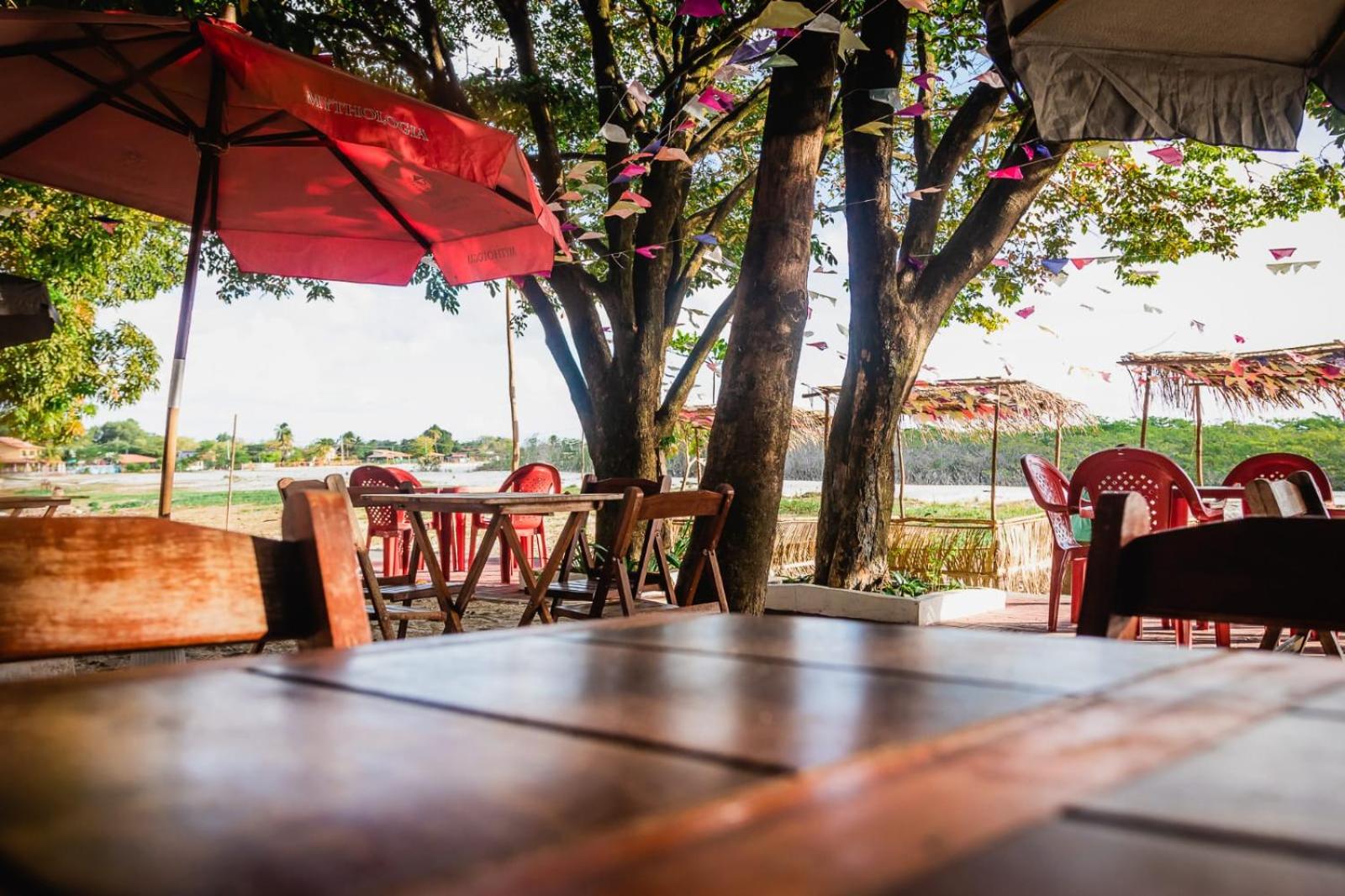 Espaços internos, restaurante na orla, piscina, camas.